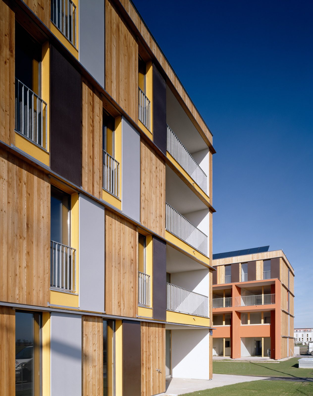 Another novelty is the use of weatherproof, prefabricated, laminated timber elements, in order to ensure the construction quality on the building site. The exterior access balconies are designed as steel structures and are positioned in front of the timber structure. They are equipped with non-flammable decks, made of precast concrete. The projected heating energy consumption of 36 kWh⁄ m² a per annum conforms with the energy efficiency guidelines. About half of the hot water is produced using a solar heating system. The generated energy savings correspond to the heating energy consumption of nine highly insulated single family houses.
