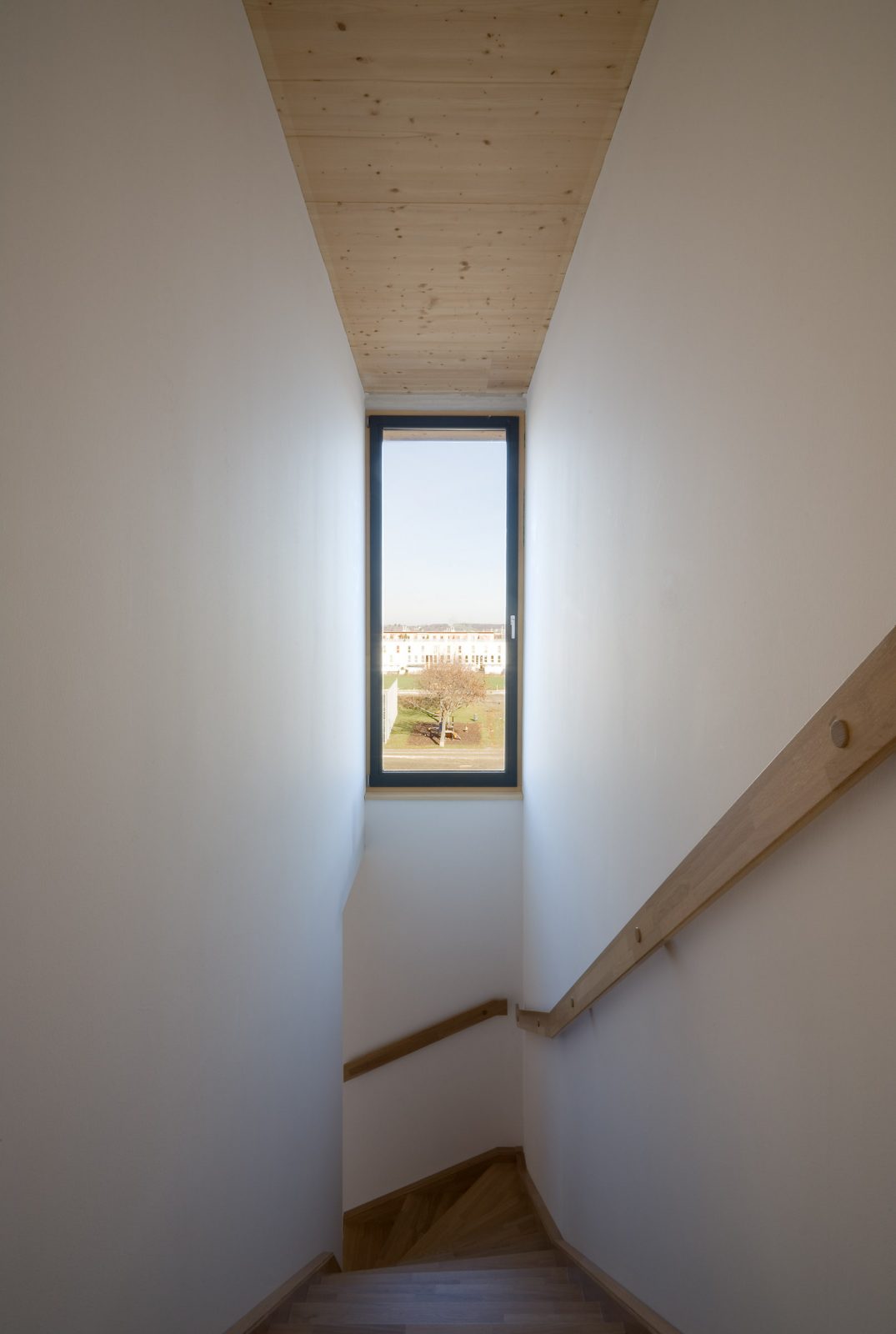 The proximity to the plot boundaries, together with the arrangement of the buildings create an inner courtyard area which, despite its clear structure, is open to its surrounding environment, making the transition to the landscape of the surrounding Marchfeld area more fluid. The open space flows evenly through the residential complex and forms a tranquil, sunlit playground. The apartments – oriented to the south and the west – are housed in four-story wings and feature large loggias that provide privacy for the residence.