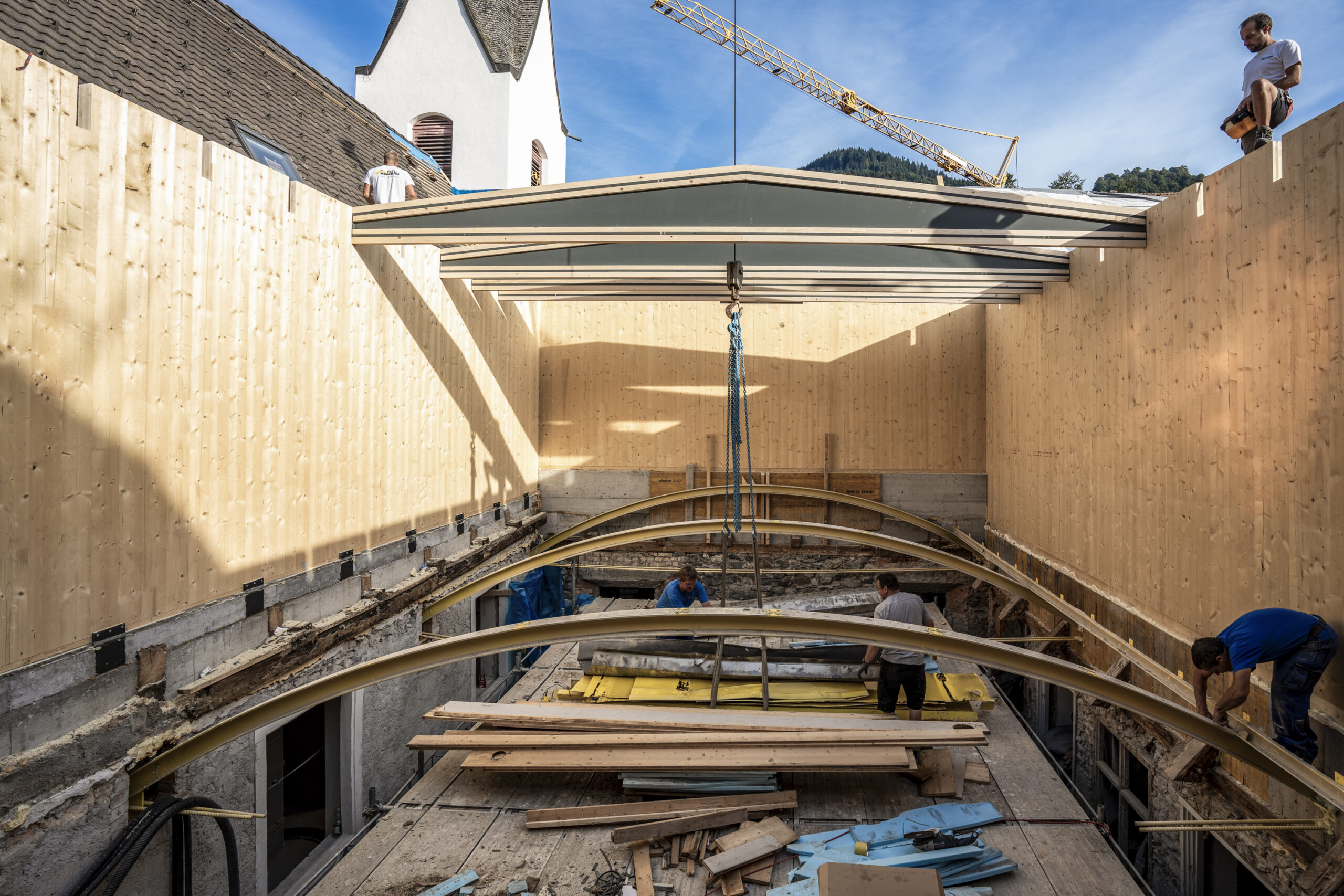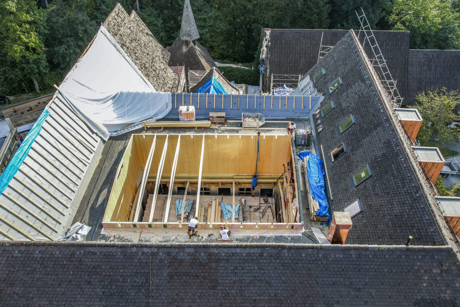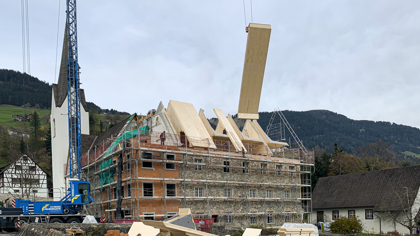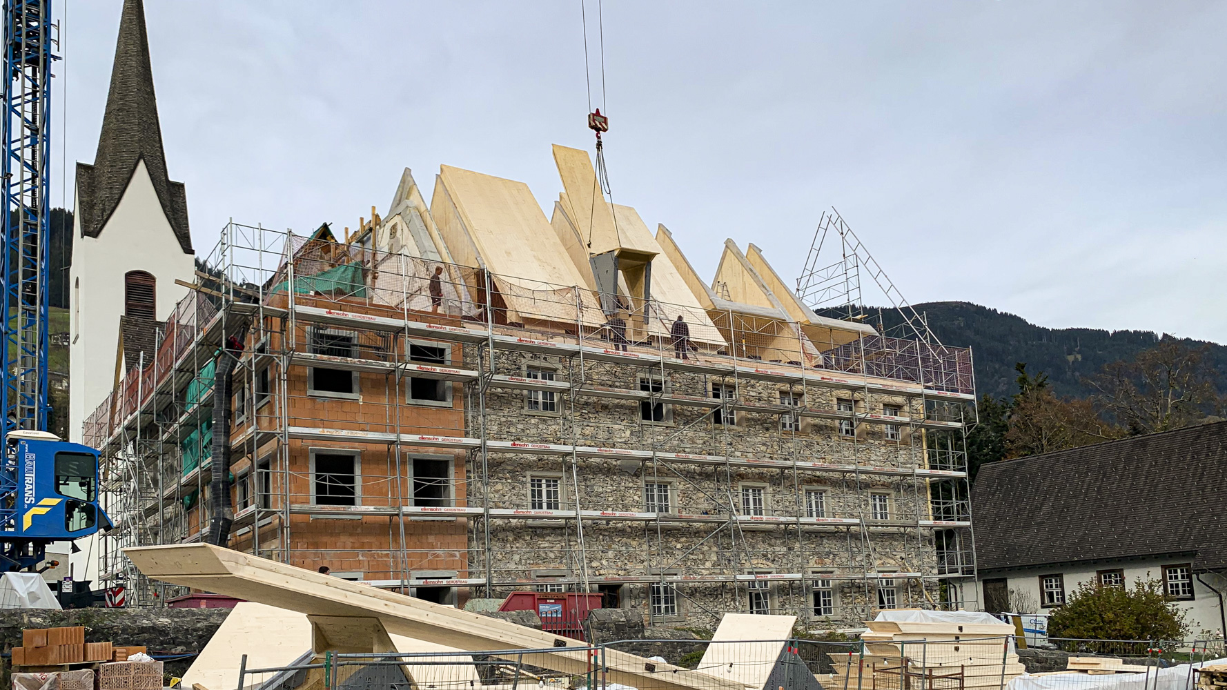 Dies ist der Beginn: Der Wiederaufbau des Dachwerks. Wir verwenden neueste Materialien aus Brettsperrholz, um diesem Gebäude eine neue Zukunft zu geben und dabei das historische Konstrukt zu erhalten.