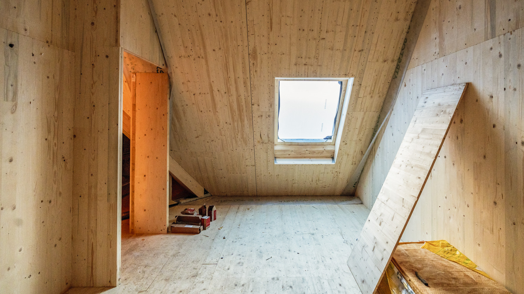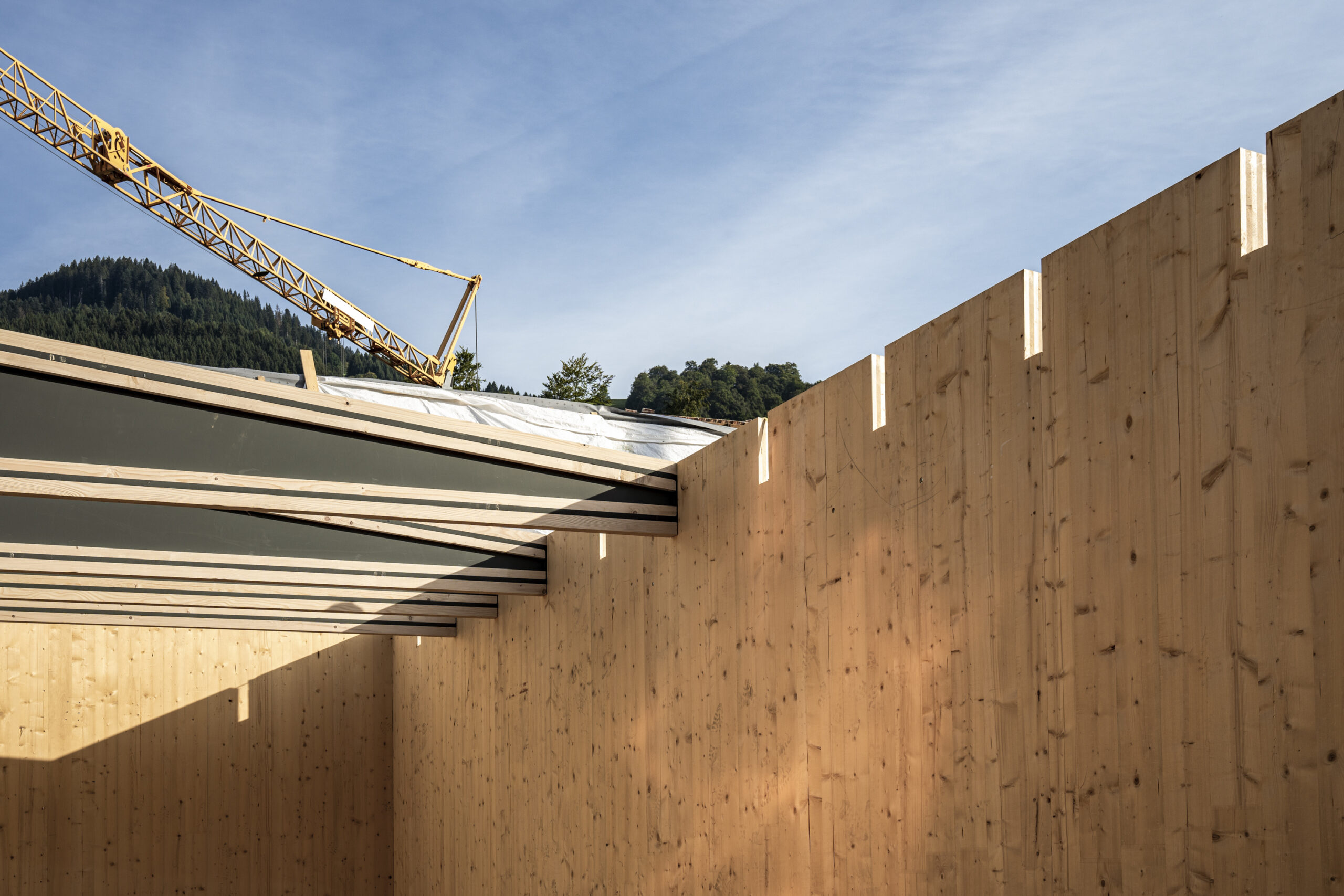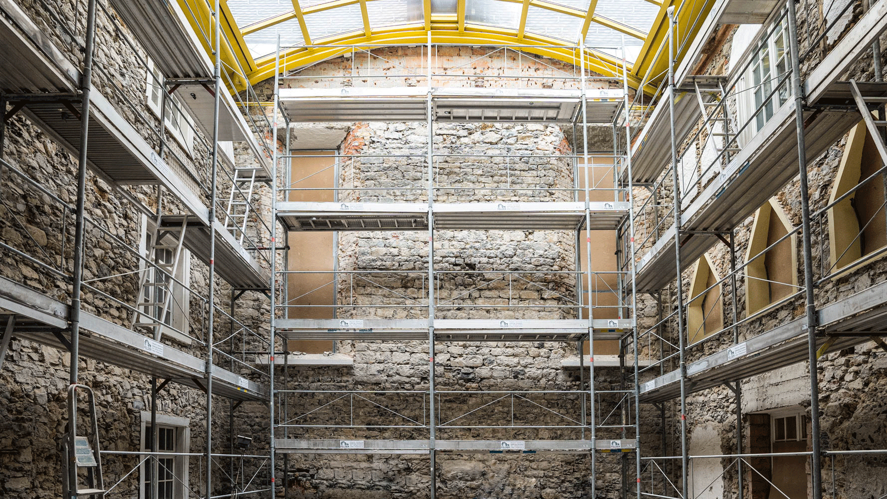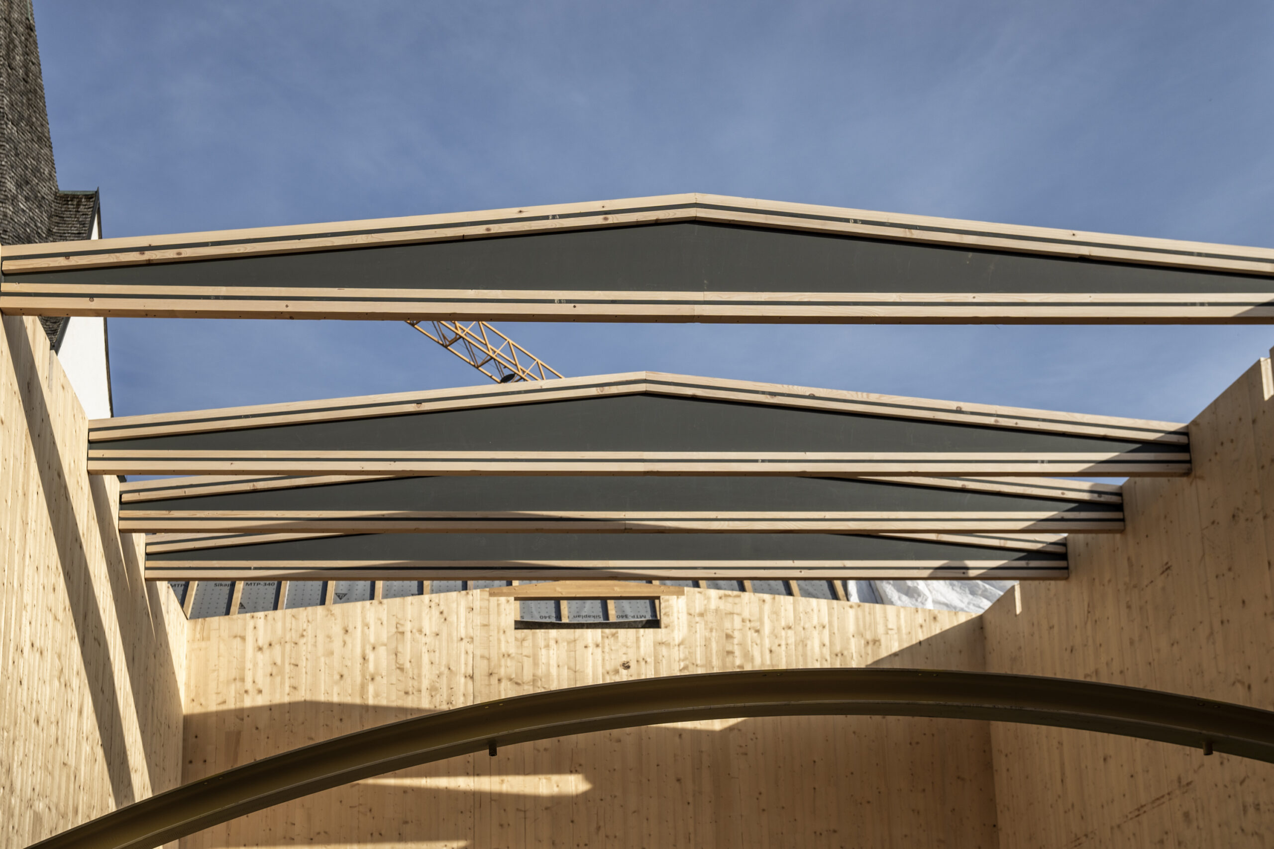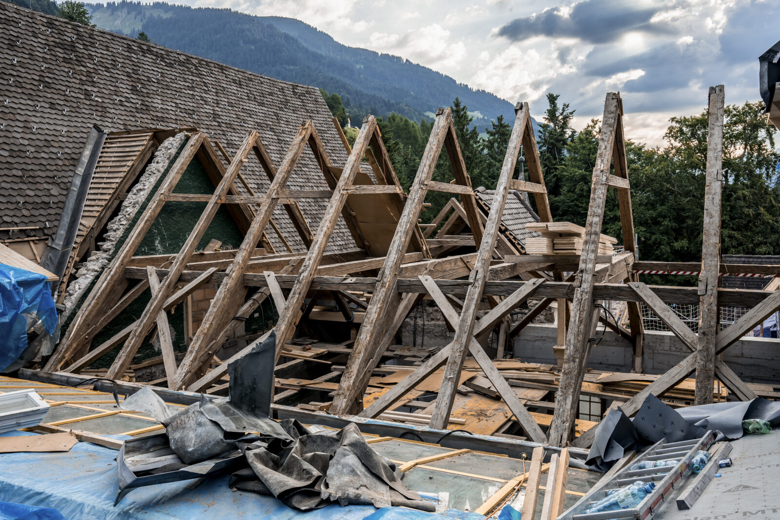 Dies ist der Beginn: Der Wiederaufbau des Dachwerks. Wir verwenden neueste Materialien aus Brettsperrholz, um diesem Gebäude eine neue Zukunft zu geben und dabei das historische Konstrukt zu erhalten.