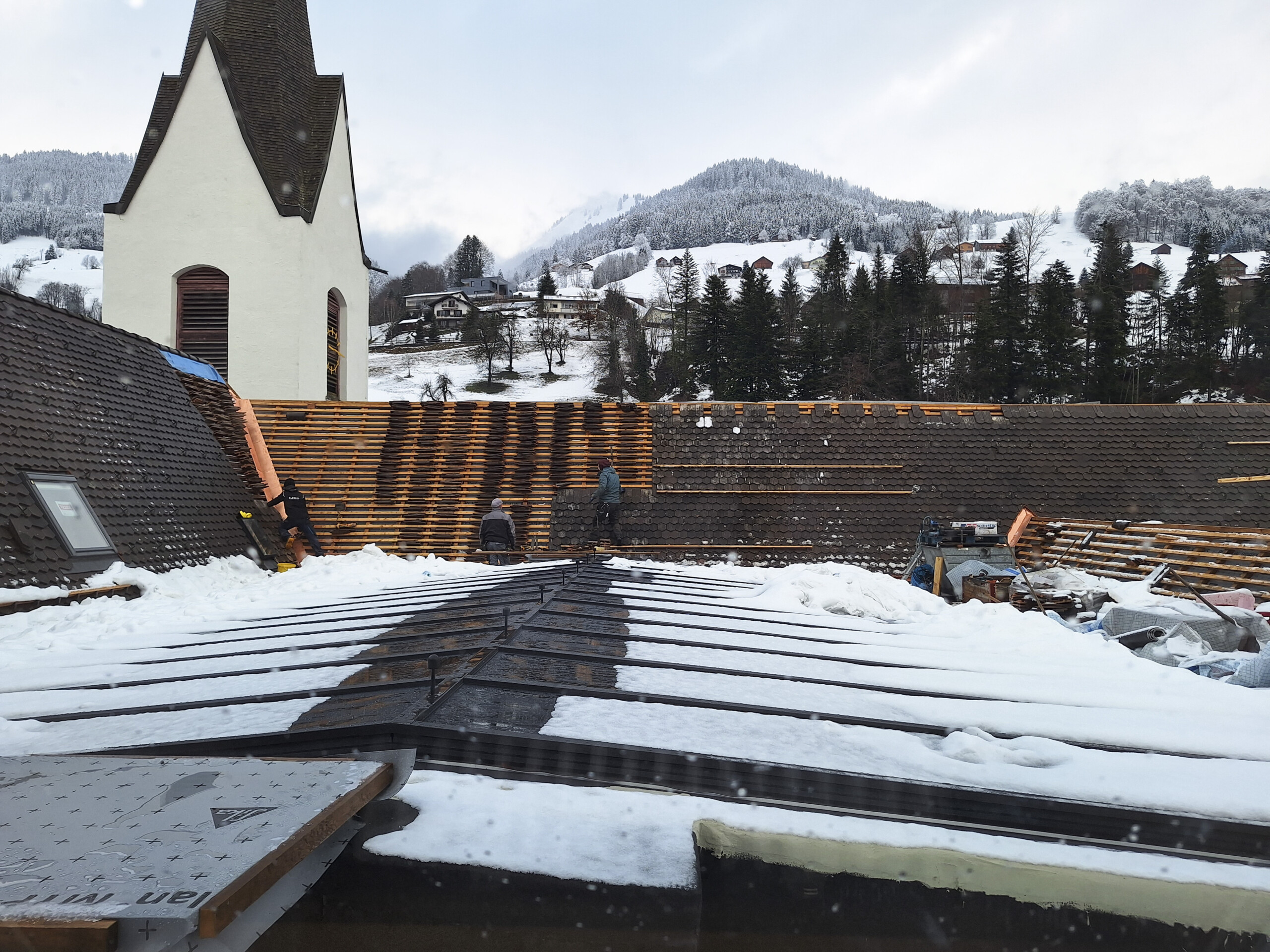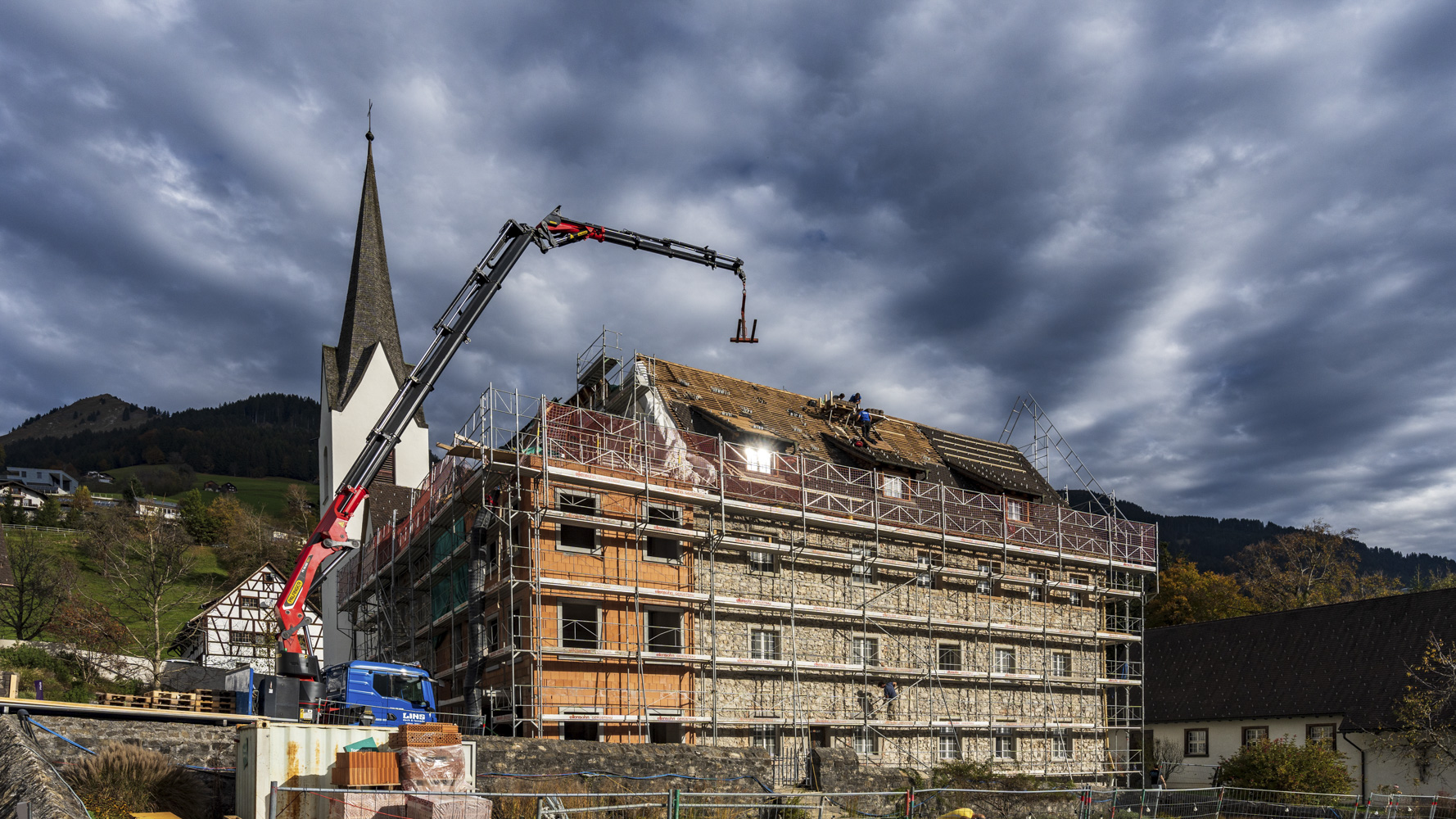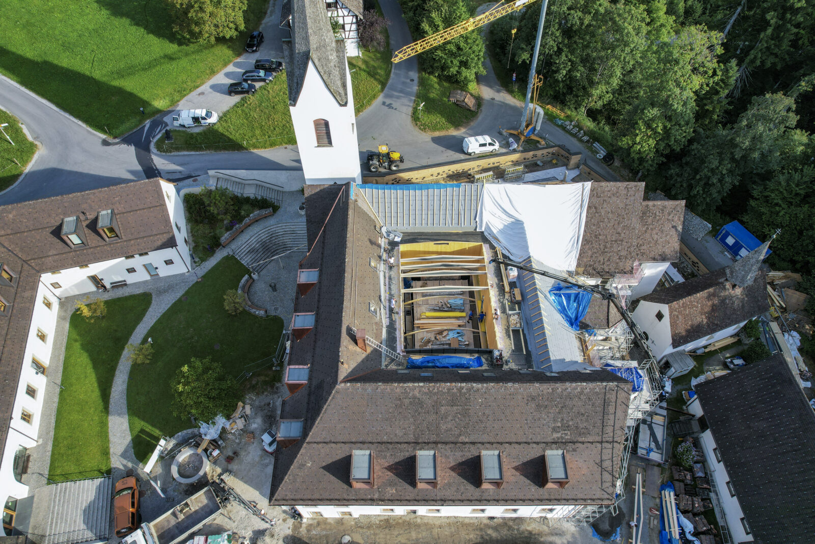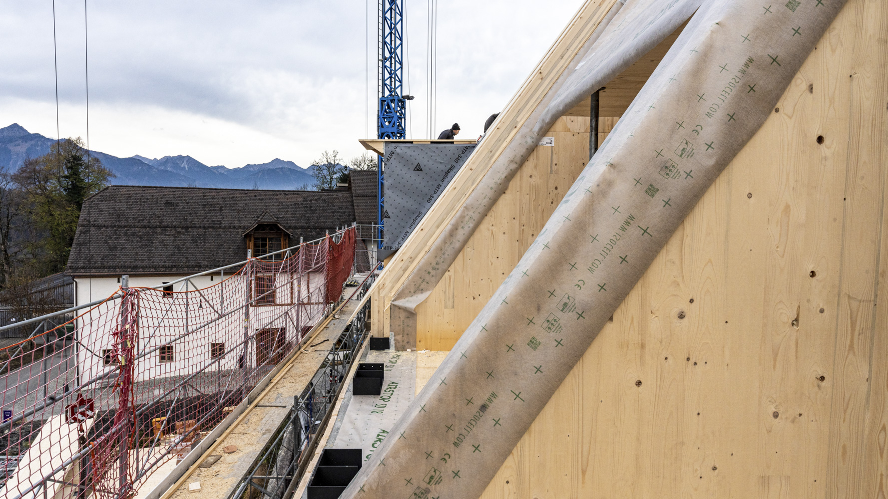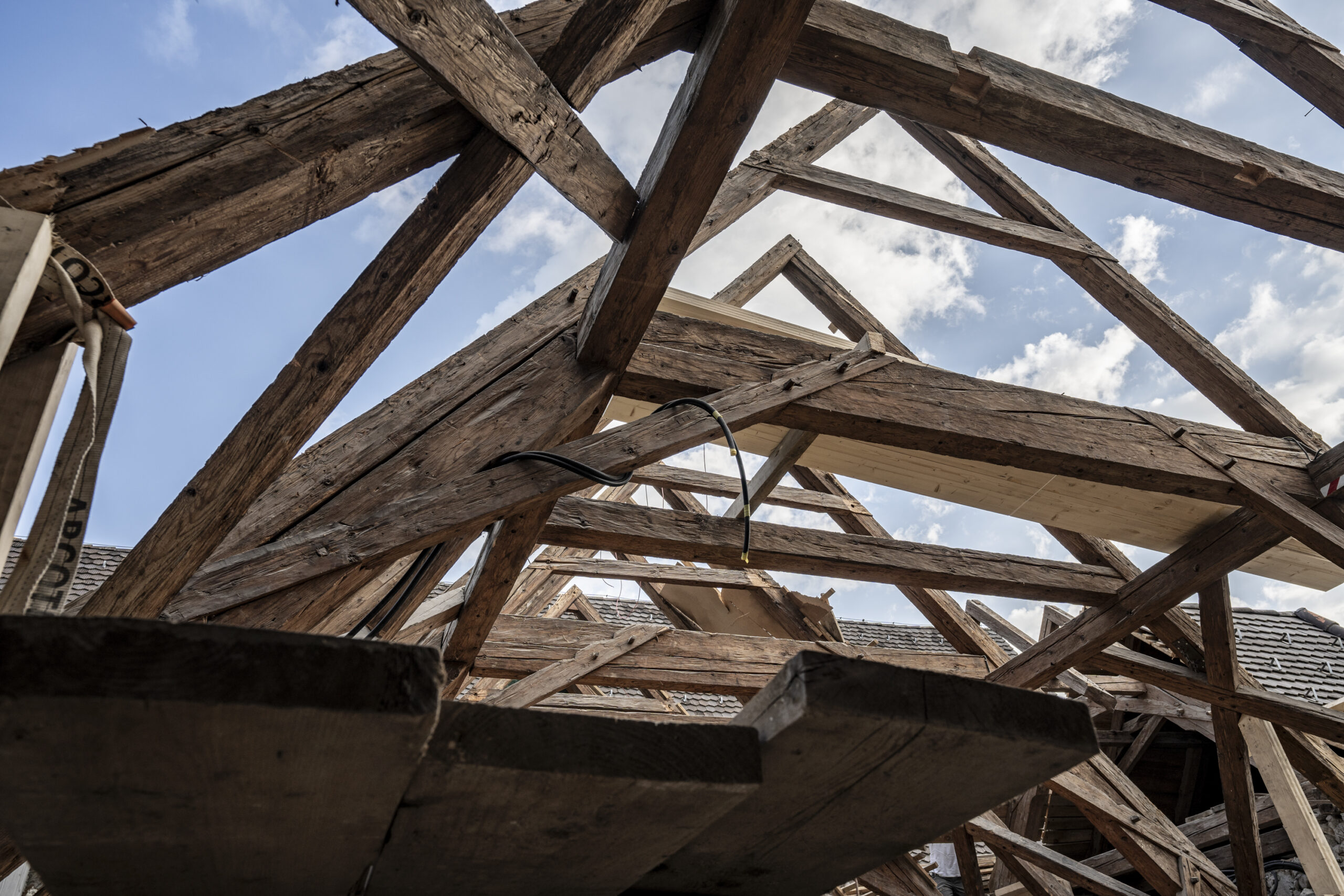 Die Restaurierungsarbeiten werden mit großer Sorgfalt und meisterhafter Geschicklichkeit im Hauptgebäude der Propstei St. Gerold fortgesetzt. Nun ist es an der Zeit, weitere Dächer zu errichten und zu stabilisieren. Das Westdach nimmt nach und nach seine Gestalt an. Das neue Holzsystem mit Hohlkastenelementen wurde behutsam an seinem Platz installiert, während stilistische Gaubenfenster mit einer Kupferverkleidung hervorstechen. Die originalen Balken tragen antike handgemachte Markierungen und stehen an exakt derselben Stelle wie seit Jahrhunderten. Sie zeugen von vergangenen Zeiten und der Sorgfalt, die bei ihrer Auswahl, Bearbeitung und Installation aufgebracht wurde. Die Bewahrung dieser alten Balken markiert den Lauf der Zeit. Nun sind sie von der neuen Holzstruktur umgeben, unterstützt von einer robusten Stahlkonstruktion. Das Alte und das Neue vereinen sich hier, wie es im gesamten Projekt der Fall ist. Ein weiteres Kapitel in der Chronik von St. Gerold ist bald vollendet, und die nächsten Seiten und Kapitel stehen bereit, ihren Anfang zu nehmen. Als Nächstes steht das Dach des Ostflügels an.