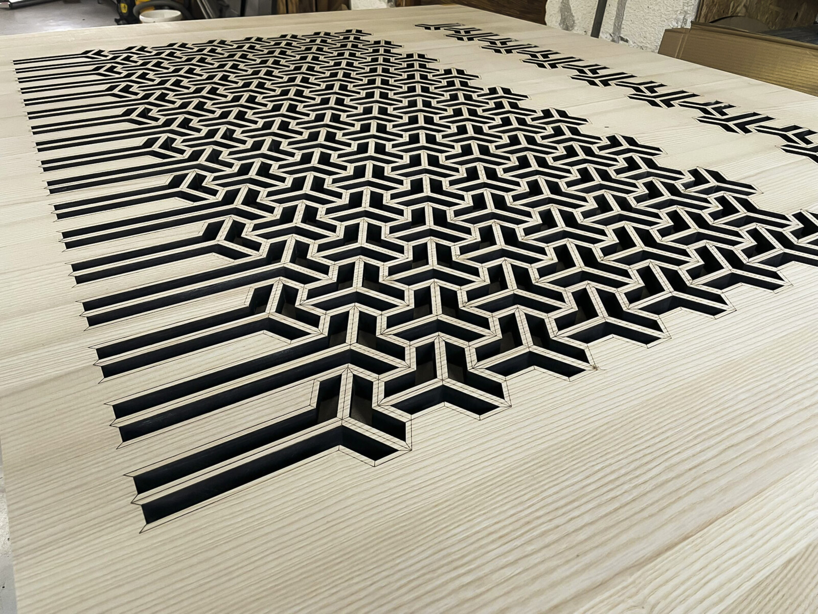 Die Fertigung erfolgt durch Markus Palzenberger. Seine innovativen Lasercuttermaschinen sind in der Lage eine Lasergravur präzise durch gezielten Einbrand in die Oberfläche anzubringen und die 20mm dicken Platten exakt zu schneiden.
