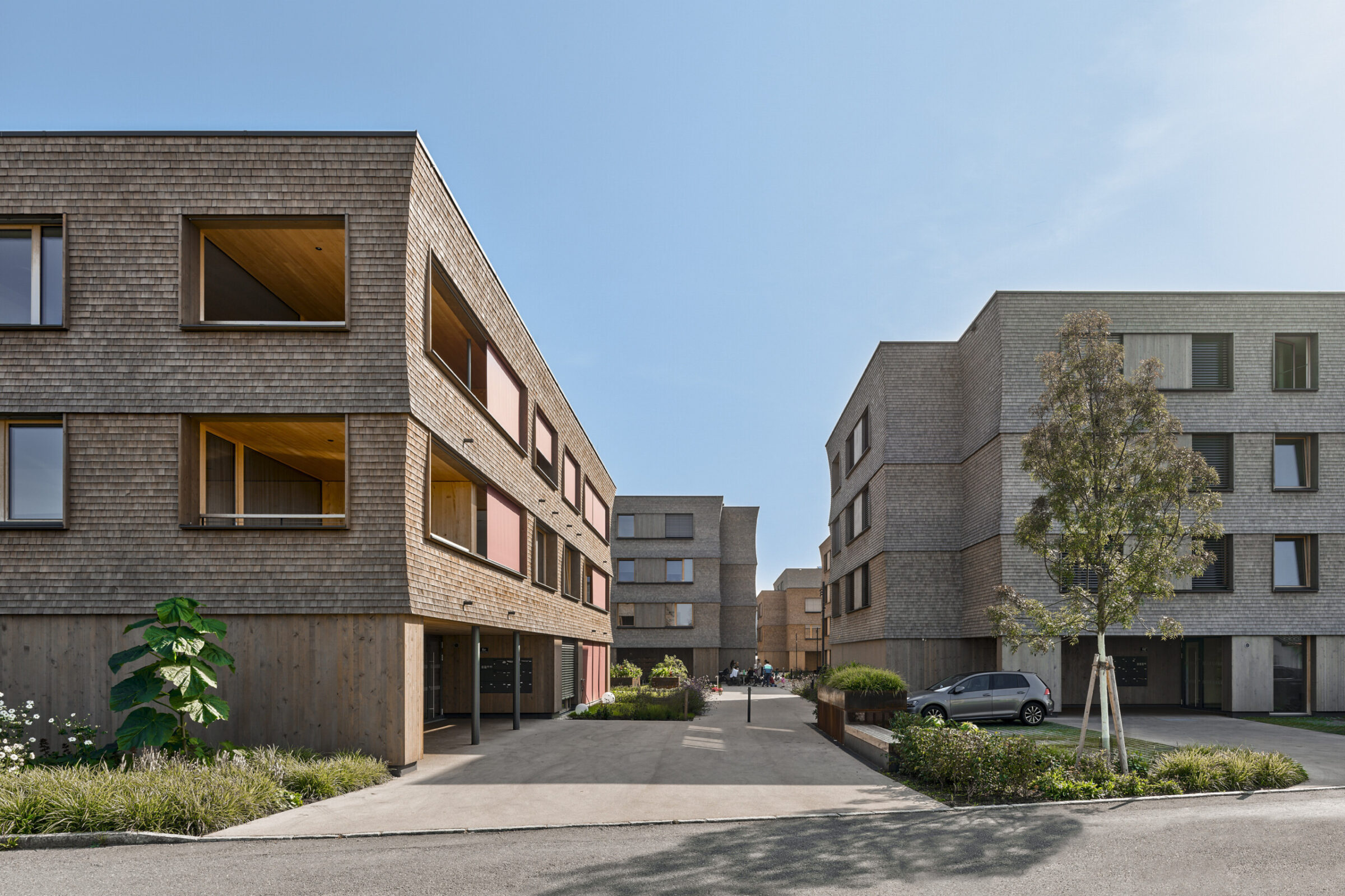 Der Kopfbau mit gewerblicher Nutzung im Erdgeschoss ist so nahe wie möglich an die Toni-Russ-Strasse im Süden gerückt. Auf Grund seiner zurückhaltenden Kubatur integriert er sich in die umgebende Bebauung, kontrastiert jedoch durch die leicht erhöhte Sockelposition subtil mit den anderen Gebäuden. Zwischen den einzelnen Volumen erstrecken sich sorgfältig gestaltete Anwohnerhöfe, die den Mietern als Begegnungsräume dienen. Sie bieten ansprechend ausgeführte Oberflächenbeläge, Sitzgelegenheiten sowie Vegetationszonen mit schattenspendendem Baumbestand; individuell bepflanzbare Hochbeete laden die Nachbarn zum Plaudern und Gärtnern ein, während die Kinder in den nahen Spielbereichen toben dürfen. Die gesamte Anlage wird durchgehend rollstuhlgerecht und verkehrsbefreit erschlossen, in ihrem Zentrum öffnet sich das Netz der Verbindungswege zu einem grosszügigen Quartiersplatz. Die ausgewogene Balance zwischen privaten und gemeinschaftlich genutzten Flächen fördert die Kommunikation und das Miteinander innerhalb und ausserhalb des Areals.