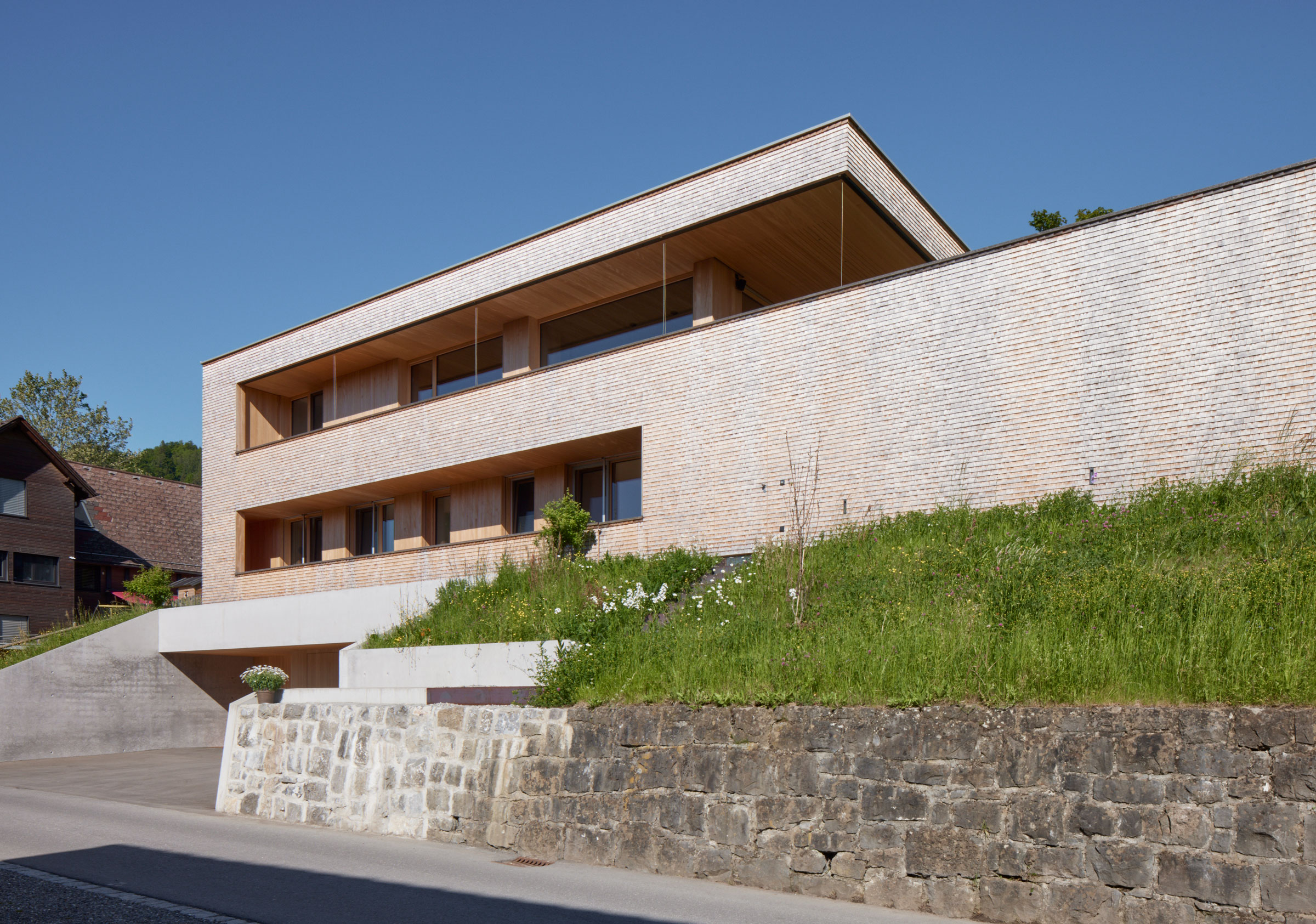 Der Blick schweift über den historischen Dorfkern von Weiler in die Weite des Rheintals bis zum Bergmassiv des Alpsteins. Das Haus im Bongert sitzt in einem weich abfallenden, zur Nachmittagssonne orientierten Hang, das Untergeschoss aus Sichtbeton kann als Einfaltung der Böschungsmauer gelesen werden. Die erdberührten Wände der darüber liegenden Schlaf- und Badezimmer sind ebenfalls massiv ausgeführt, entschlossen greift die terrassierte Baustruktur in das geneigte Gelände. Das oberste Stockwerk ist in leichter Holzbauweise gefertigt, ein eben angelegter Garten fasst seine licht und offen konzipierten Wohnräume. Im Inneren bekleiden Täfer aus hell schimmernder Weißtanne Wände und Decken, während die Außenhaut durch fein strukturierte Schindeln mit zurückgesetzten Flächen aus glatter Vertikalschalung gefügt ist.