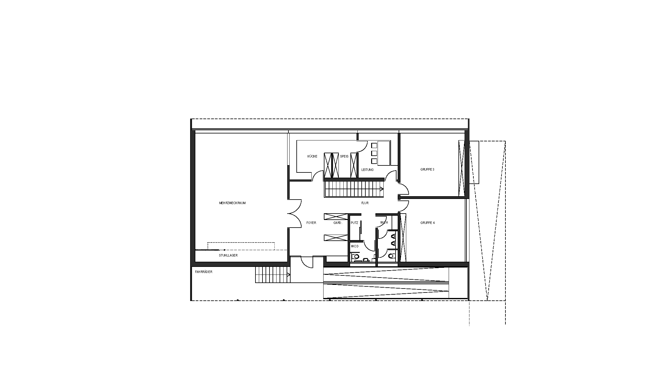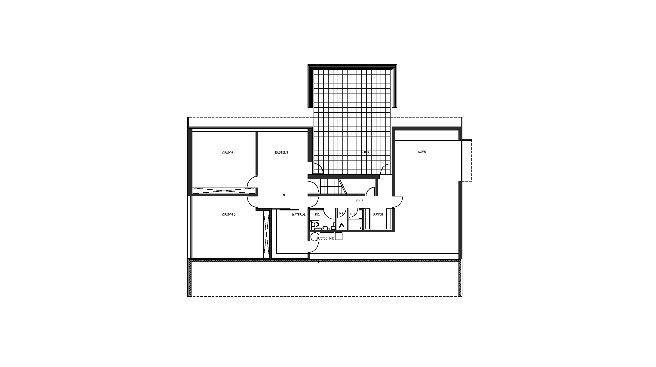 Nachdem das alte Pfadfinderheim in Wolfurt durch einen Brand zerstört wurde, wurde ein Neubau an anderer Stelle notwendig. Das neue Gebäude liegt in der Nähe der Bregenzer Ach im Wiesenvorland und ist südseitig durch eine höher gelegene Zufahrtsstraße erschlossen. Das zweigeschossige Gebäude steht auf der Wiese ca. 1,20 m unterhalb dieser Straße. Von dieser erschließt eine Treppe sowie eine behindertengerechte Rampe das Hauptgeschoss (Obergeschoss). Dadurch ist es möglich das Haus barrierefrei ohne den Einbau eines Liftes zu benutzen, da alle Räume über Rampen erschließbar sind.