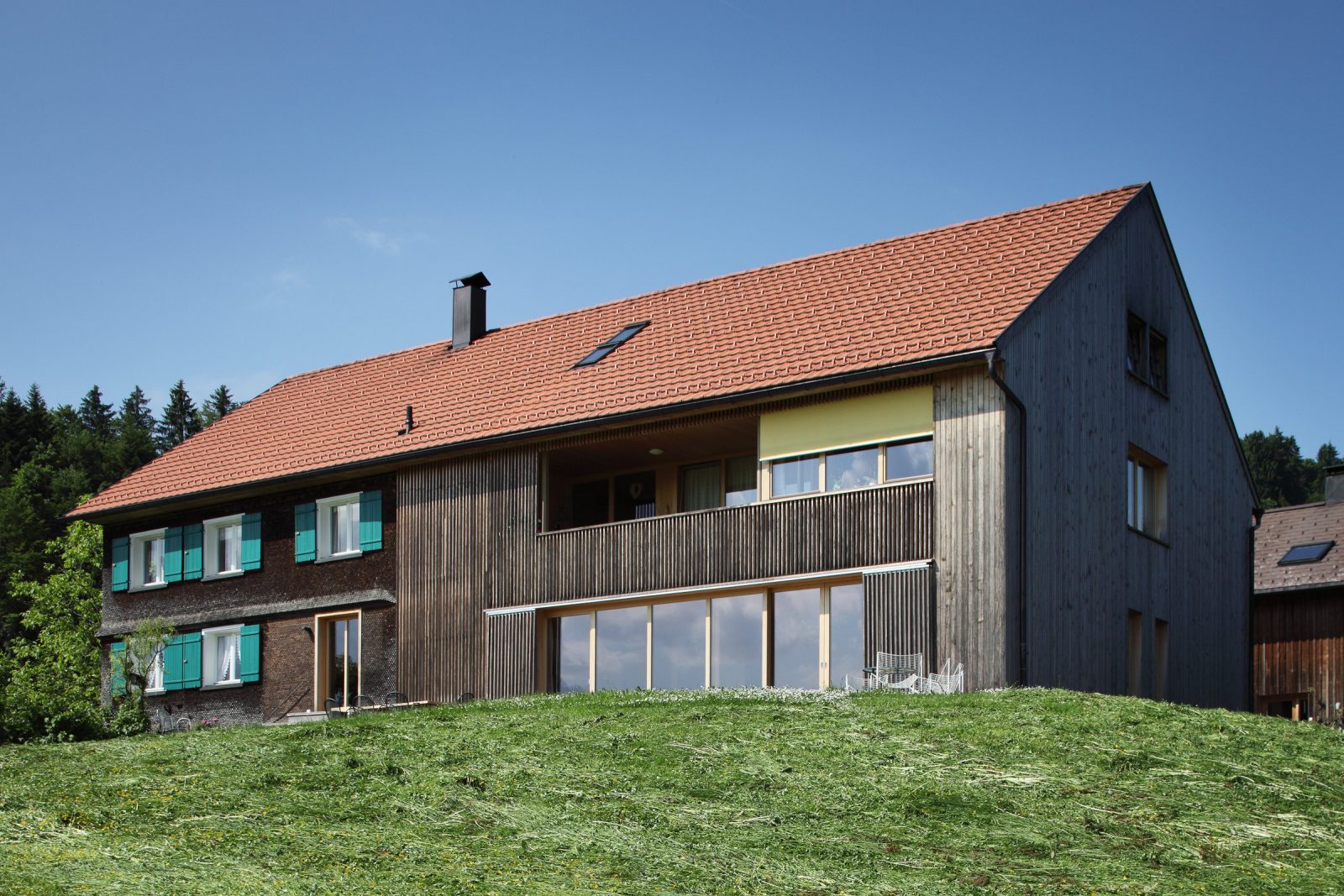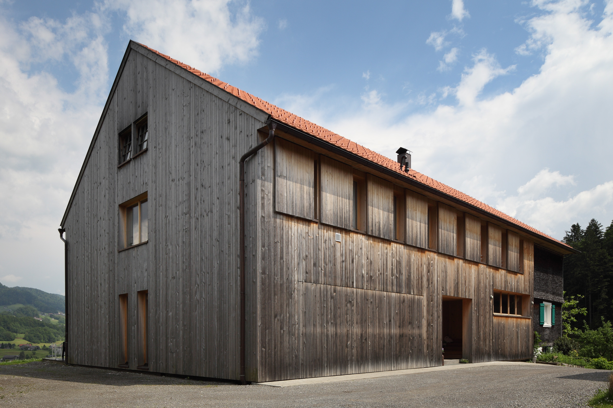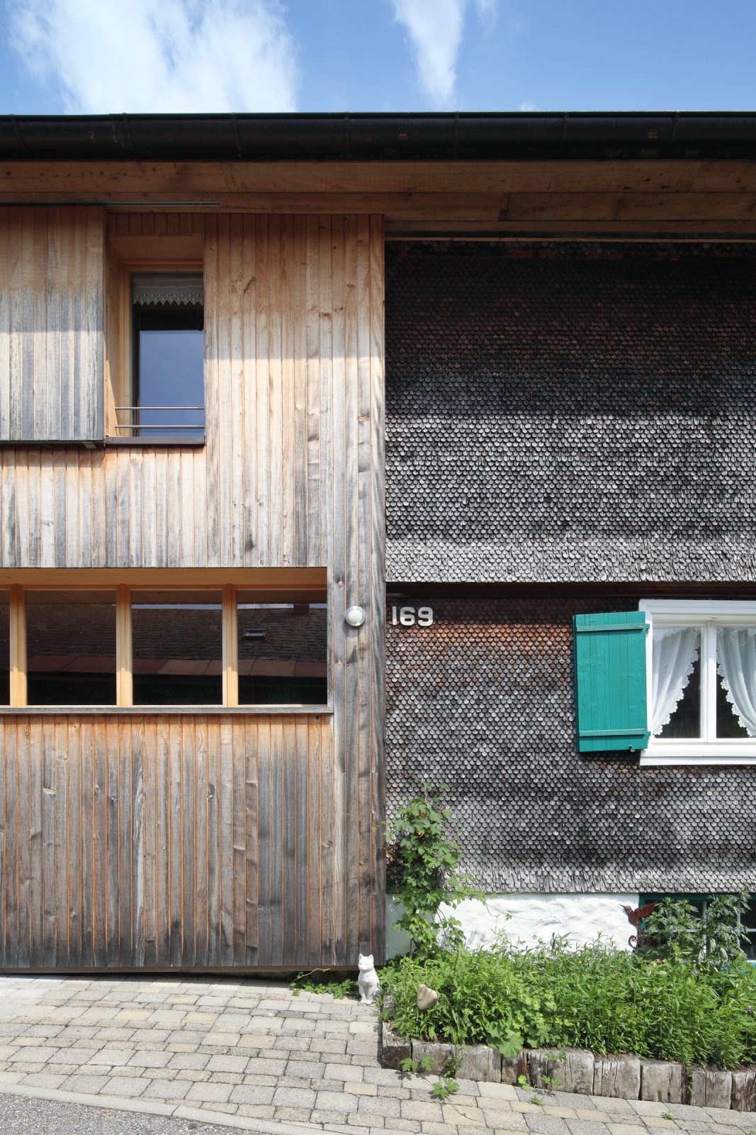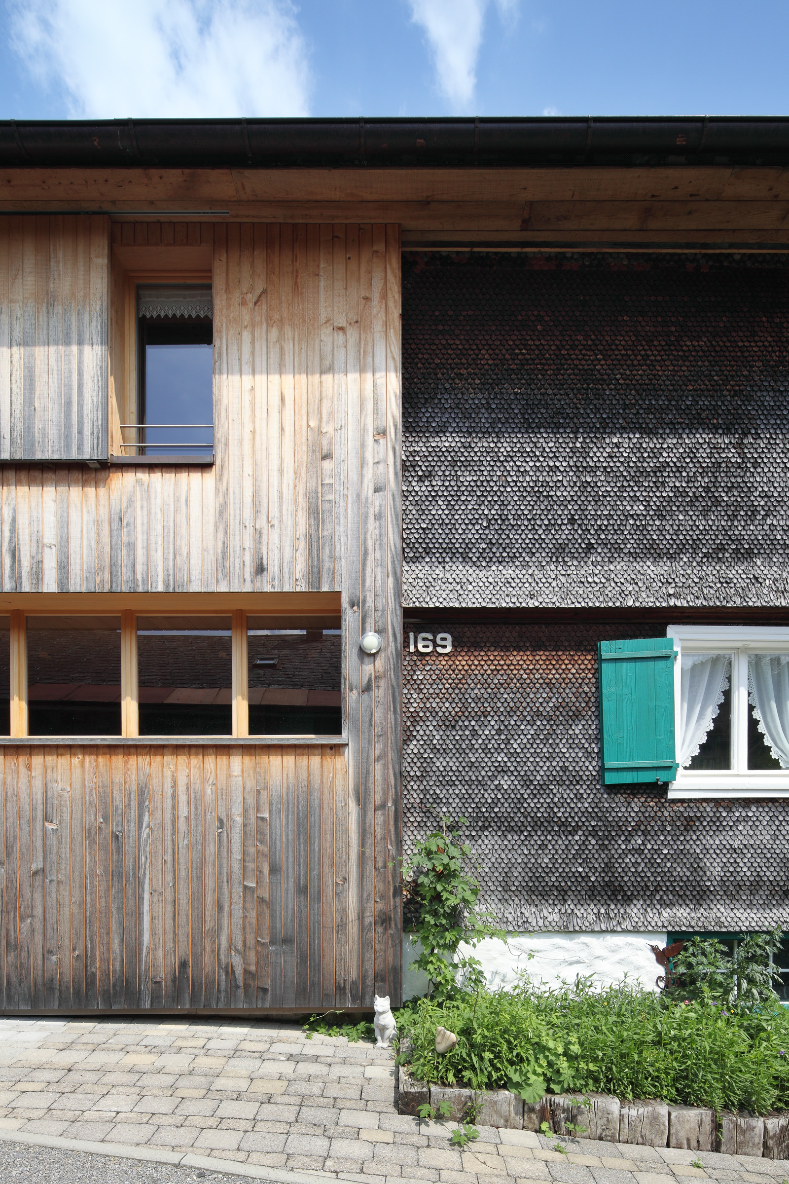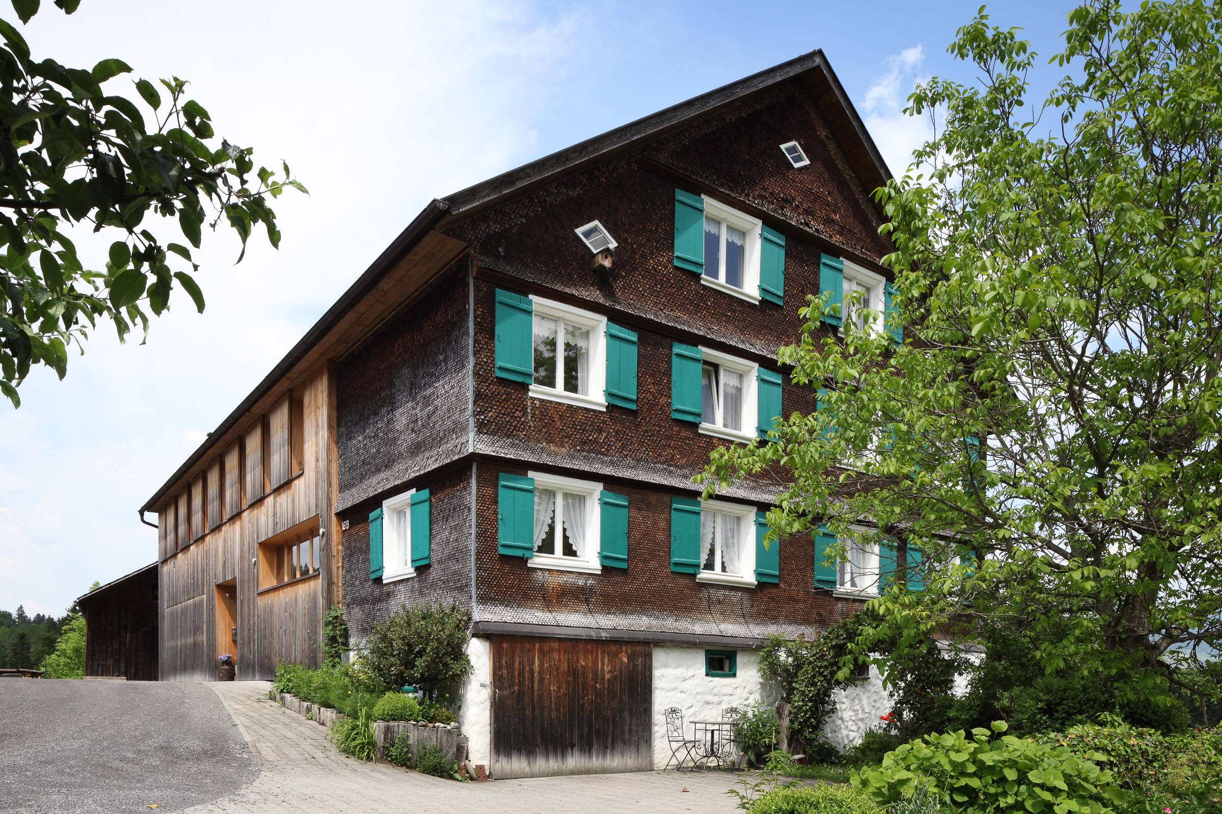 Das bestehende Haus ein klassisches Bauernhaus mit Wohnteil und Wirtschaftsteil wird bewohnt von einem Lehrer und Künstlerehepaar. Diese adaptieren für sich den historischen Wohnteil so dass die typischen Merkmale alter Bregenzerwälder Wohnkultur erkennbar bleiben und mit modernen funktionellen Teilen ergänzt werden. Der Wirtschaftsteil wurde von einem unschönen seitlichen Zubau befreit und umgenutzt für eine Garage, ein Künstleratelier sowie einer Wohnung für eine Verwandte. Dementsprechend wurde die Erschließungsstruktur des Hauses geändert und auf die Garage aus Ziegel und Beton wird eine moderne Holzbaukonstruktion aufgesetzt. Beim „Hinterhaus“ handelt es sich somit um einen Neubau. Besonderes Augenmerk galt der Erhaltung der „Zweiteiligkeit“ des Bregenzerwälderhauses. Als Kontrast zum geschindelten Vorderhaus wird das Hinterhaus senkrecht verschalt und möglichst zurückhaltend in der Gestaltung umgesetzt. Was auf der Nord- und Westseite eher gut möglich war, war komplexer auf der zu öffnenden Südseite wo zusammenhängende Holzflächen Bezug das ruhige Erscheinungsbild beibehalten.