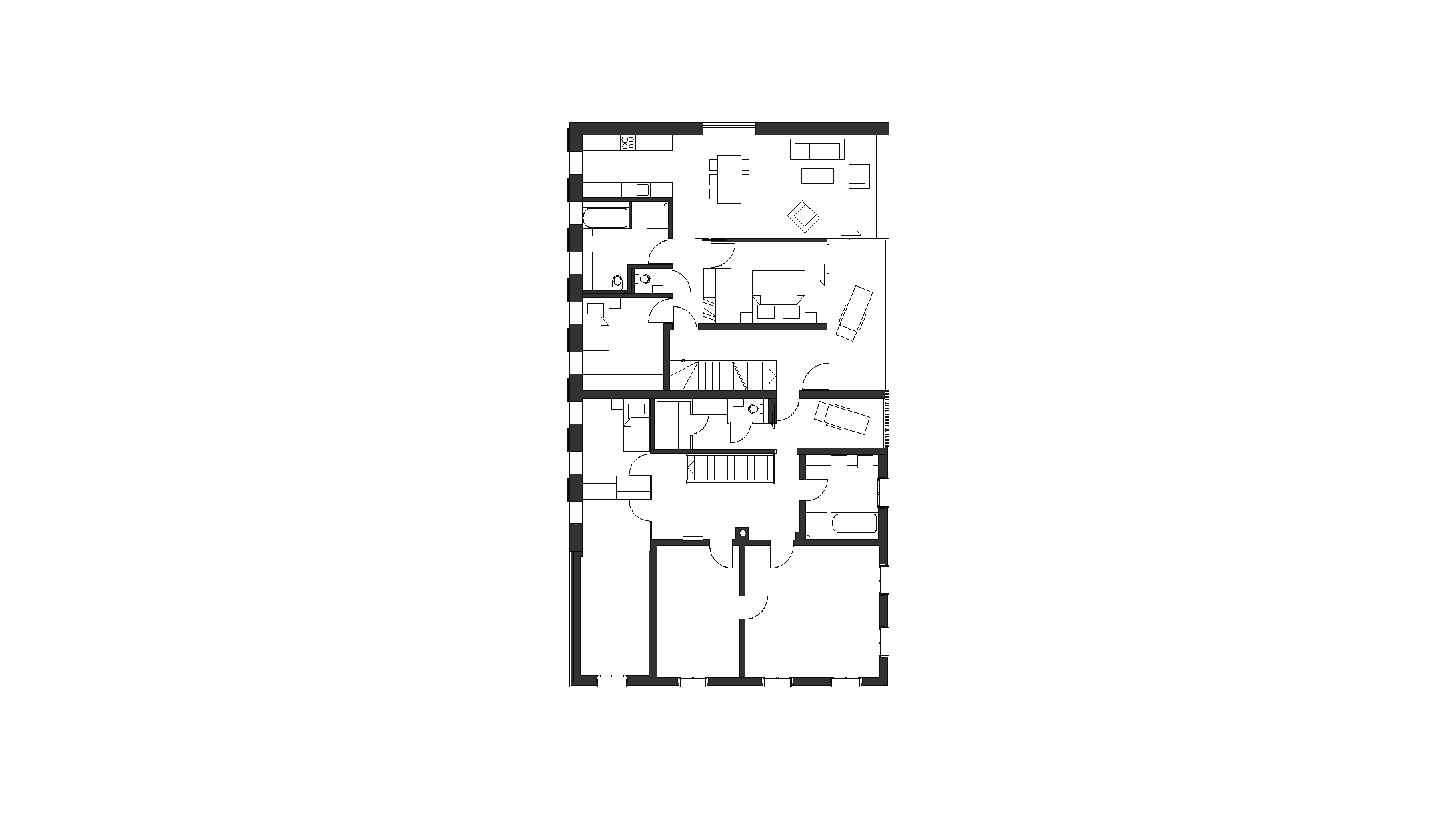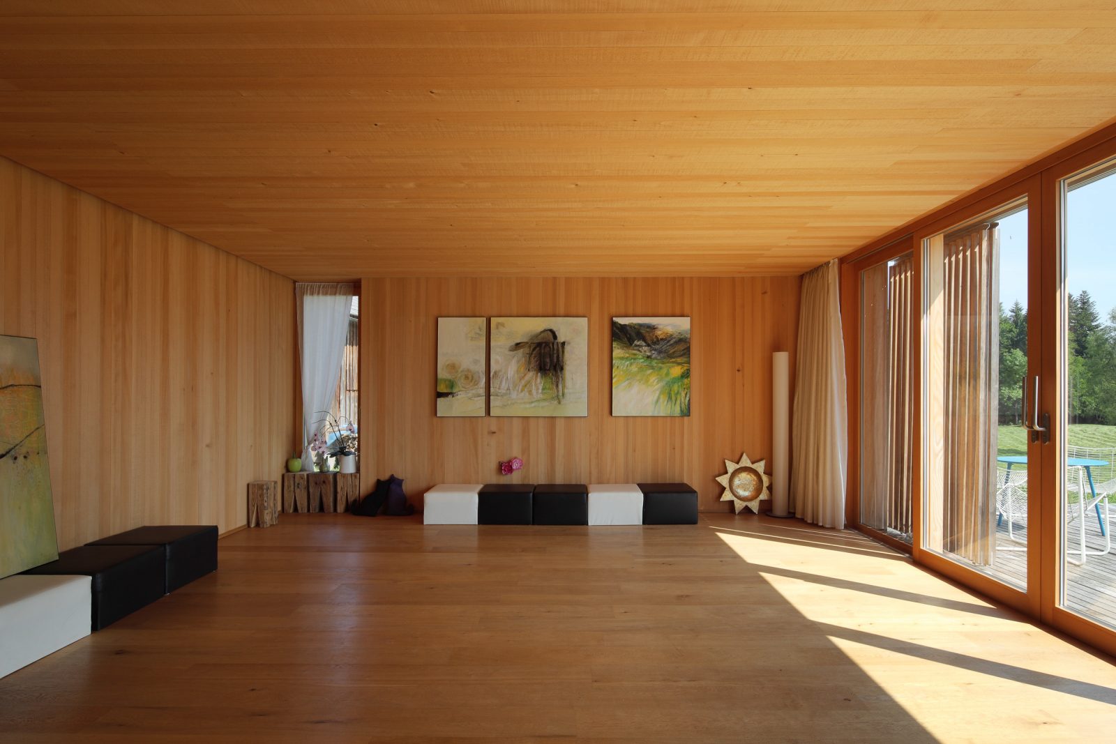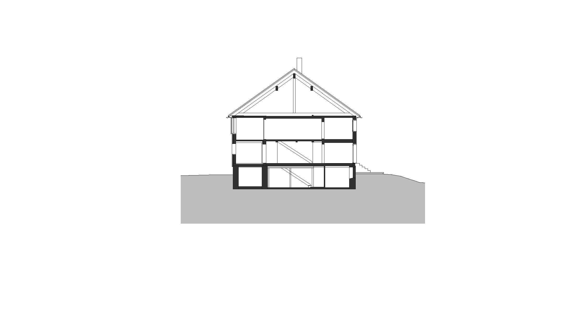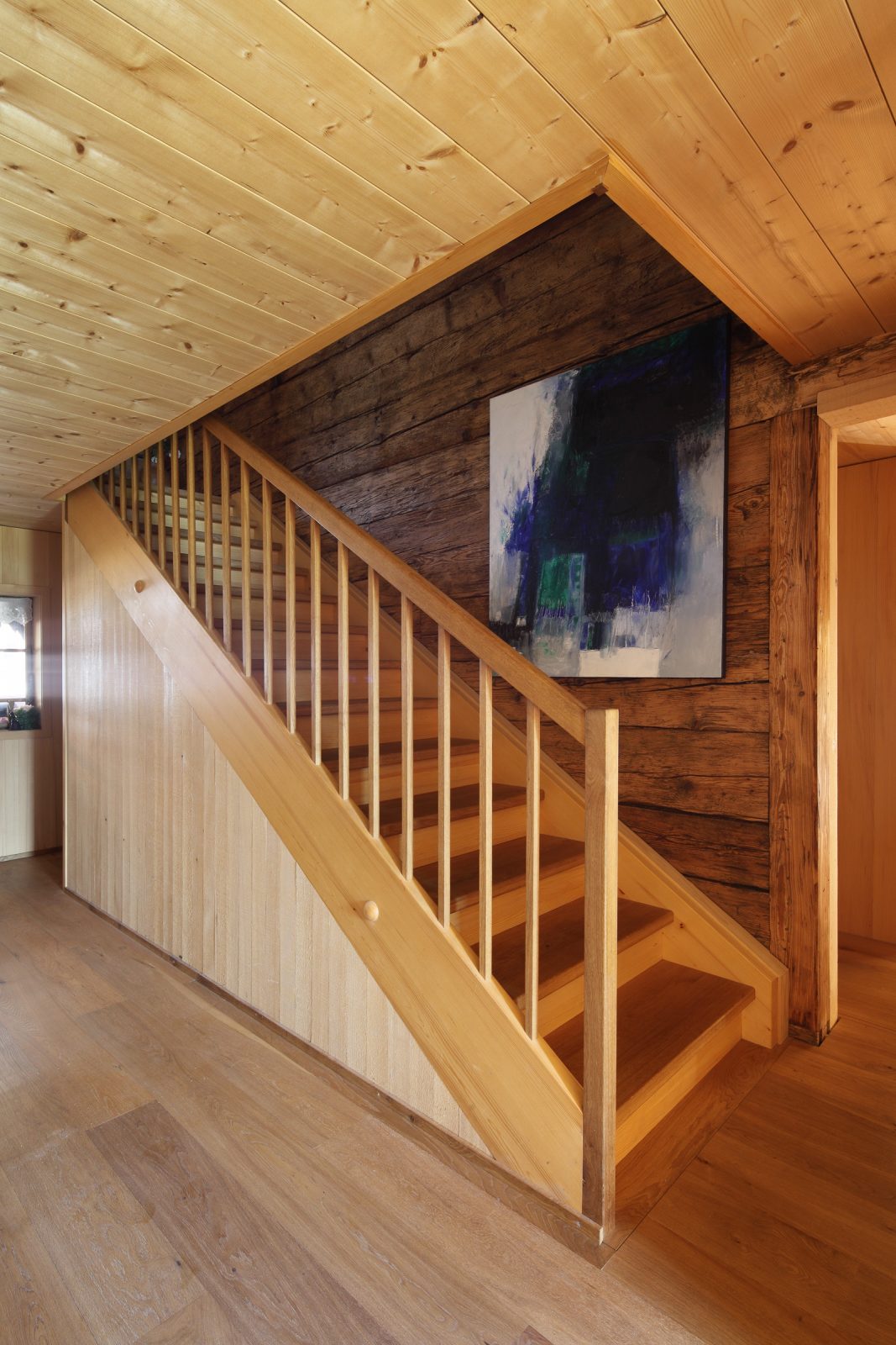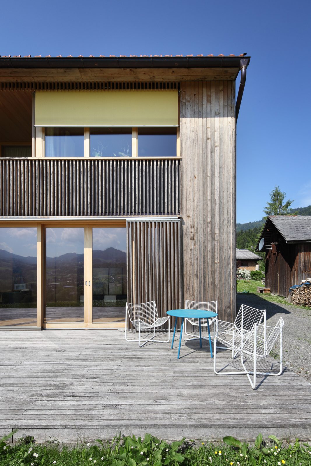 Das bestehende Haus ein klassisches Bauernhaus mit Wohnteil und Wirtschaftsteil wird bewohnt von einem Lehrer und Künstlerehepaar. Diese adaptieren für sich den historischen Wohnteil so dass die typischen Merkmale alter Bregenzerwälder Wohnkultur erkennbar bleiben und mit modernen funktionellen Teilen ergänzt werden. Der Wirtschaftsteil wurde von einem unschönen seitlichen Zubau befreit und umgenutzt für eine Garage, ein Künstleratelier sowie einer Wohnung für eine Verwandte. Dementsprechend wurde die Erschließungsstruktur des Hauses geändert und auf die Garage aus Ziegel und Beton wird eine moderne Holzbaukonstruktion aufgesetzt. Beim „Hinterhaus“ handelt es sich somit um einen Neubau. Besonderes Augenmerk galt der Erhaltung der „Zweiteiligkeit“ des Bregenzerwälderhauses. Als Kontrast zum geschindelten Vorderhaus wird das Hinterhaus senkrecht verschalt und möglichst zurückhaltend in der Gestaltung umgesetzt. Was auf der Nord- und Westseite eher gut möglich war, war komplexer auf der zu öffnenden Südseite wo zusammenhängende Holzflächen Bezug das ruhige Erscheinungsbild beibehalten.