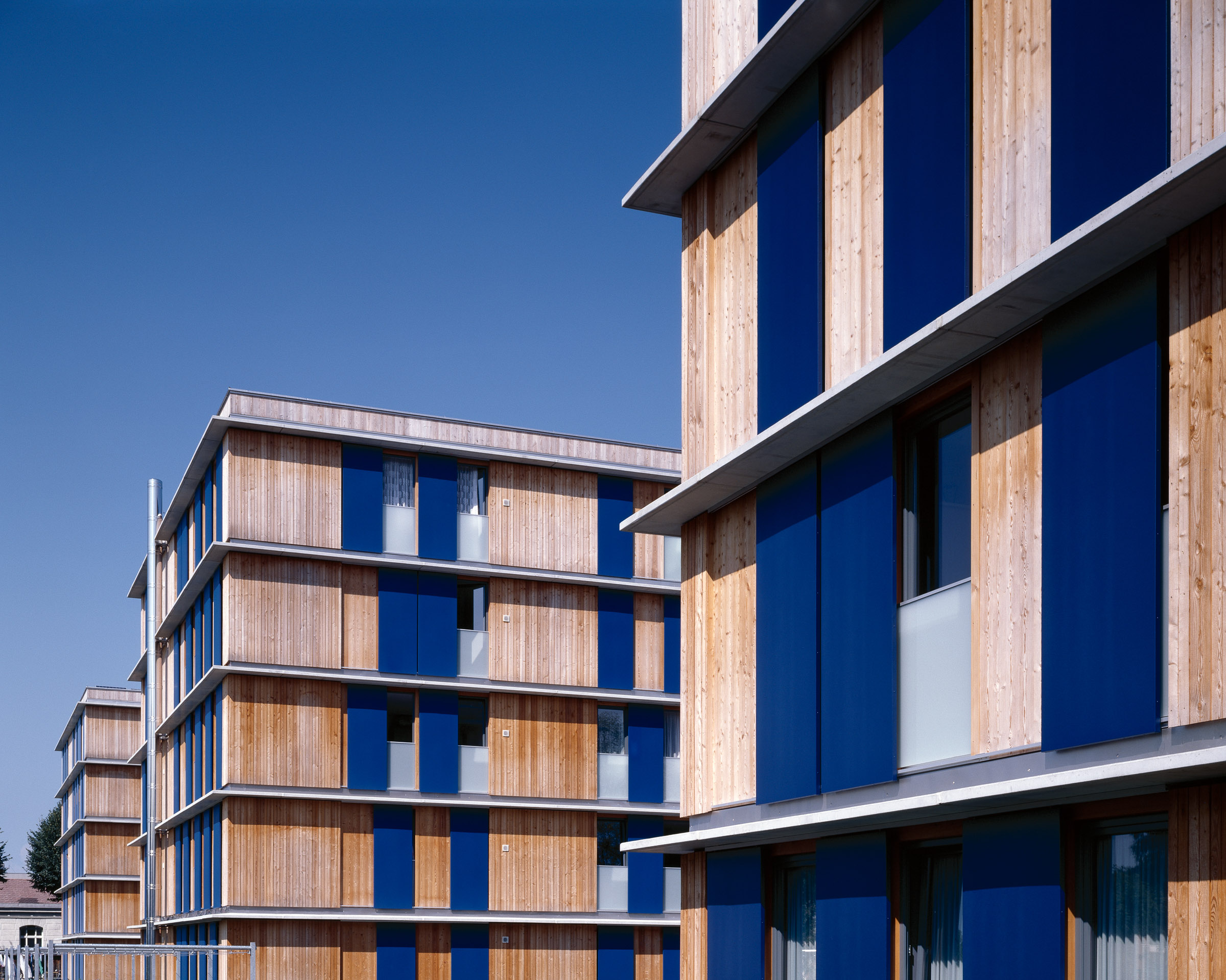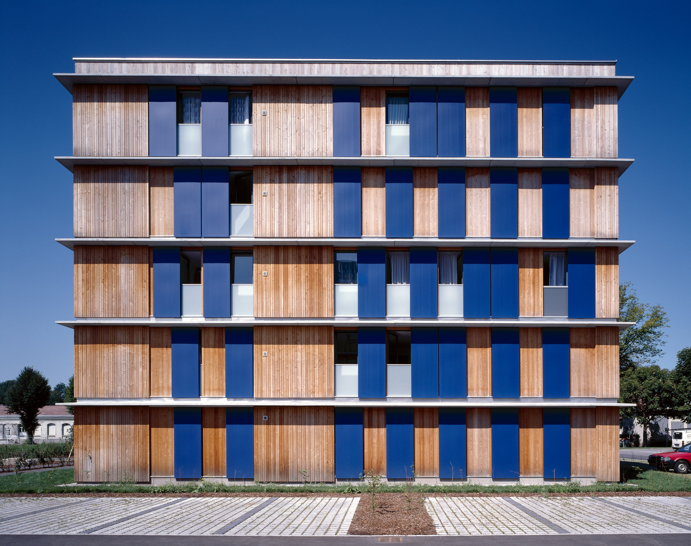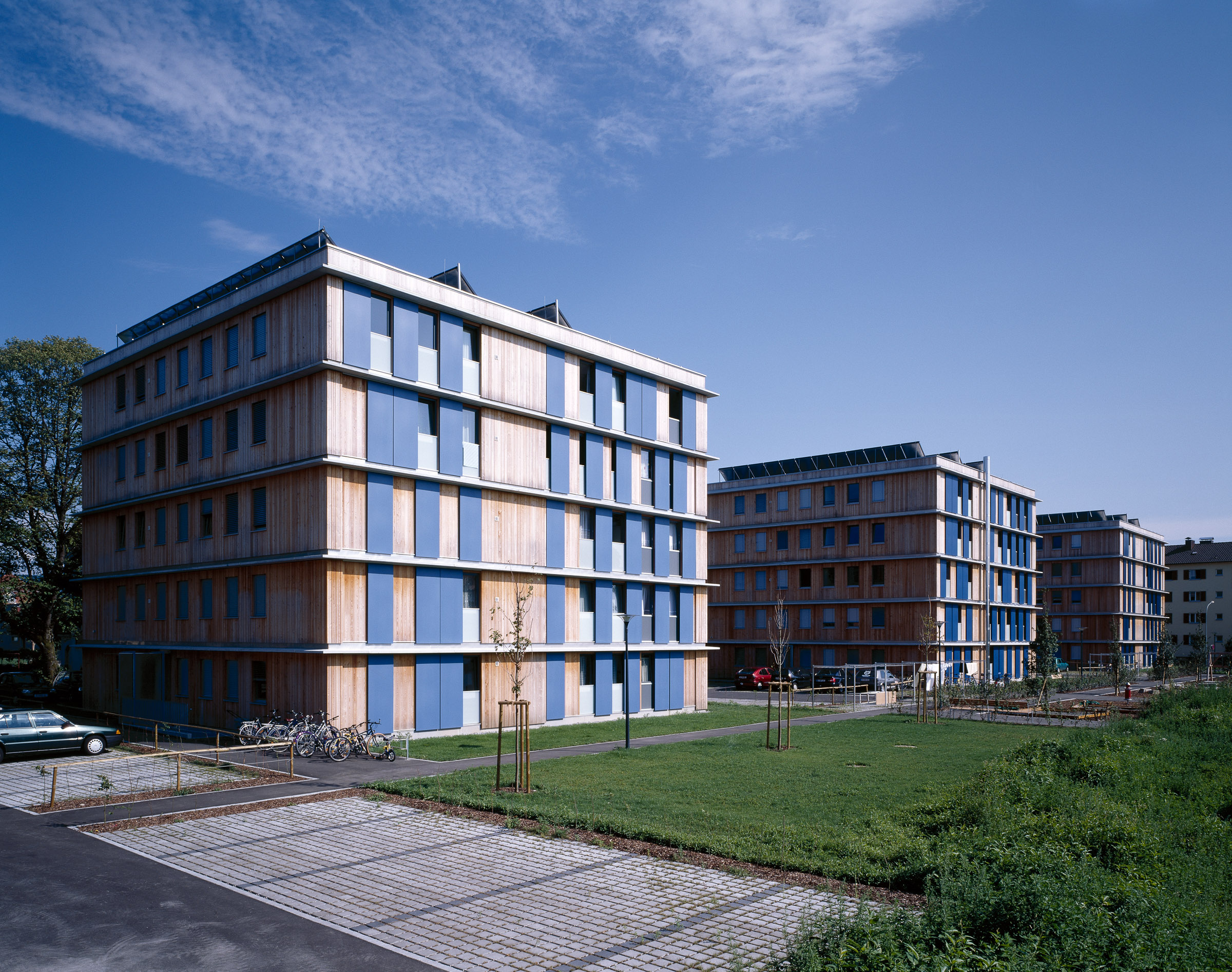 Der Verdienst der Bauherren bei diesem Projekt war die Offenheit, neue Wege zu erproben. Unüblich ist die Konstruktion – Skelettbau mit Holzwandelementen, die vorgefertigten Nasszellen sowie die Photovoltaikanlage, die als Schiebeläden an der Südfront des vorderen Hauses ausgeführt sind.
