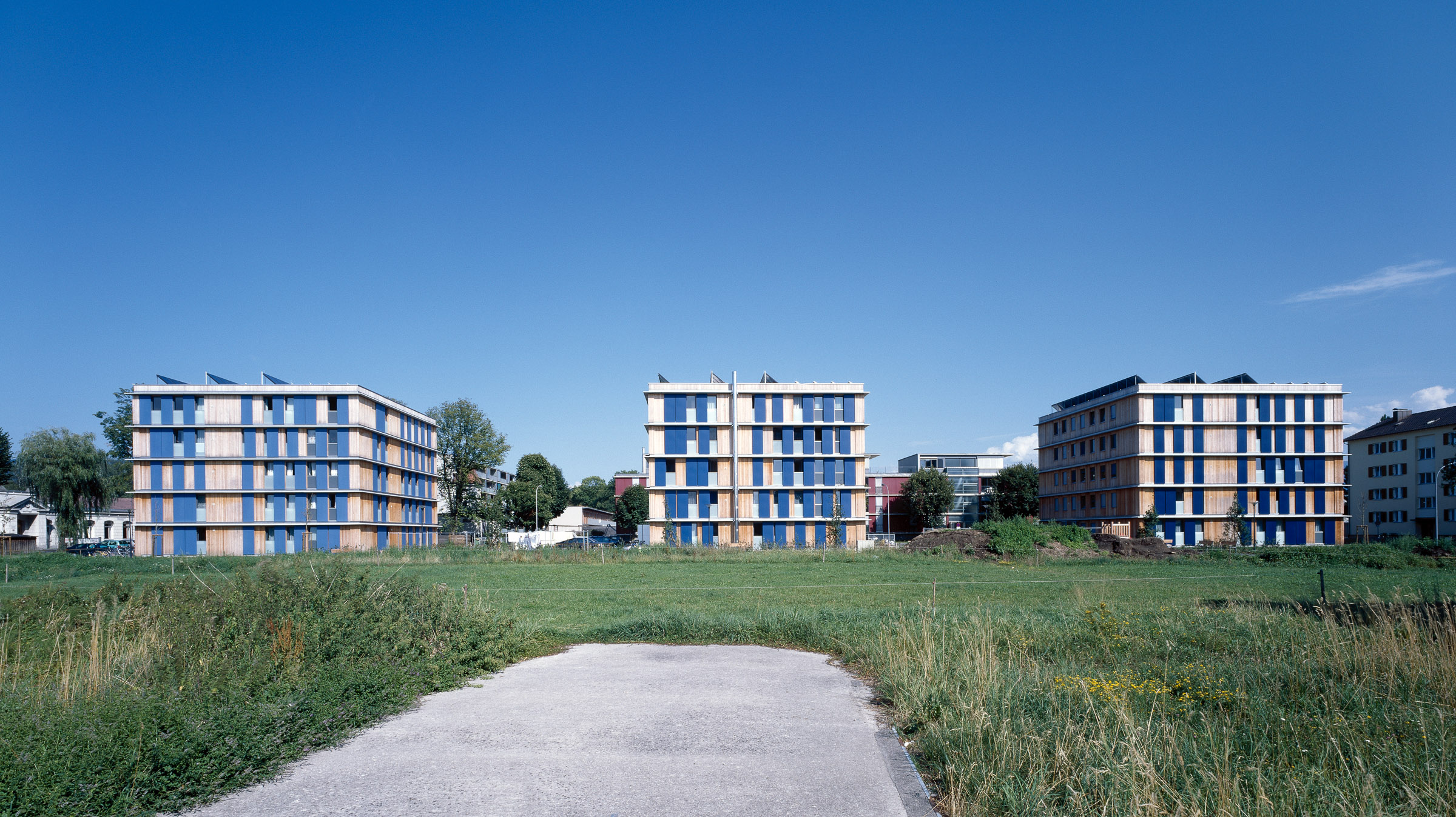 Die Wohnanlage Spinnereistraße liegt angrenzend an bestehende Wohnanlagen sowie an die „Schöller-Fabrik“ in der Nähe des Bodensees, 10 Minuten vom Dorfzentrum entfernt. Zielsetzung des Projektes war die möglichste Optimierung der Baustruktur sowie des Grundriss- und Baukörperkonzeptes, um durch minimierte Miet- und Betriebskosten das Wohnen in dieser guten Lage erschwinglich zu machen. Resultat sind würfelartige Baukörper mit minimierter zentraler Erschließung sowie offenes Parken. Die Gebäudehülle an vorgefertigten Holzwandelementen und gut gedämmtem Dach ermöglicht eine Niedrigenergiebauweise.