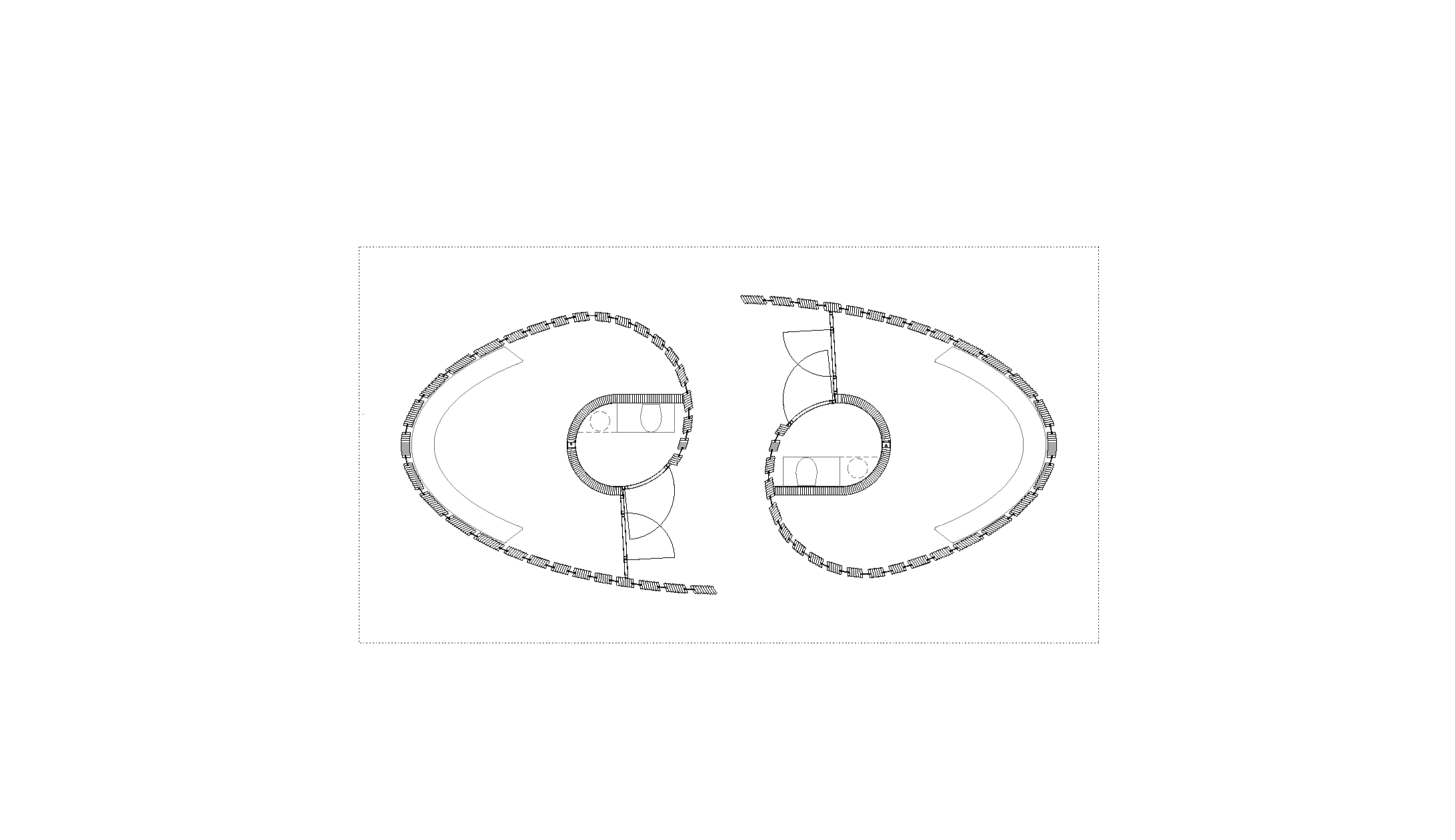 Die Wände des wandlungsfähigen Raums wurden mit Schrauben zusammengefügt. Sie bestehen aus Gewölbepfeilern, die in Form eines Sägeblatts zusammengesetzt sind. Zwischen die Gewölbepfeiler wurden vertikale Fensterscheiben eingesetzt, die gebogene Wände auf einem 360-mm-Stahlsockel bilden, welcher seinerseits in eine 200 mm starke Betonplatte gegossen wurde.