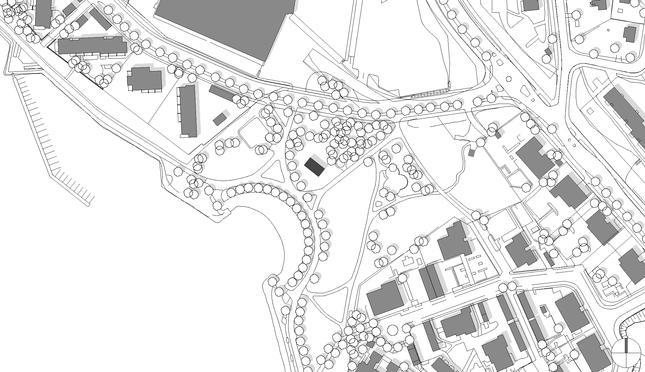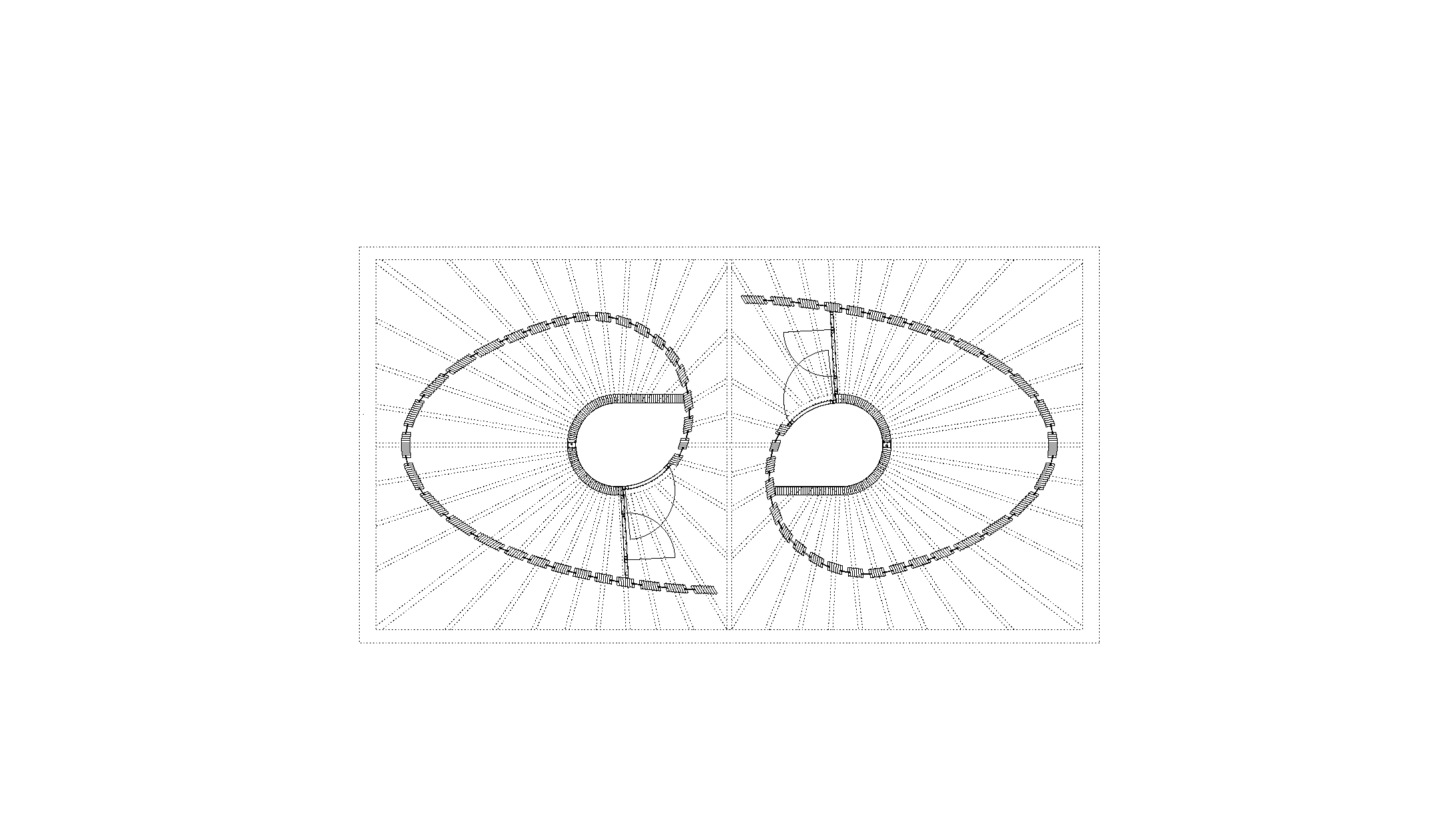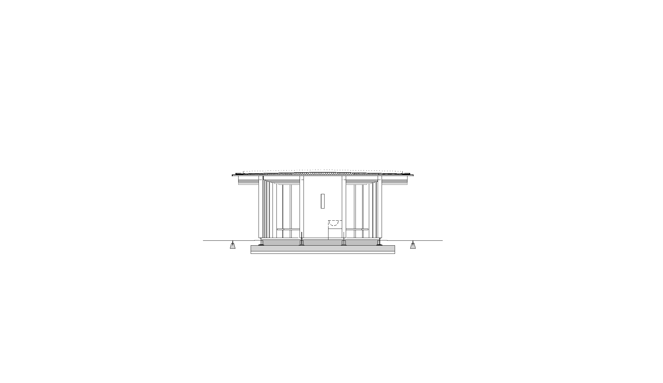 Die Pfeiler stützen zwei strahlenförmige Rahmen aus Brettschichtholzträgern, die eingeschoben und mithilfe von Schrauben an die Pfeiler befestigt sind. Auf dem Trägerrahmen ist eine horizontal laminierte Verblendungsplatte aus Bauholz aufgebracht. Die Platte verfügt über ein schräges Dach und ist wasserdicht.