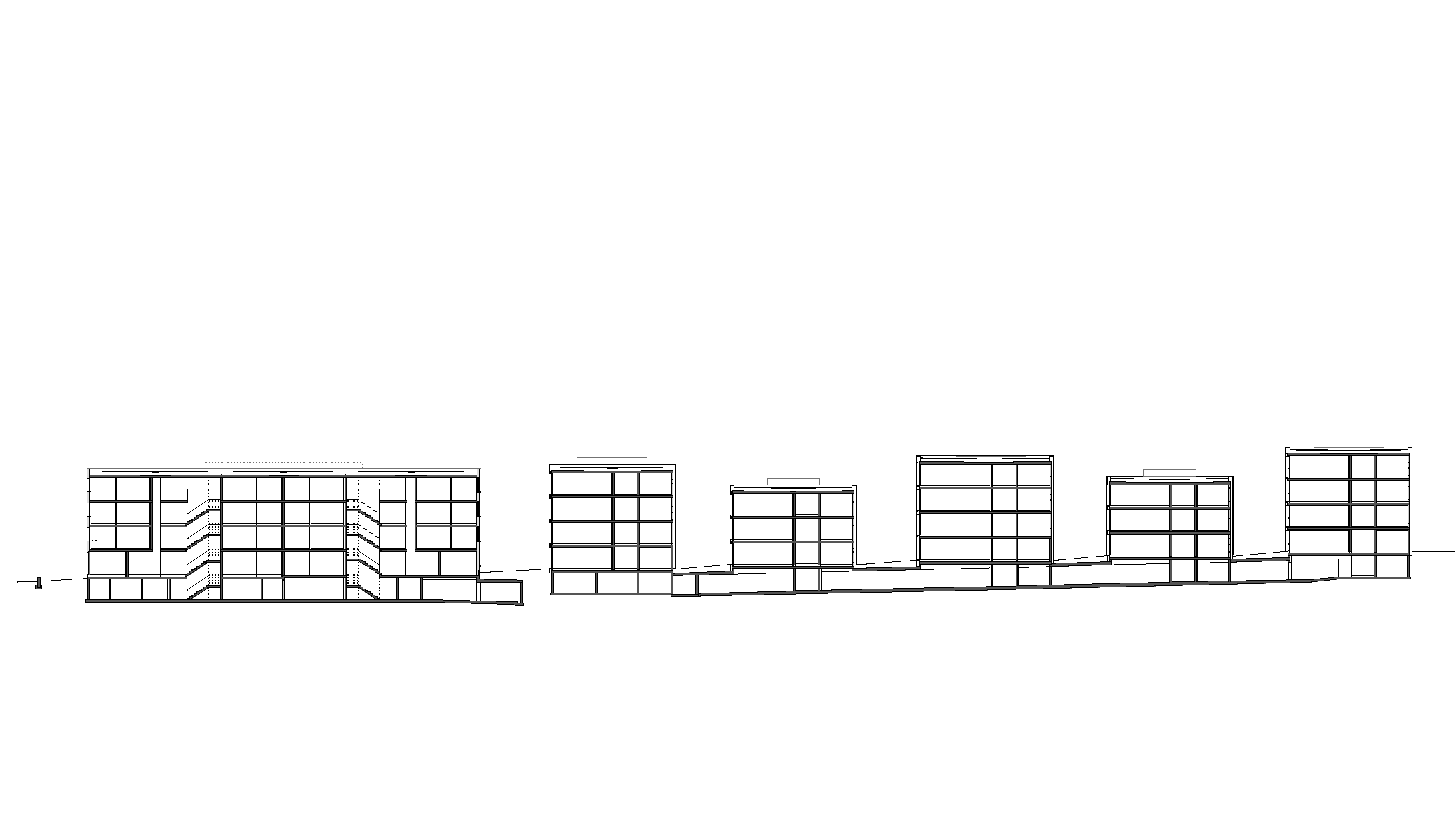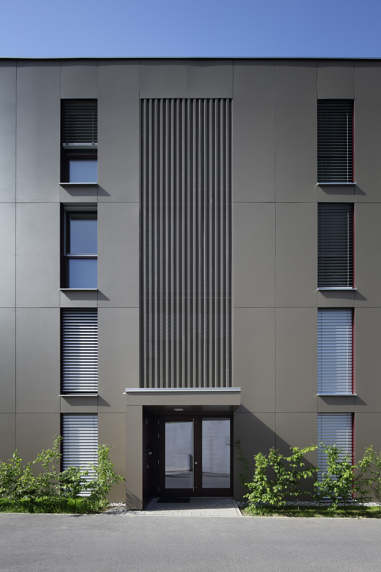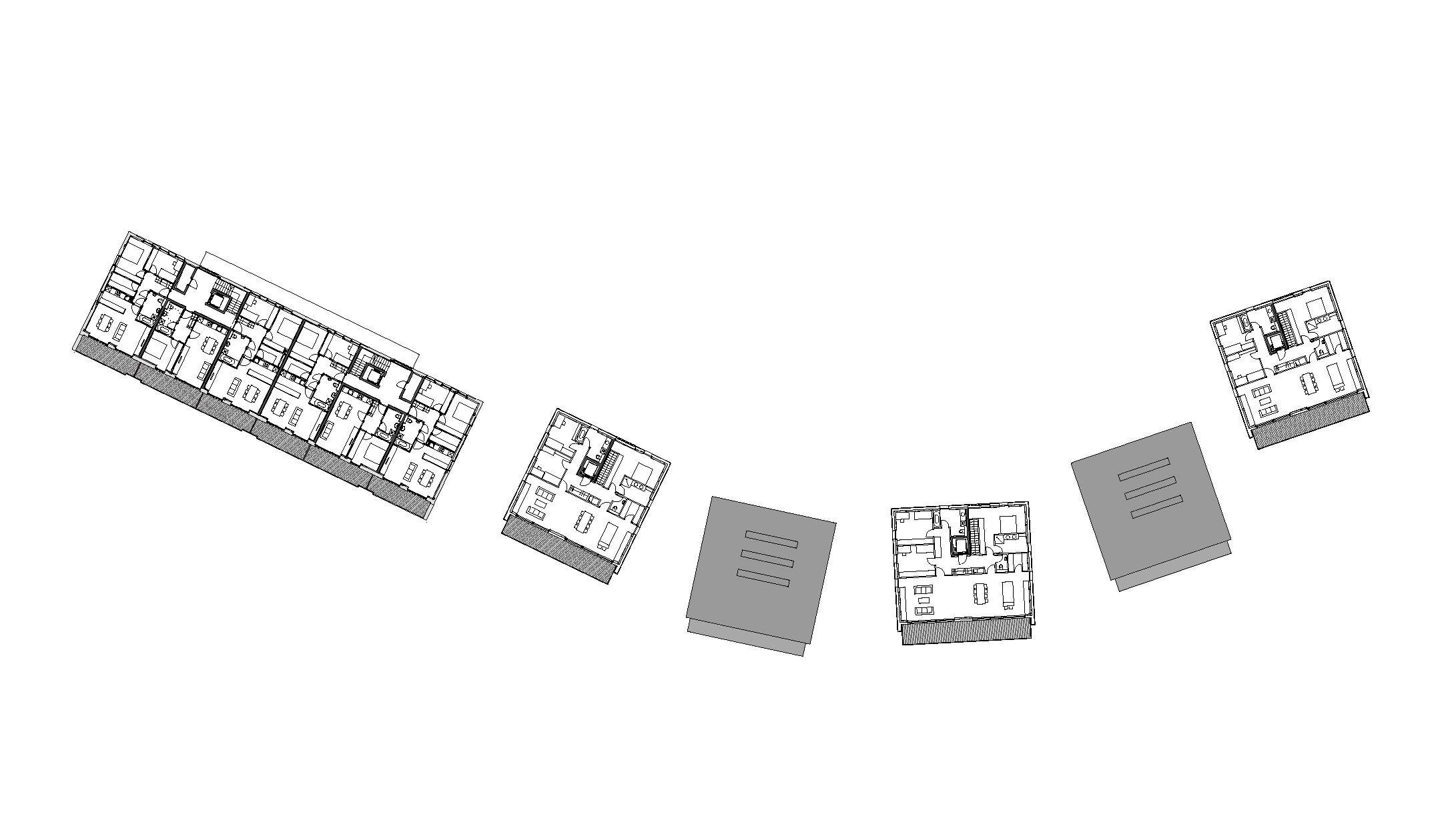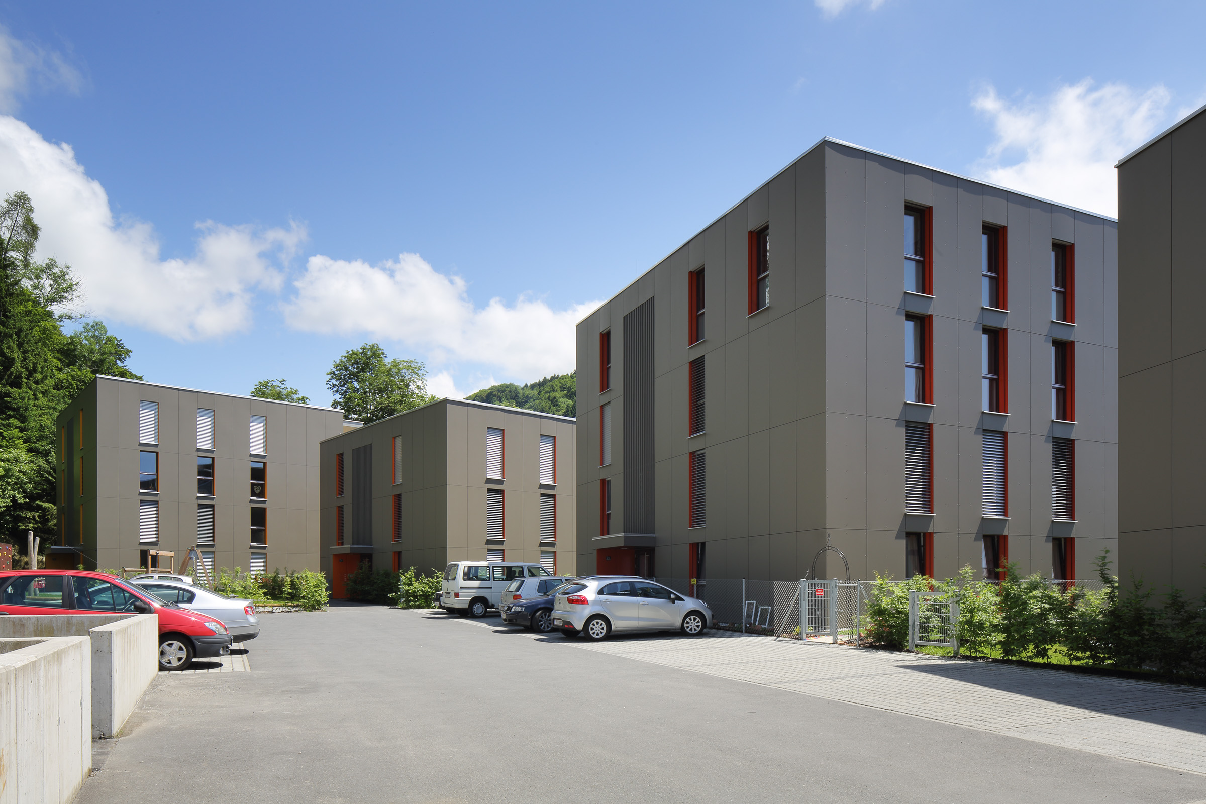 Das größte Gebäude liegt direkt an der Hofsteigstraße. Durch seine markante Stellung gegenüber Kirche und Friedhof wird der Beginn des öffentlich wichtigen Straßenabschnitts markiert und räumlich definiert. In diesem Haupthaus befinden sich ein Geschäft und eine Arztpraxis, sowie 21 geförderte Wohnungen in Passivhausbauweise. In den fünf kleineren Wohngebäuden befinden sich jeweils 5-7 Eigentumswohnungen. Diese Gebäude werden mit Erdwärme beheizt und sind ebenfalls mit einer Komfortlüftung ausgestattet. Zudem verfügen sämtliche Gebäude über eine thermische Solaranlage. Während das Haupthaus in Analogie zum nahegelegenen Gemeindehaus, mit einer viergeschossigen Schindelfassade und Holzwandelementen ausgeführt wurde, sind die hinteren fünf Gebäude in konventioneller Massivbauweise mit Plattenfassade errichtet.