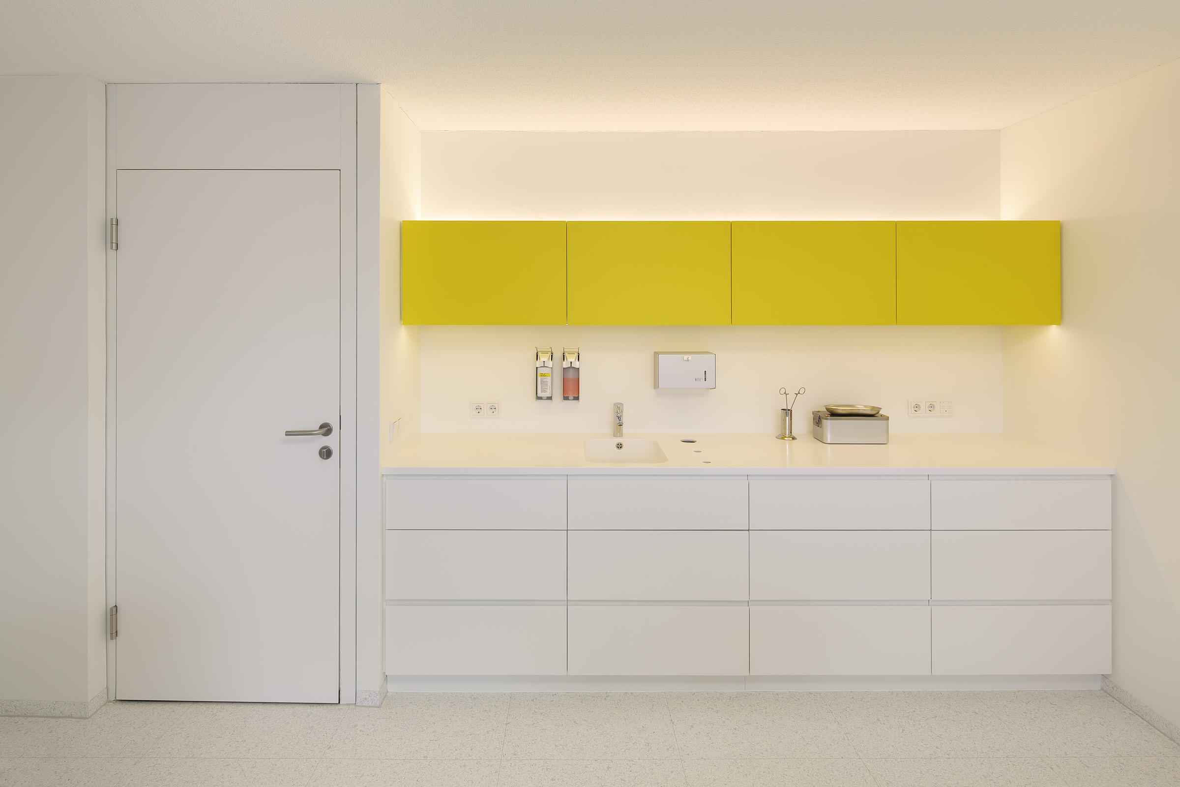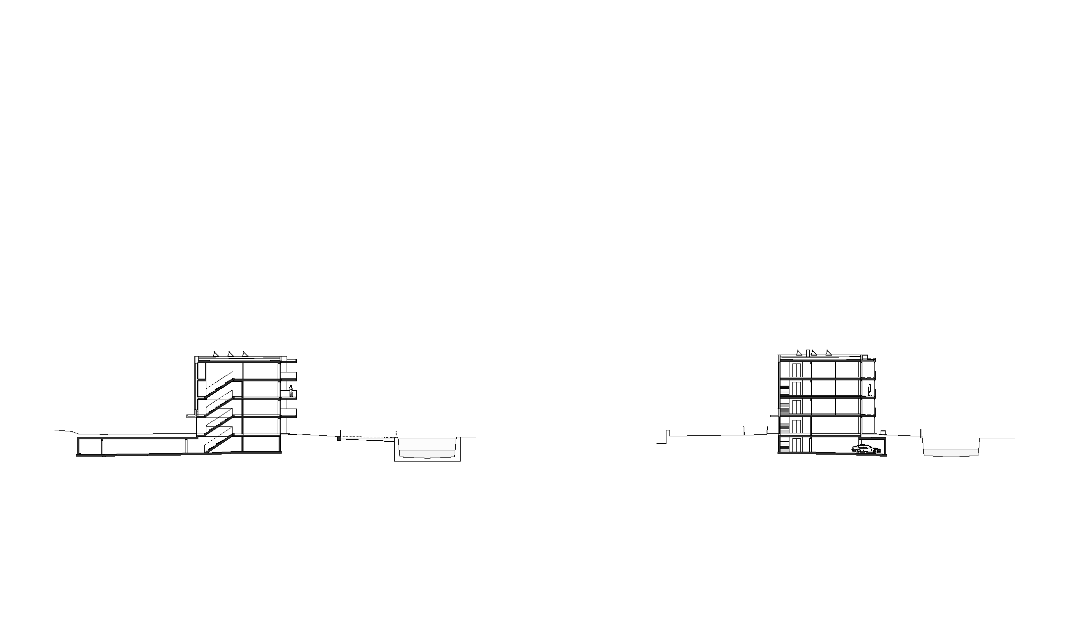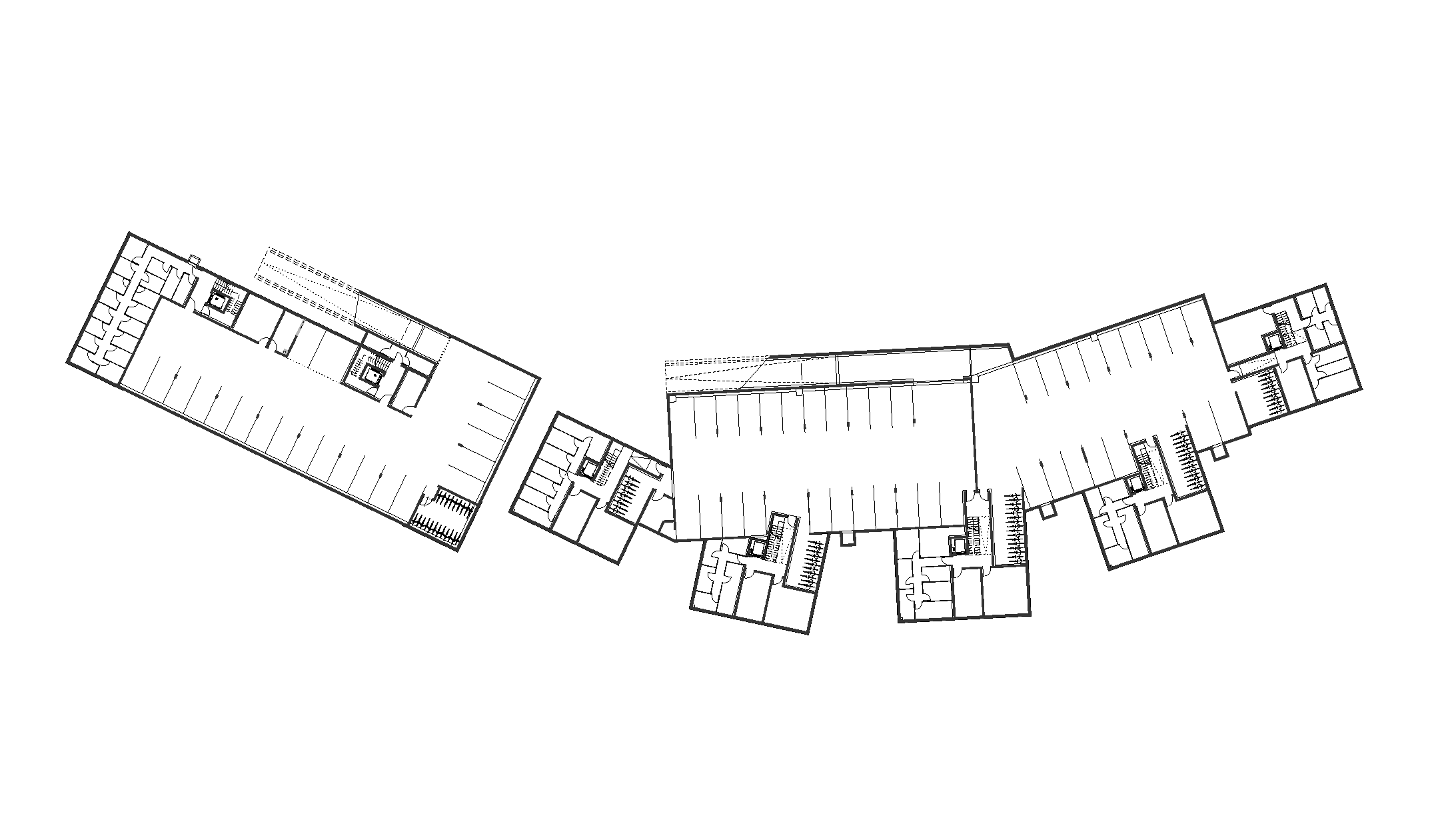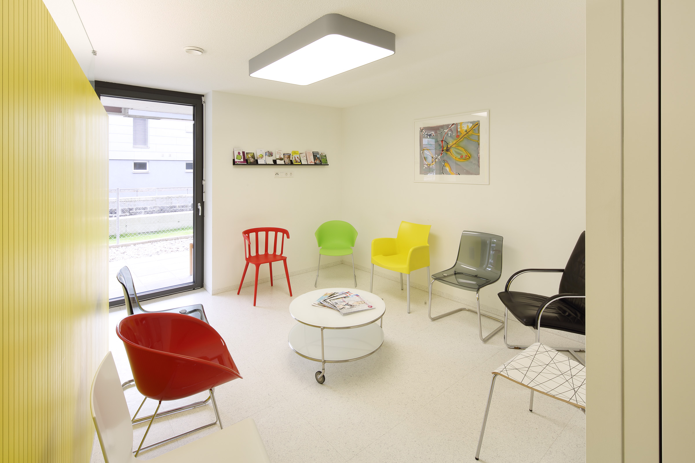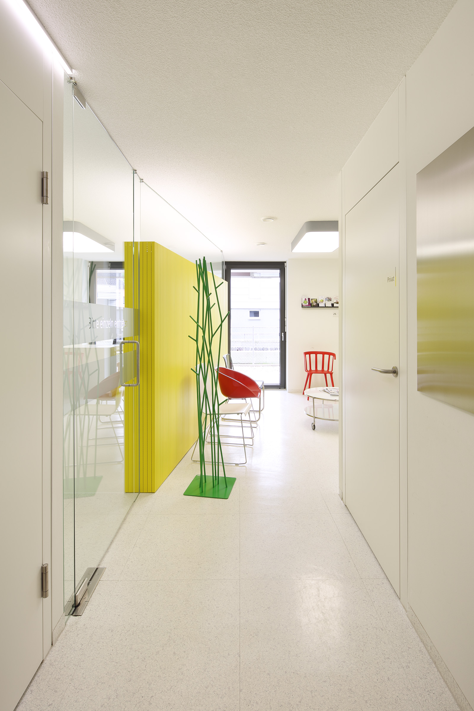 Das größte Gebäude liegt direkt an der Hofsteigstraße. Durch seine markante Stellung gegenüber Kirche und Friedhof wird der Beginn des öffentlich wichtigen Straßenabschnitts markiert und räumlich definiert. In diesem Haupthaus befinden sich ein Geschäft und eine Arztpraxis, sowie 21 geförderte Wohnungen in Passivhausbauweise. In den fünf kleineren Wohngebäuden befinden sich jeweils 5-7 Eigentumswohnungen. Diese Gebäude werden mit Erdwärme beheizt und sind ebenfalls mit einer Komfortlüftung ausgestattet. Zudem verfügen sämtliche Gebäude über eine thermische Solaranlage. Während das Haupthaus in Analogie zum nahegelegenen Gemeindehaus, mit einer viergeschossigen Schindelfassade und Holzwandelementen ausgeführt wurde, sind die hinteren fünf Gebäude in konventioneller Massivbauweise mit Plattenfassade errichtet.