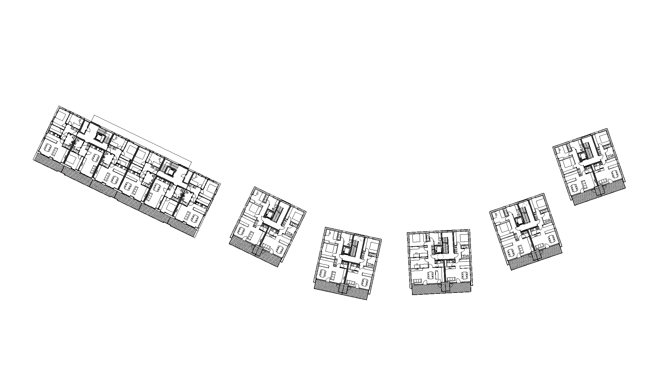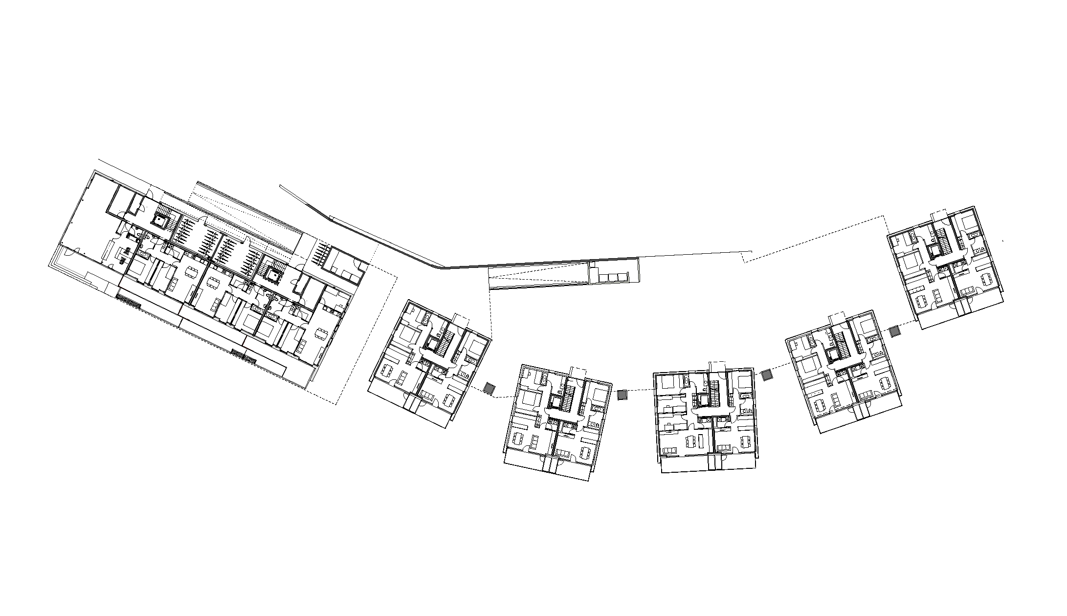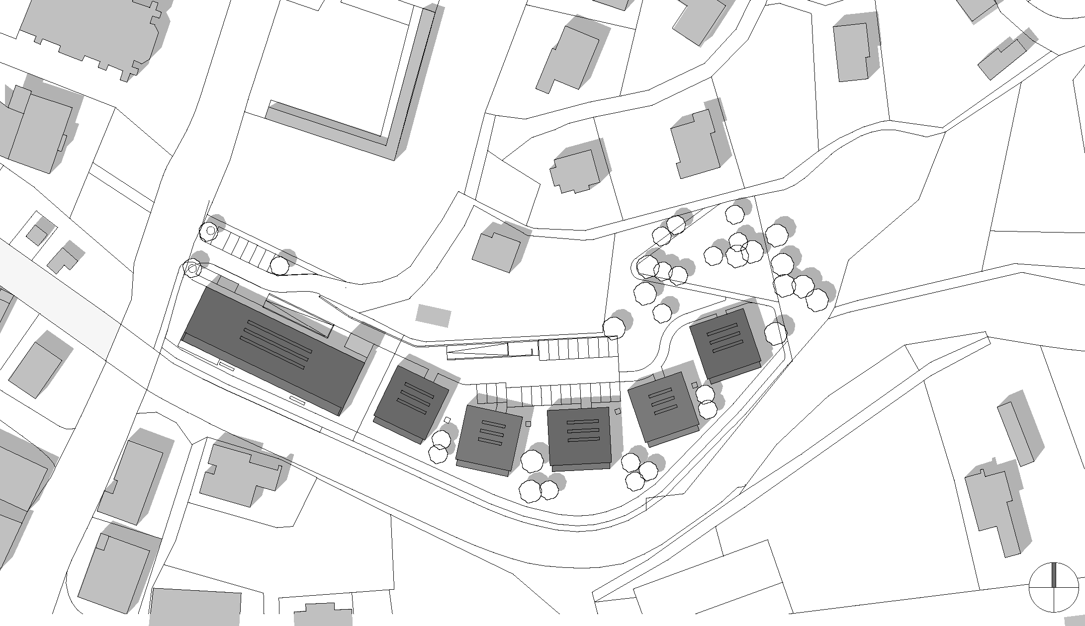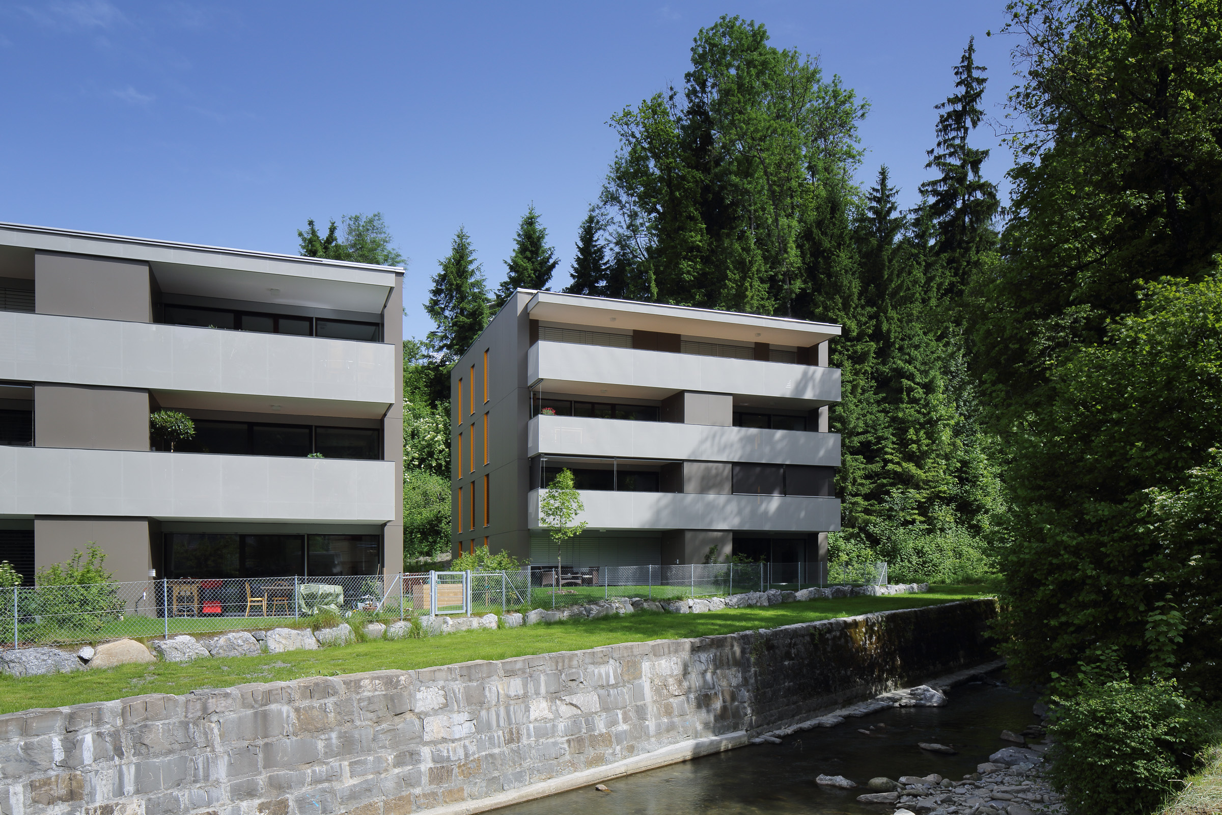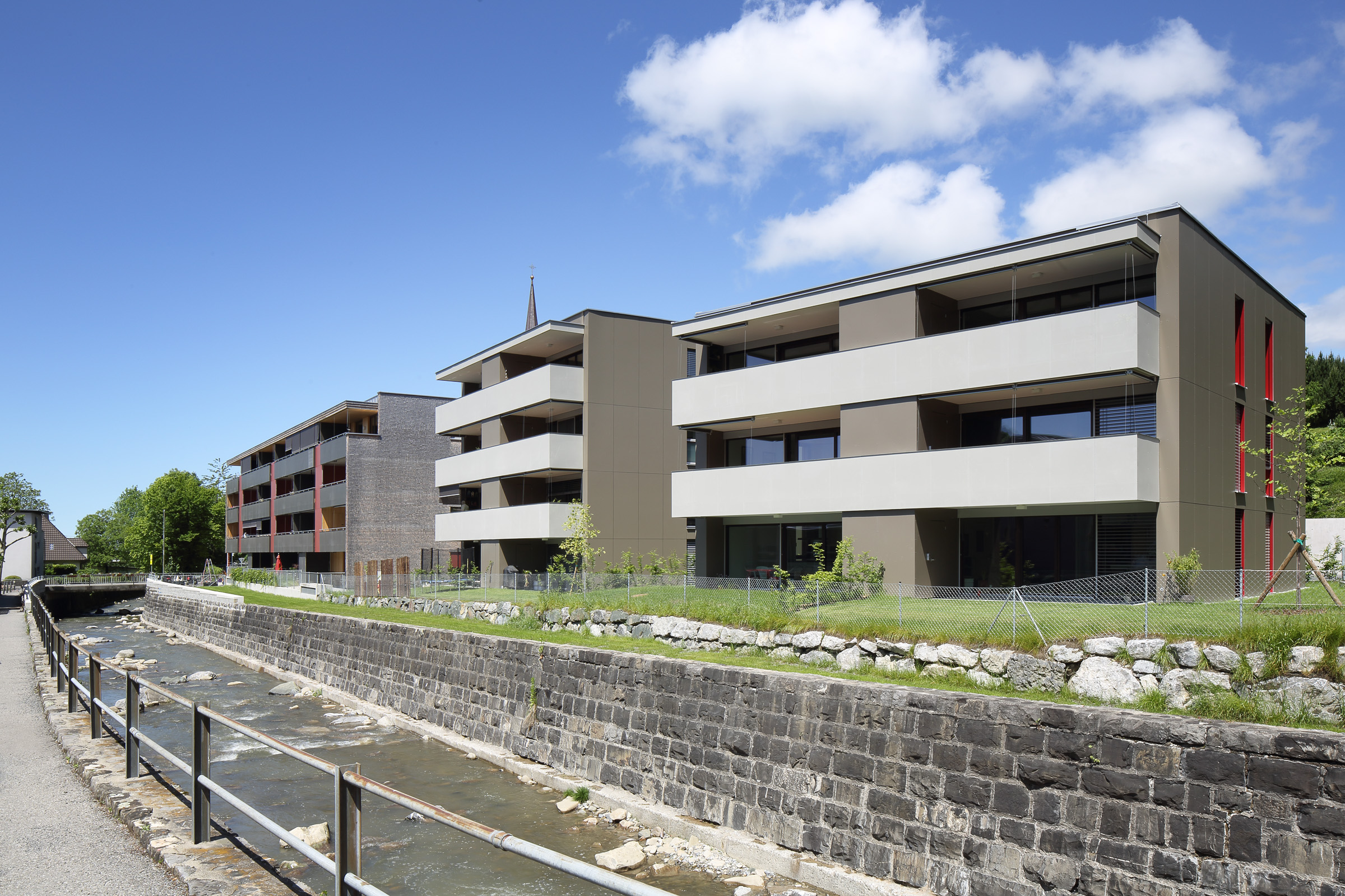 Von der Kirche bis zum Gemeindehaus bildet die Hofsteigstraße den eigentlichen Ortskern von Schwarzach. Das in diesem Bereich gelegene Grundstück wurde durch einen Brand frei zur Nachnutzung als Wohnquartier für junge Familien. Das langgestreckte Areal wird nordseitig von einem steilen Hang, und südseitig von der Schwarzach umschlossen. Die sechs Mehrfamilienwohnhäuser sind alle nach Süden orientiert und dem Bachlauf folgend aufgereiht.
