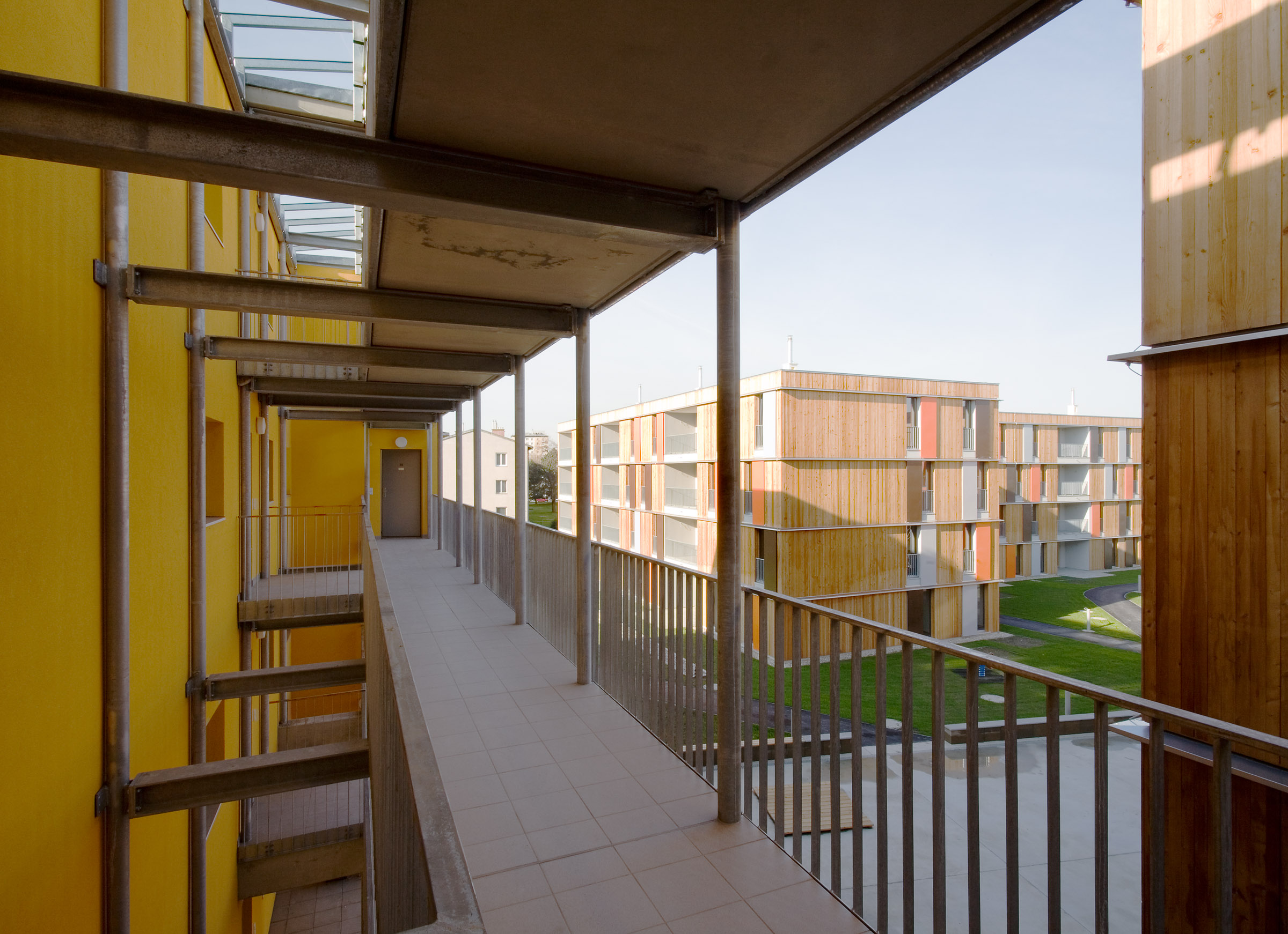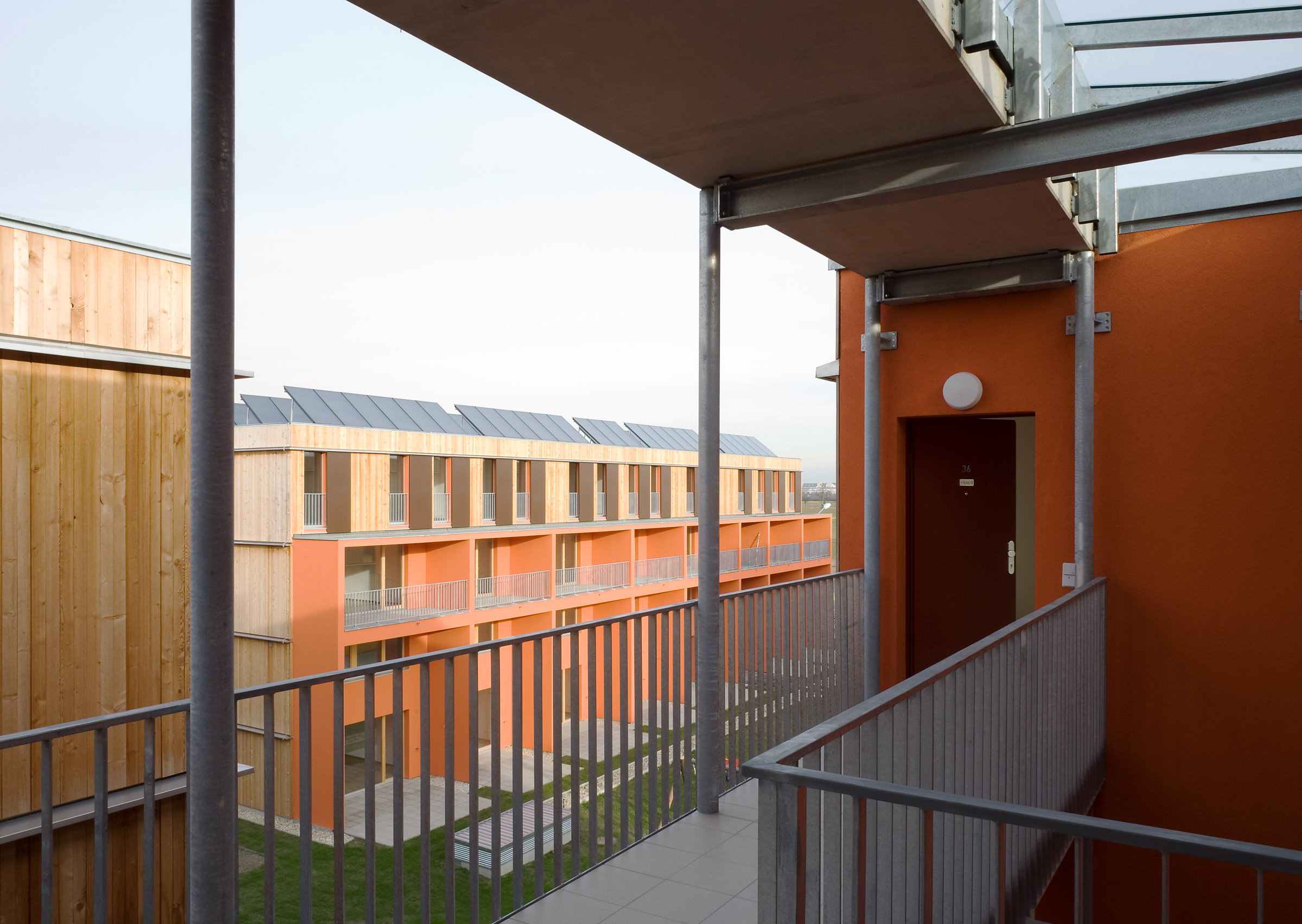 Another novelty is the use of weatherproof, prefabricated, laminated timber elements, in order to ensure the construction quality on the building site. The exterior access balconies are designed as steel structures and are positioned in front of the timber structure. They are equipped with non-flammable decks, made of precast concrete. The projected heating energy consumption of 36 kWh⁄ m² a per annum conforms with the energy efficiency guidelines. About half of the hot water is produced using a solar heating system. The generated energy savings correspond to the heating energy consumption of nine highly insulated single family houses.