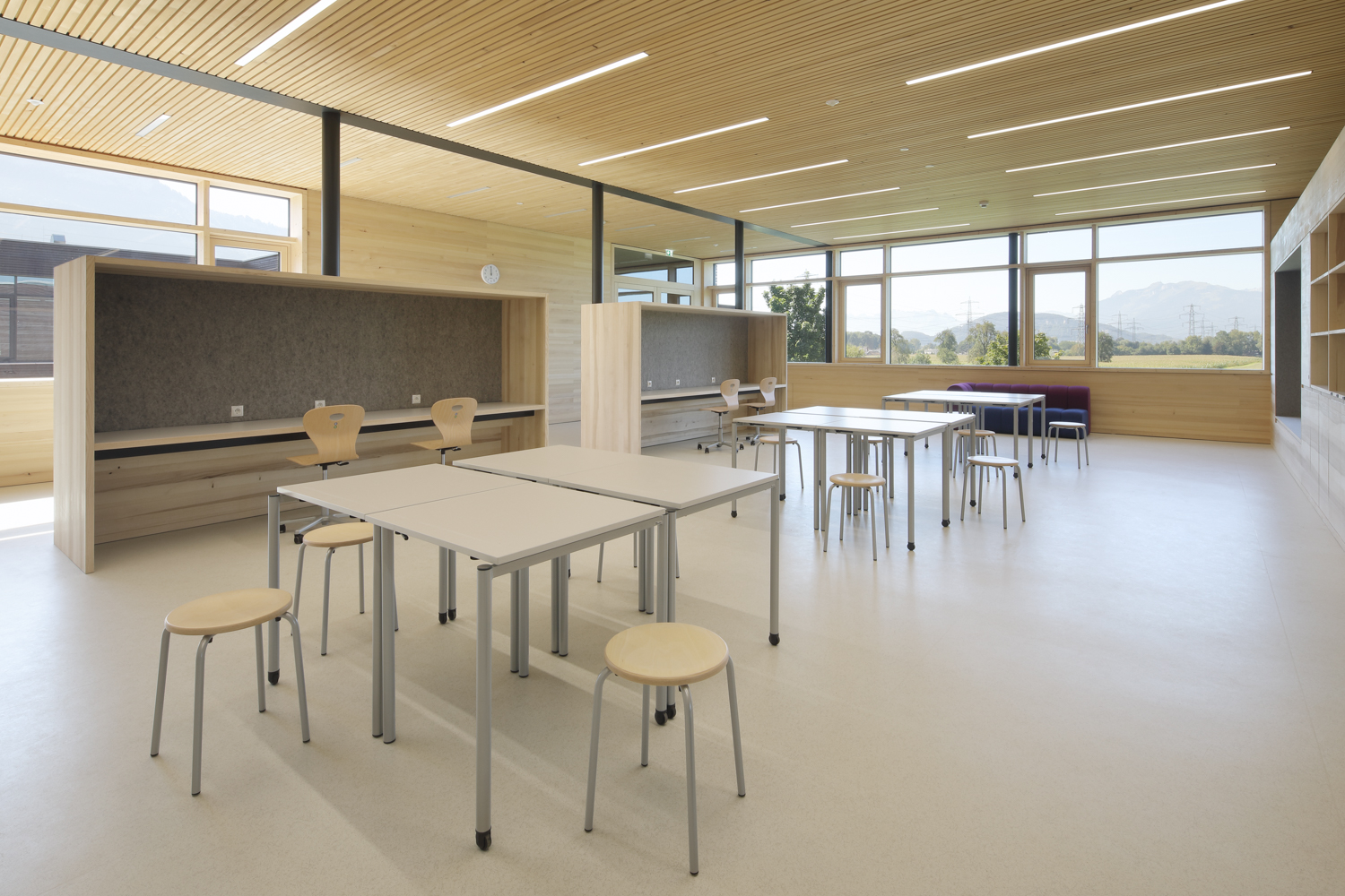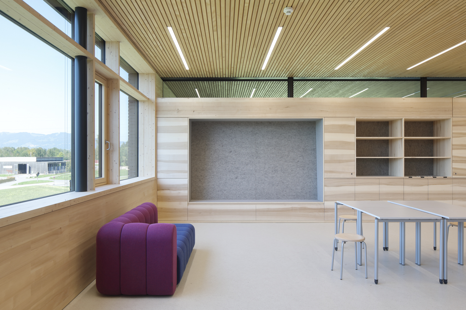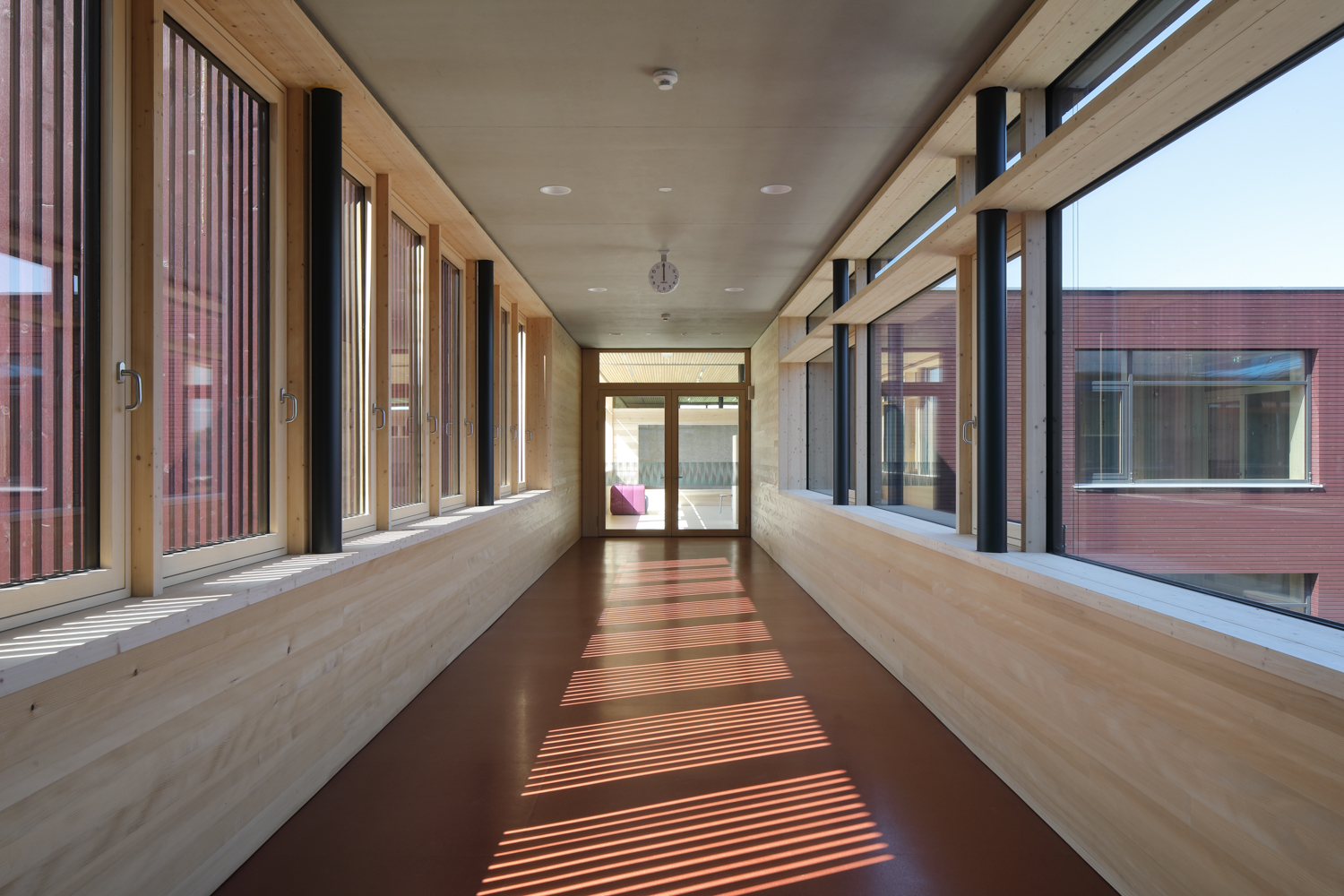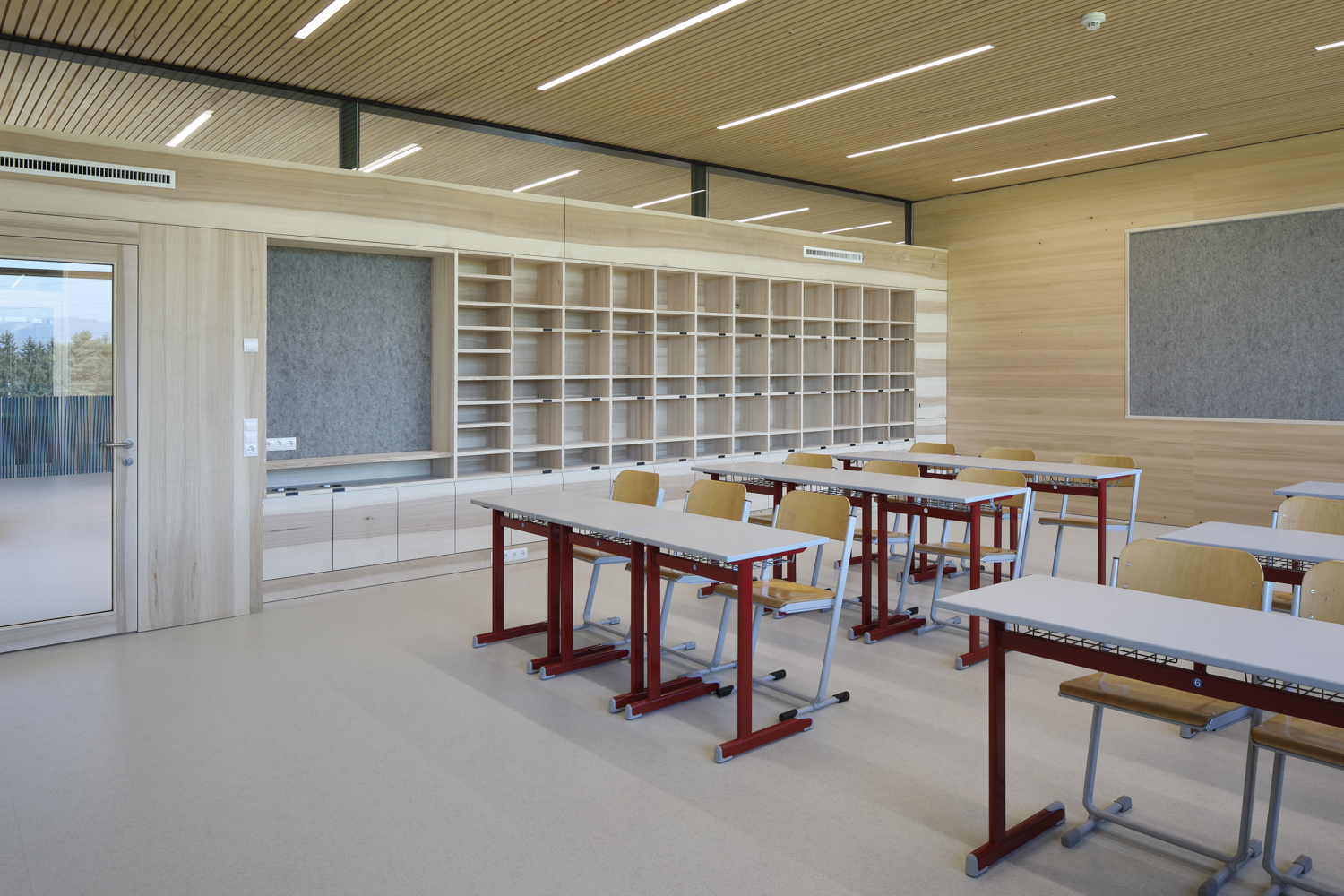 Während im massiv ausgeführten Sockelgeschoss vorwiegend Technik- und Werkräume untergebracht sind, wurden die beiden darüber liegenden Stockwerke als offene und flexible Lernlandschaften mit naturbelassenen Holzoberflächen und hellen Bodenbelägen gestaltet. Um die Trennung der Klassenzimmer von den angrenzenden Gemeinschaftsflächen nur durch räumlich formulierte Möbeleinbauten realisieren zu können, übernehmen deckengleiche Träger und Stahlstützen die statischen Lasten der tragenden Mittelachsen. Dieser Gebäudeteil ist wie der Zubau der letzten Erweiterungsphase in Brettstapelbauweise mit akustisch wirksamen Massivholzdecken gefügt, wobei die Decke über dem Erdgeschoss als Holz-Beton-Verbund gefertigt ist, um Schwingungen zu reduzieren. Auch die bewährte Fassadengestaltung aus dunkelrot gestrichenen sägerauen Holzlatten wurde wieder übernommen und durch neue Elemente sinnvoll ergänzt, um eine gestalterische und konstruktive Konsistenz für das gesamte Schulhaus zu etablieren