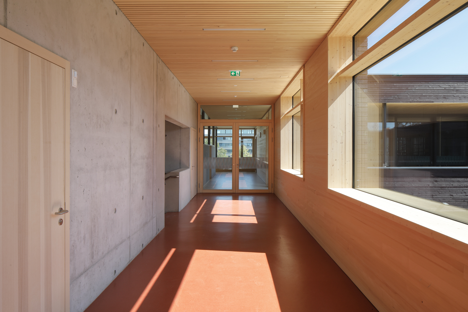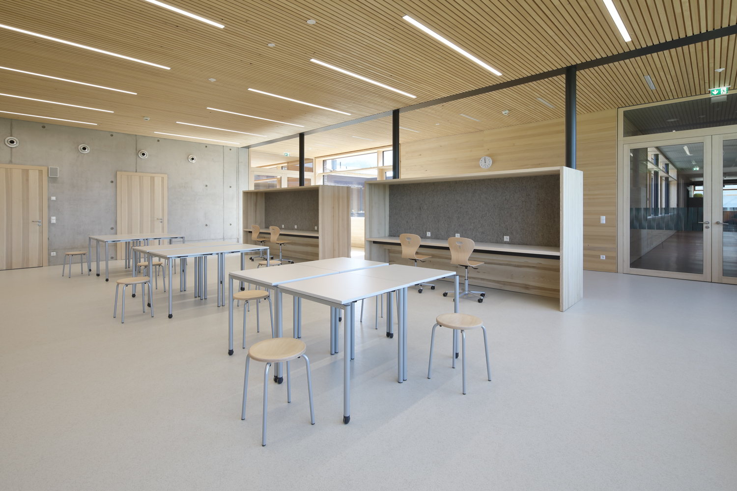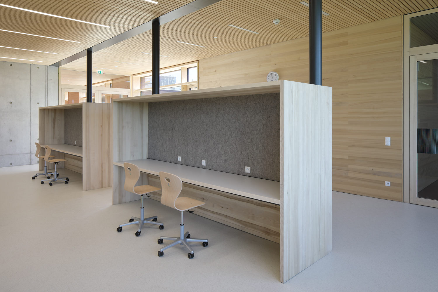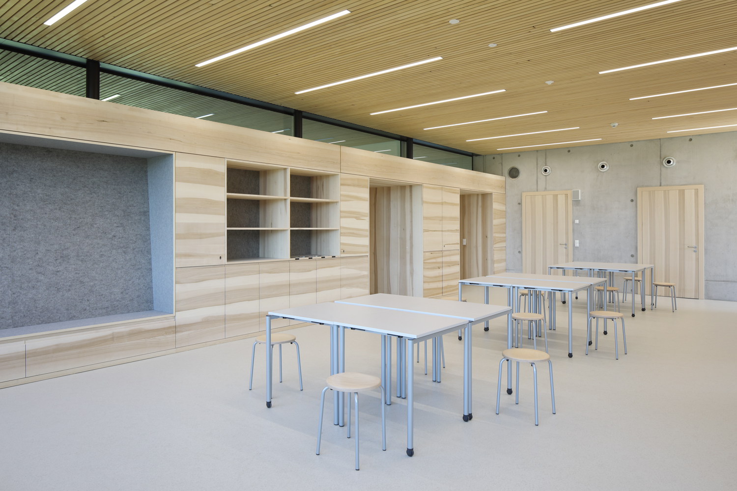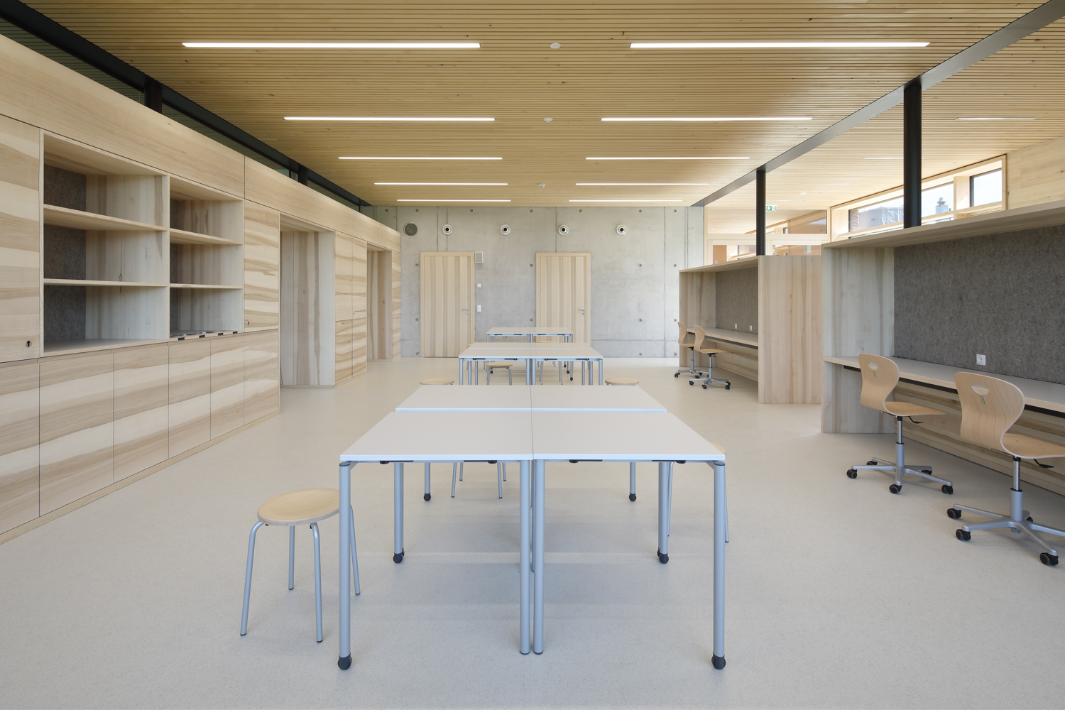 Während im massiv ausgeführten Sockelgeschoss vorwiegend Technik- und Werkräume untergebracht sind, wurden die beiden darüber liegenden Stockwerke als offene und flexible Lernlandschaften mit naturbelassenen Holzoberflächen und hellen Bodenbelägen gestaltet. Um die Trennung der Klassenzimmer von den angrenzenden Gemeinschaftsflächen nur durch räumlich formulierte Möbeleinbauten realisieren zu können, übernehmen deckengleiche Träger und Stahlstützen die statischen Lasten der tragenden Mittelachsen. Dieser Gebäudeteil ist wie der Zubau der letzten Erweiterungsphase in Brettstapelbauweise mit akustisch wirksamen Massivholzdecken gefügt, wobei die Decke über dem Erdgeschoss als Holz-Beton-Verbund gefertigt ist, um Schwingungen zu reduzieren. Auch die bewährte Fassadengestaltung aus dunkelrot gestrichenen sägerauen Holzlatten wurde wieder übernommen und durch neue Elemente sinnvoll ergänzt, um eine gestalterische und konstruktive Konsistenz für das gesamte Schulhaus zu etablieren