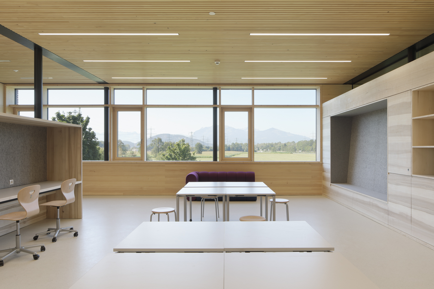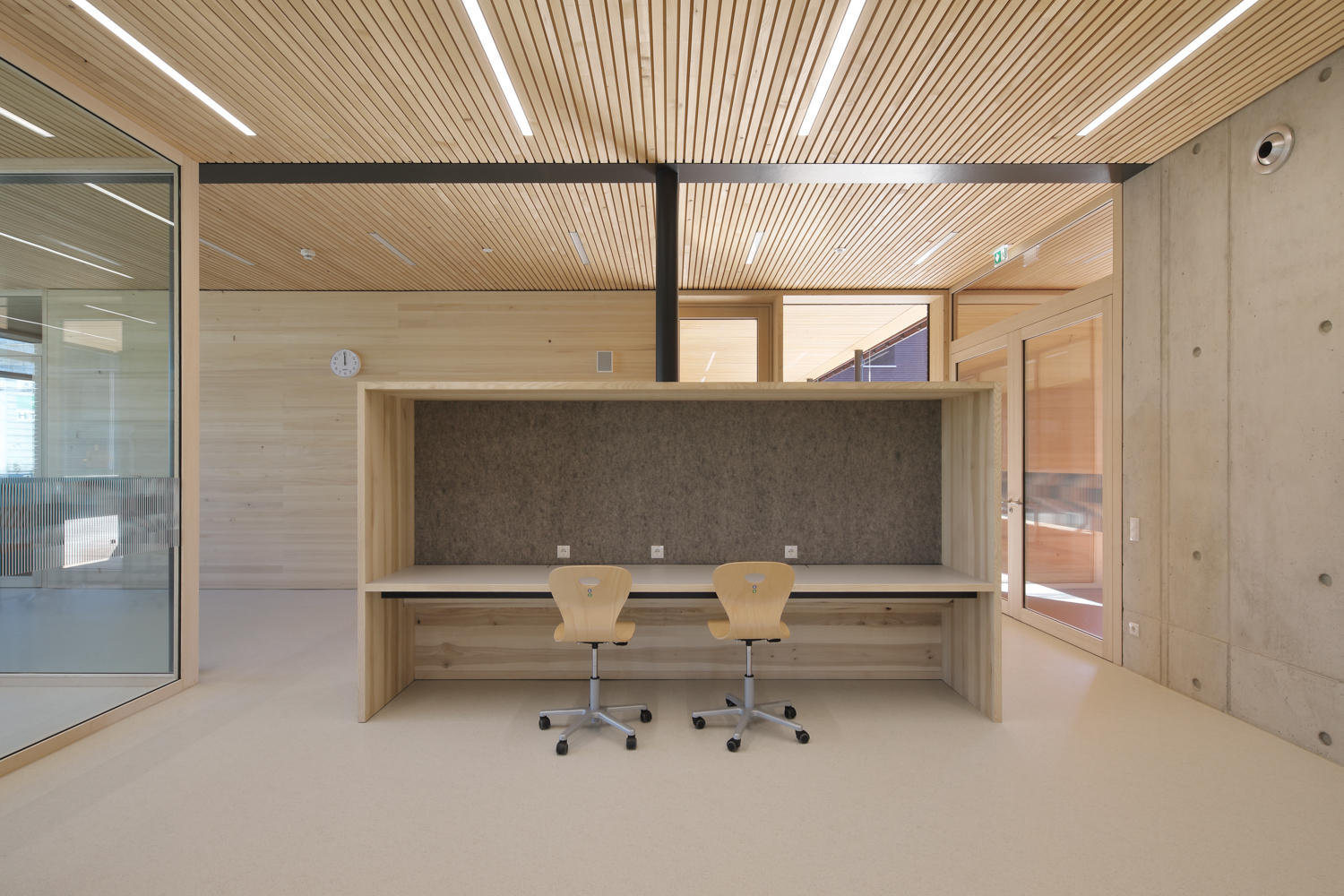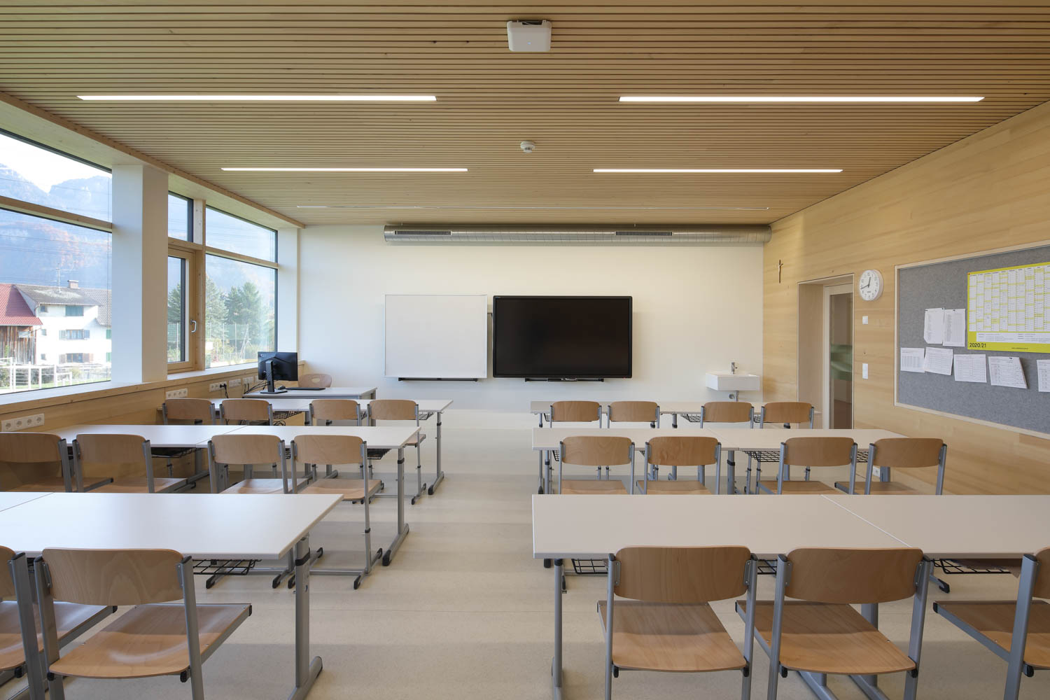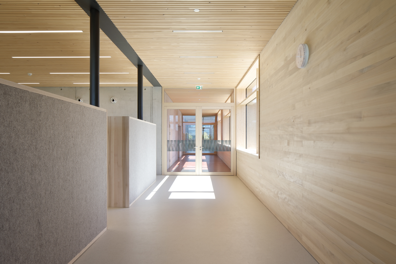 Während im massiv ausgeführten Sockelgeschoss vorwiegend Technik- und Werkräume untergebracht sind, wurden die beiden darüber liegenden Stockwerke als offene und flexible Lernlandschaften mit naturbelassenen Holzoberflächen und hellen Bodenbelägen gestaltet. Um die Trennung der Klassenzimmer von den angrenzenden Gemeinschaftsflächen nur durch räumlich formulierte Möbeleinbauten realisieren zu können, übernehmen deckengleiche Träger und Stahlstützen die statischen Lasten der tragenden Mittelachsen. Dieser Gebäudeteil ist wie der Zubau der letzten Erweiterungsphase in Brettstapelbauweise mit akustisch wirksamen Massivholzdecken gefügt, wobei die Decke über dem Erdgeschoss als Holz-Beton-Verbund gefertigt ist, um Schwingungen zu reduzieren. Auch die bewährte Fassadengestaltung aus dunkelrot gestrichenen sägerauen Holzlatten wurde wieder übernommen und durch neue Elemente sinnvoll ergänzt, um eine gestalterische und konstruktive Konsistenz für das gesamte Schulhaus zu etablieren