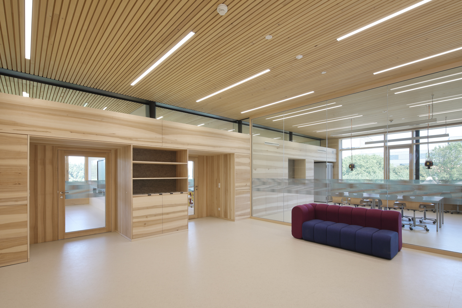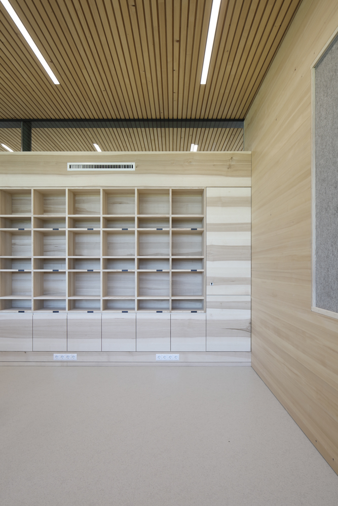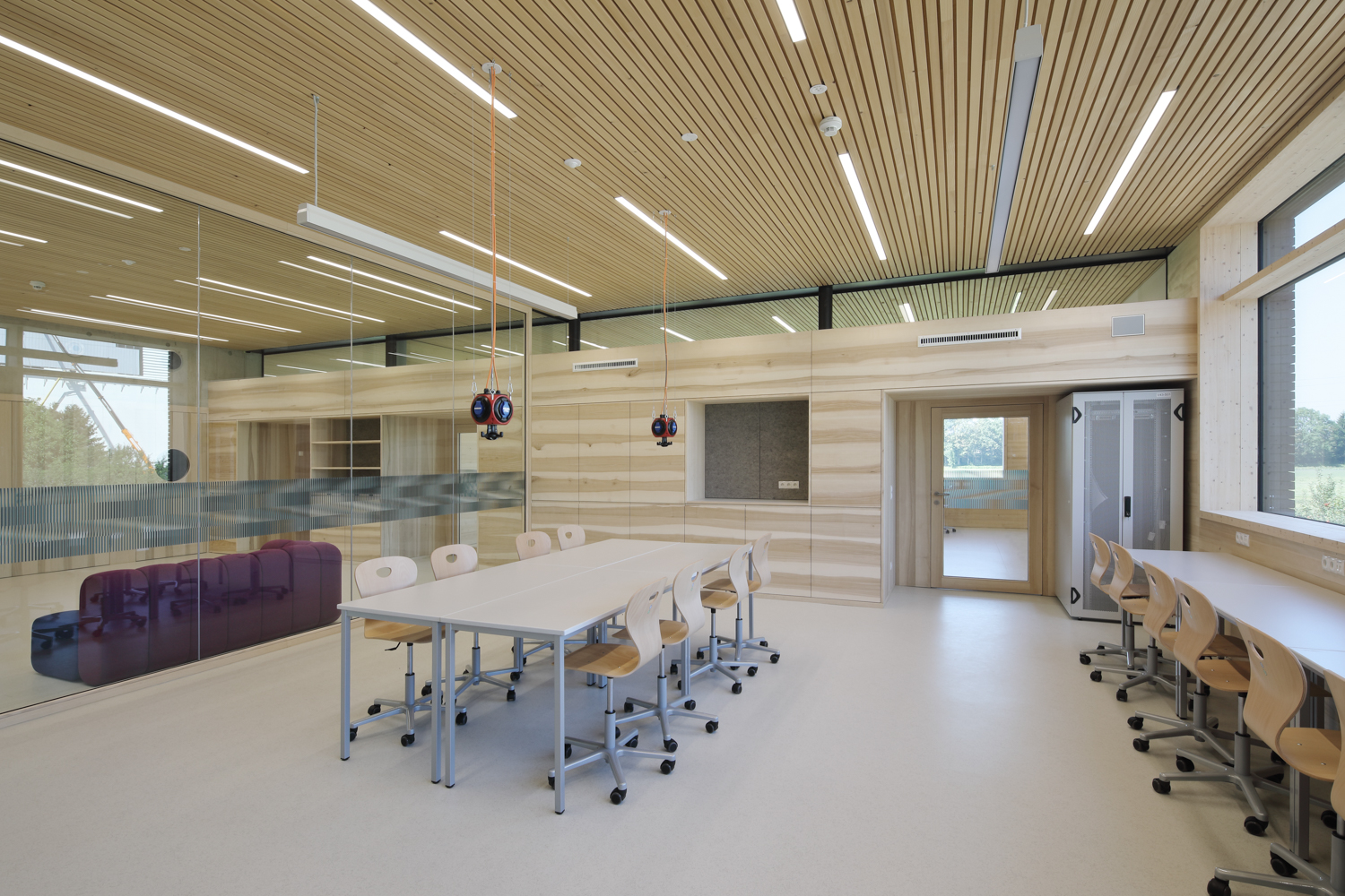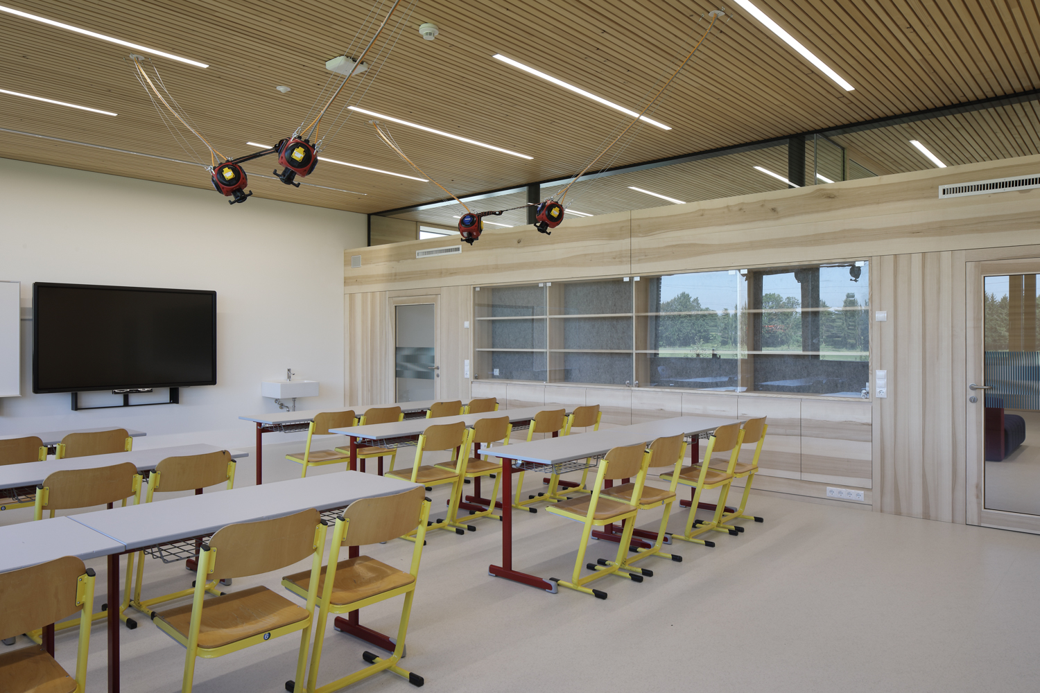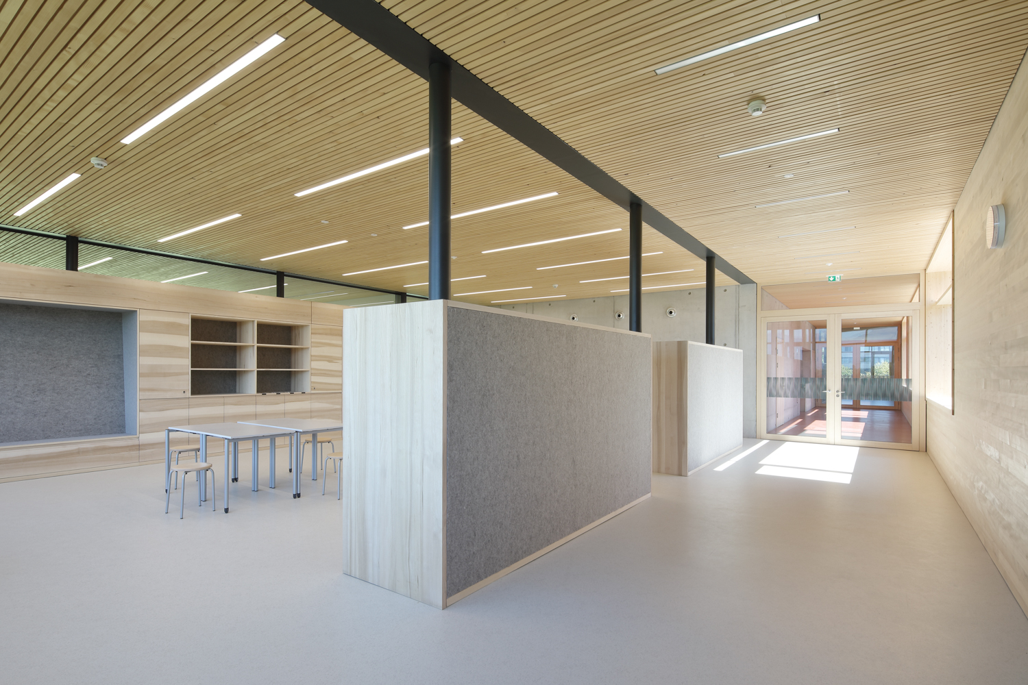 Während im massiv ausgeführten Sockelgeschoss vorwiegend Technik- und Werkräume untergebracht sind, wurden die beiden darüber liegenden Stockwerke als offene und flexible Lernlandschaften mit naturbelassenen Holzoberflächen und hellen Bodenbelägen gestaltet. Um die Trennung der Klassenzimmer von den angrenzenden Gemeinschaftsflächen nur durch räumlich formulierte Möbeleinbauten realisieren zu können, übernehmen deckengleiche Träger und Stahlstützen die statischen Lasten der tragenden Mittelachsen. Dieser Gebäudeteil ist wie der Zubau der letzten Erweiterungsphase in Brettstapelbauweise mit akustisch wirksamen Massivholzdecken gefügt, wobei die Decke über dem Erdgeschoss als Holz-Beton-Verbund gefertigt ist, um Schwingungen zu reduzieren. Auch die bewährte Fassadengestaltung aus dunkelrot gestrichenen sägerauen Holzlatten wurde wieder übernommen und durch neue Elemente sinnvoll ergänzt, um eine gestalterische und konstruktive Konsistenz für das gesamte Schulhaus zu etablieren