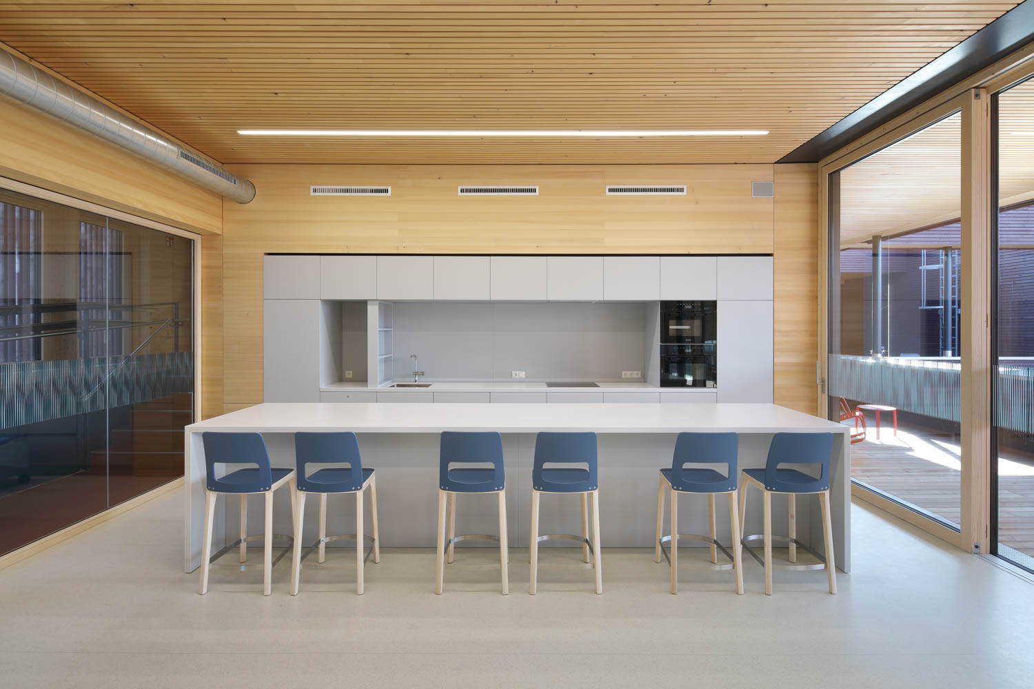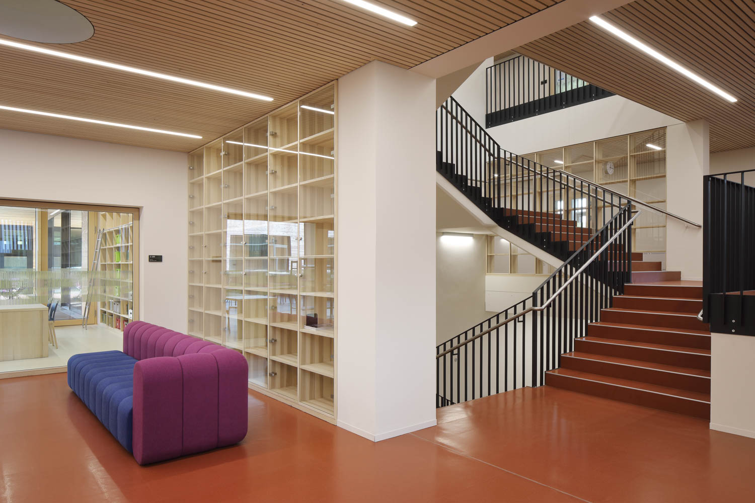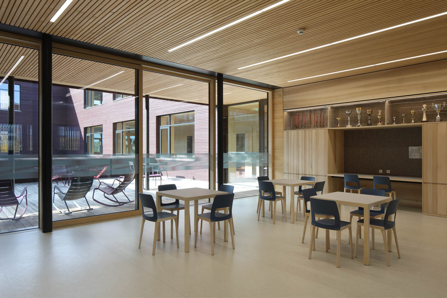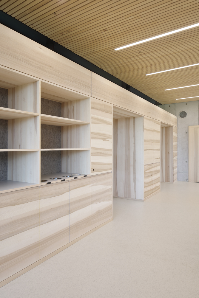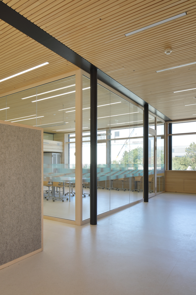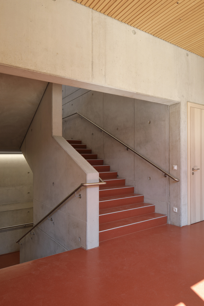 Während im massiv ausgeführten Sockelgeschoss vorwiegend Technik- und Werkräume untergebracht sind, wurden die beiden darüber liegenden Stockwerke als offene und flexible Lernlandschaften mit naturbelassenen Holzoberflächen und hellen Bodenbelägen gestaltet. Um die Trennung der Klassenzimmer von den angrenzenden Gemeinschaftsflächen nur durch räumlich formulierte Möbeleinbauten realisieren zu können, übernehmen deckengleiche Träger und Stahlstützen die statischen Lasten der tragenden Mittelachsen. Dieser Gebäudeteil ist wie der Zubau der letzten Erweiterungsphase in Brettstapelbauweise mit akustisch wirksamen Massivholzdecken gefügt, wobei die Decke über dem Erdgeschoss als Holz-Beton-Verbund gefertigt ist, um Schwingungen zu reduzieren. Auch die bewährte Fassadengestaltung aus dunkelrot gestrichenen sägerauen Holzlatten wurde wieder übernommen und durch neue Elemente sinnvoll ergänzt, um eine gestalterische und konstruktive Konsistenz für das gesamte Schulhaus zu etablieren