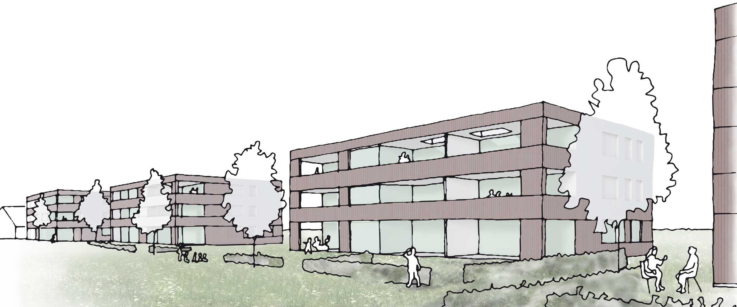 Die Ausrichtung zur Bahnhofstrasse bestimmt die Massenverteilung: Zur Straße hin stehen die beiden größeren Volumen, die den Siedlungsrand stärken. Sie markieren zusammen mit den westlich der Bahnhofstraße gelegenen Häusern den Eingang zum Quartier. Die Körnung nimmt die Siedlung in einer angepassten Kubatur auf. Gegen Osten werden die Gebäude kleiner und passen sich den benachbarten Wohnbauten an.