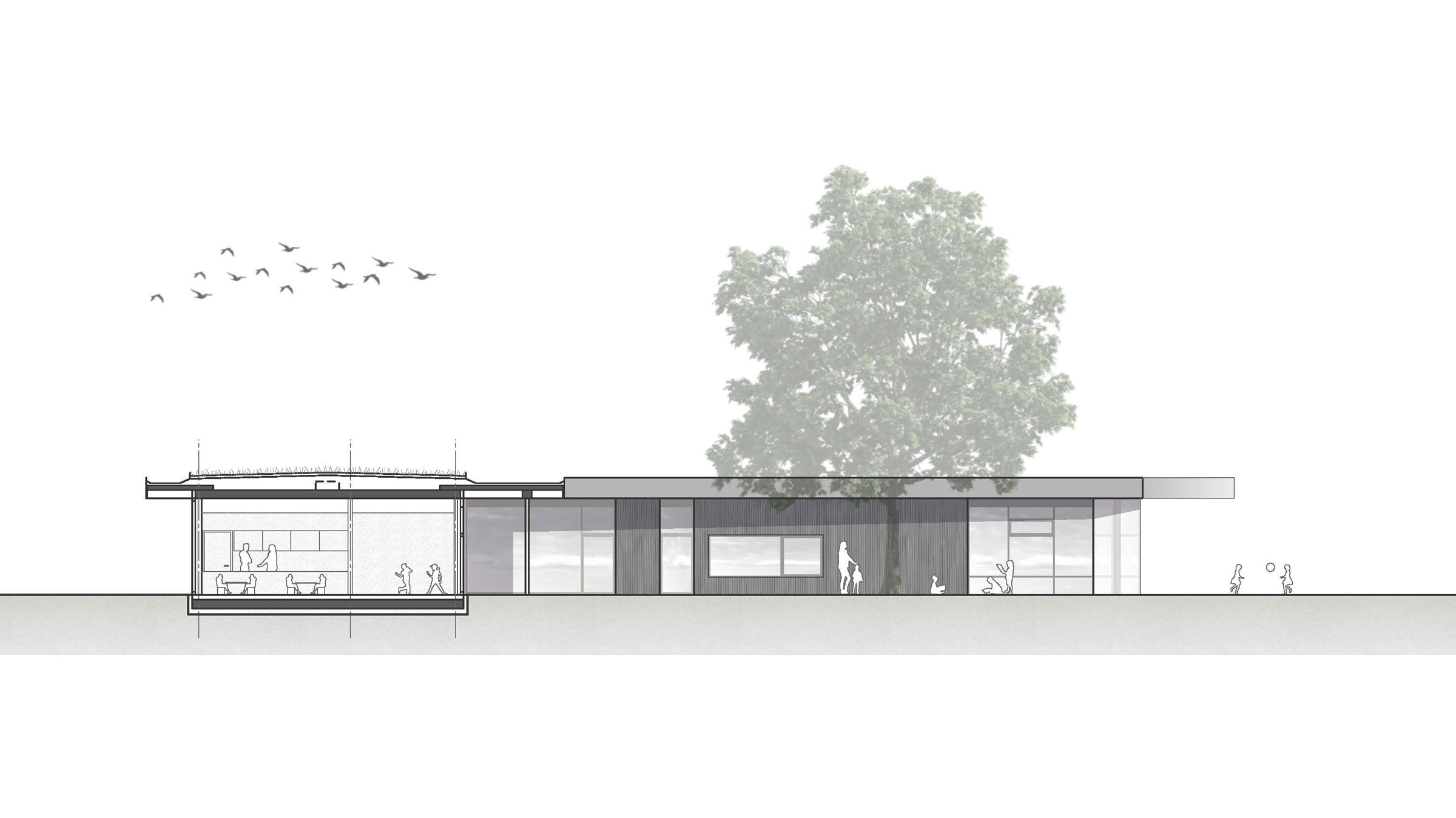 Die bedachte Setzung der Erweiterung ermöglicht es, die Nordwestfassade zu einer ansprechenden Erschließungsspange umzugestalten. Die Vordachzone wird durch einfache Maßnahmen zu einem einladenden Laubengang ergänzt, dessen Abschluss eine Veranda mit Sitzmöglichkeiten bildet. Die Bündelung der Erschließungswege als Rückgrat der Baustruktur schafft die Voraussetzung, um den Außenraum im Südosten als ungestörte Spielwiese zu nutzen. Dieser wird durch die gemeinsame Mitte mit sonnendurchfluteter Terrasse und schattenspendendem Hofbaum aufgewertet, um allen Kindern optimale Entfaltungsmöglichkeiten zu bieten.
