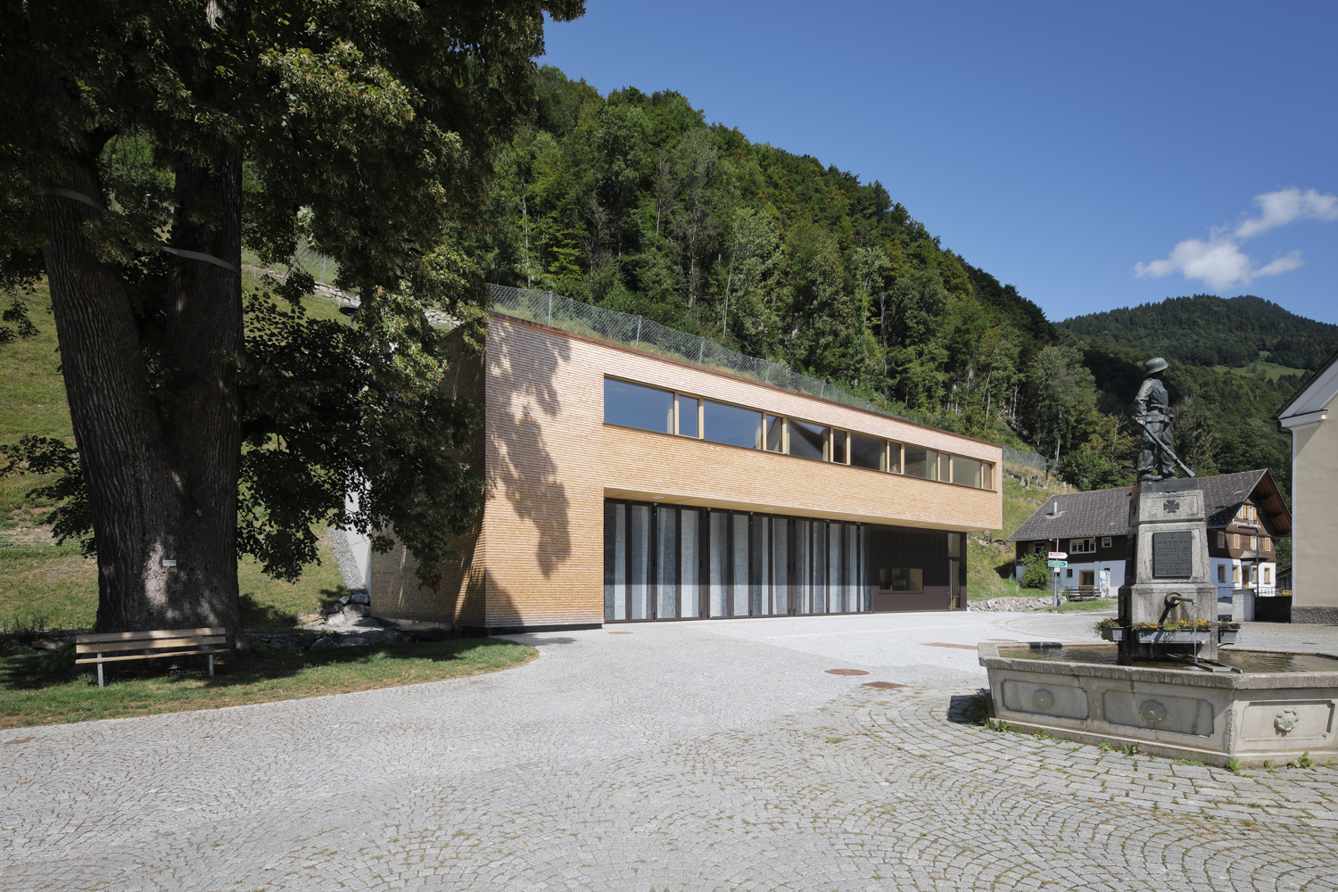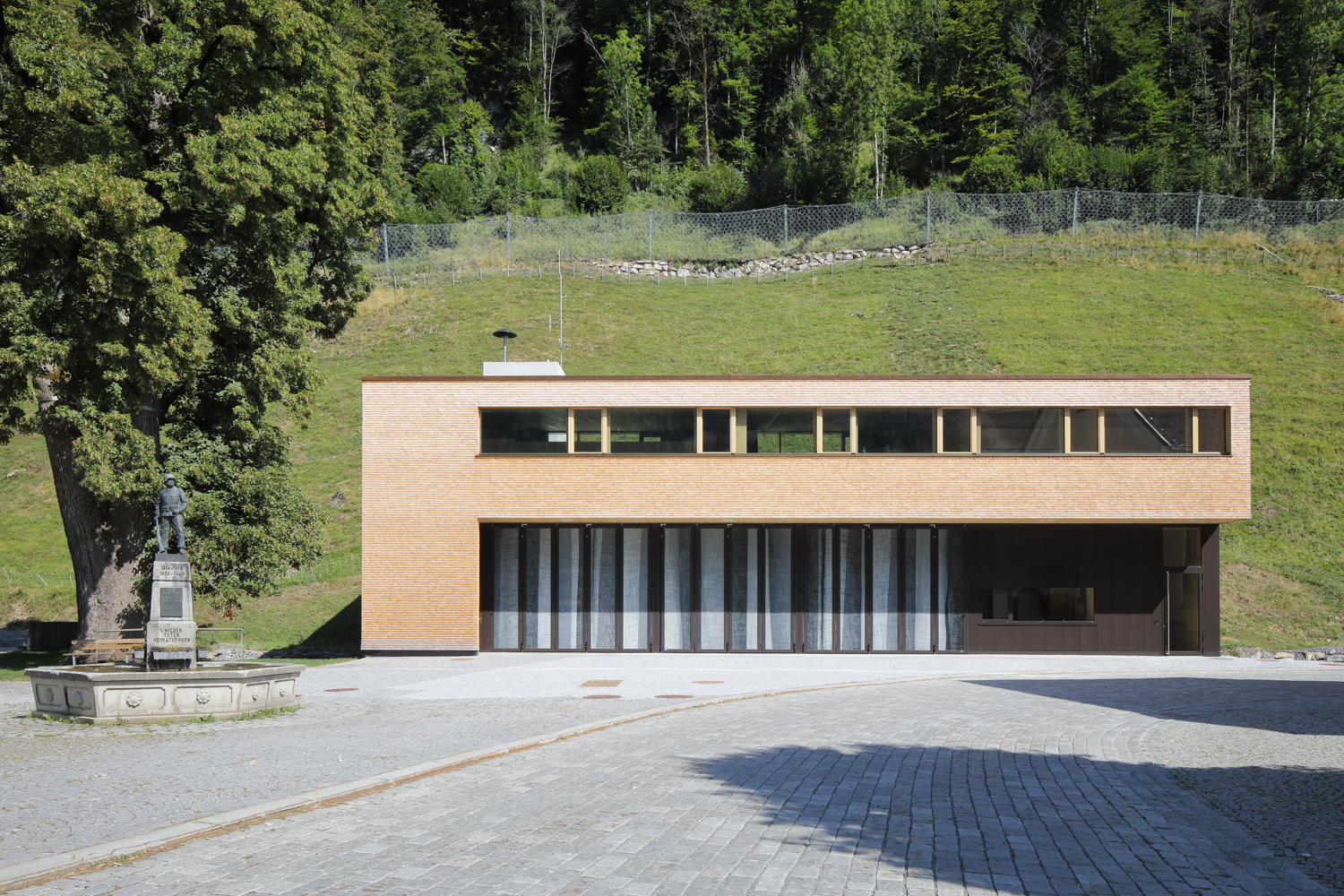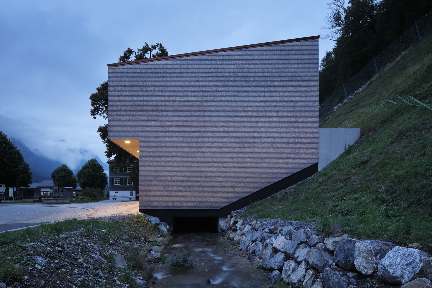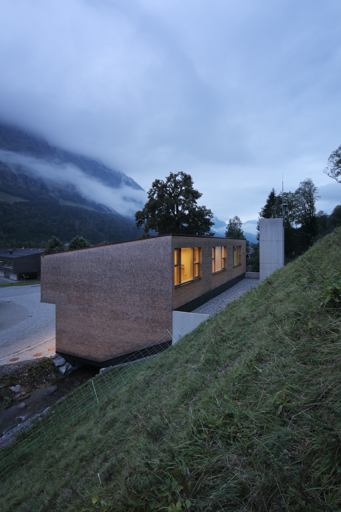 Im Dorfkern der Gemeinde Schnepfau wird ein Feuerwehrhaus anstelle des Altbestandes errichtet, zeitgemäss in seiner Form und Funktion und doch eingebunden in die Baukultur der Region. Das Gebäude bildet mit dem Gemeindehaus und der Pfarrkirche ein kompaktes Ensemble, das den öffentlichen Platz samt seinem mächtigen Kastanienbaum und dem Brunnen fasst. Der Dorfbach wird unter dem Bauwerk durchgeleitet, dahinter erhebt sich die Parzelle gegen Norden zu einer steilen Böschung.