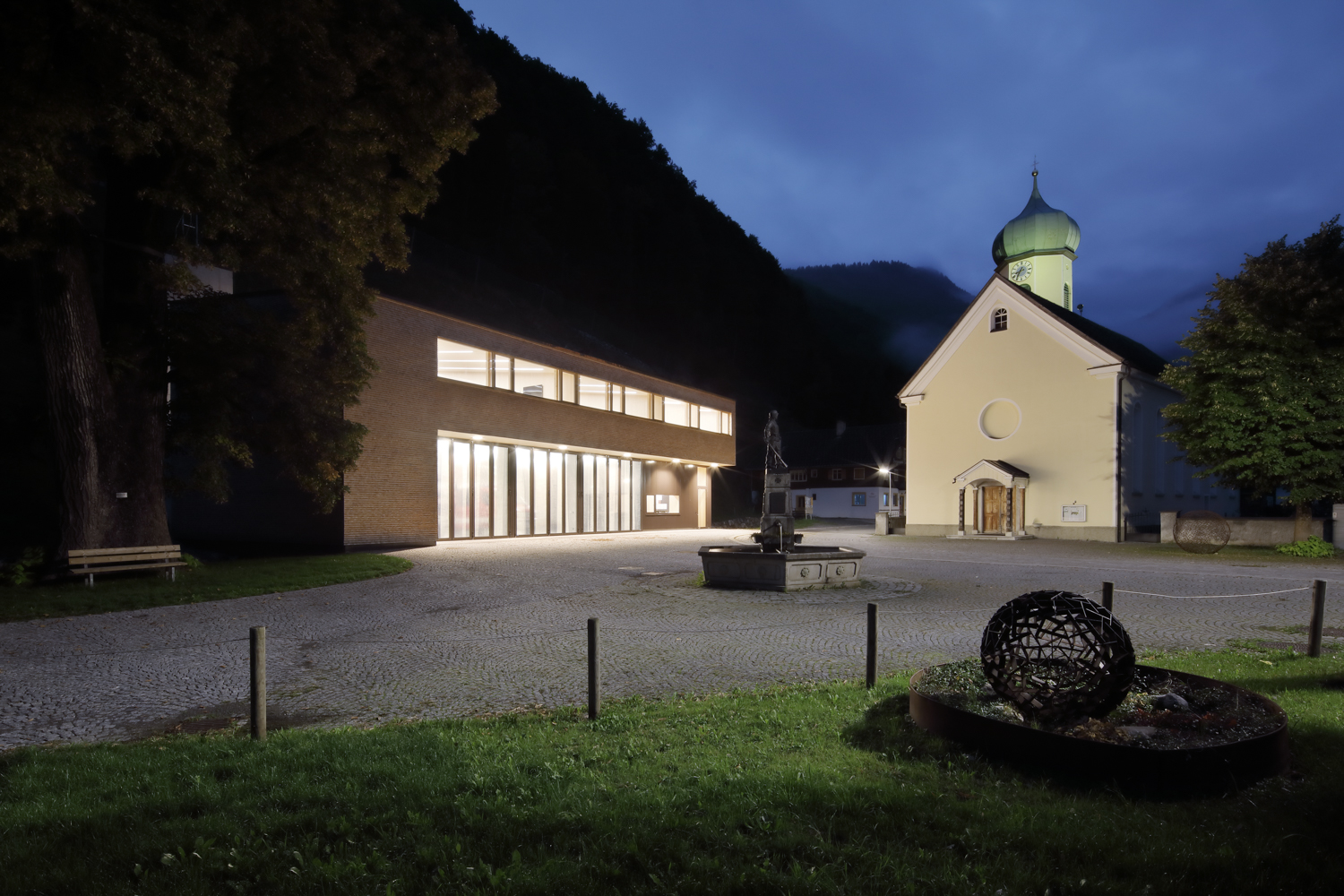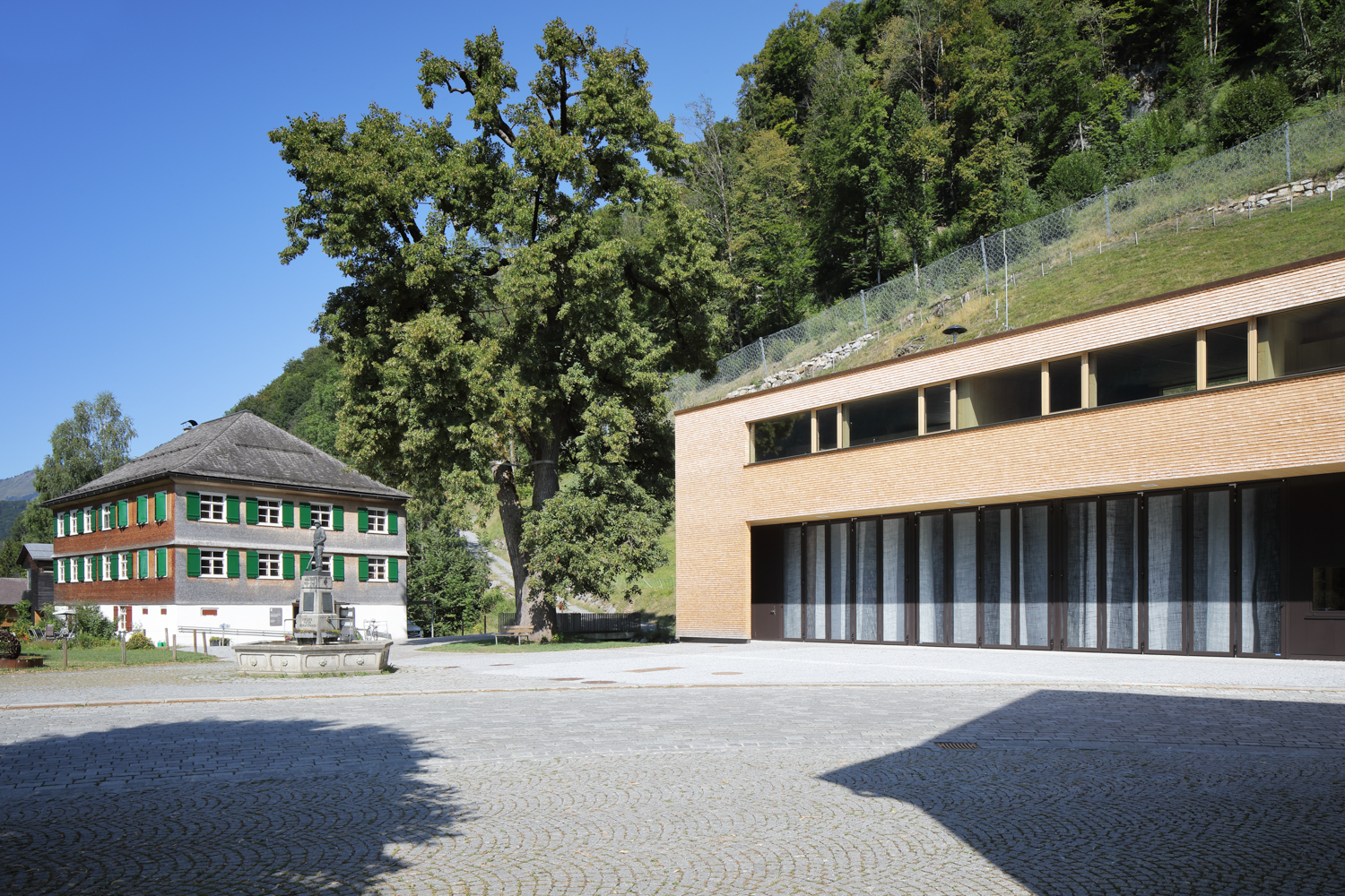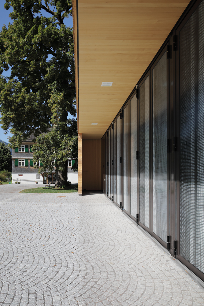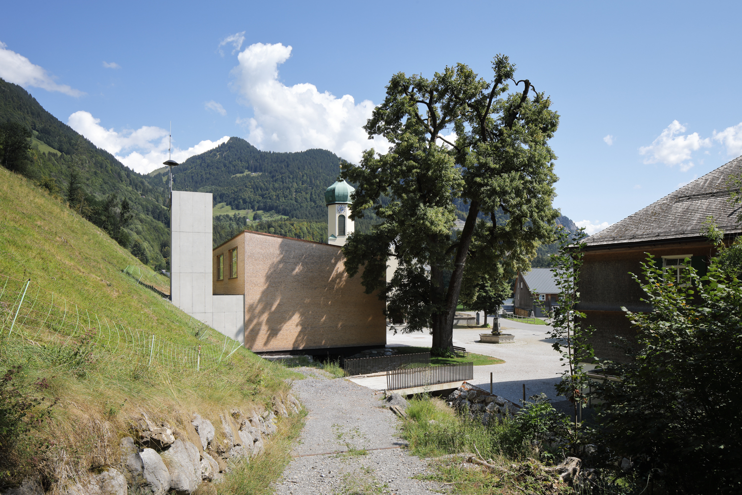 Im Dorfkern der Gemeinde Schnepfau wird ein Feuerwehrhaus anstelle des Altbestandes errichtet, zeitgemäss in seiner Form und Funktion und doch eingebunden in die Baukultur der Region. Das Gebäude bildet mit dem Gemeindehaus und der Pfarrkirche ein kompaktes Ensemble, das den öffentlichen Platz samt seinem mächtigen Kastanienbaum und dem Brunnen fasst. Der Dorfbach wird unter dem Bauwerk durchgeleitet, dahinter erhebt sich die Parzelle gegen Norden zu einer steilen Böschung.