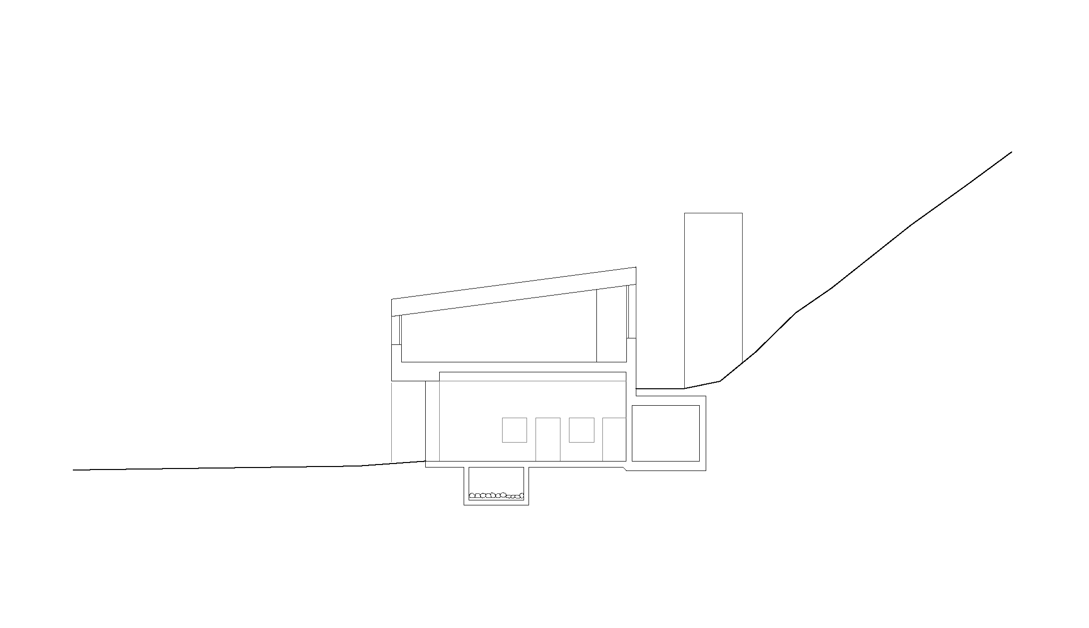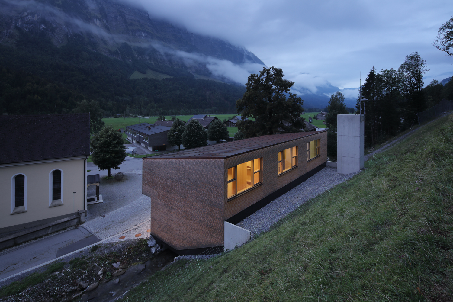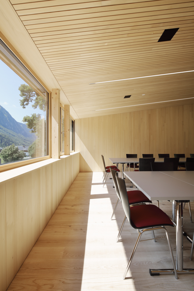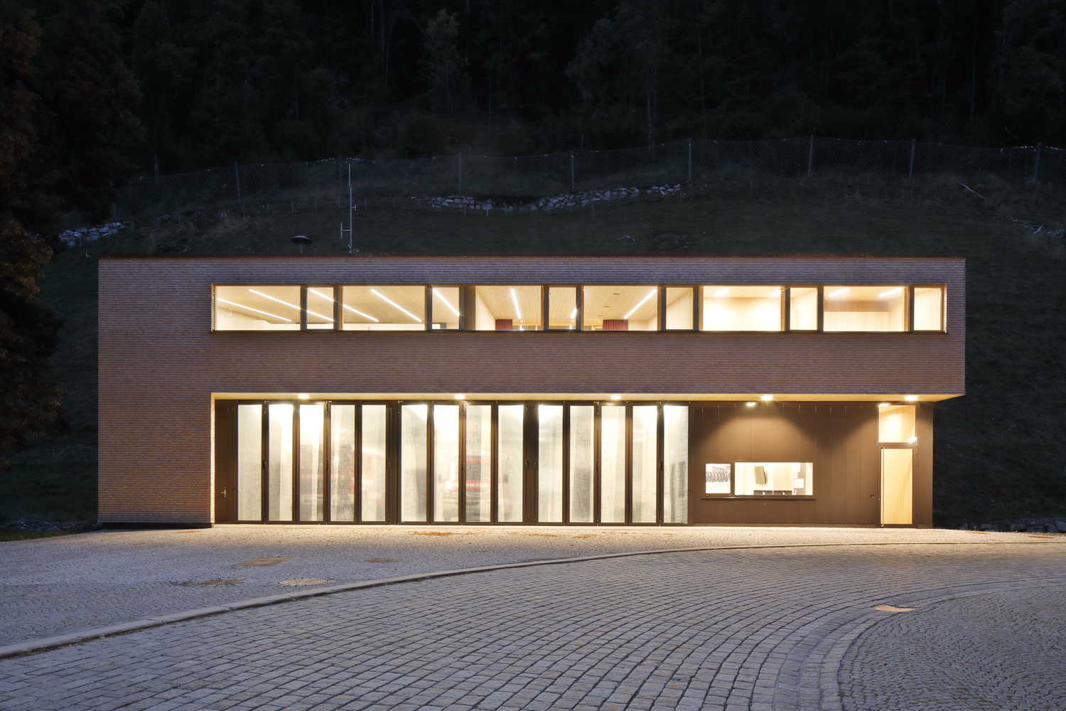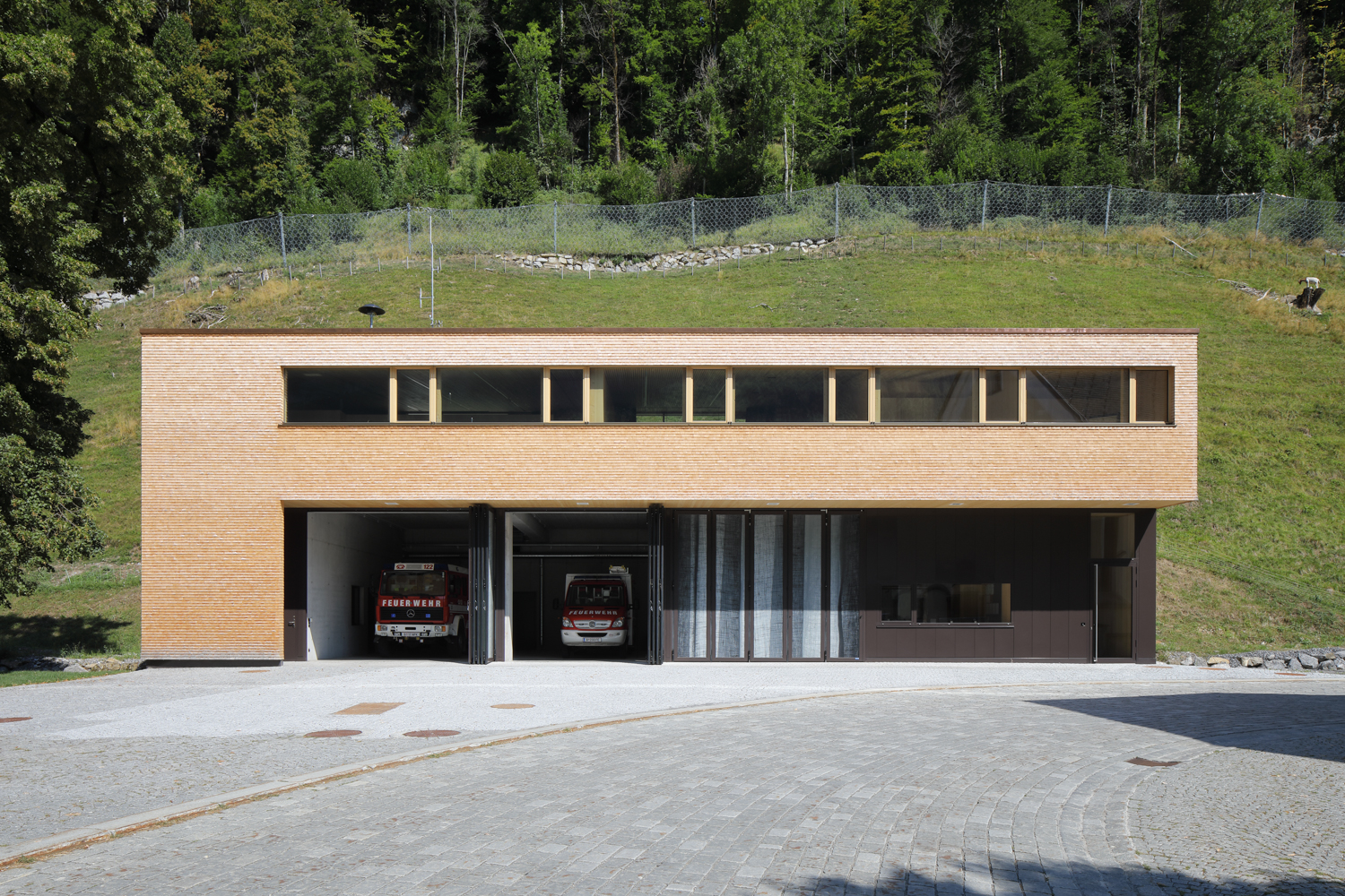Das Herzstück der Anlage bildet die freitragend überspannte Fahrzeughalle, welche sich durch drei verglaste Stahl-Falttore zum Platz hin orientiert. An den Seiten und gegen den Hang wird sie von kleineren Infrastrukturkammern gerahmt, in denen die Bereiche für Wartung und Bestandhaltung sowie Einsatzräume, Technik und Lager organisiert und einander zugeordnet sind. Die einbündige Treppe ist an der Ostseite des Baukörpers angelegt und führt in ein lichtes Obergeschoss, das sich durch grosszügig bemessene Holzfenster nach Norden und Süden öffnet. Hier bietet sich Platz für das Probelokal des Musikvereins, einen Schulungssaal sowie Nebenräume.
