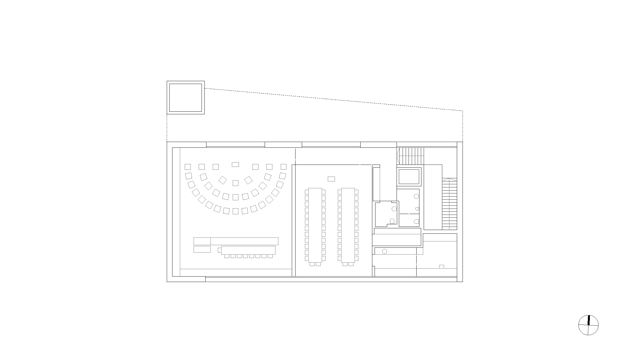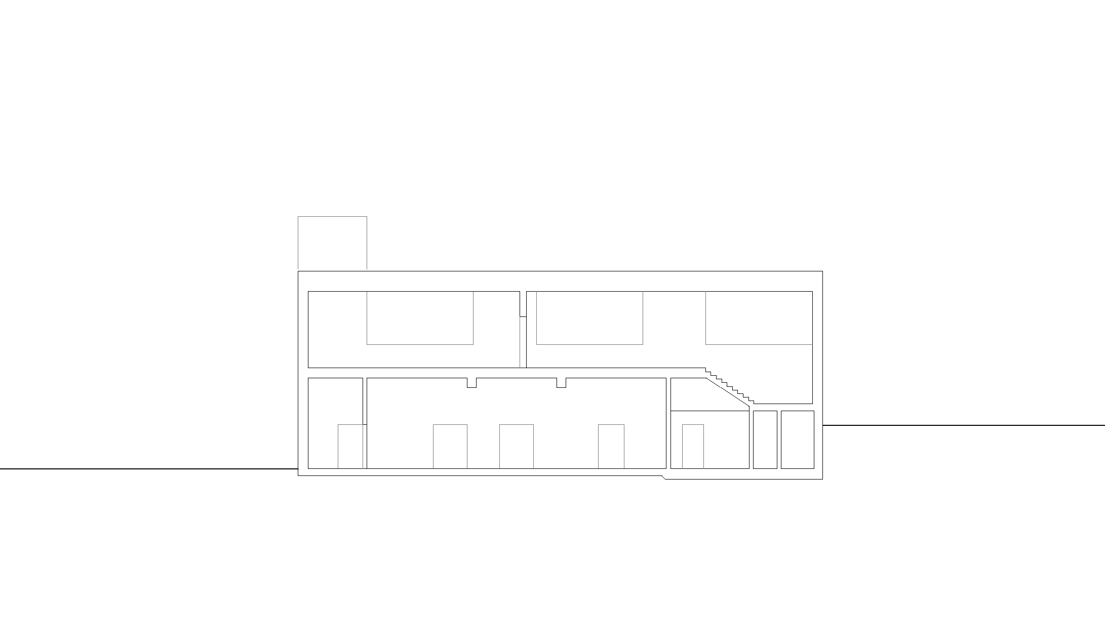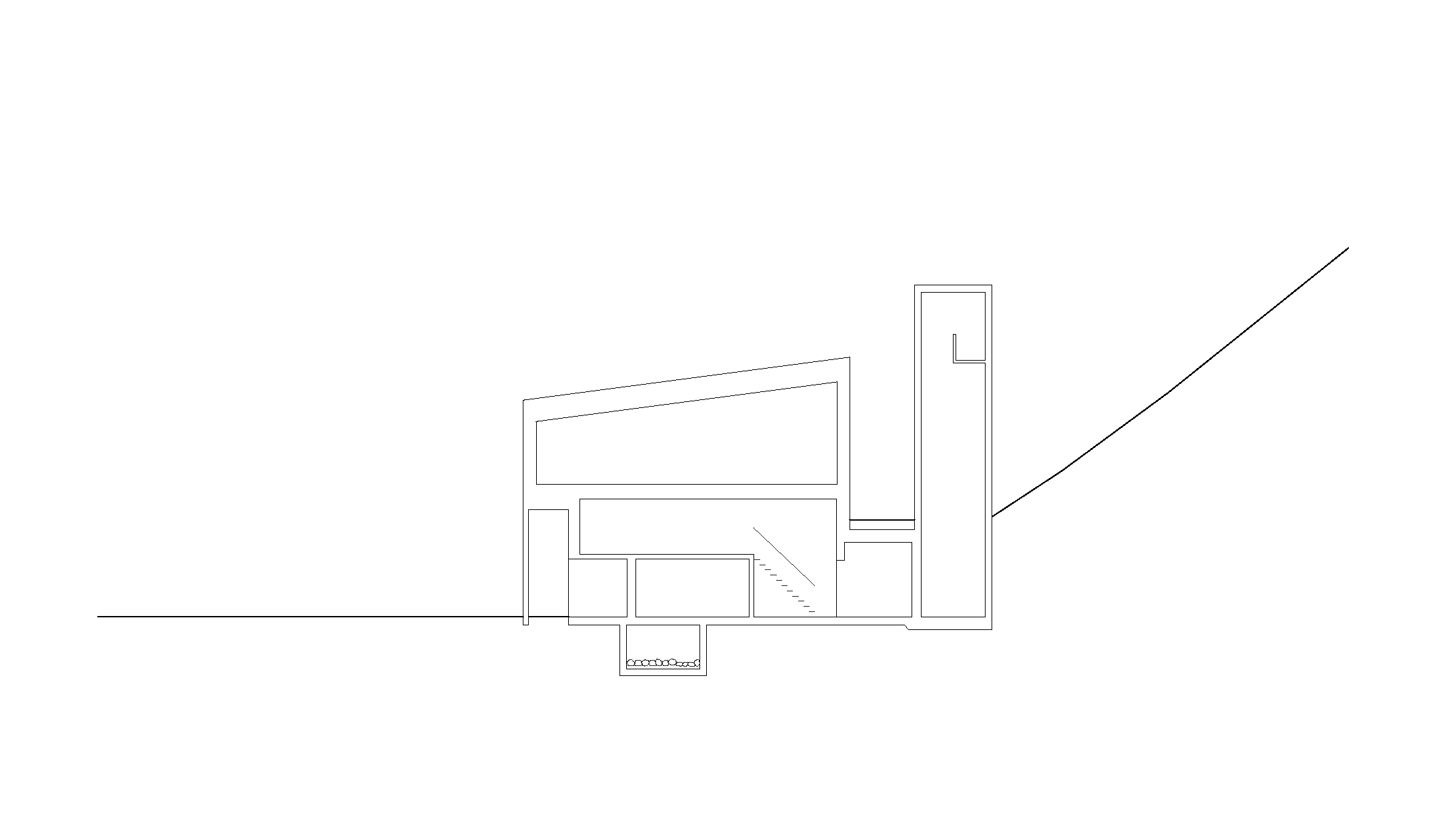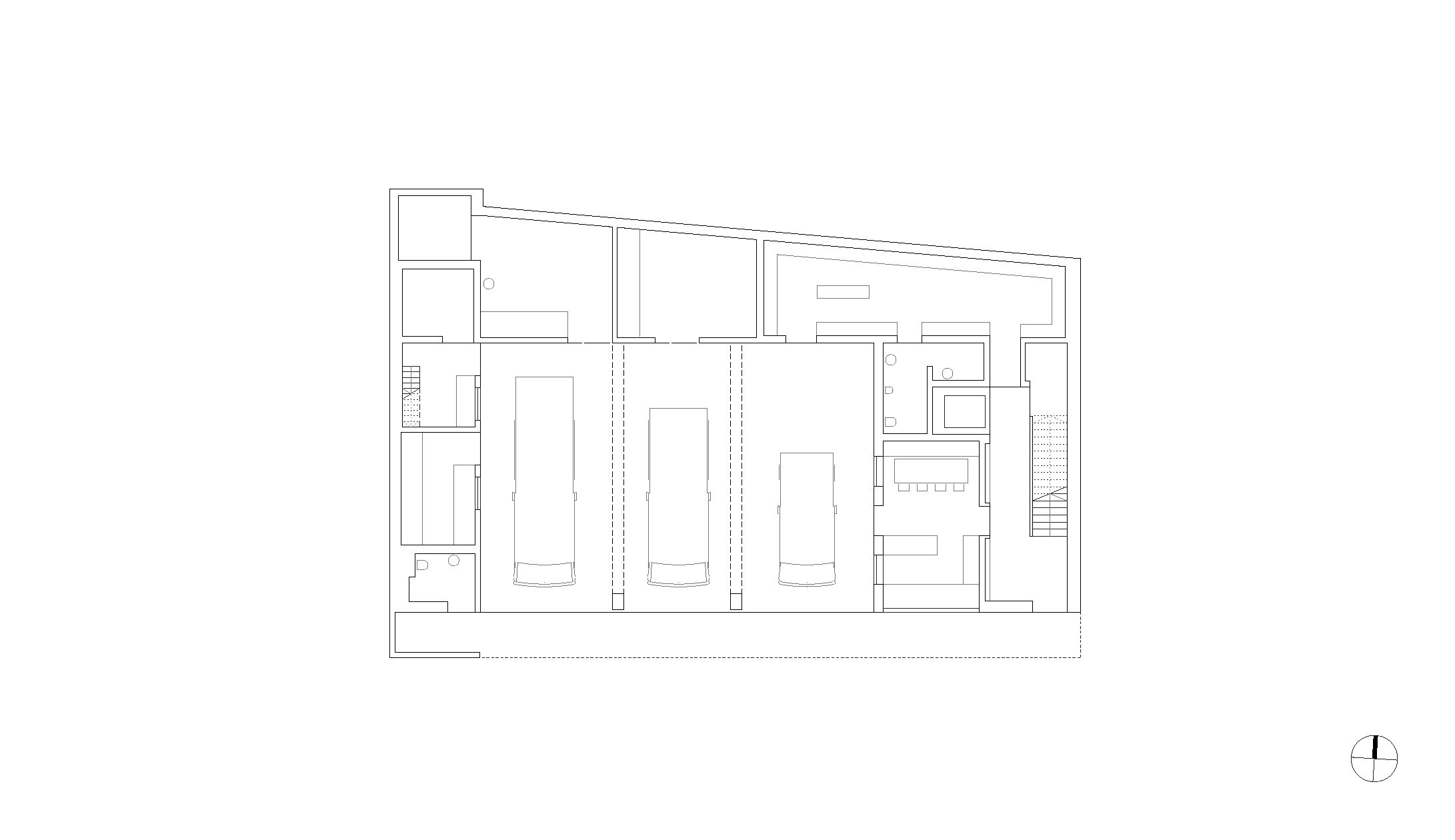 Das Herzstück der Anlage bildet die freitragend überspannte Fahrzeughalle, welche sich durch drei verglaste Stahl-Falttore zum Platz hin orientiert. An den Seiten und gegen den Hang wird sie von kleineren Infrastrukturkammern gerahmt, in denen die Bereiche für Wartung und Bestandhaltung sowie Einsatzräume, Technik und Lager organisiert und einander zugeordnet sind. Die einbündige Treppe ist an der Ostseite des Baukörpers angelegt und führt in ein lichtes Obergeschoss, das sich durch grosszügig bemessene Holzfenster nach Norden und Süden öffnet. Hier bietet sich Platz für das Probelokal des Musikvereins, einen Schulungssaal sowie Nebenräume.