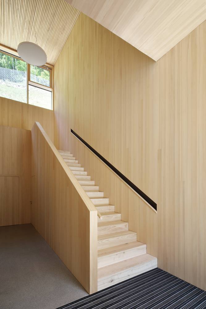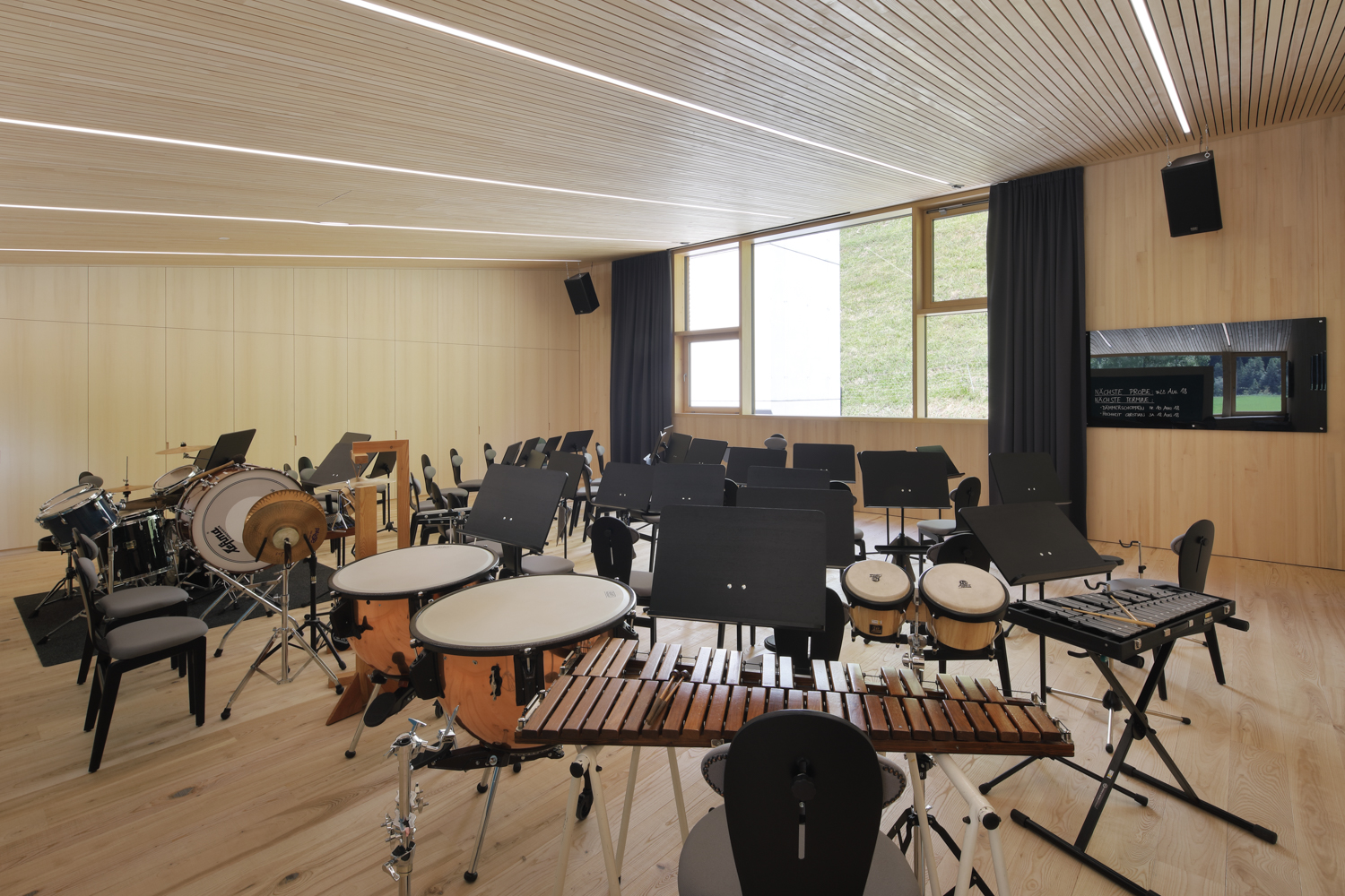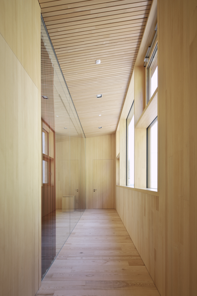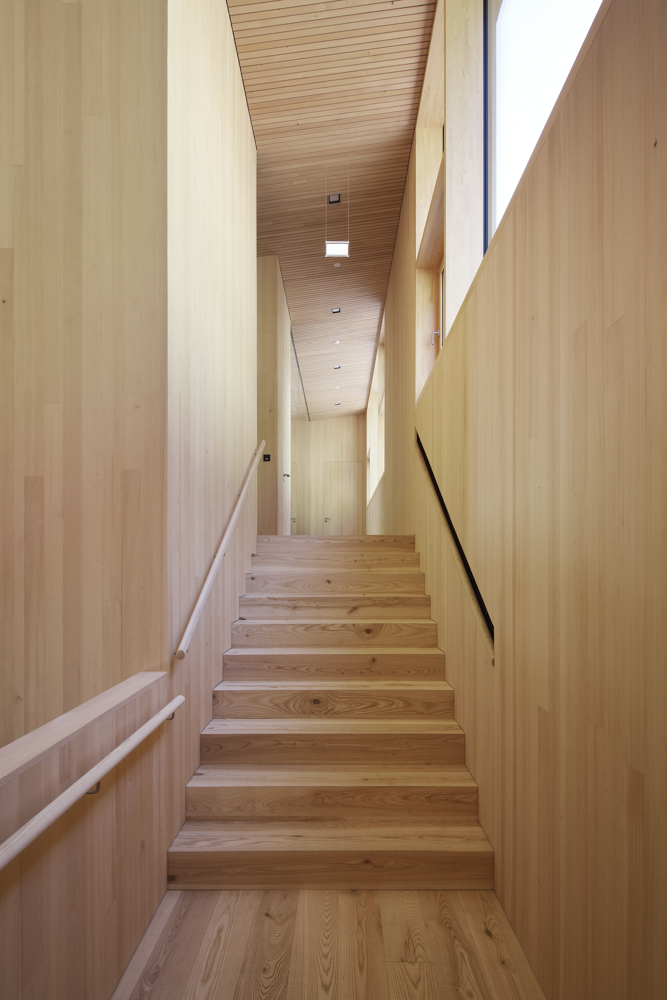 Die Atmosphäre der Arbeitsbereiche im Erdgeschoss wirkt durch die nüchternen Zementoberflächen kühl und roh, während der Besucher bereits im sorgfältig getäferten Treppenhaus ahnt, wie fein das darüber liegende Stockwerk gearbeitet ist. Ganz in gebürstete und unbehandelte Weisstanne gekleidet, erweist es sich als präzise gefügter Resonanzkörper für die Klänge der Musiker.