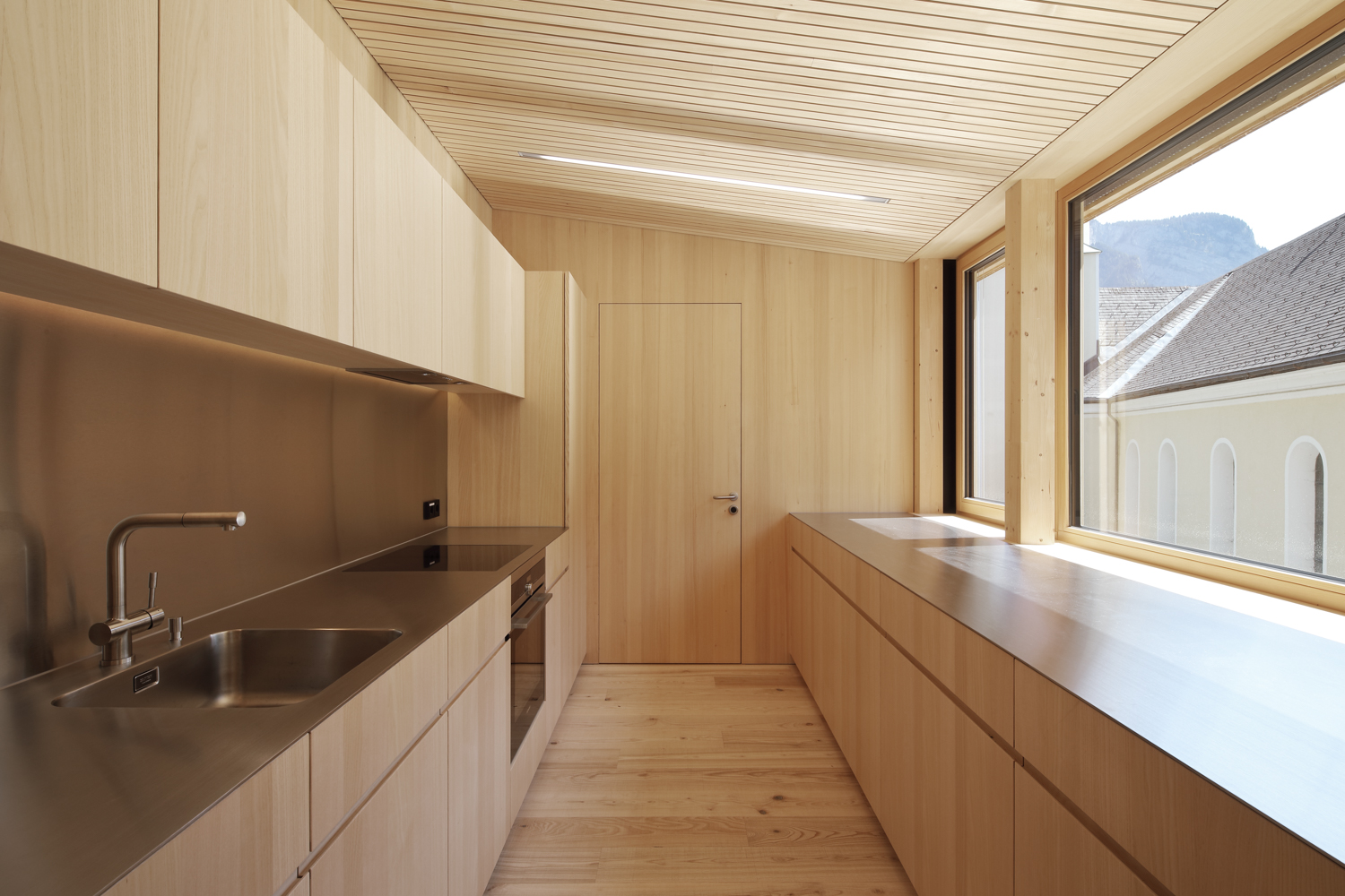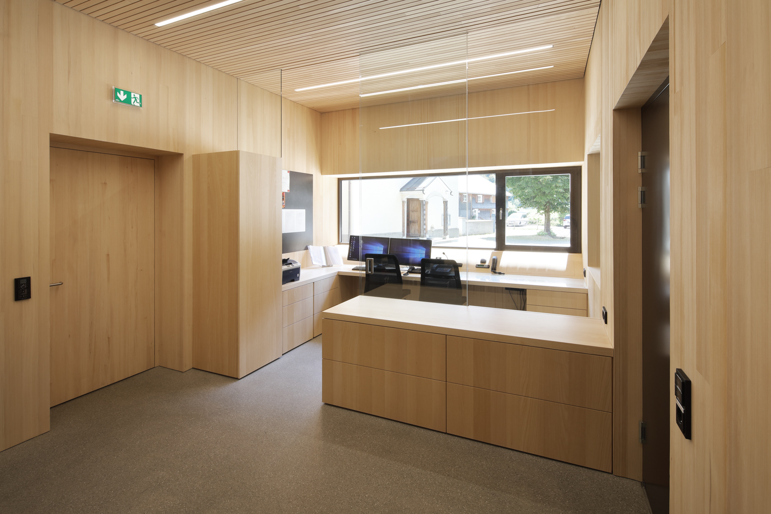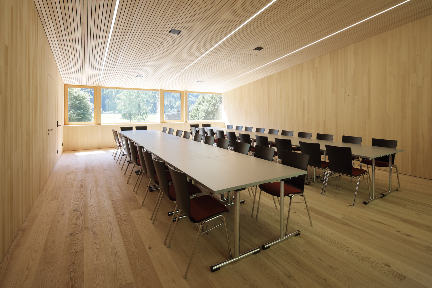 Die Atmosphäre der Arbeitsbereiche im Erdgeschoss wirkt durch die nüchternen Zementoberflächen kühl und roh, während der Besucher bereits im sorgfältig getäferten Treppenhaus ahnt, wie fein das darüber liegende Stockwerk gearbeitet ist. Ganz in gebürstete und unbehandelte Weisstanne gekleidet, erweist es sich als präzise gefügter Resonanzkörper für die Klänge der Musiker.