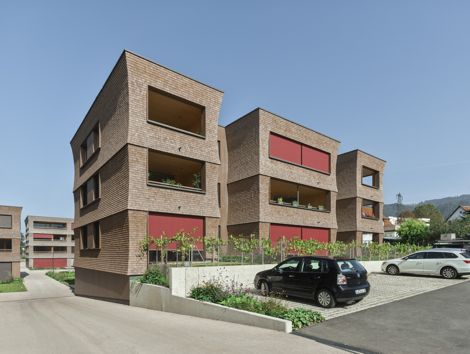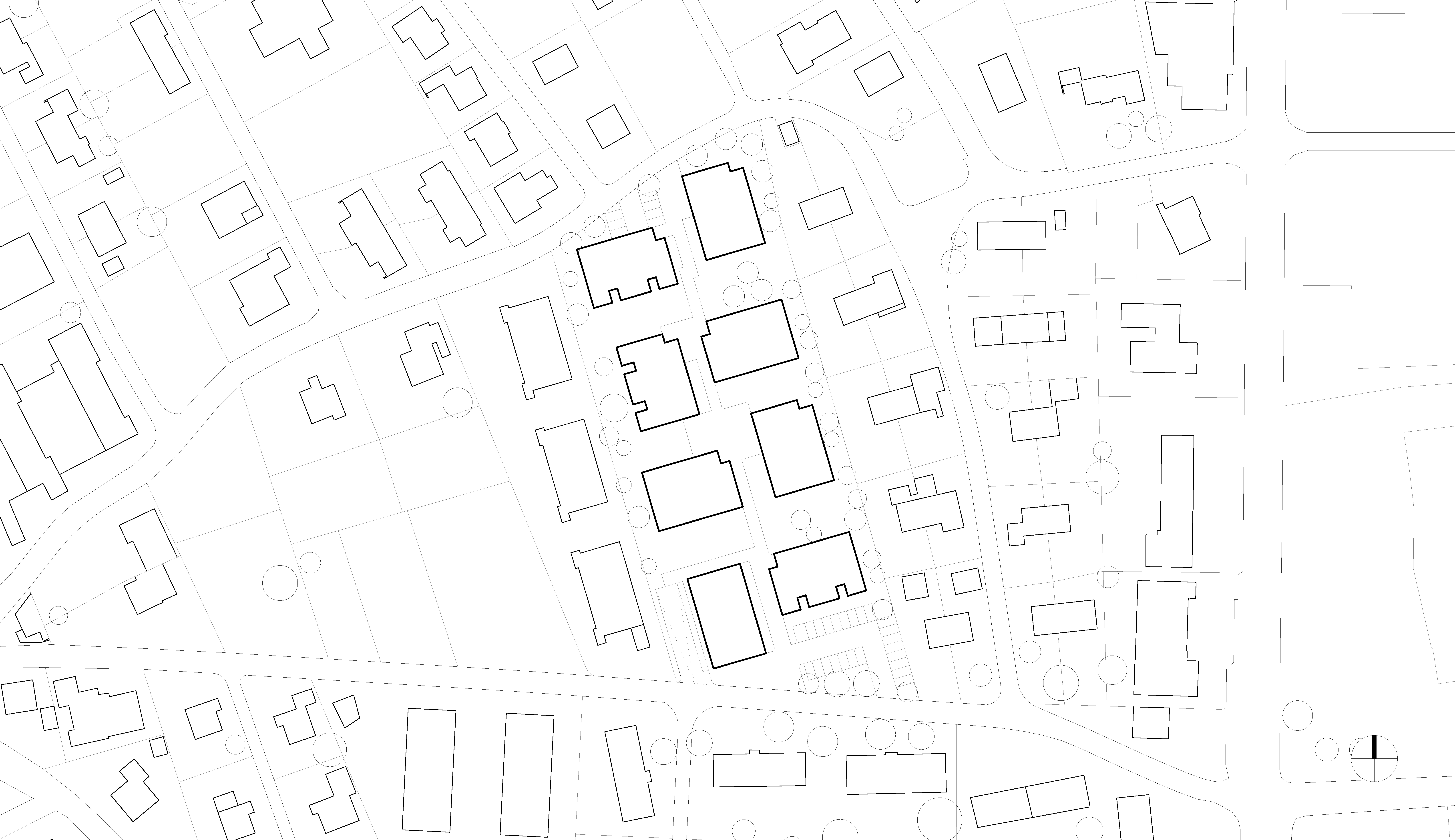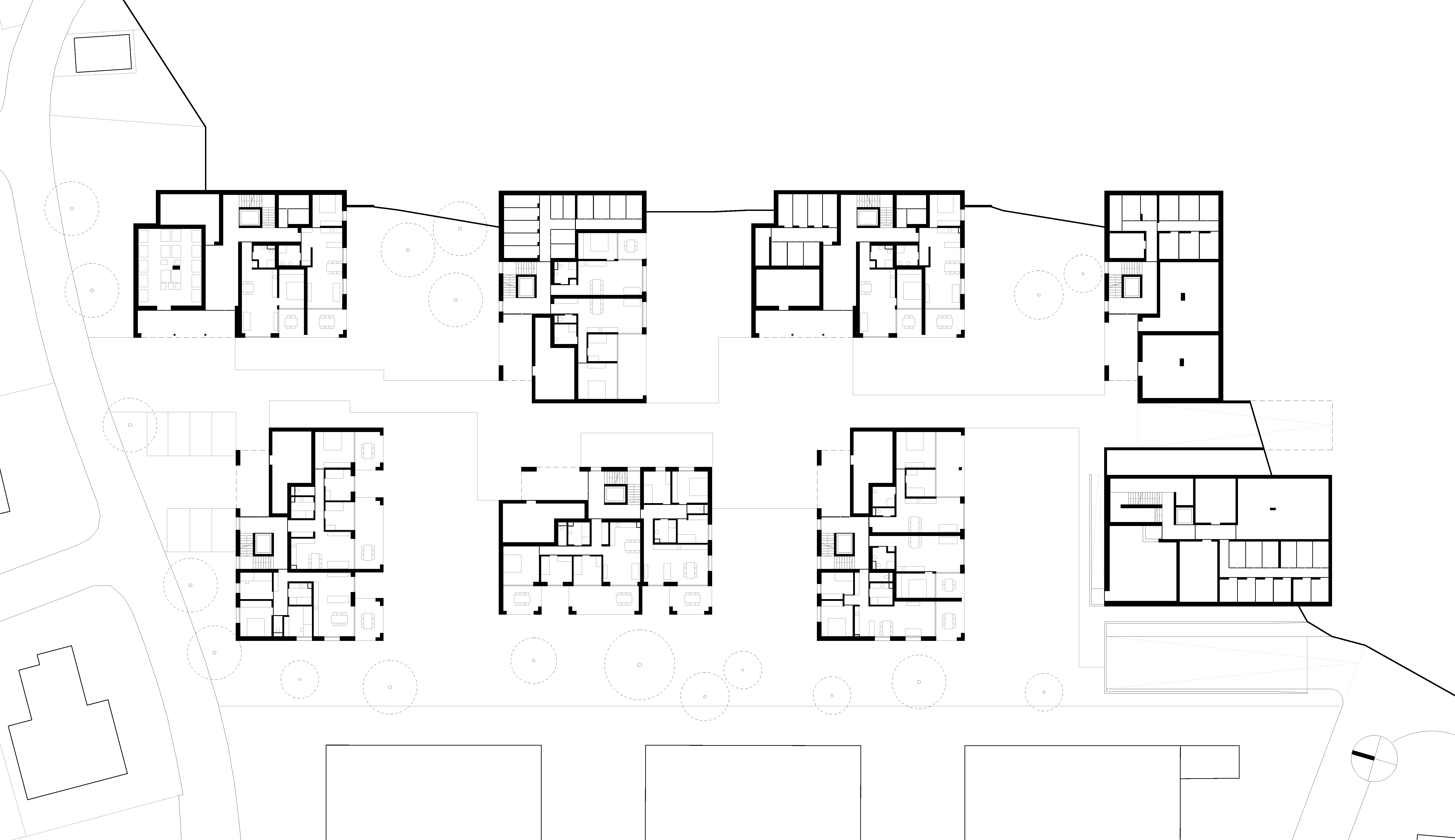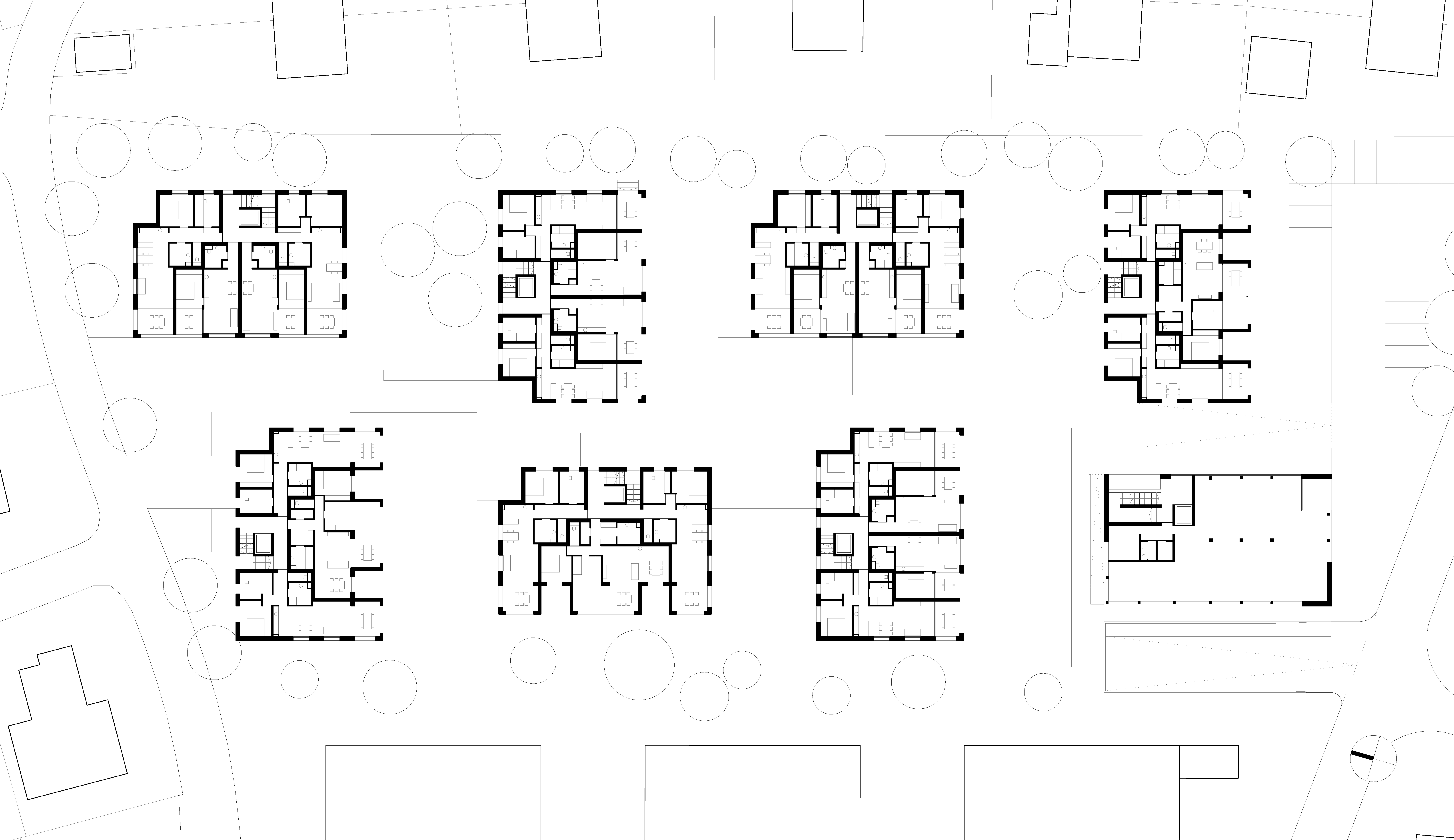 Der städtebauliche Ansatz definiert sich als Verzahnung der Volumen und Freiflächen mit der nachbarschaftlichen Siedlungsstruktur. Die Gebäude sind in großzügigen Abständen entlang der Nord-Süd-Achse des Baugrundes gesetzt und abwechselnd um 90 Grad gedreht. So werden differenzierte Außenbereiche und vielfältige Blickbeziehungen in den Grünraum geschaffen. Durch die Organisation als Vierspänner mit drei bis vier Obergeschossen entstehen optimal besonnte Grundrisse, die sich über Loggien, Terrassen oder Gärten zur abwechslungsreich bepflanzten Umgebung orientieren. Trotz der hohen Dichte bleibt daher der Charakter einer Kleinwohnanlage bewahrt.