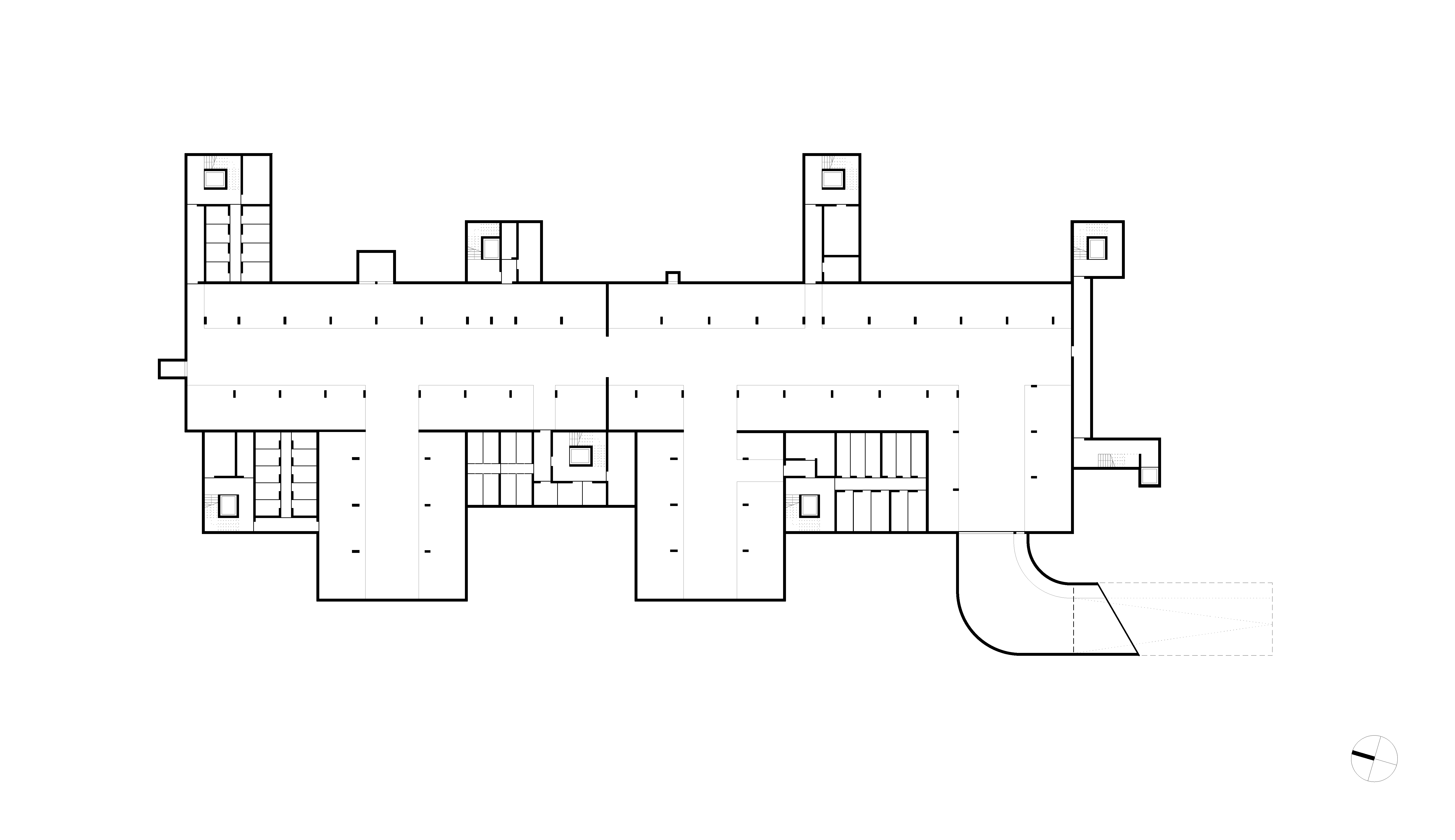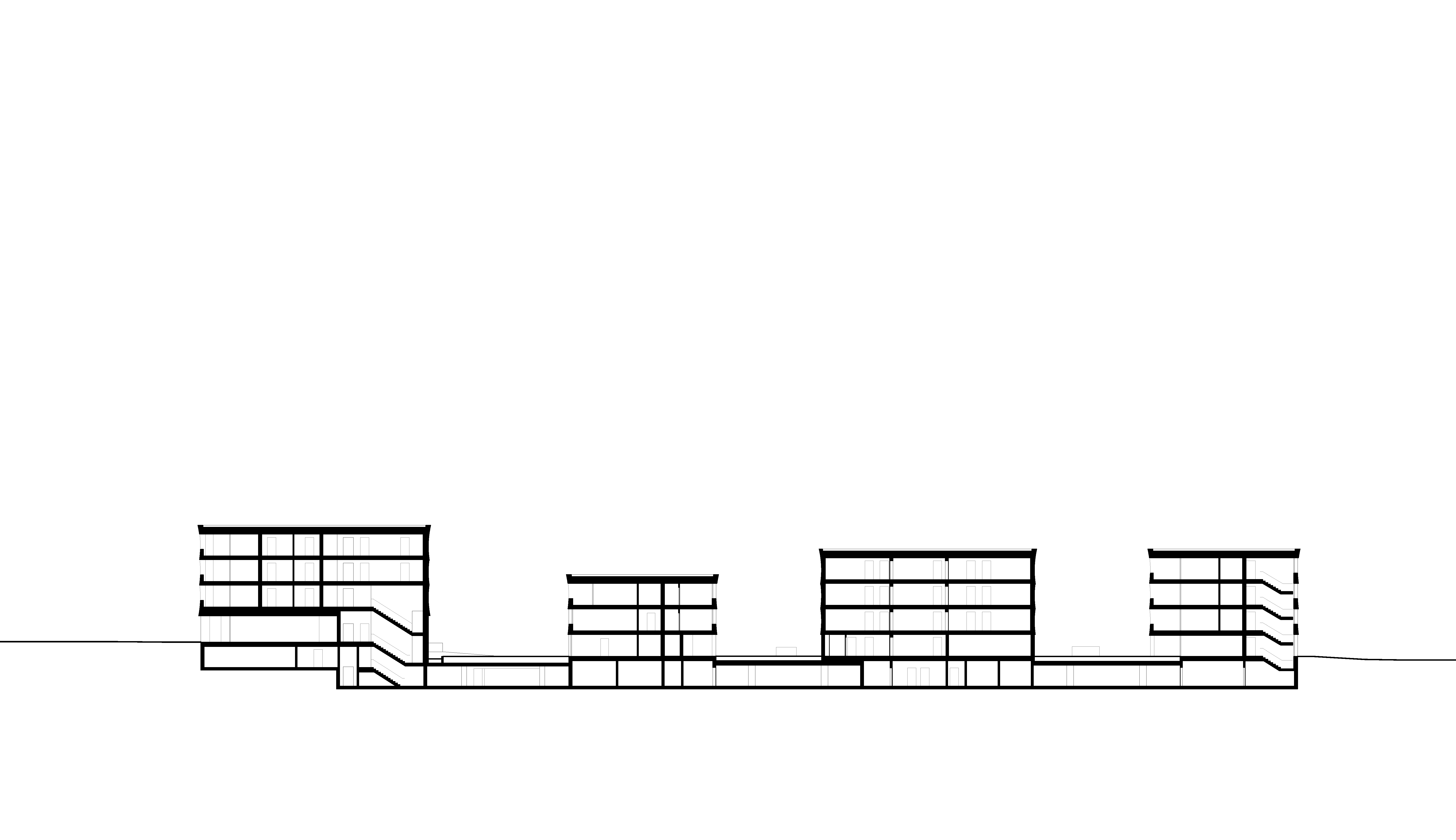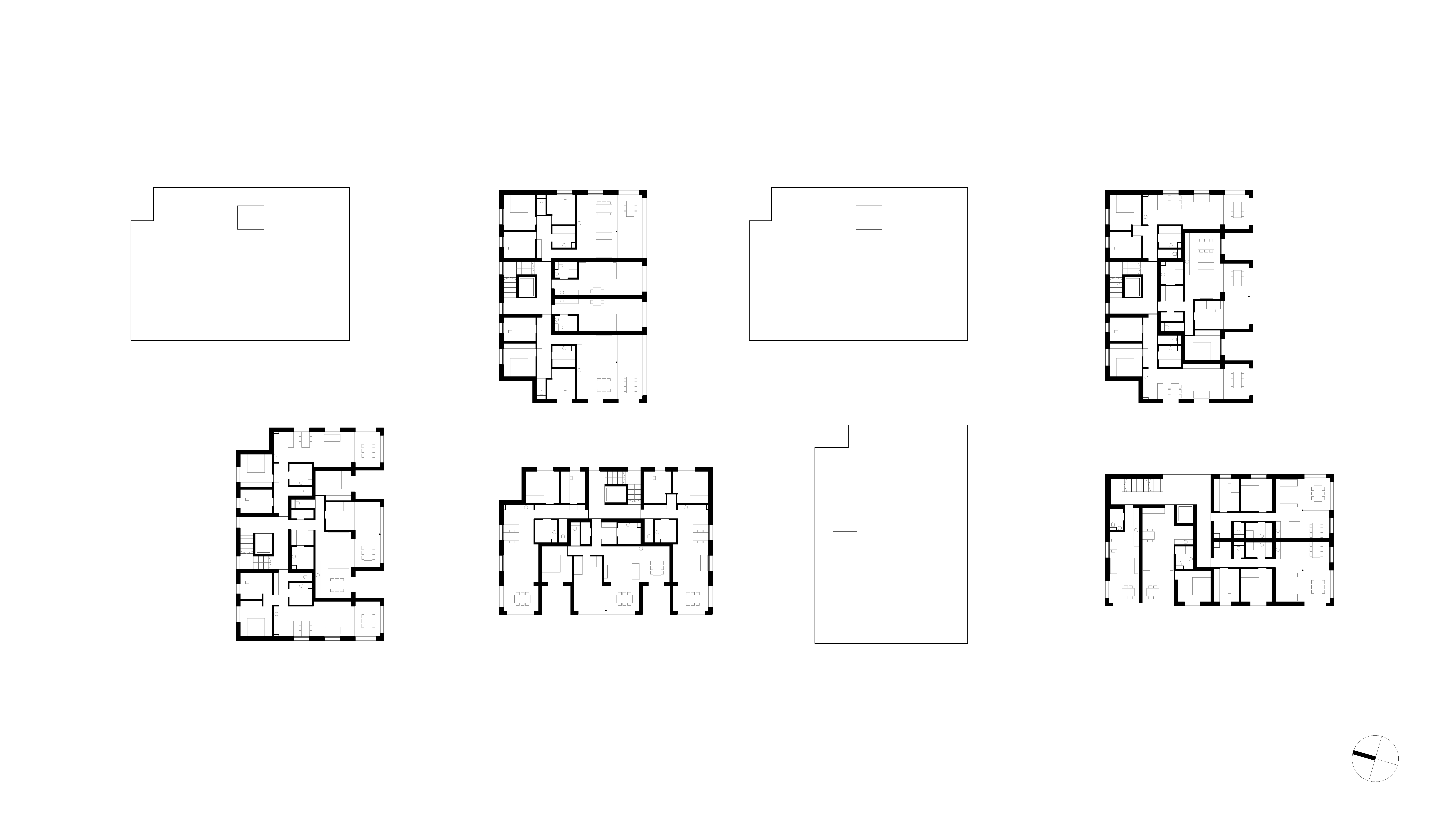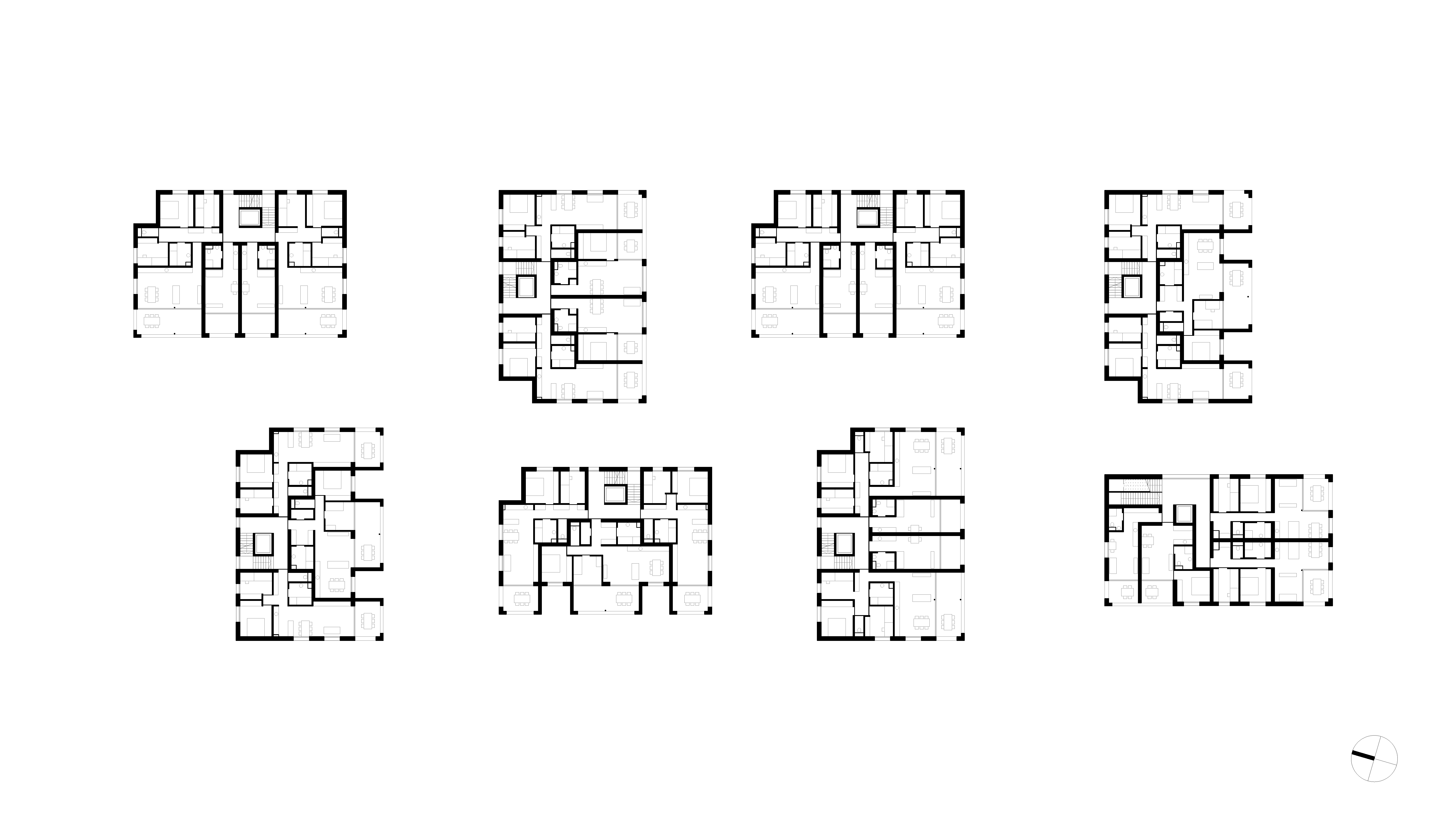 Der städtebauliche Ansatz definiert sich als Verzahnung der Volumen und Freiflächen mit der nachbarschaftlichen Siedlungsstruktur. Die Gebäude sind in großzügigen Abständen entlang der Nord-Süd-Achse des Baugrundes gesetzt und abwechselnd um 90 Grad gedreht. So werden differenzierte Außenbereiche und vielfältige Blickbeziehungen in den Grünraum geschaffen. Durch die Organisation als Vierspänner mit drei bis vier Obergeschossen entstehen optimal besonnte Grundrisse, die sich über Loggien, Terrassen oder Gärten zur abwechslungsreich bepflanzten Umgebung orientieren. Trotz der hohen Dichte bleibt daher der Charakter einer Kleinwohnanlage bewahrt.
