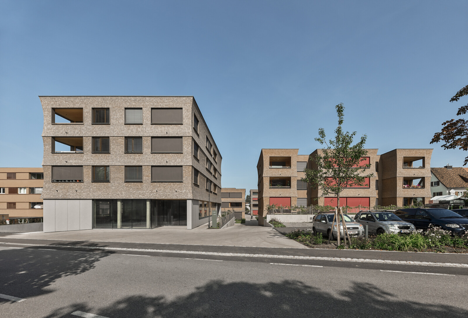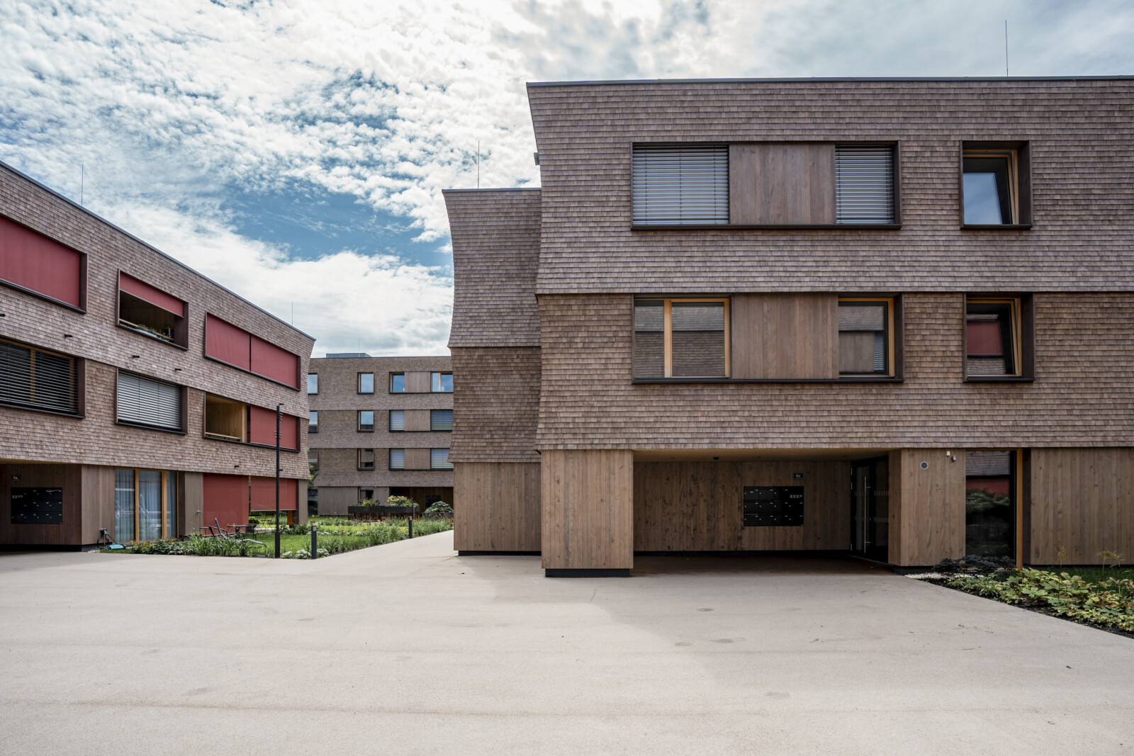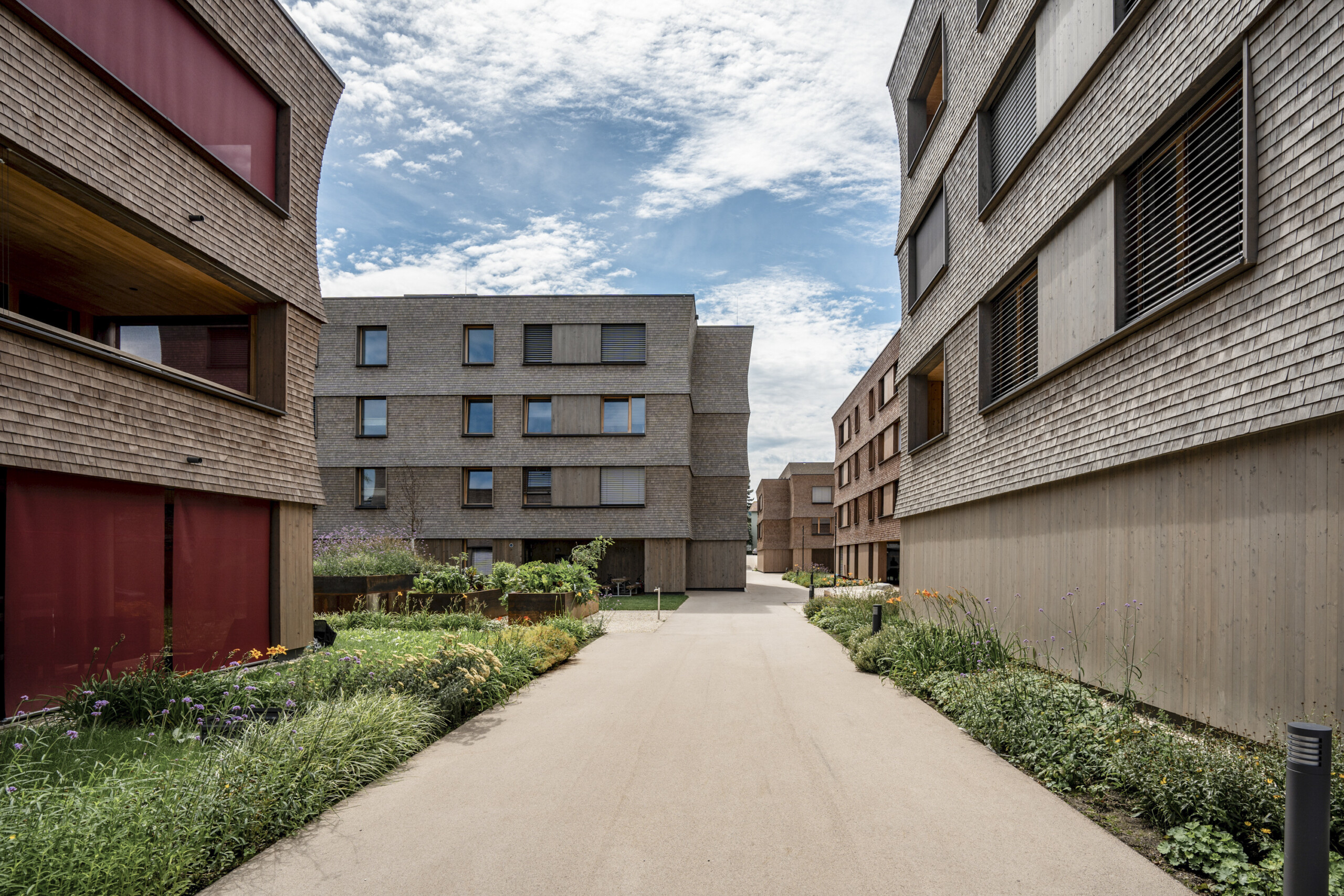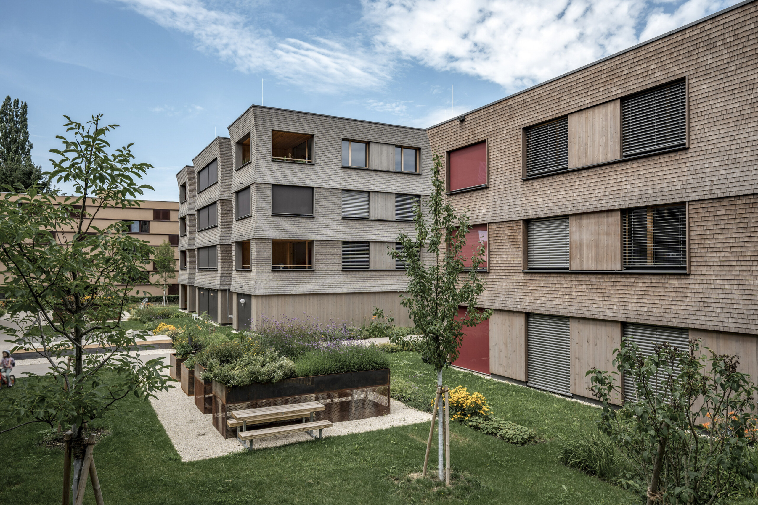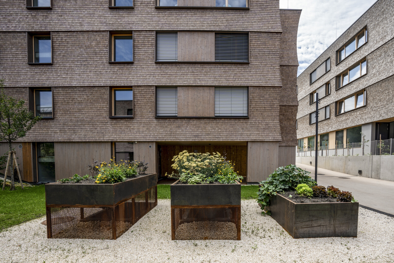 Der Kopfbau mit gewerblicher Nutzung im Erdgeschoss ist so nahe wie möglich an die Toni-Russ-Strasse im Süden gerückt. Auf Grund seiner zurückhaltenden Kubatur integriert er sich in die umgebende Bebauung, kontrastiert jedoch durch die leicht erhöhte Sockelposition subtil mit den anderen Gebäuden. Zwischen den einzelnen Volumen erstrecken sich sorgfältig gestaltete Anwohnerhöfe, die den Mietern als Begegnungsräume dienen. Sie bieten ansprechend ausgeführte Oberflächenbeläge, Sitzgelegenheiten sowie Vegetationszonen mit schattenspendendem Baumbestand; individuell bepflanzbare Hochbeete laden die Nachbarn zum Plaudern und Gärtnern ein, während die Kinder in den nahen Spielbereichen toben dürfen. Die gesamte Anlage wird durchgehend rollstuhlgerecht und verkehrsbefreit erschlossen, in ihrem Zentrum öffnet sich das Netz der Verbindungswege zu einem grosszügigen Quartiersplatz. Die ausgewogene Balance zwischen privaten und gemeinschaftlich genutzten Flächen fördert die Kommunikation und das Miteinander innerhalb und ausserhalb des Areals.