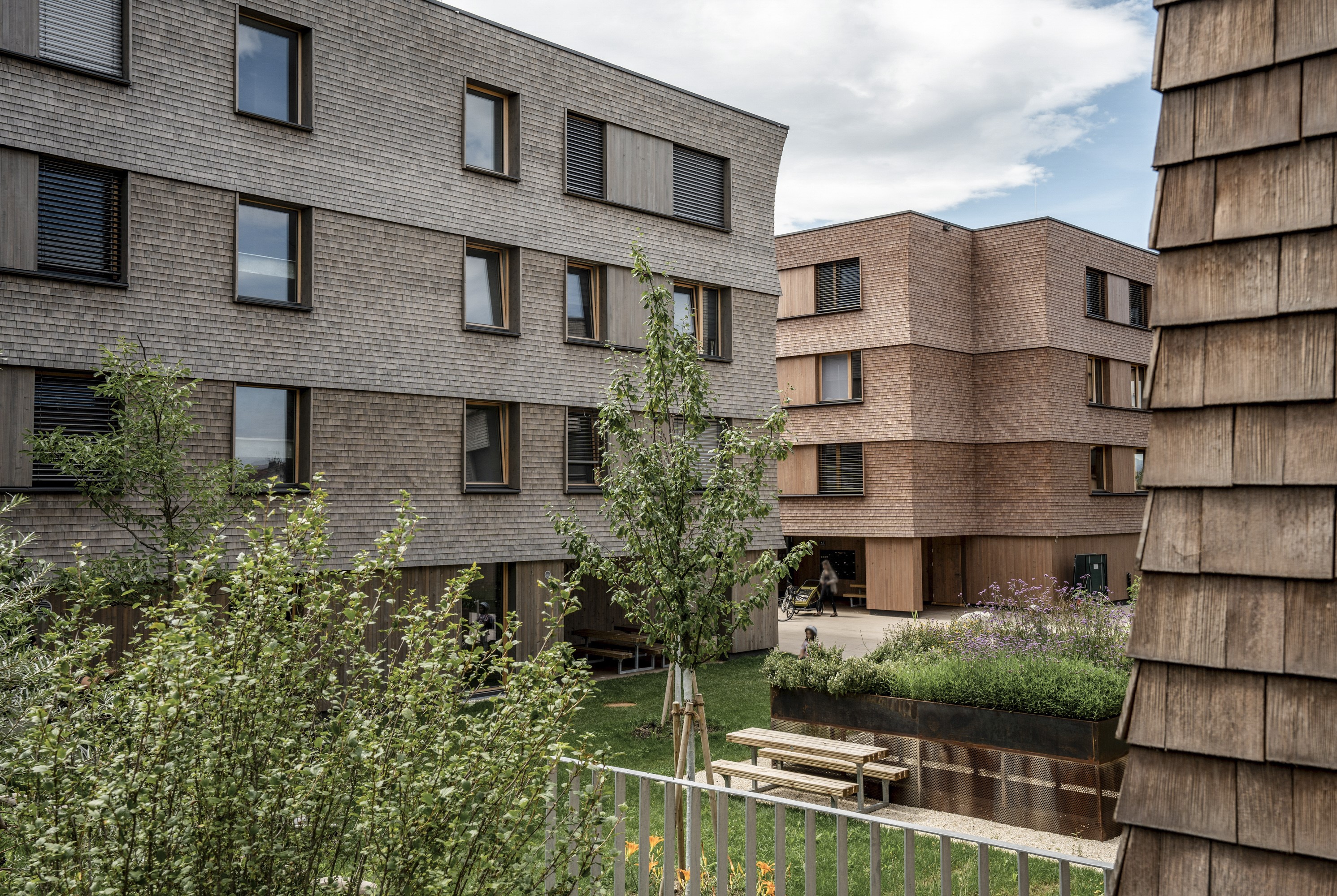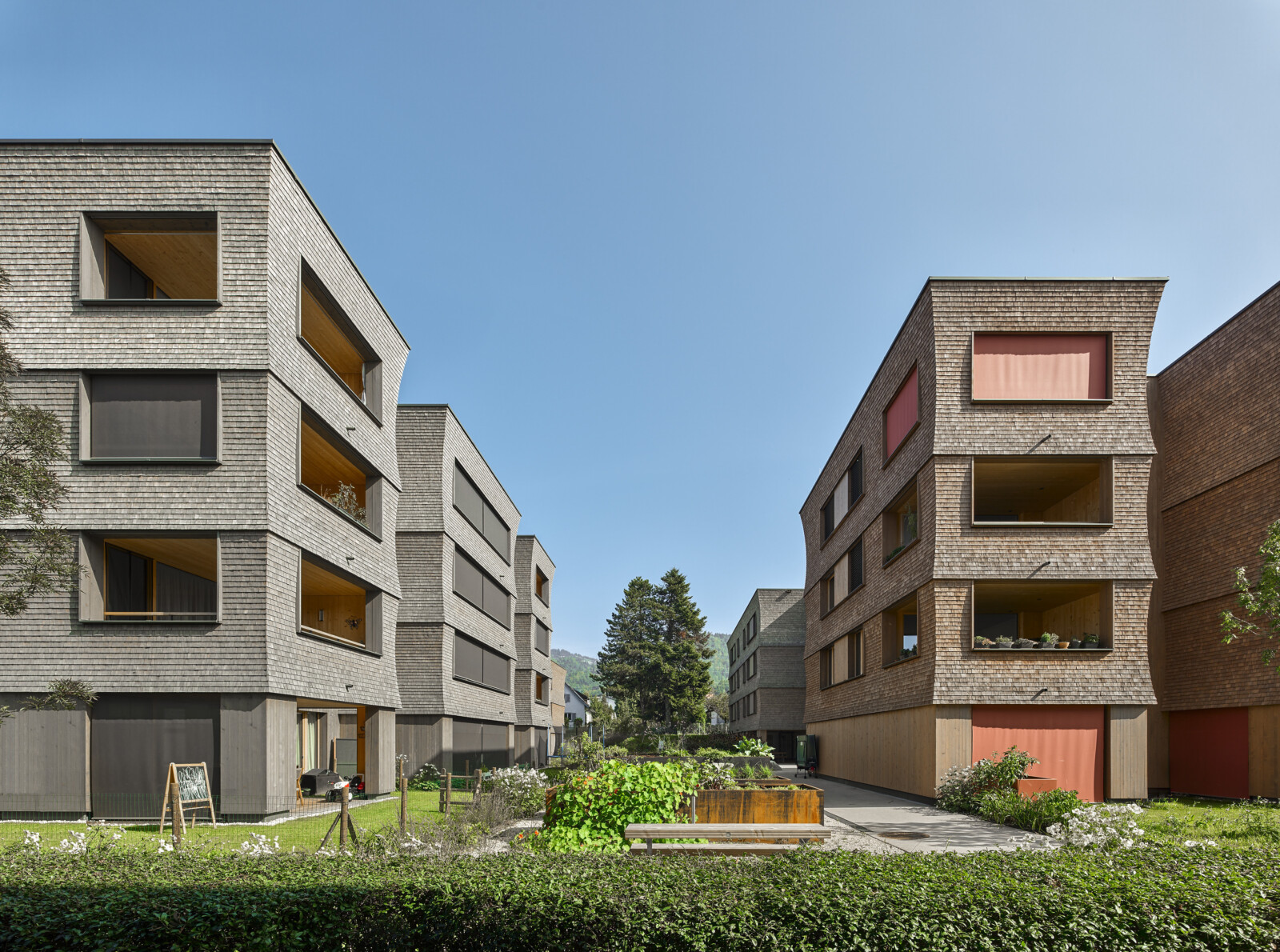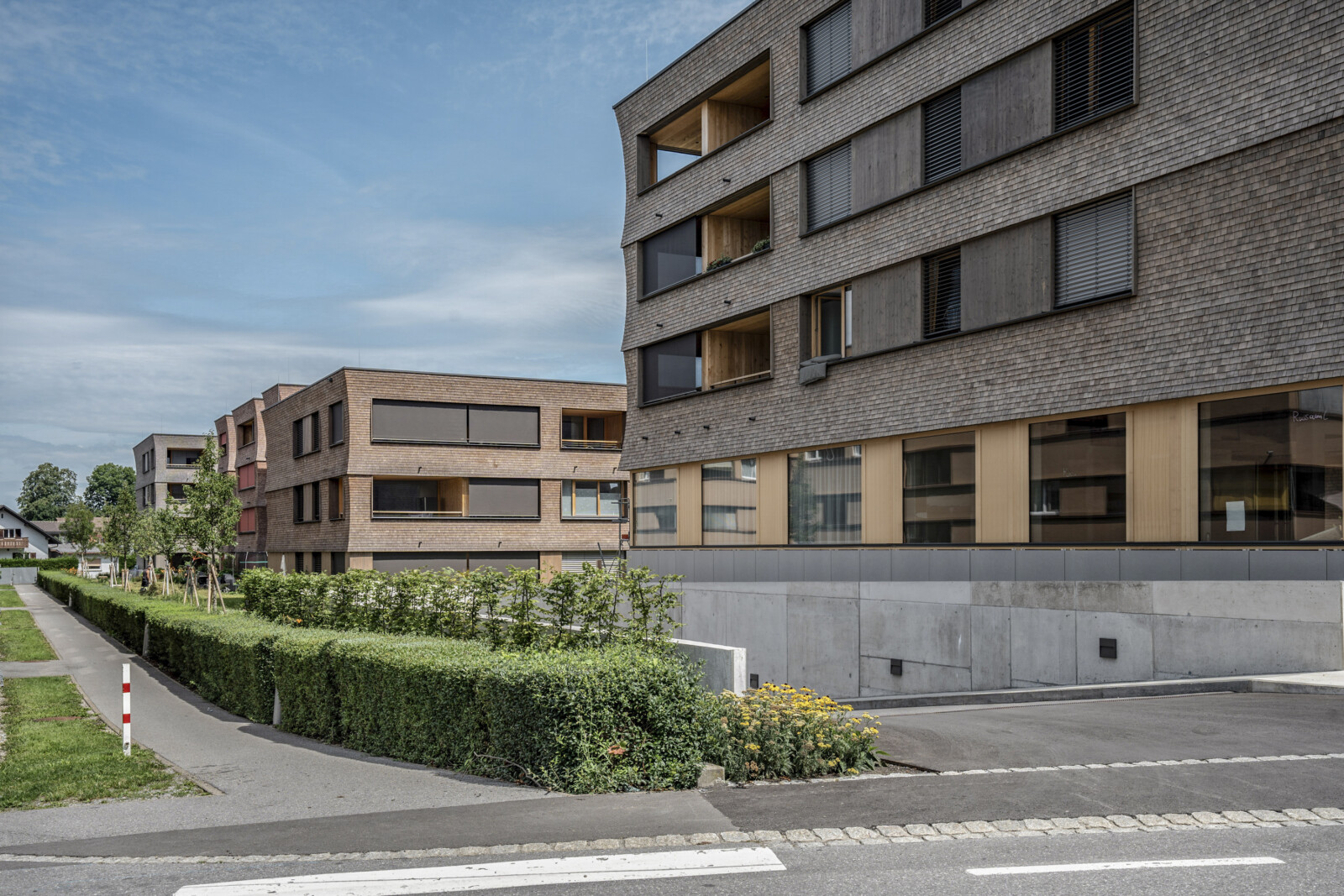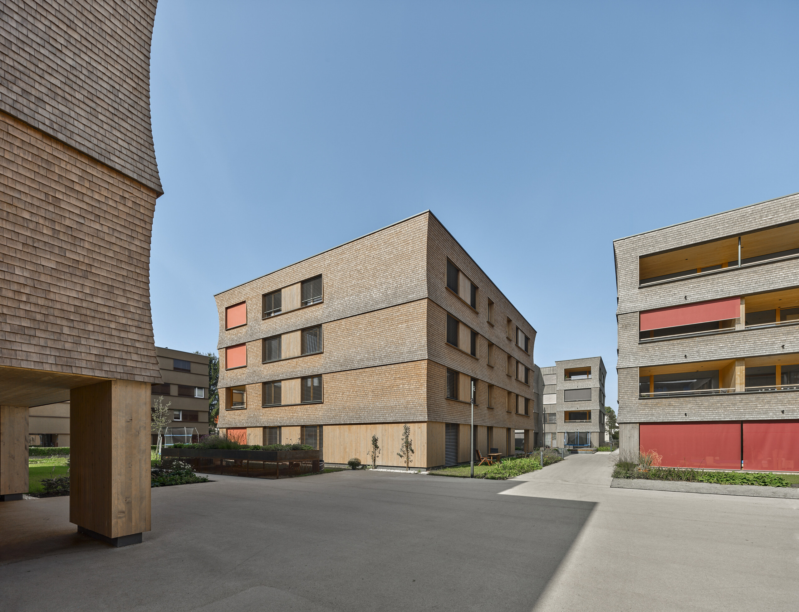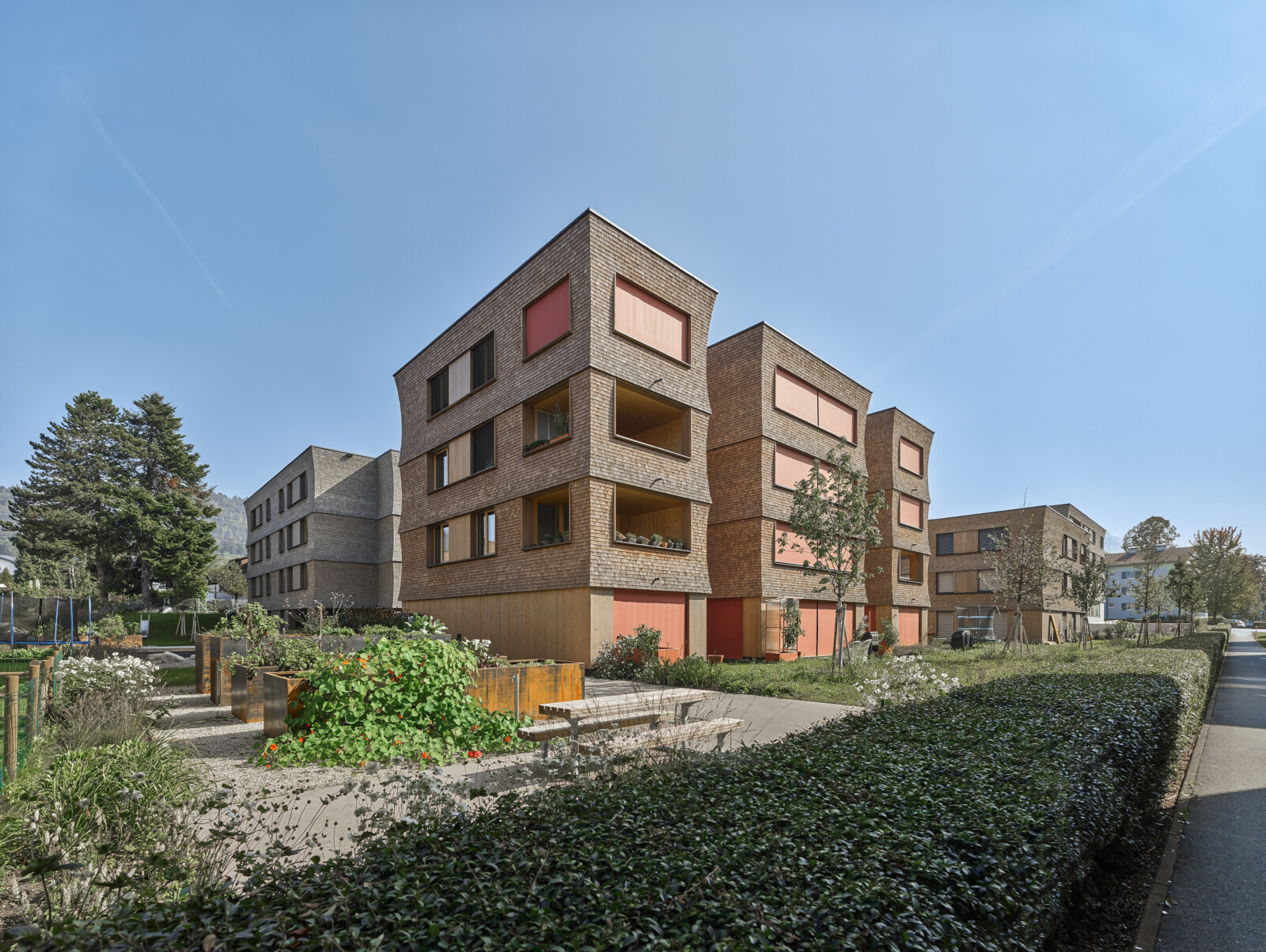 Der Kopfbau mit gewerblicher Nutzung im Erdgeschoss ist so nahe wie möglich an die Toni-Russ-Strasse im Süden gerückt. Auf Grund seiner zurückhaltenden Kubatur integriert er sich in die umgebende Bebauung, kontrastiert jedoch durch die leicht erhöhte Sockelposition subtil mit den anderen Gebäuden. Zwischen den einzelnen Volumen erstrecken sich sorgfältig gestaltete Anwohnerhöfe, die den Mietern als Begegnungsräume dienen. Sie bieten ansprechend ausgeführte Oberflächenbeläge, Sitzgelegenheiten sowie Vegetationszonen mit schattenspendendem Baumbestand; individuell bepflanzbare Hochbeete laden die Nachbarn zum Plaudern und Gärtnern ein, während die Kinder in den nahen Spielbereichen toben dürfen. Die gesamte Anlage wird durchgehend rollstuhlgerecht und verkehrsbefreit erschlossen, in ihrem Zentrum öffnet sich das Netz der Verbindungswege zu einem grosszügigen Quartiersplatz. Die ausgewogene Balance zwischen privaten und gemeinschaftlich genutzten Flächen fördert die Kommunikation und das Miteinander innerhalb und ausserhalb des Areals.