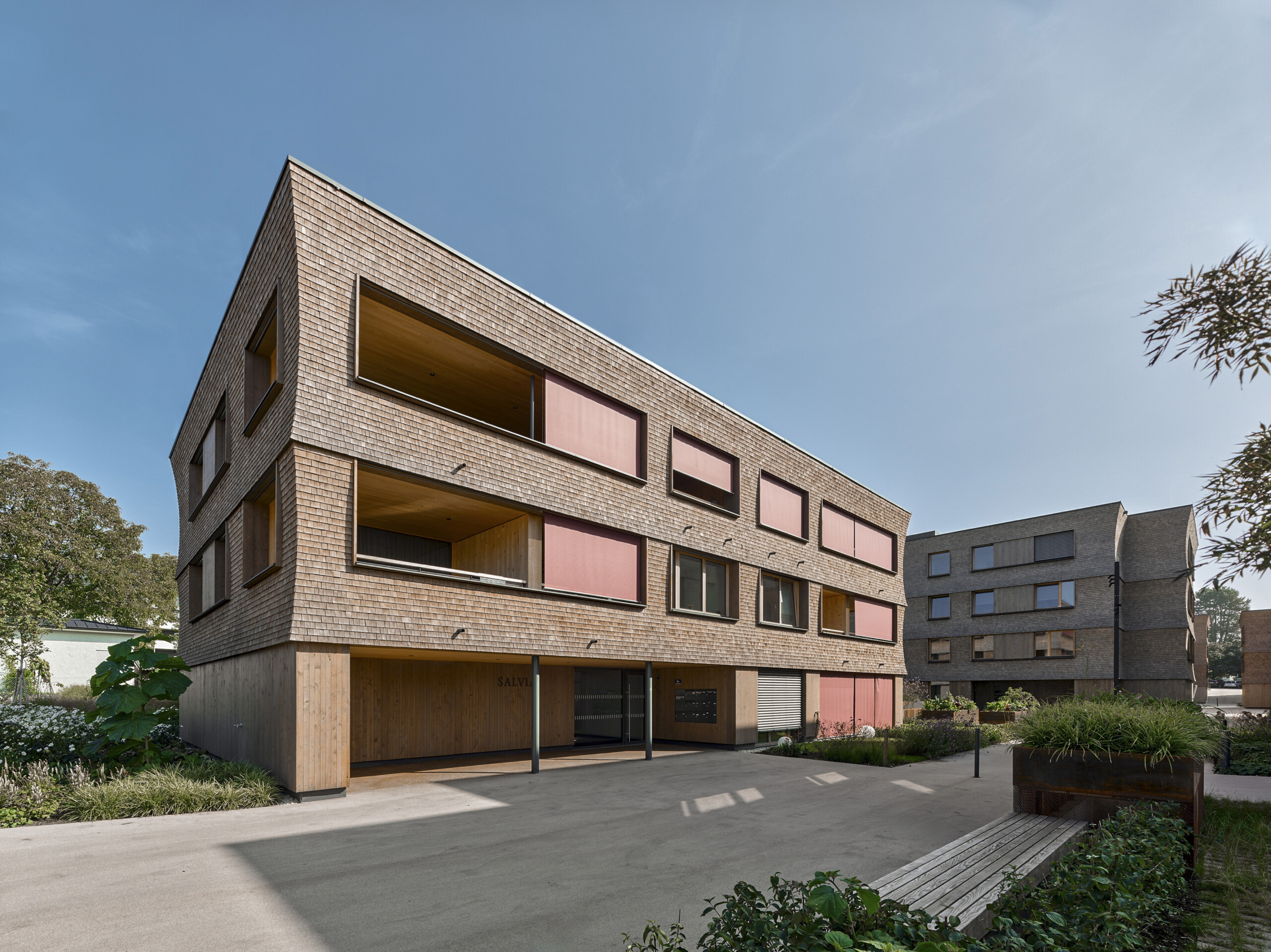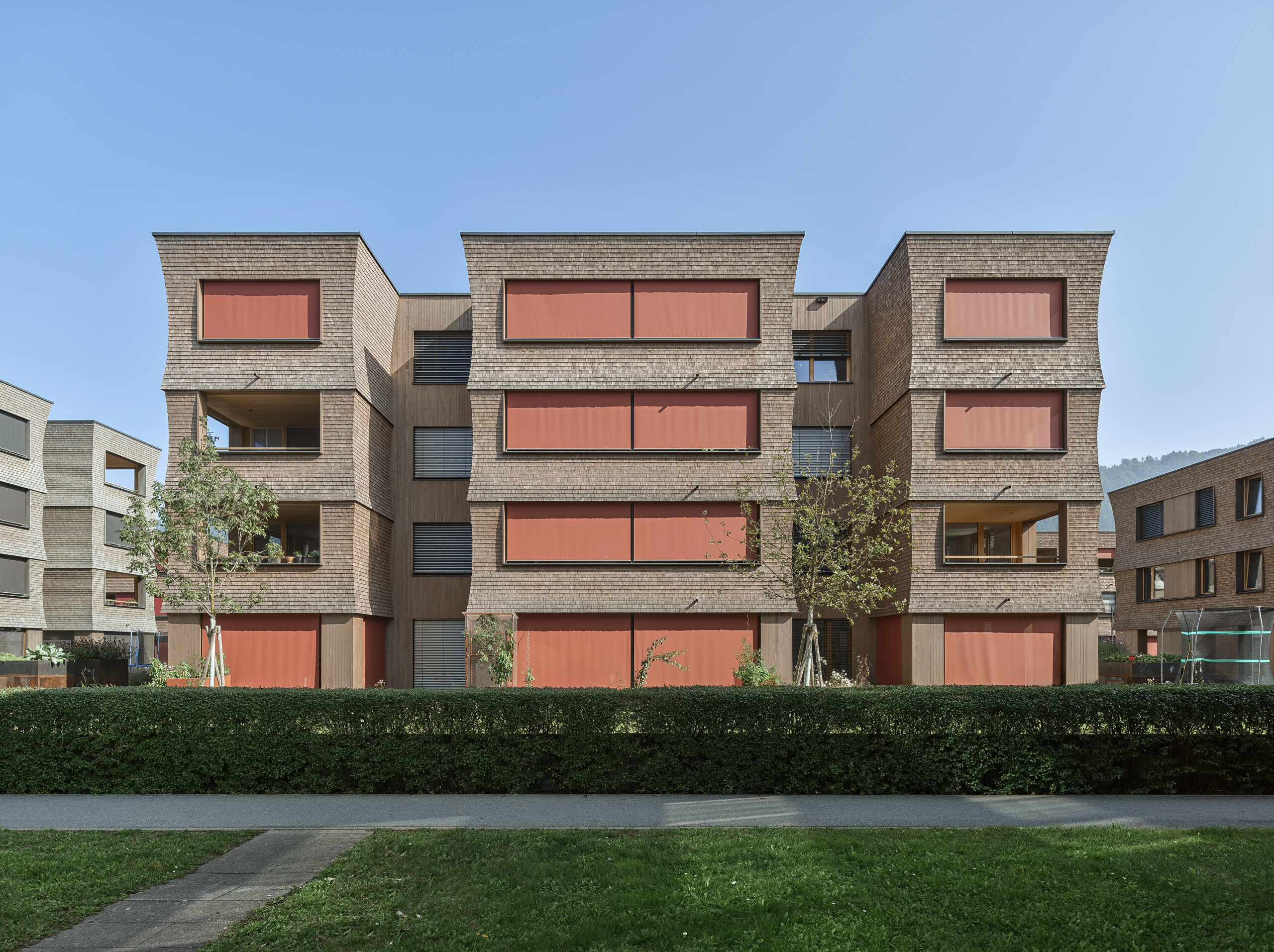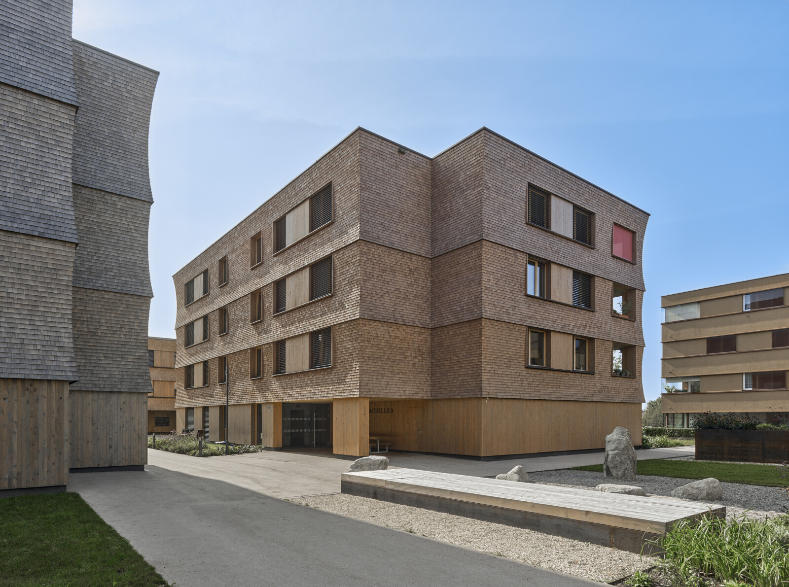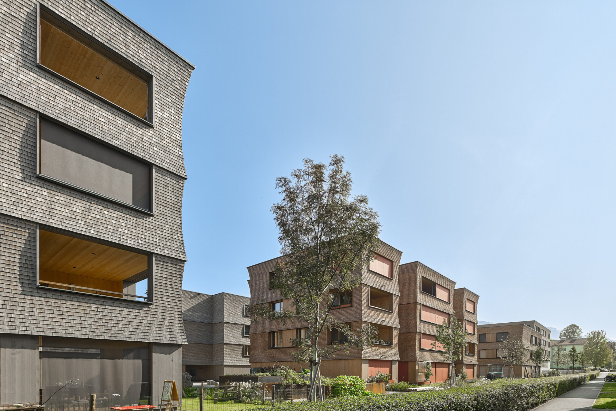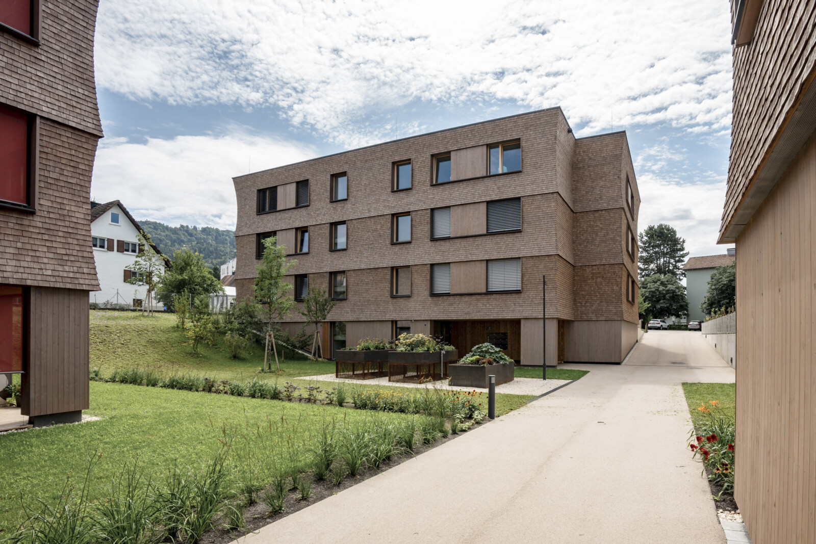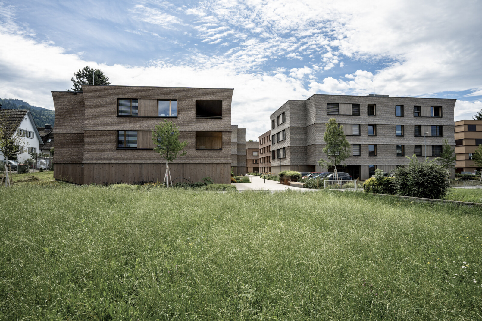 Der Kopfbau mit gewerblicher Nutzung im Erdgeschoss ist so nahe wie möglich an die Toni-Russ-Strasse im Süden gerückt. Auf Grund seiner zurückhaltenden Kubatur integriert er sich in die umgebende Bebauung, kontrastiert jedoch durch die leicht erhöhte Sockelposition subtil mit den anderen Gebäuden. Zwischen den einzelnen Volumen erstrecken sich sorgfältig gestaltete Anwohnerhöfe, die den Mietern als Begegnungsräume dienen. Sie bieten ansprechend ausgeführte Oberflächenbeläge, Sitzgelegenheiten sowie Vegetationszonen mit schattenspendendem Baumbestand; individuell bepflanzbare Hochbeete laden die Nachbarn zum Plaudern und Gärtnern ein, während die Kinder in den nahen Spielbereichen toben dürfen. Die gesamte Anlage wird durchgehend rollstuhlgerecht und verkehrsbefreit erschlossen, in ihrem Zentrum öffnet sich das Netz der Verbindungswege zu einem grosszügigen Quartiersplatz. Die ausgewogene Balance zwischen privaten und gemeinschaftlich genutzten Flächen fördert die Kommunikation und das Miteinander innerhalb und ausserhalb des Areals.