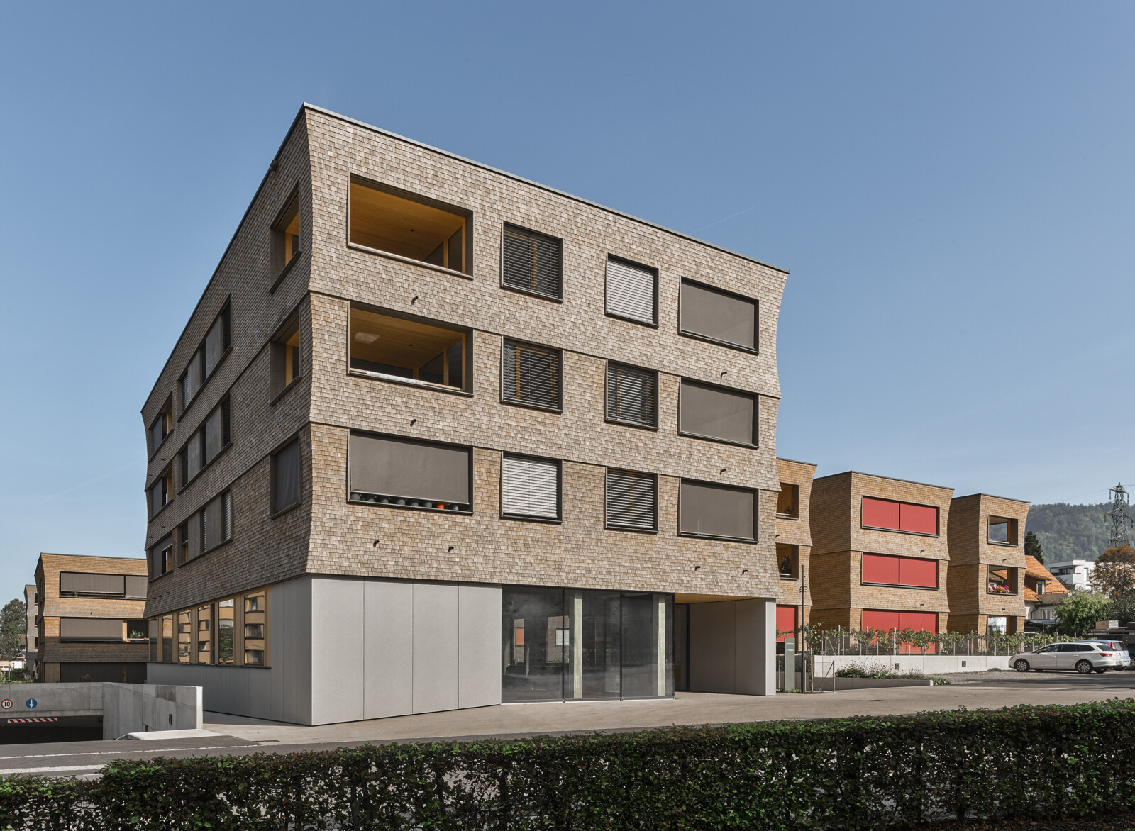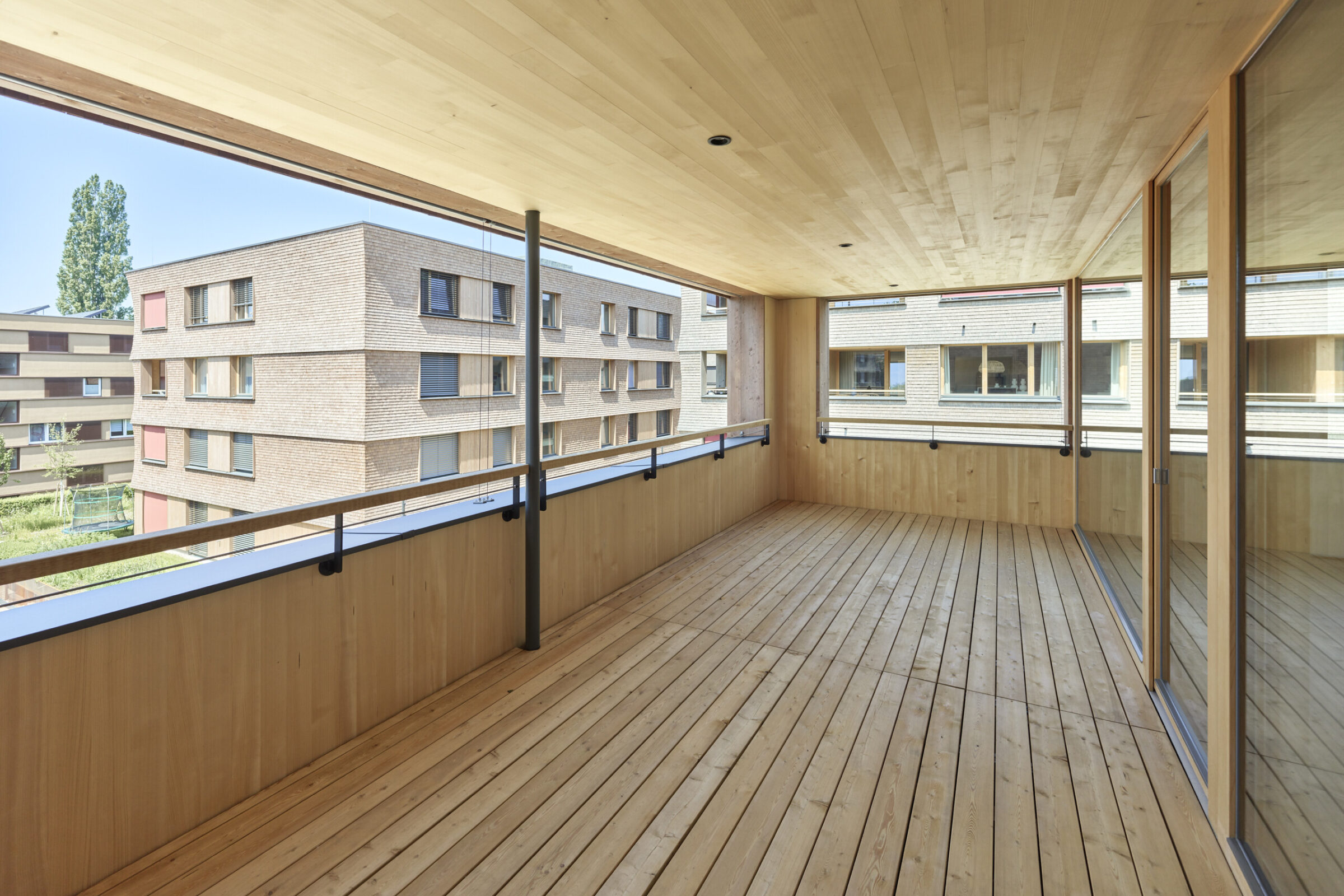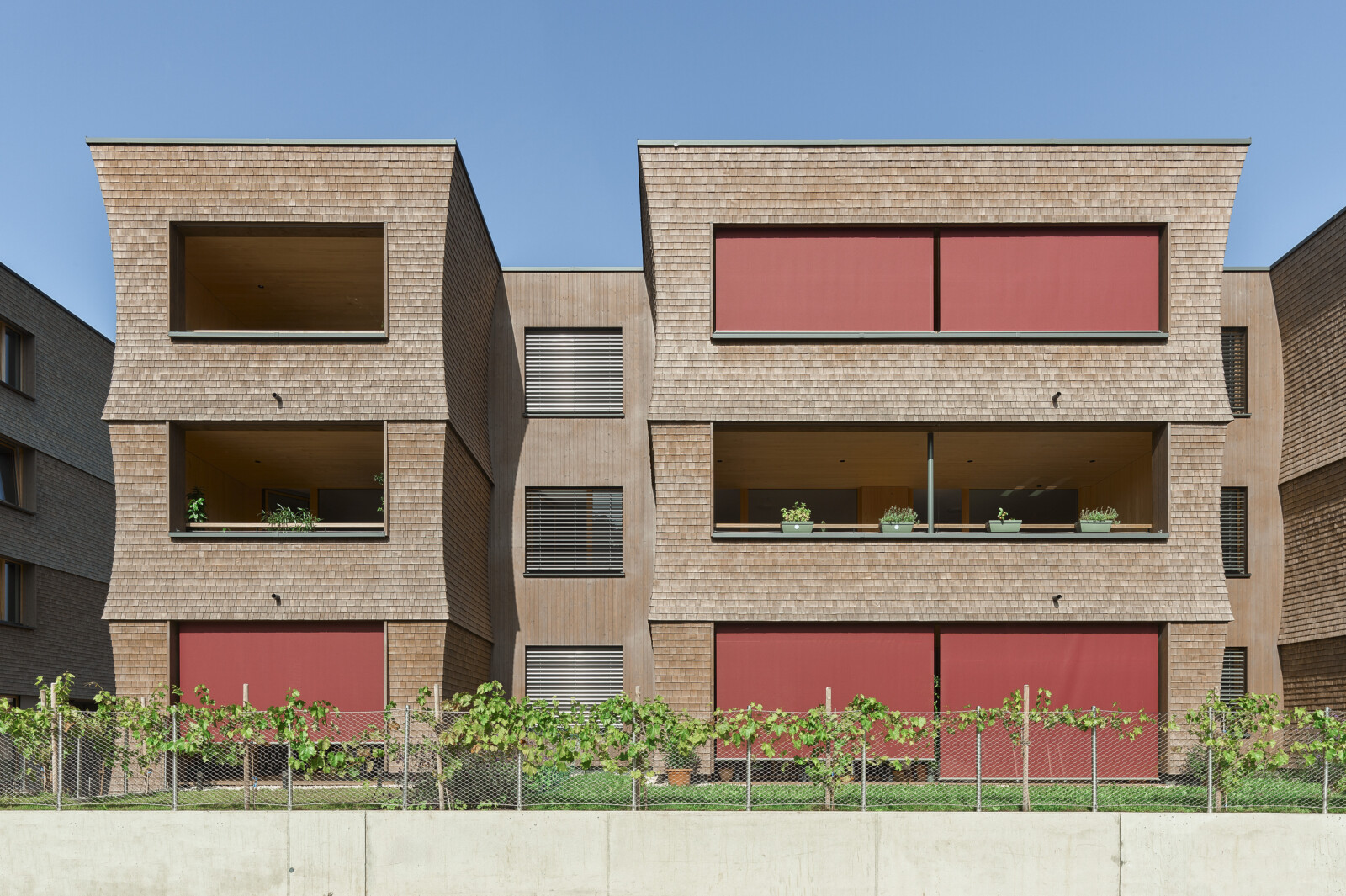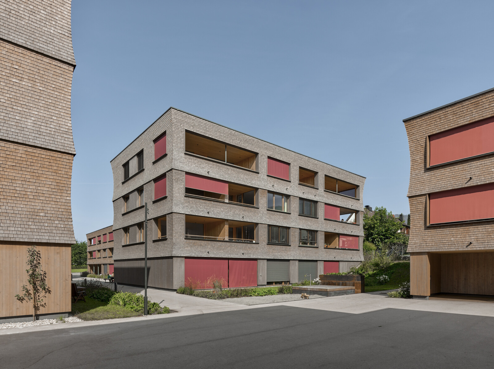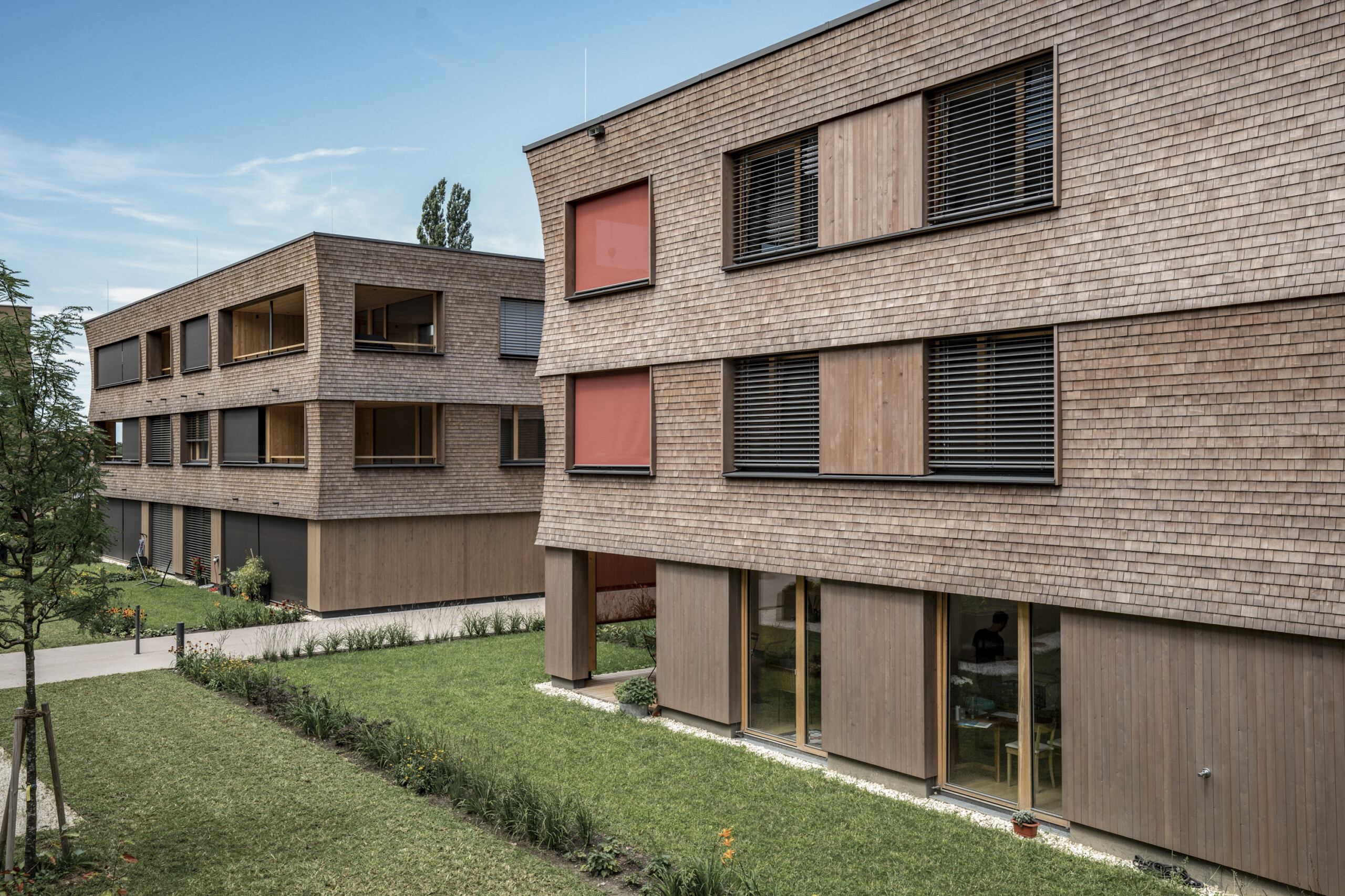Der Kopfbau mit gewerblicher Nutzung im Erdgeschoss ist so nahe wie möglich an die Toni-Russ-Strasse im Süden gerückt. Auf Grund seiner zurückhaltenden Kubatur integriert er sich in die umgebende Bebauung, kontrastiert jedoch durch die leicht erhöhte Sockelposition subtil mit den anderen Gebäuden. Zwischen den einzelnen Volumen erstrecken sich sorgfältig gestaltete Anwohnerhöfe, die den Mietern als Begegnungsräume dienen. Sie bieten ansprechend ausgeführte Oberflächenbeläge, Sitzgelegenheiten sowie Vegetationszonen mit schattenspendendem Baumbestand; individuell bepflanzbare Hochbeete laden die Nachbarn zum Plaudern und Gärtnern ein, während die Kinder in den nahen Spielbereichen toben dürfen. Die gesamte Anlage wird durchgehend rollstuhlgerecht und verkehrsbefreit erschlossen, in ihrem Zentrum öffnet sich das Netz der Verbindungswege zu einem grosszügigen Quartiersplatz. Die ausgewogene Balance zwischen privaten und gemeinschaftlich genutzten Flächen fördert die Kommunikation und das Miteinander innerhalb und ausserhalb des Areals.