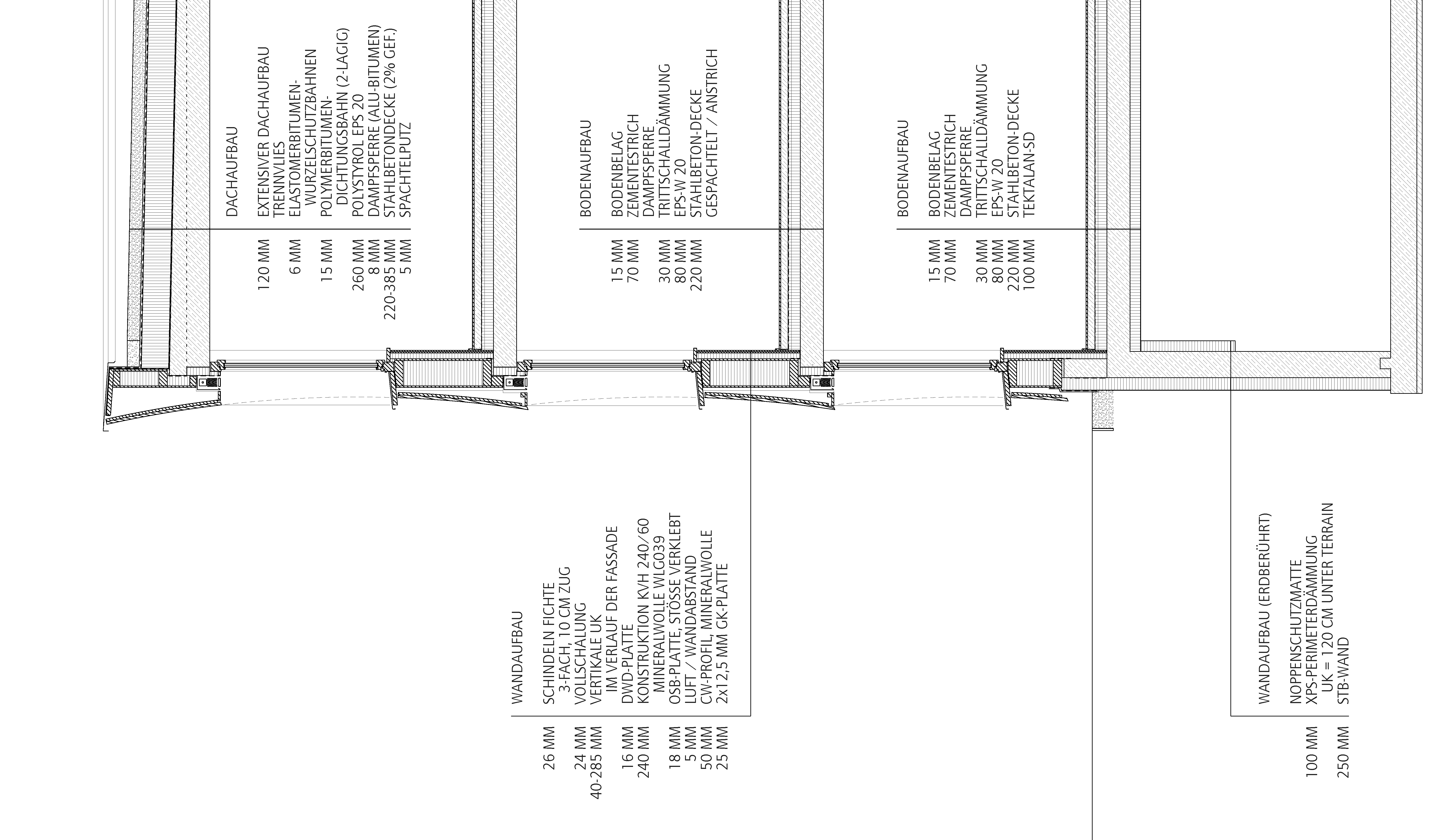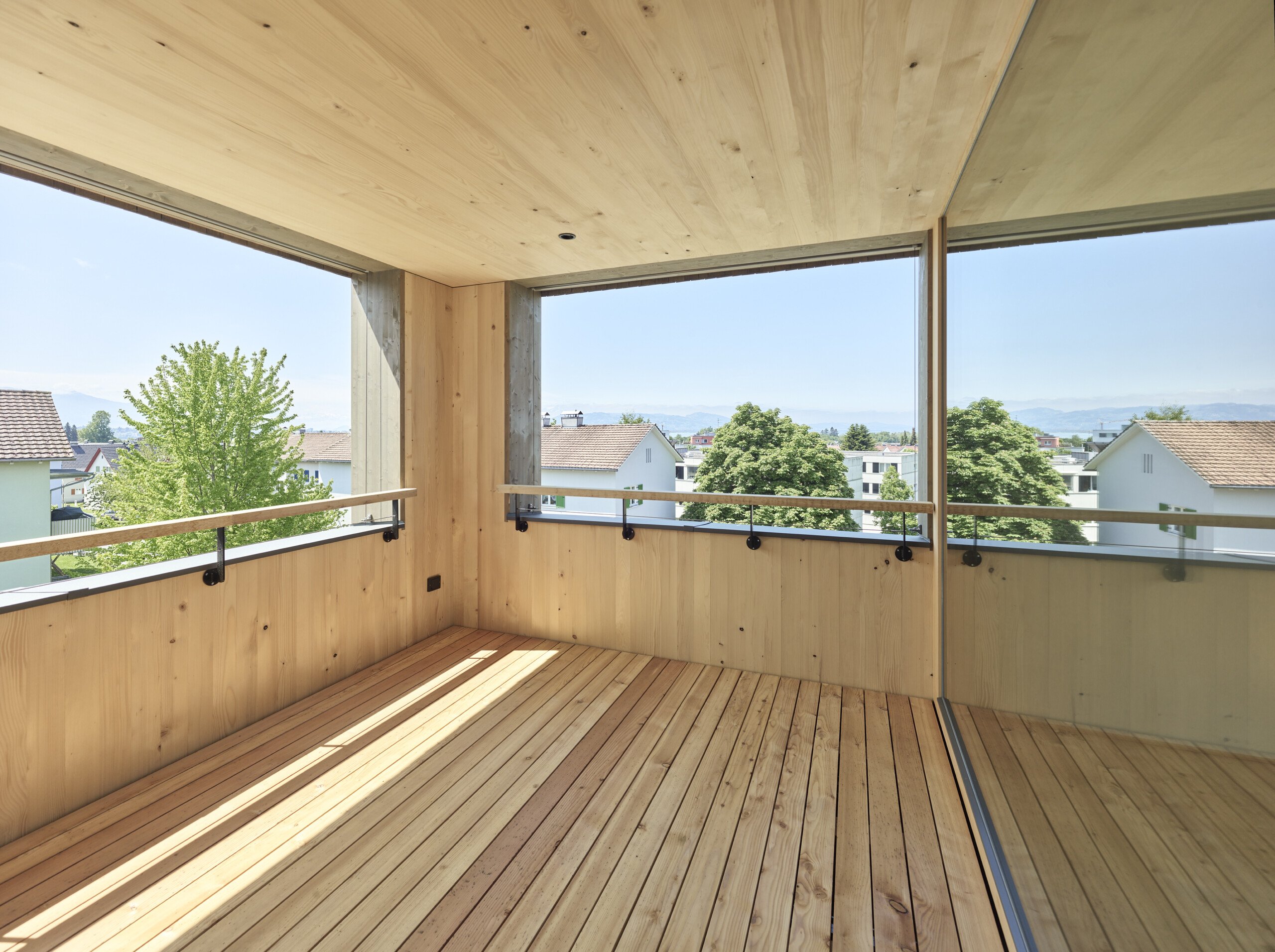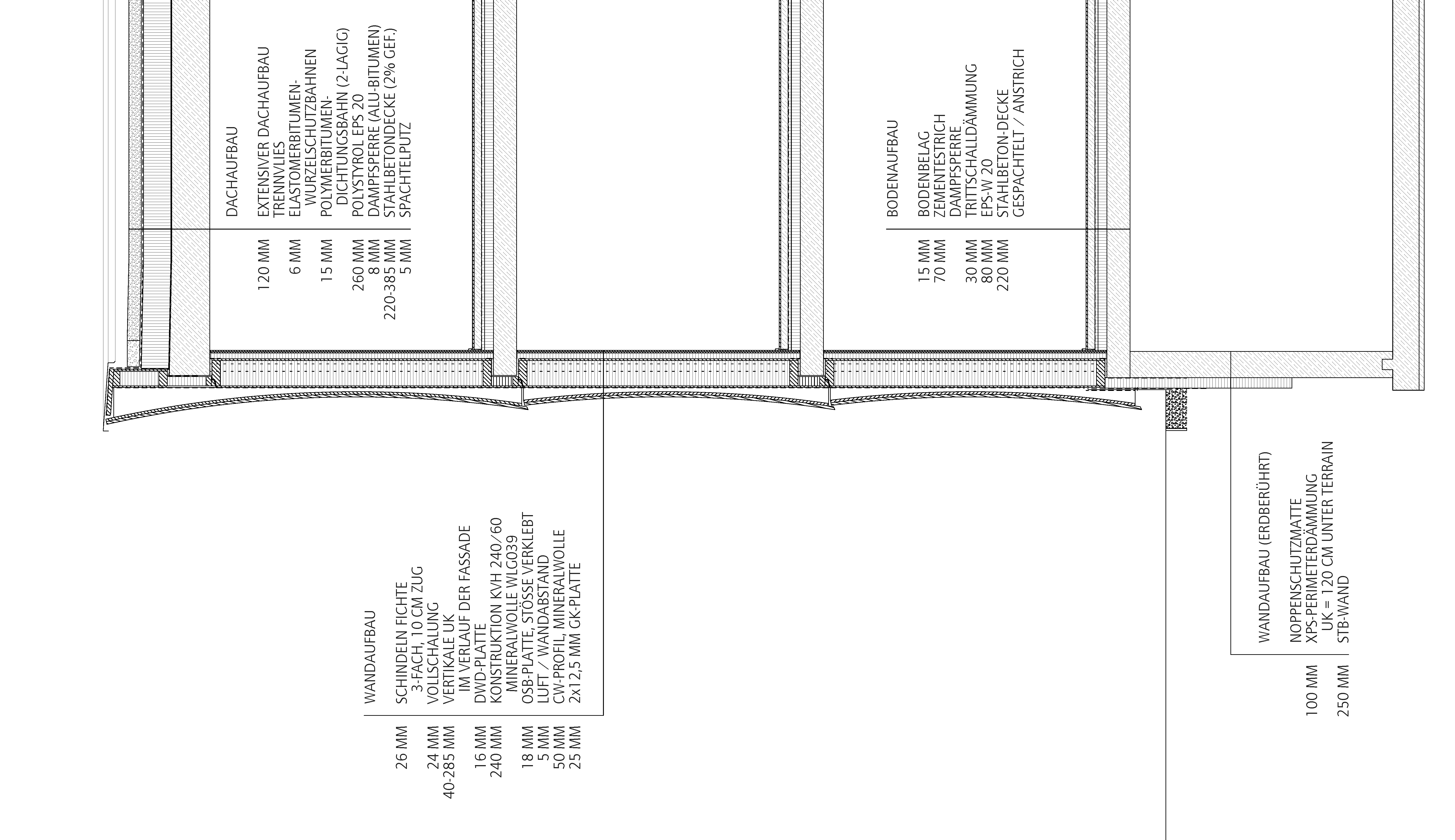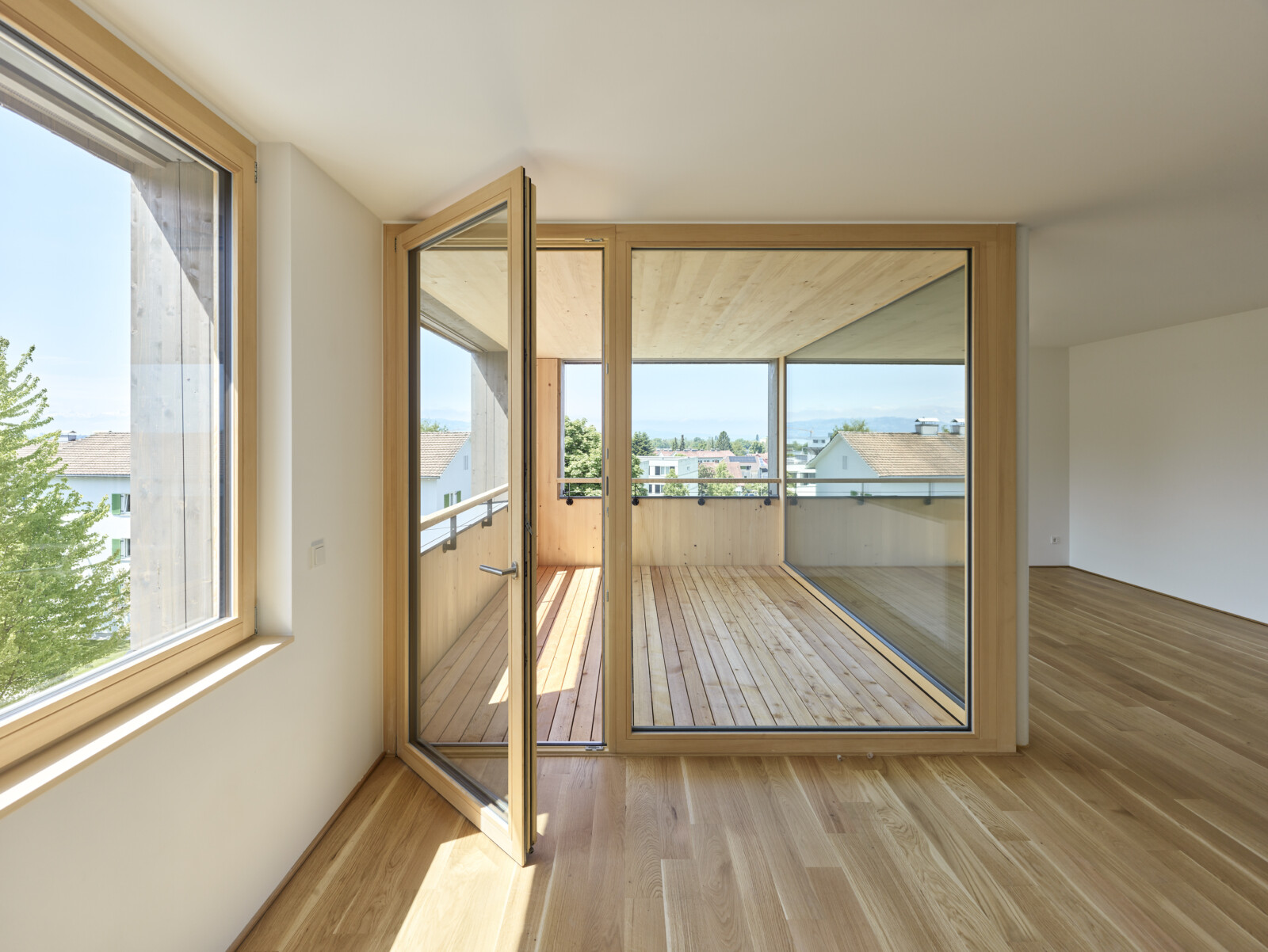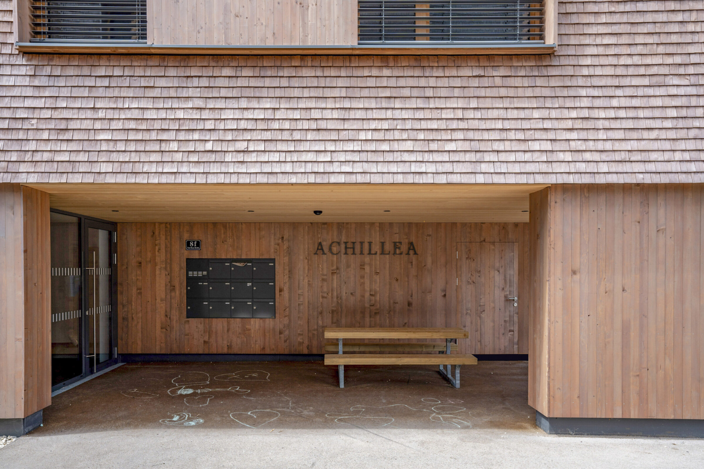 Der Kopfbau mit gewerblicher Nutzung im Erdgeschoss ist so nahe wie möglich an die Toni-Russ-Strasse im Süden gerückt. Auf Grund seiner zurückhaltenden Kubatur integriert er sich in die umgebende Bebauung, kontrastiert jedoch durch die leicht erhöhte Sockelposition subtil mit den anderen Gebäuden. Zwischen den einzelnen Volumen erstrecken sich sorgfältig gestaltete Anwohnerhöfe, die den Mietern als Begegnungsräume dienen. Sie bieten ansprechend ausgeführte Oberflächenbeläge, Sitzgelegenheiten sowie Vegetationszonen mit schattenspendendem Baumbestand; individuell bepflanzbare Hochbeete laden die Nachbarn zum Plaudern und Gärtnern ein, während die Kinder in den nahen Spielbereichen toben dürfen. Die gesamte Anlage wird durchgehend rollstuhlgerecht und verkehrsbefreit erschlossen, in ihrem Zentrum öffnet sich das Netz der Verbindungswege zu einem grosszügigen Quartiersplatz. Die ausgewogene Balance zwischen privaten und gemeinschaftlich genutzten Flächen fördert die Kommunikation und das Miteinander innerhalb und ausserhalb des Areals.