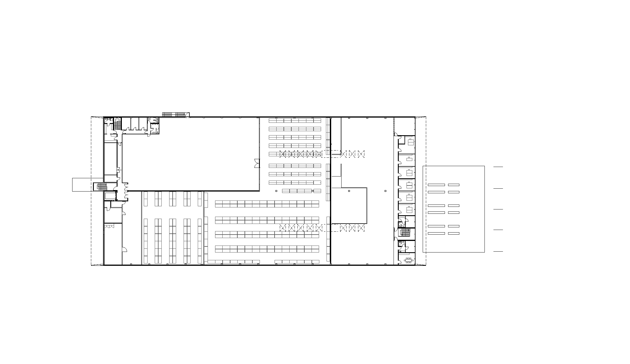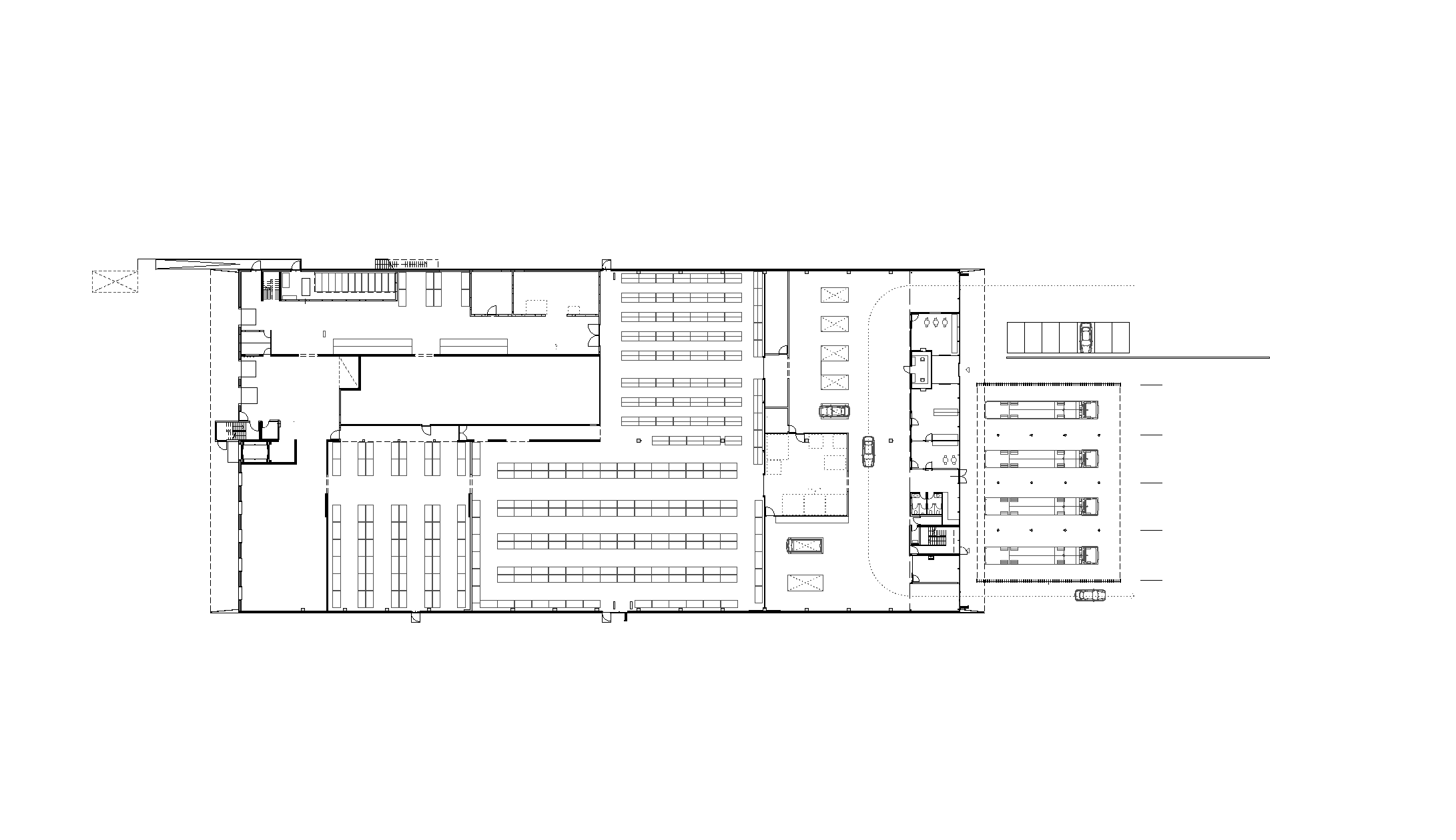 Im Zuge der Umsiedlung des Betriebes in einen ehemaligen Lebensmittelgroßmarkt wurde die Reifenservicehalle auf dem davor liegenden Parkplatz errichtet. In diesem von drei Seiten geschützten Flugdach können die Reifenservicearbeiten für LKW´s durchgeführt werden. Das Flugdach steht vor der Eingangsglasfassade, womit es notwendig war, das Gebäude möglichst leicht und transparent zu gestalten. Auf eingespannten Stahlbetonstützen sind Hauptträger aufgelegt, an welche die nur 6 cm breiten sehr eng gelegten Nebenträger eingebunden werden. Diese Nebenträger liegen im Seitenfassadenbereich direkt auf Stützen in derselben Stärke. Der Windschutz dieser lamellenartigen Wand wird mit in die Stützen eingeklemmten Acrylglasplatten bewerkstelligt.