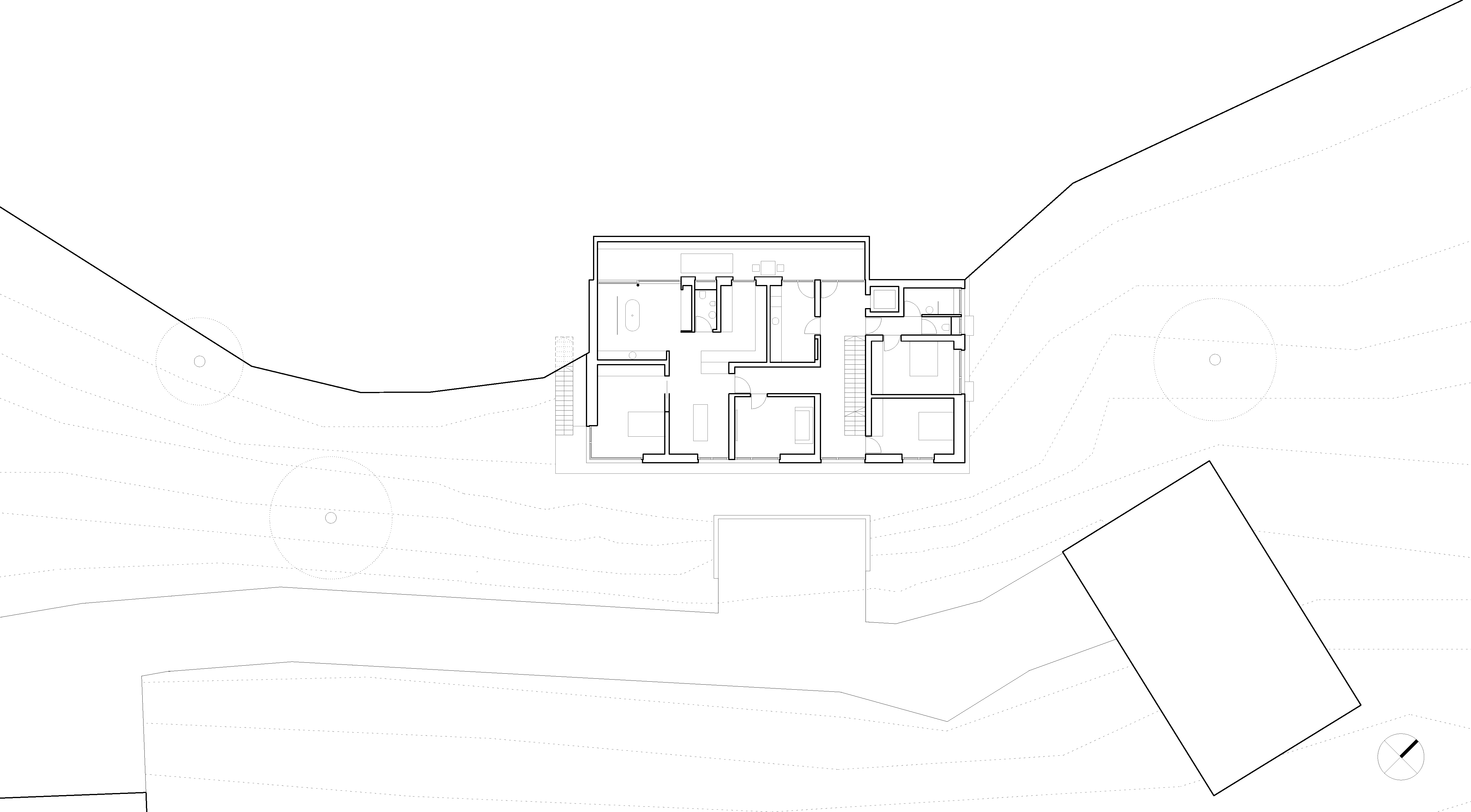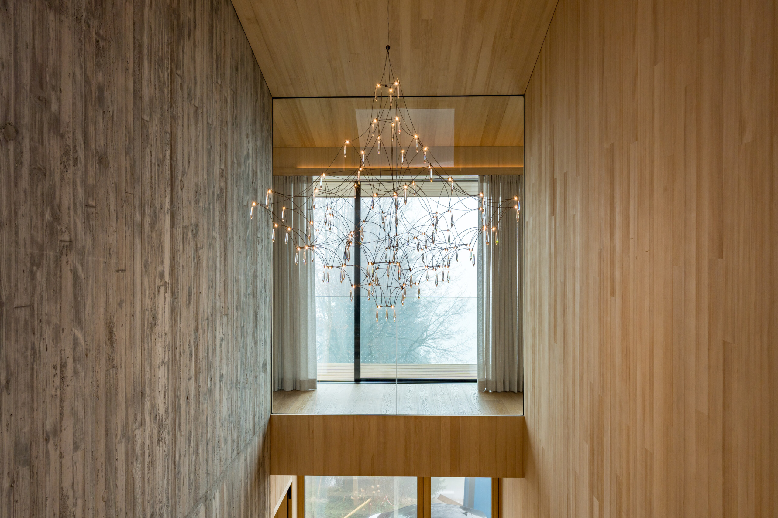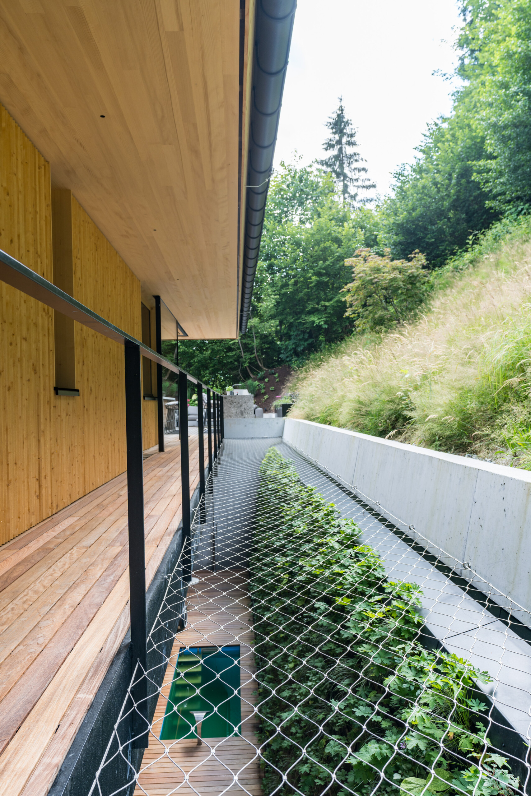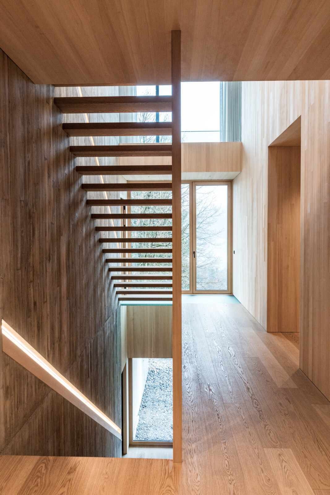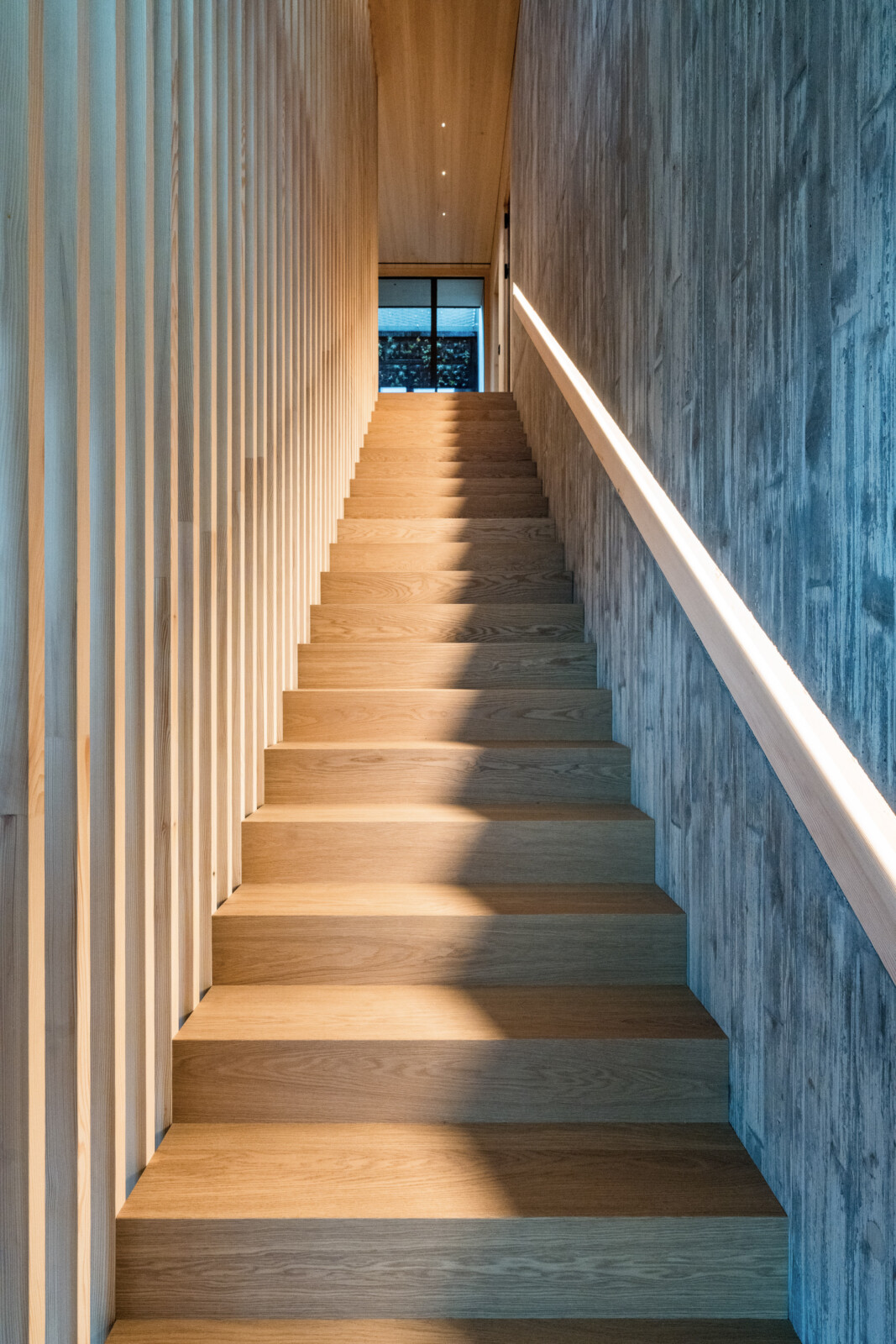 Die zentral angelegte Vertikalerschließung verbindet drei Geschoßebenen und gliedert ihre Funktionen durch eine begleitende Sichtbetonwand. Klug inszenierte Sichtachsen verleihen dem kompakten Baukörper ein Gefühl von Weiträumigkeit und Tiefe, während der rückseitige Lichthof mit Tauchbecken für die Sauna sowie eine Terrasse im skulptural geformten Dach private Rückzugsorte bieten.