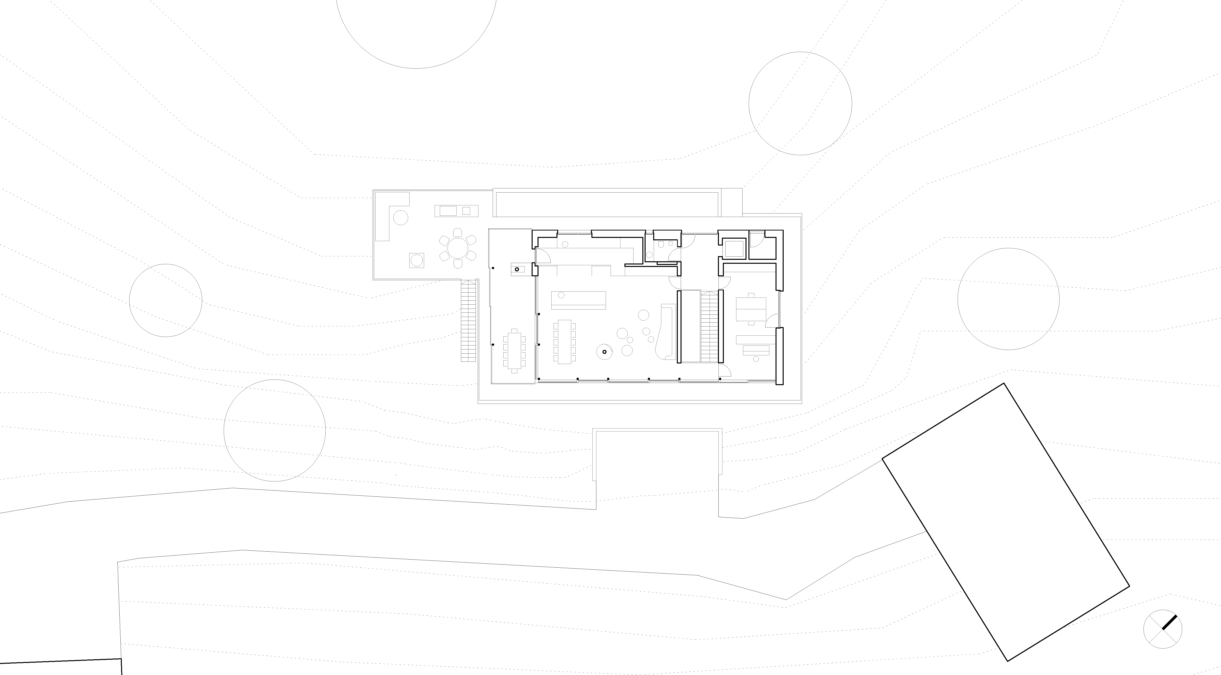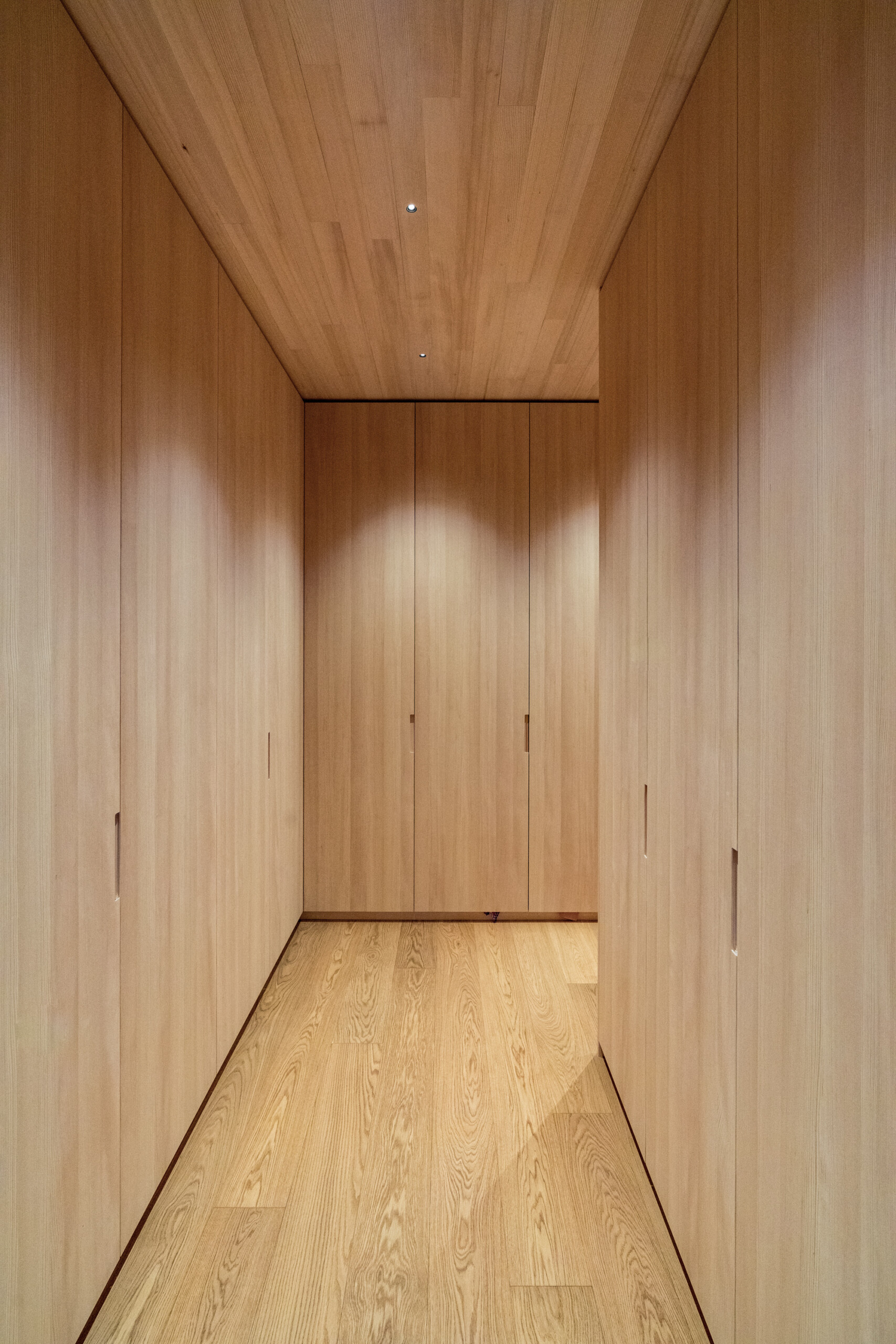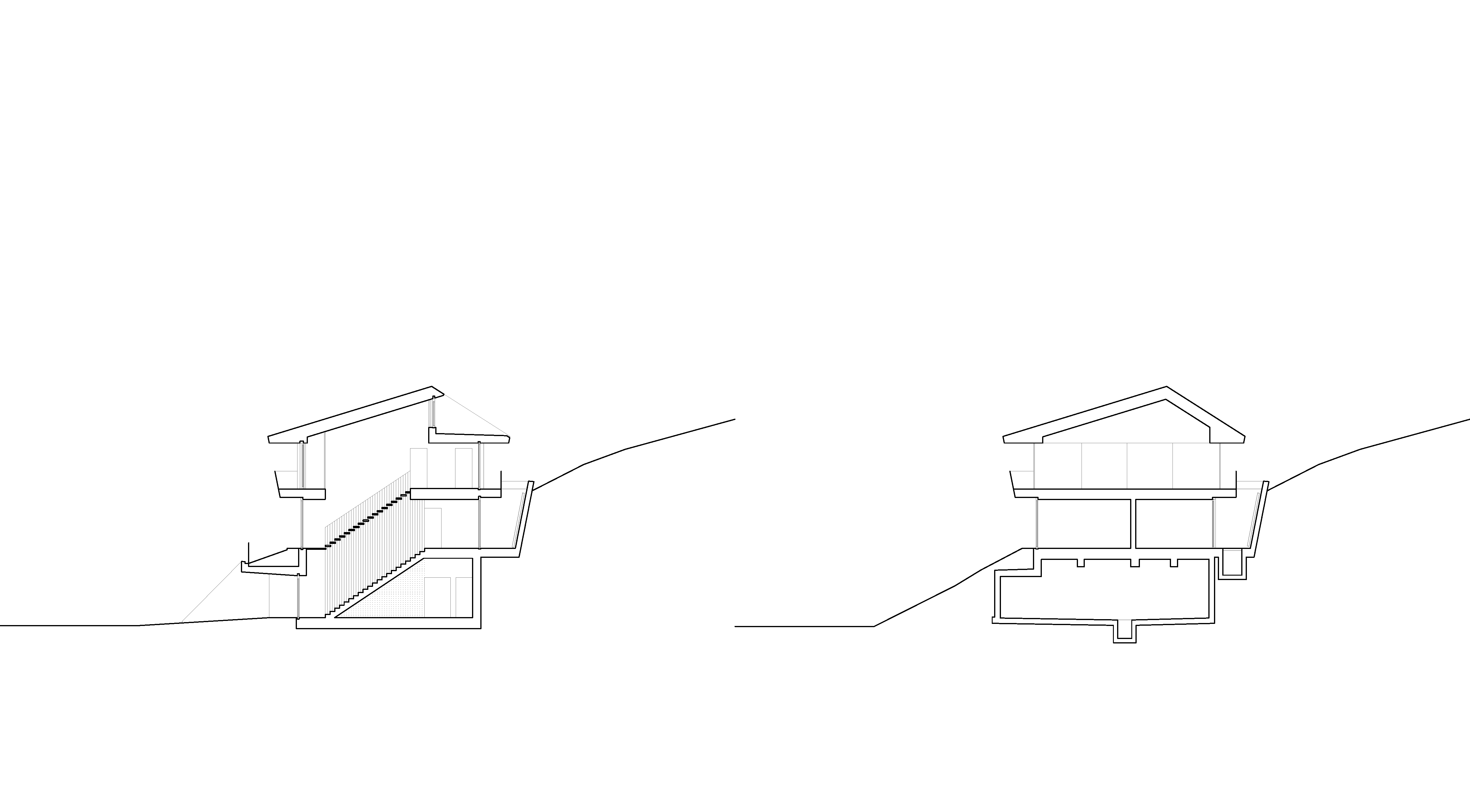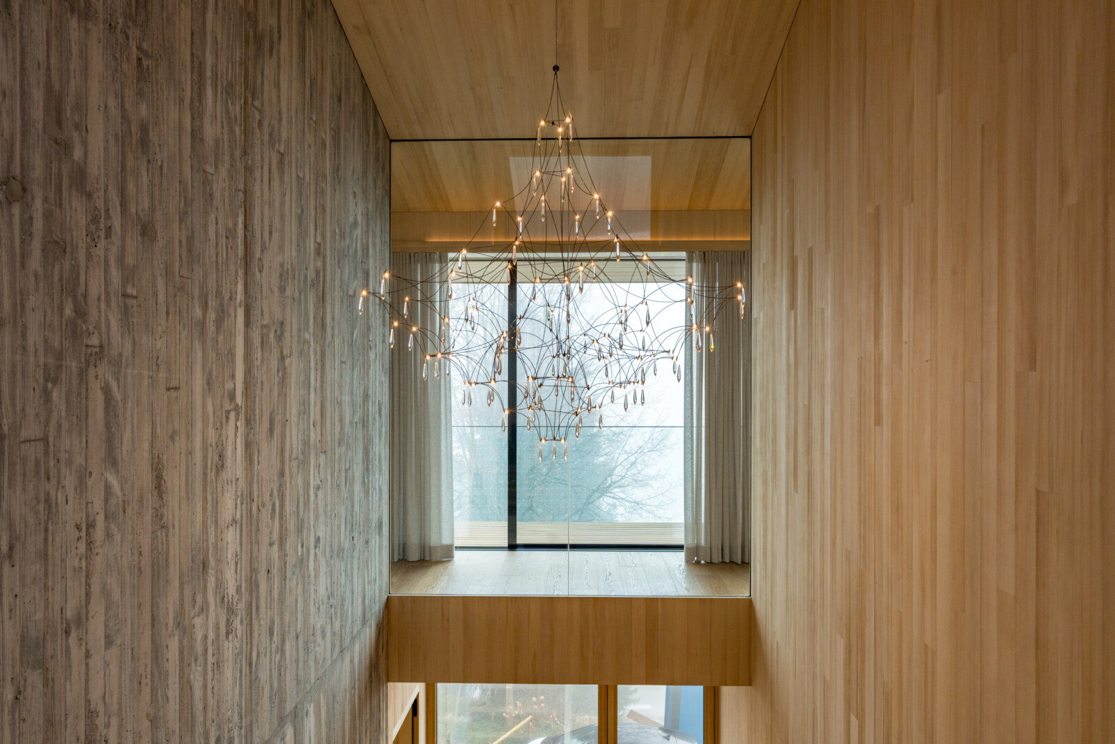 Die zentral angelegte Vertikalerschließung verbindet drei Geschoßebenen und gliedert ihre Funktionen durch eine begleitende Sichtbetonwand. Klug inszenierte Sichtachsen verleihen dem kompakten Baukörper ein Gefühl von Weiträumigkeit und Tiefe, während der rückseitige Lichthof mit Tauchbecken für die Sauna sowie eine Terrasse im skulptural geformten Dach private Rückzugsorte bieten.