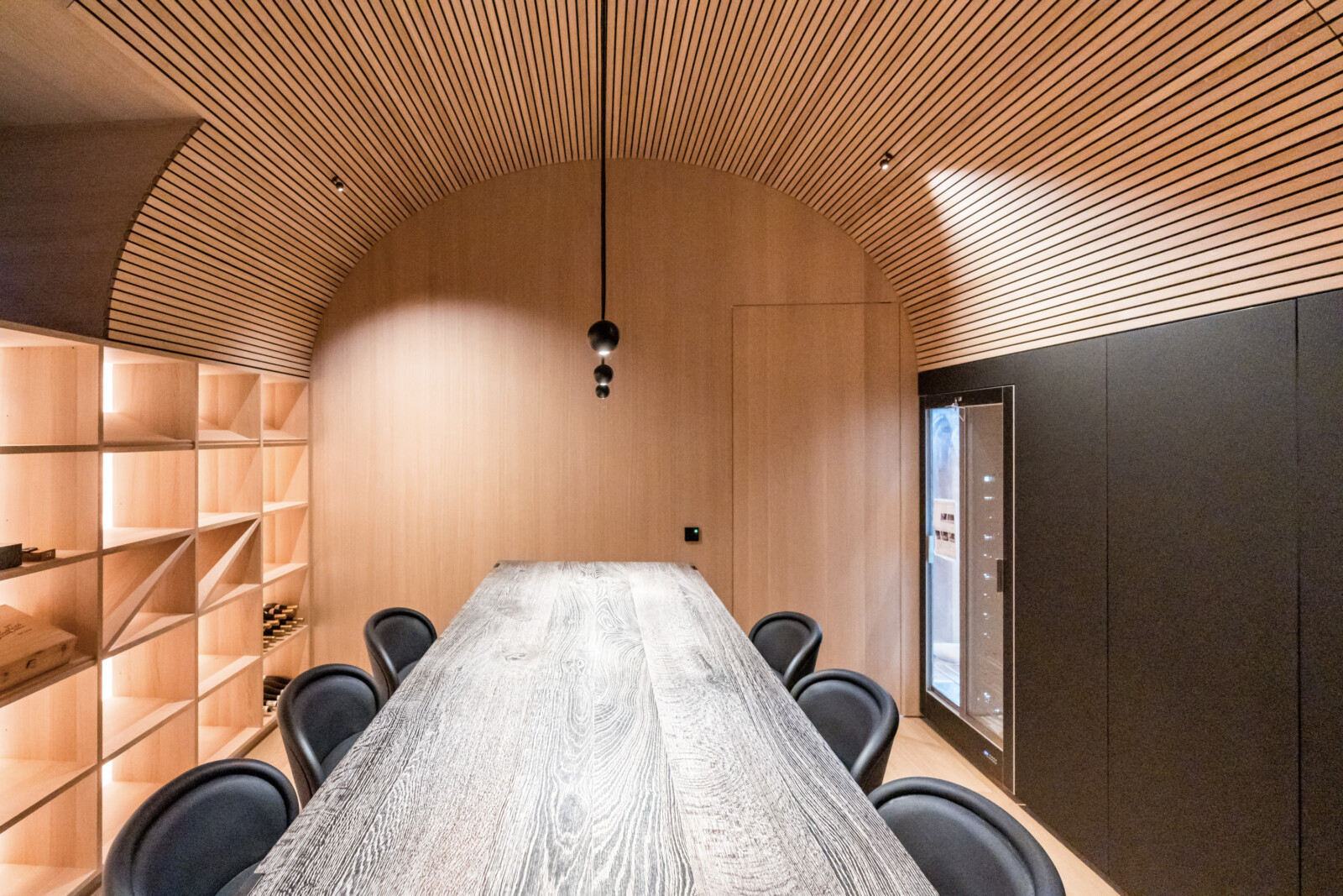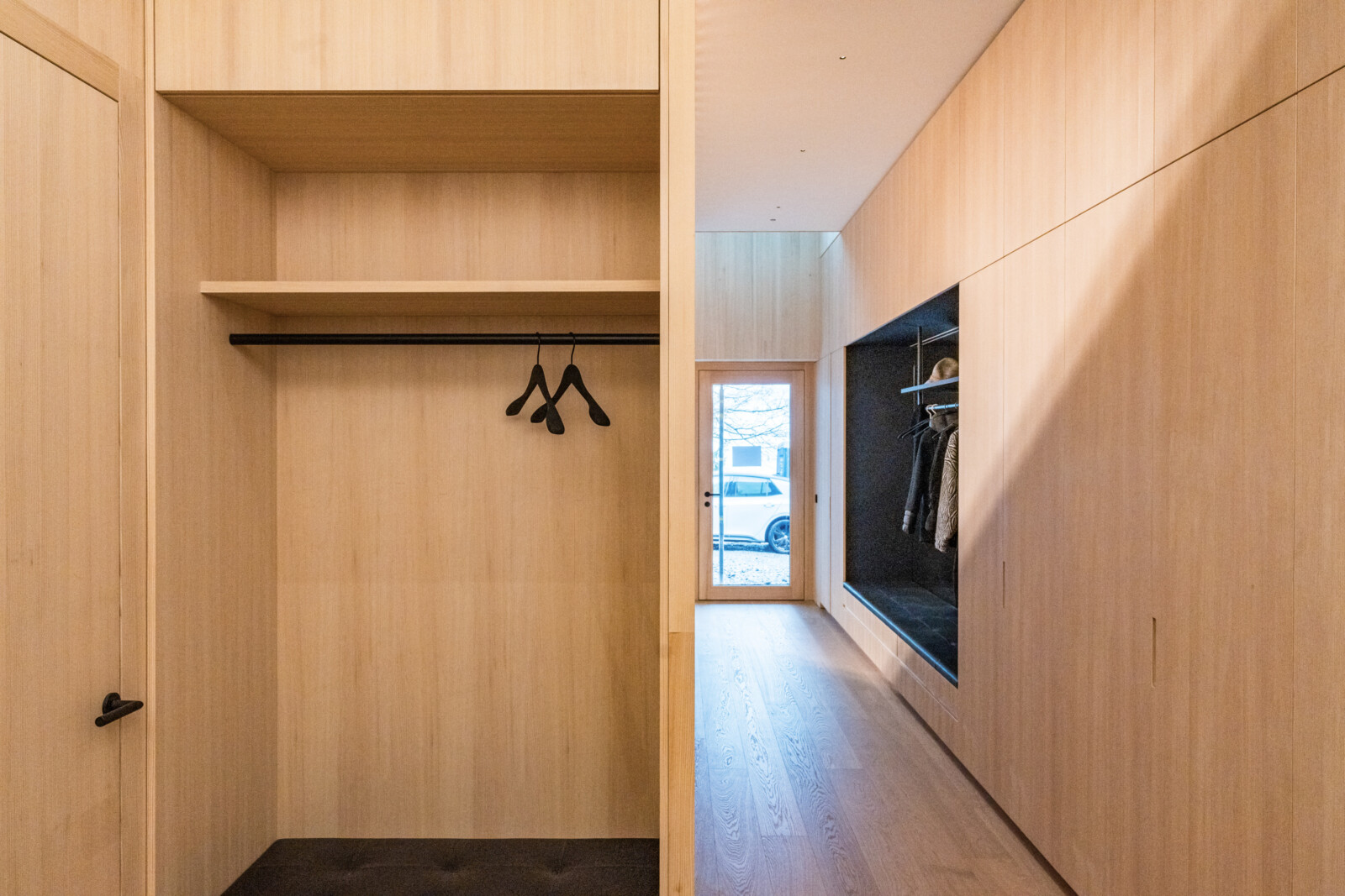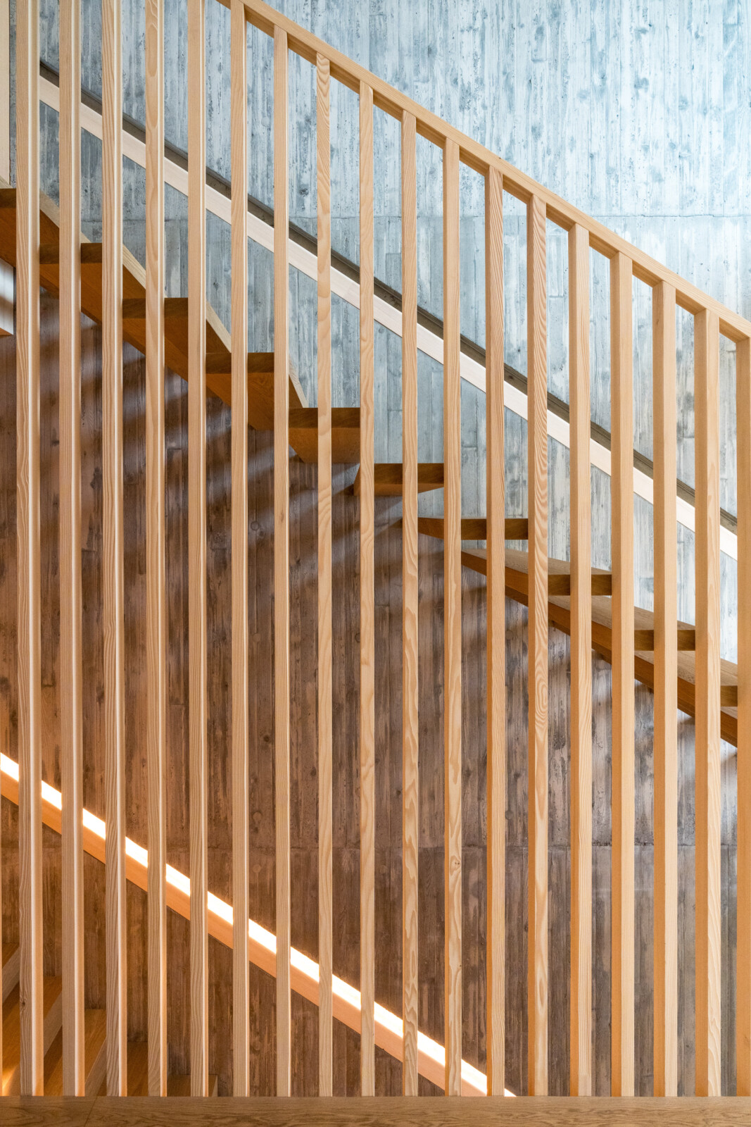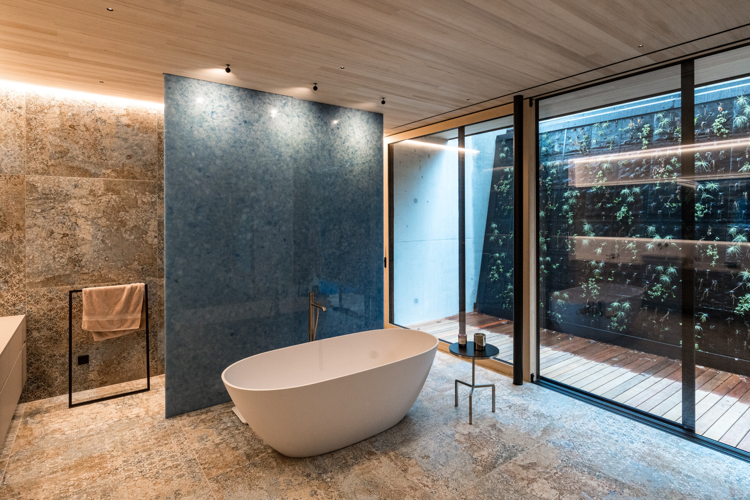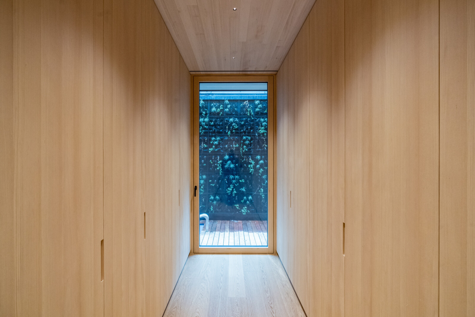 Die zentral angelegte Vertikalerschließung verbindet drei Geschoßebenen und gliedert ihre Funktionen durch eine begleitende Sichtbetonwand. Klug inszenierte Sichtachsen verleihen dem kompakten Baukörper ein Gefühl von Weiträumigkeit und Tiefe, während der rückseitige Lichthof mit Tauchbecken für die Sauna sowie eine Terrasse im skulptural geformten Dach private Rückzugsorte bieten.