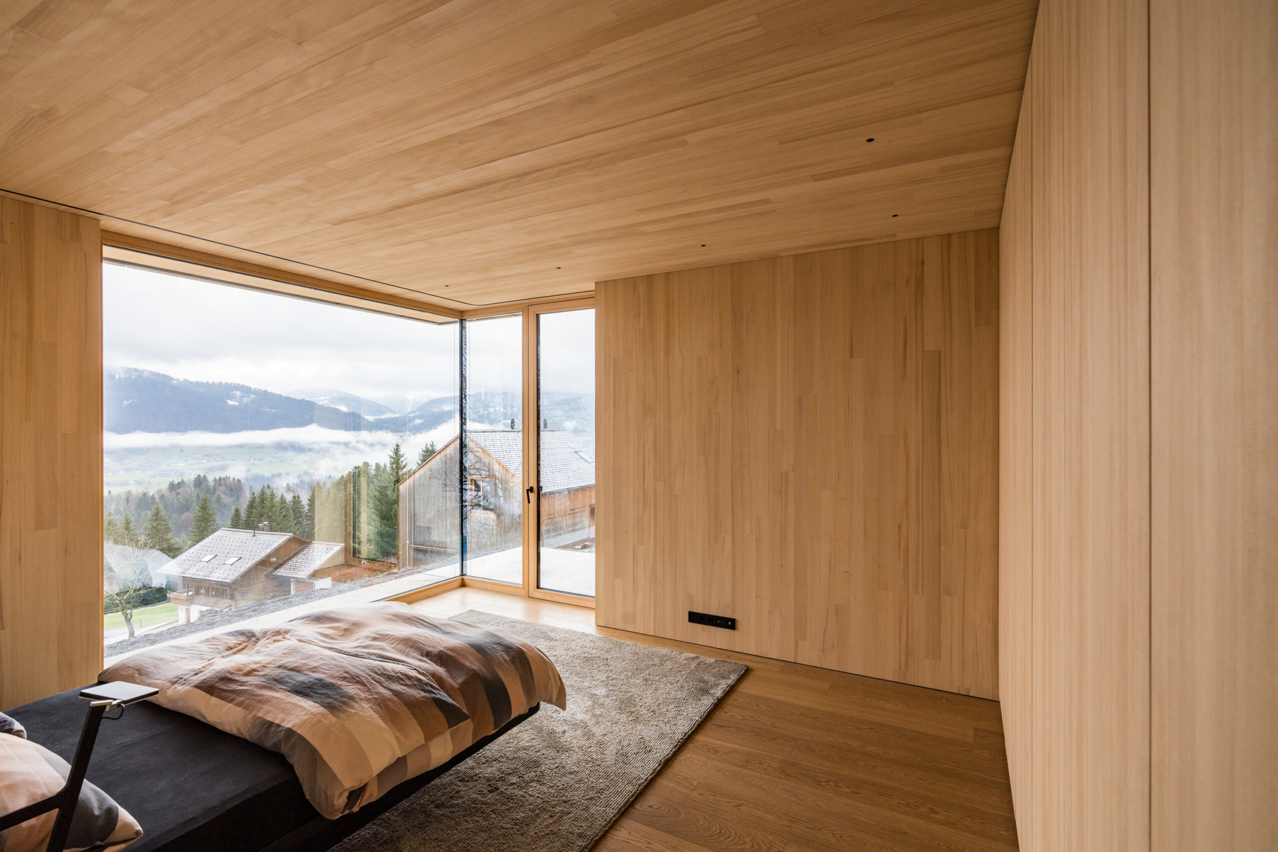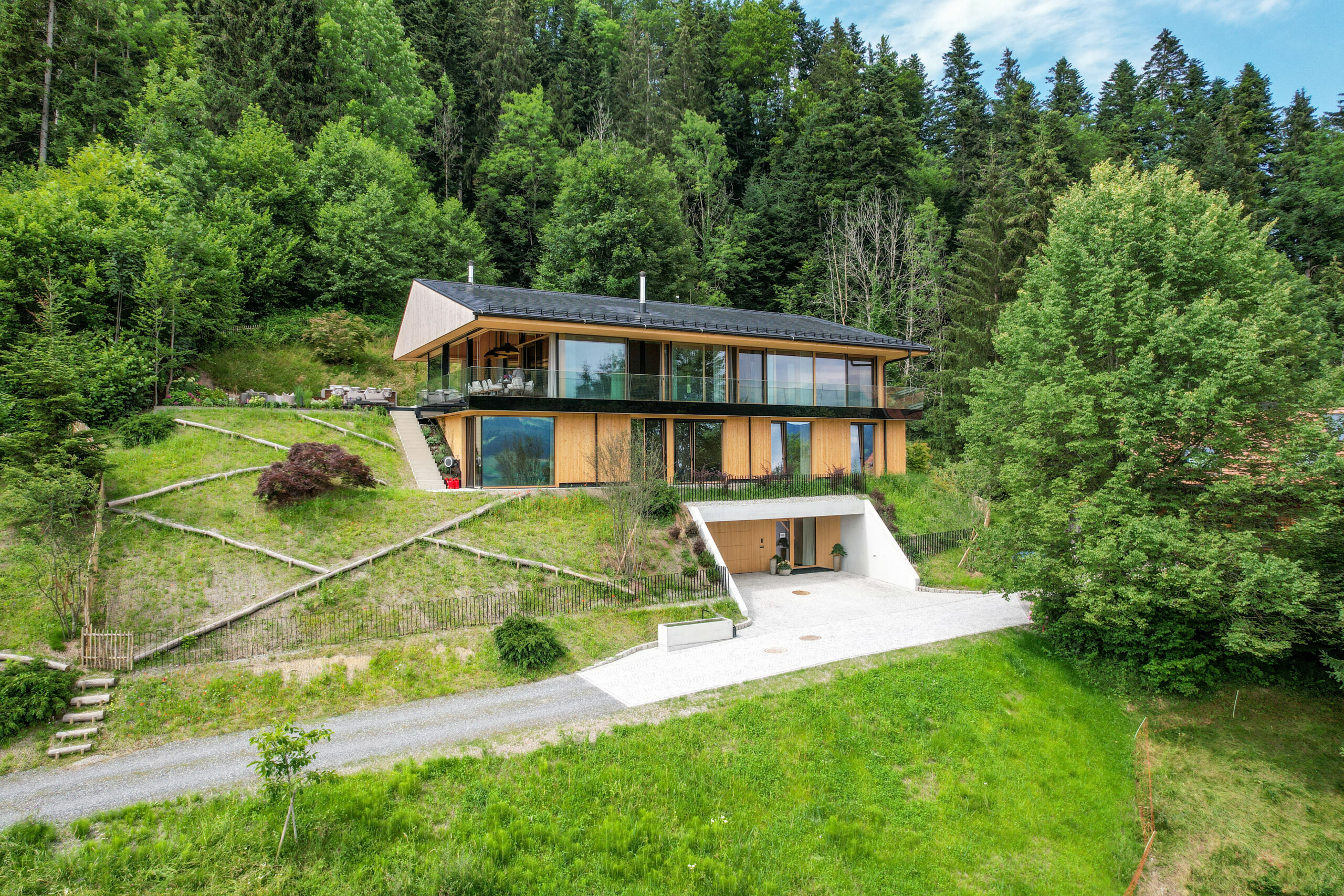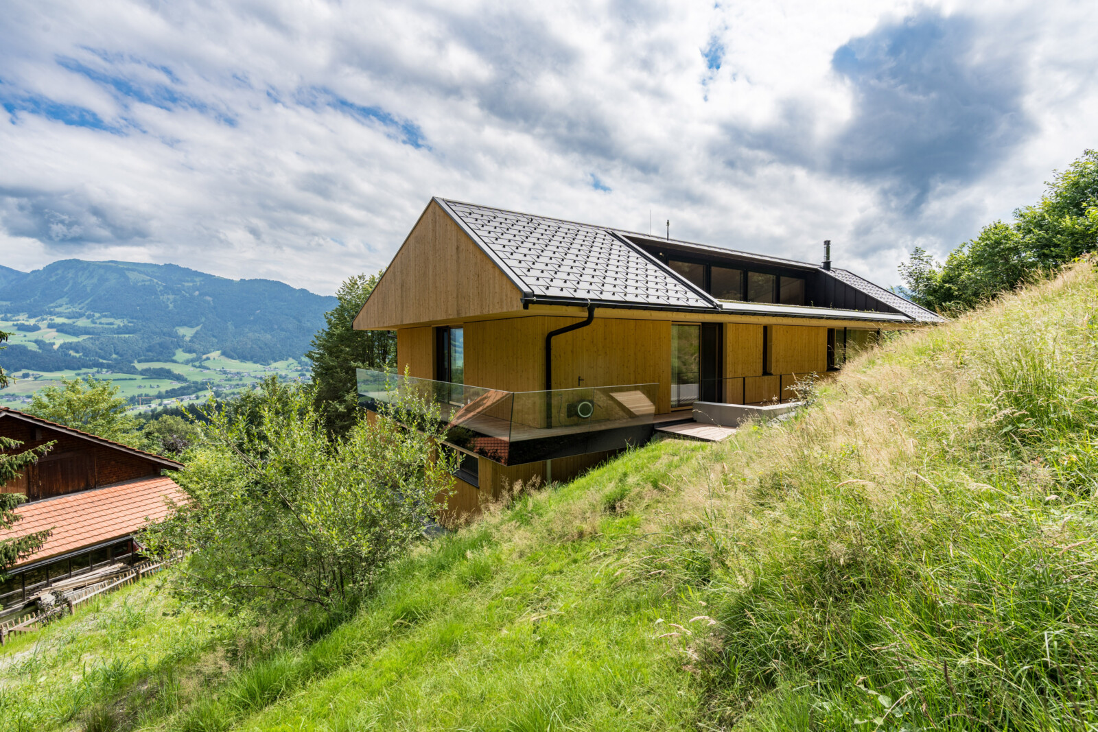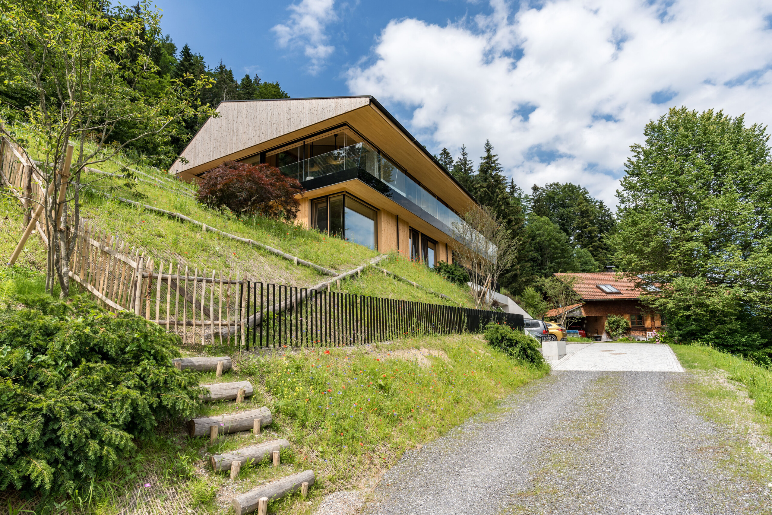 Ein Haus für Genießer und ihre Gäste, selbstbewusst in den steilen Südhang gesetzt, mit freiem Blick über den Bregenzerwald und seine Bergkämme. Die Großzügigkeit zeigt sich nicht in Quadratmetern, sondern in der sorgfältigen und inspirierten Planung. Der fein gearbeitete Weinkeller, eine exquisit ausgestattete Küche und behagliche Essbereiche drinnen und draußen erzählen von der Freude, das gute Leben zu teilen.