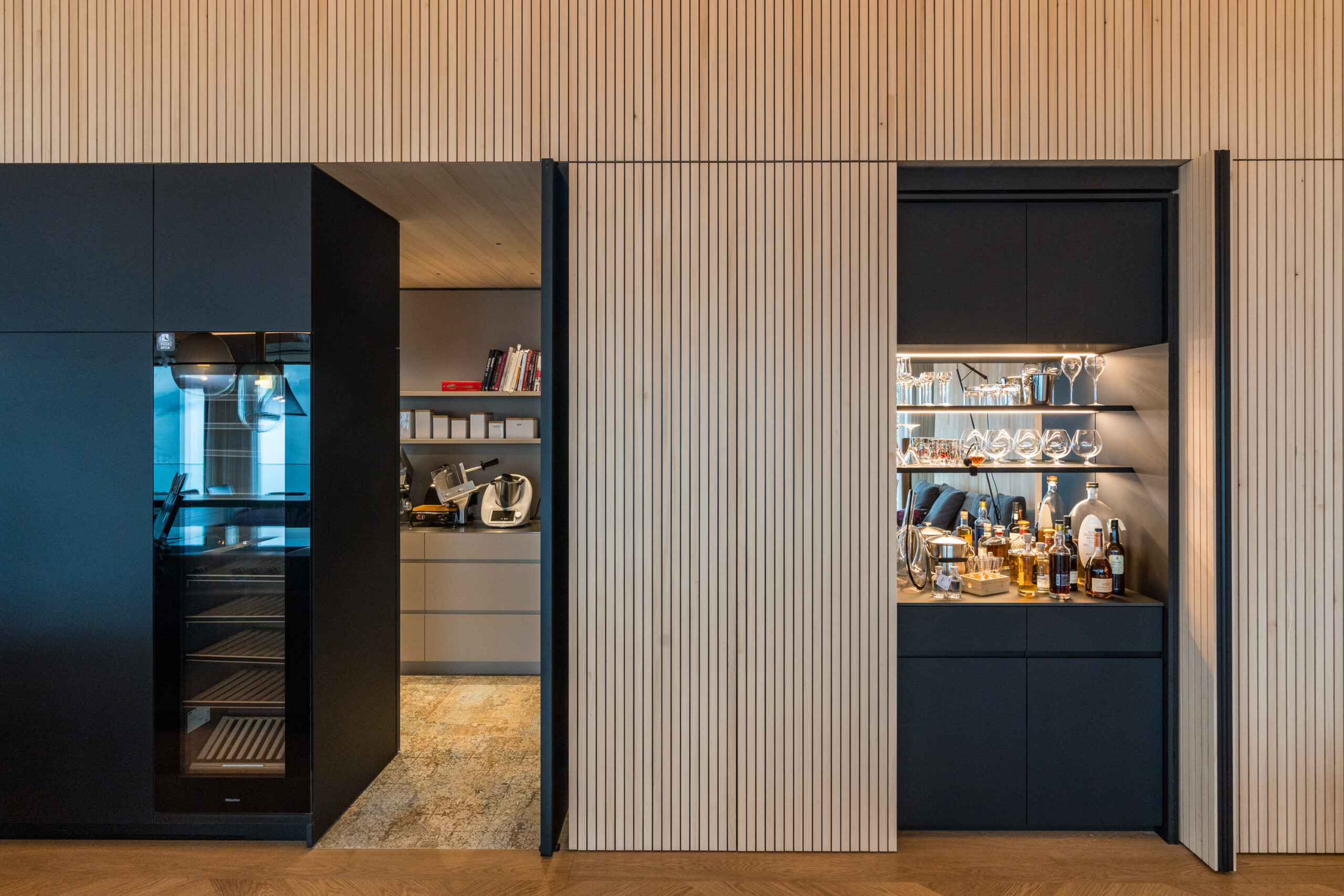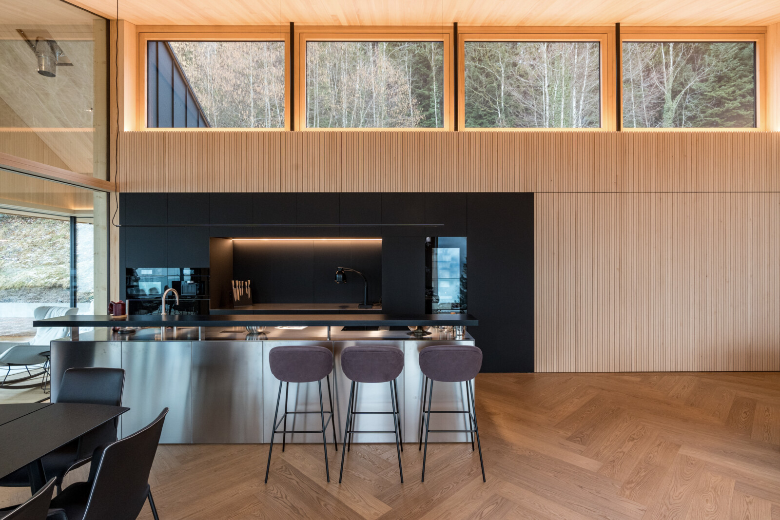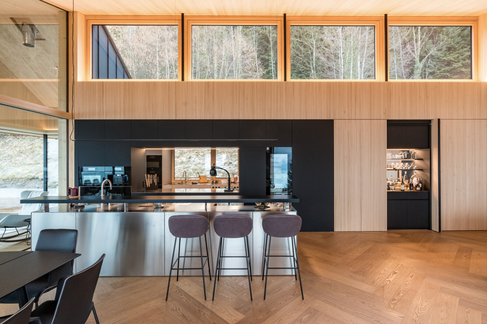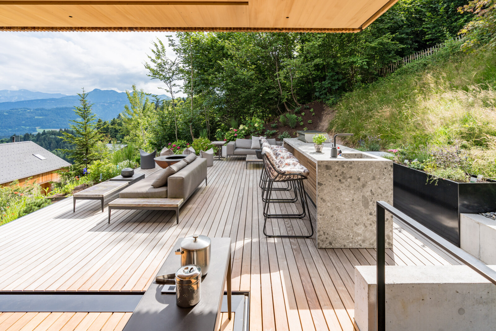 Ein Haus für Genießer und ihre Gäste, selbstbewusst in den steilen Südhang gesetzt, mit freiem Blick über den Bregenzerwald und seine Bergkämme. Die Großzügigkeit zeigt sich nicht in Quadratmetern, sondern in der sorgfältigen und inspirierten Planung. Der fein gearbeitete Weinkeller, eine exquisit ausgestattete Küche und behagliche Essbereiche drinnen und draußen erzählen von der Freude, das gute Leben zu teilen.