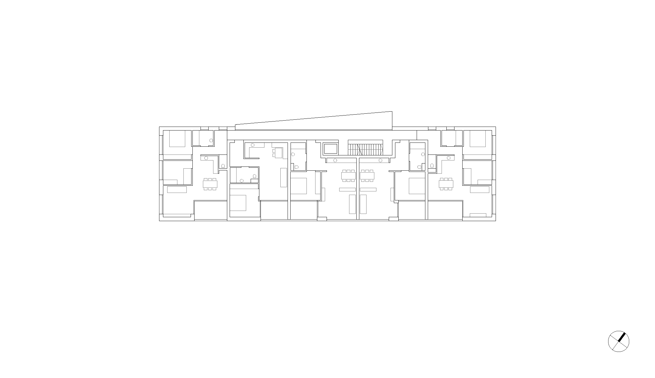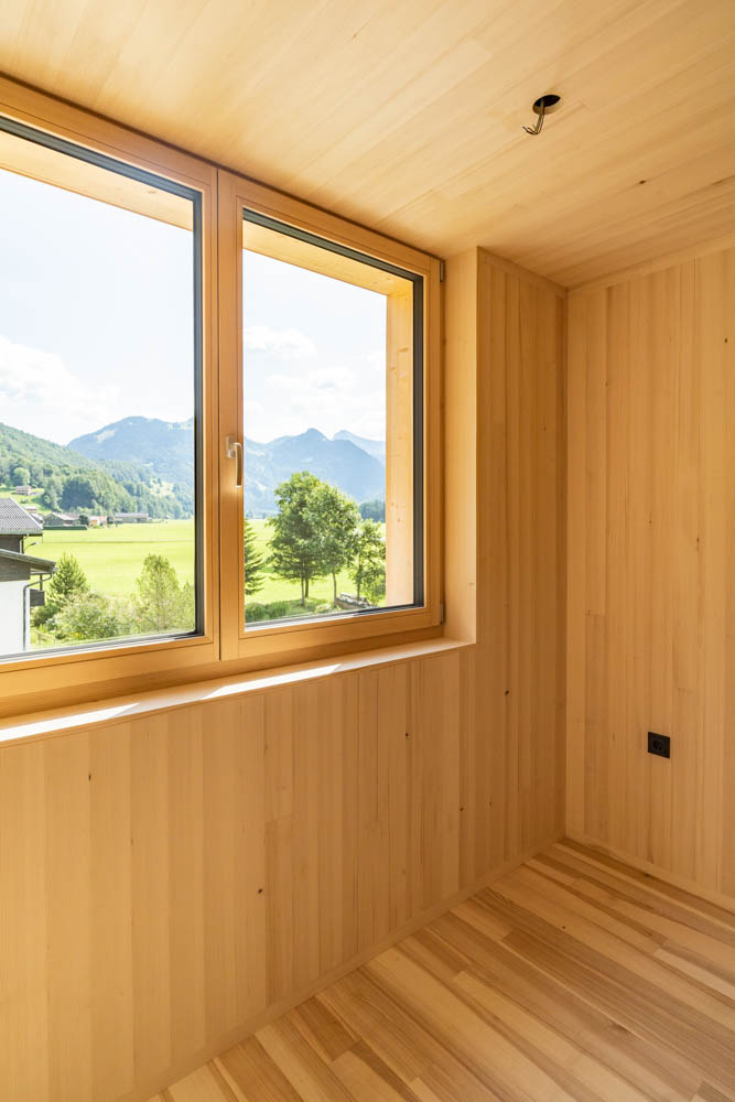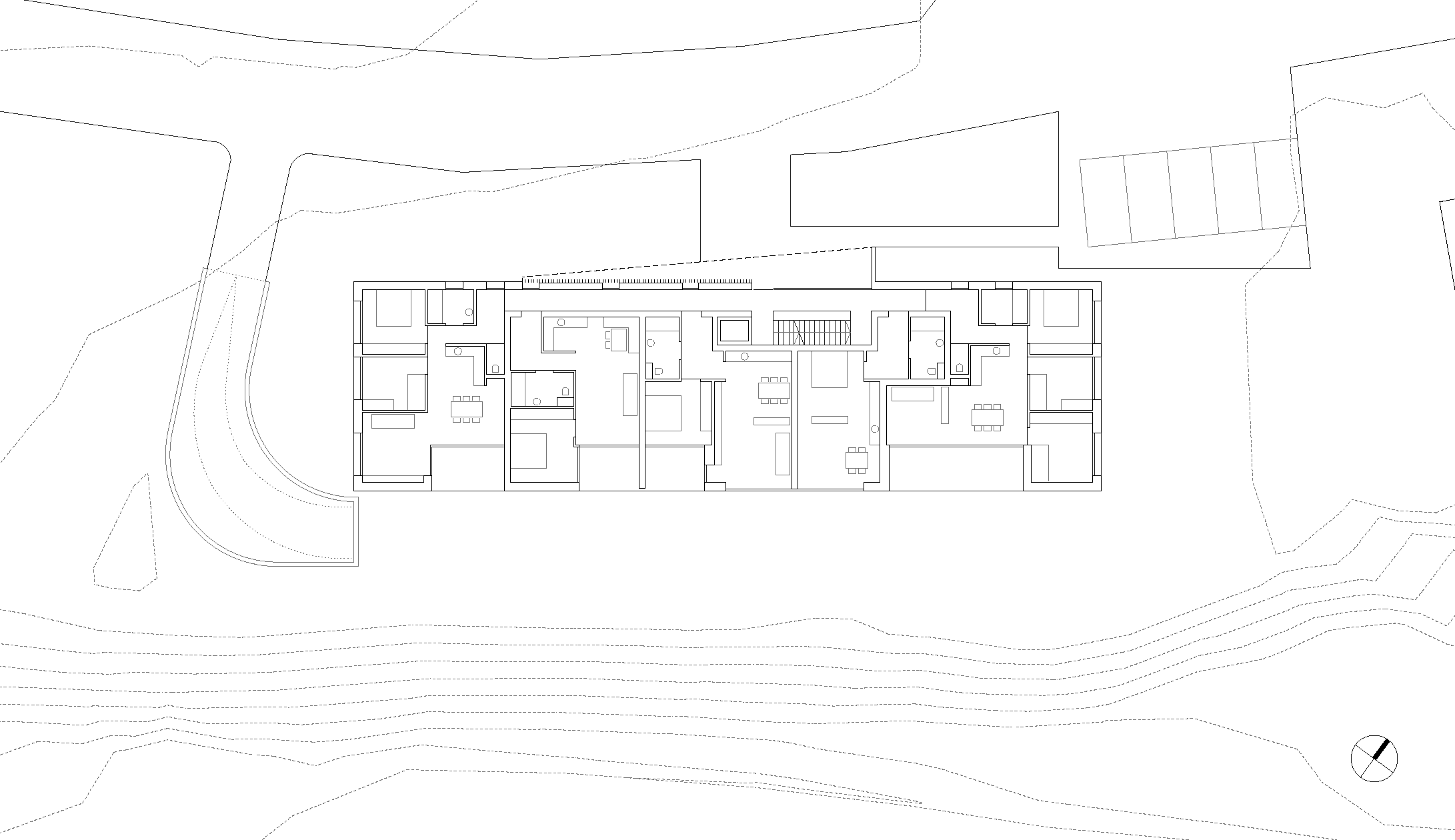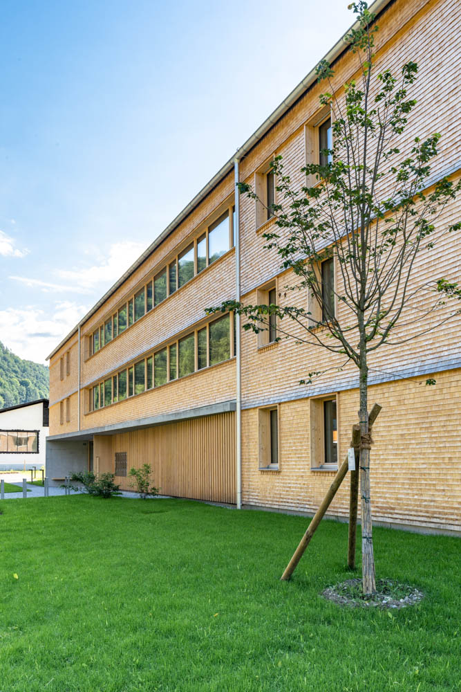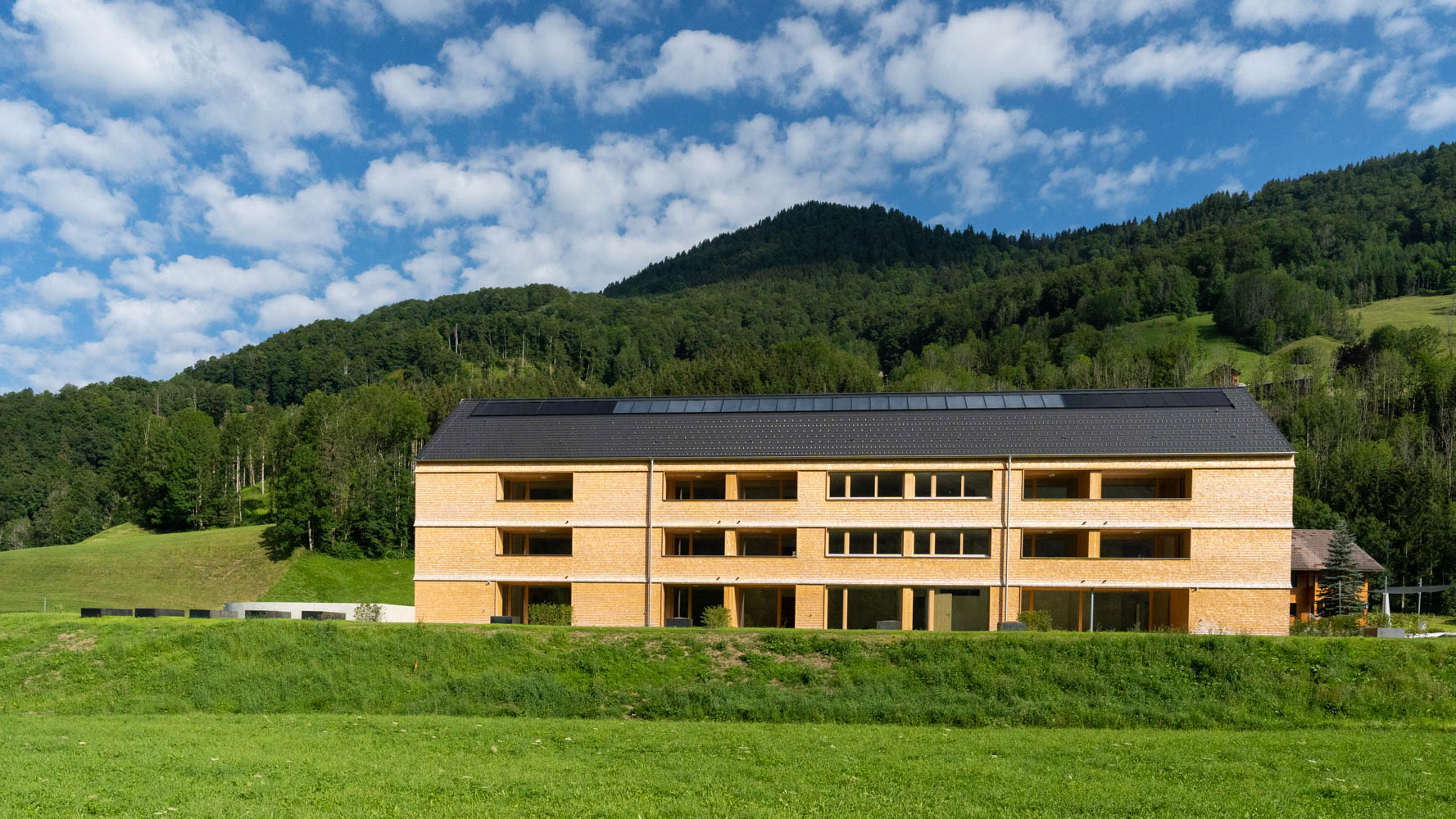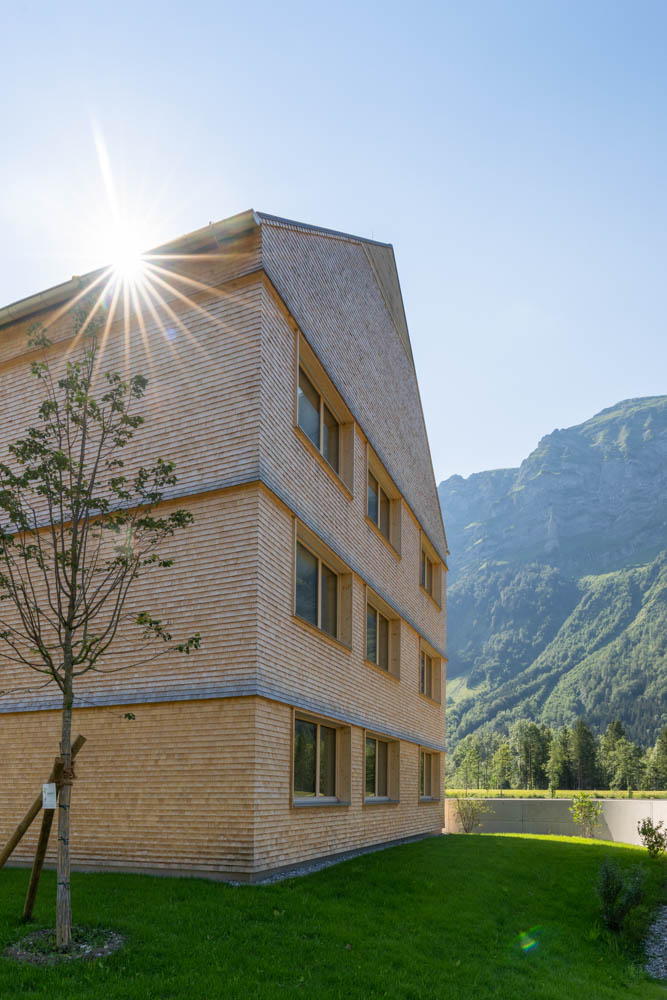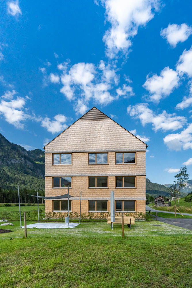 Das dreigeschossige Wohnhaus wird von Nordwesten betreten. Ein übersichtlich gestalteter Eingangsbereich führt zum großflächig von Licht durchfluteten Erschließungssystem, das alle Stockwerke barrierefrei miteinander verbindet. Im Osten des Grundstückes ist die Rampe zur Tiefgarage angelegt, im Untergeschoss befinden sich auch private Kellerabteile und die Technikräume. Um gemeinsamen Lebensraum für Familien, Paare wie auch Alleinstehende zu schaffen, wurden individuell nutzbare 1- bis 4-Zimmer-Einheiten konzipiert. Alle Wohnungen verfügen über private Terrassenbereiche oder großzügig dimensionierte Loggien, die sich nach Südosten zum markant aufragenden Bergmassiv der Kanisfluh öffnen.