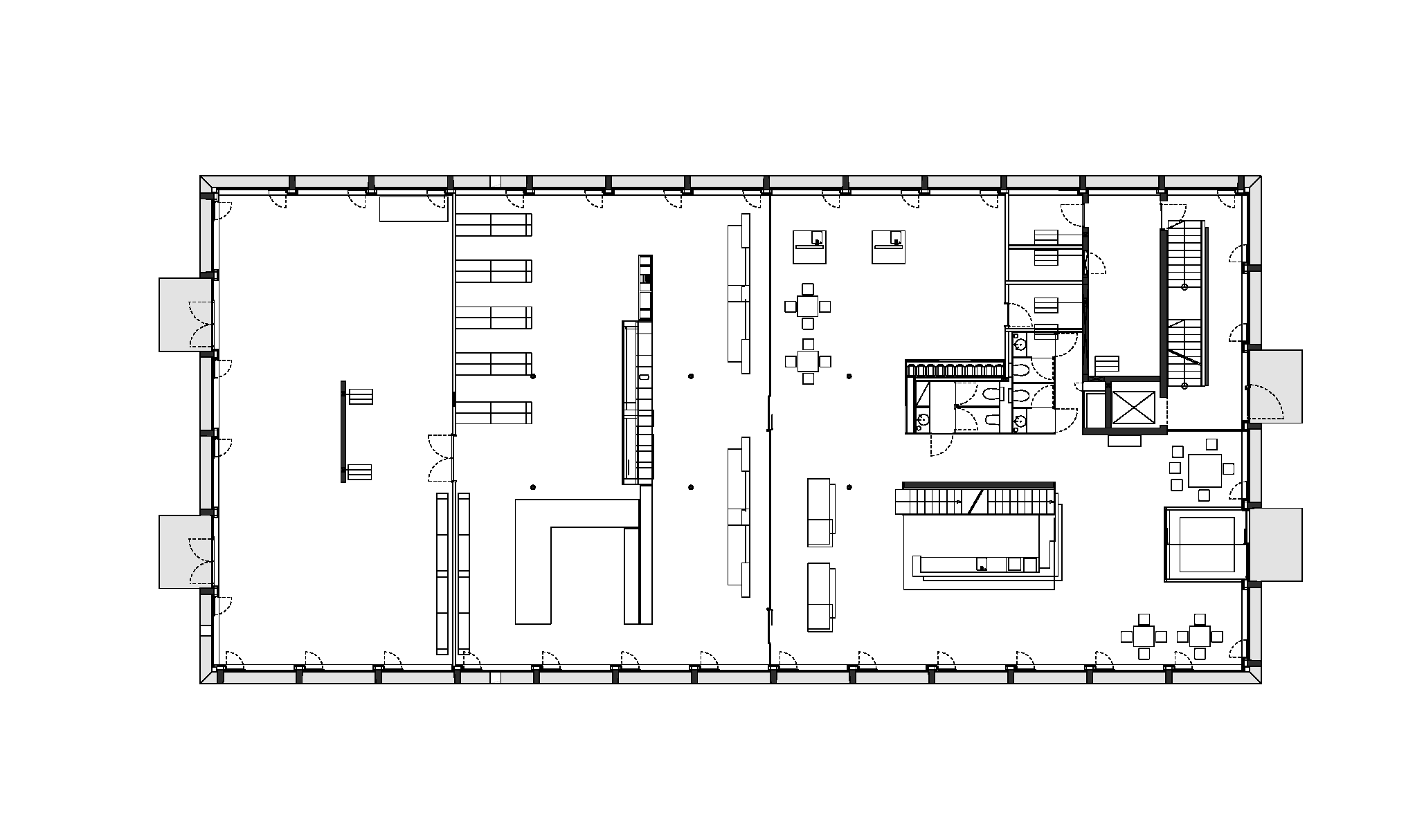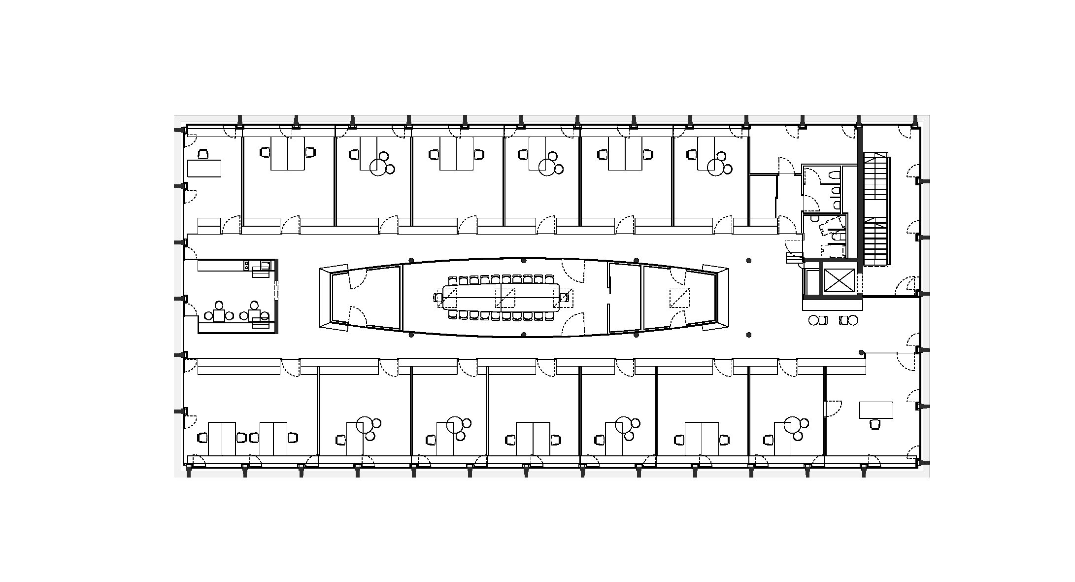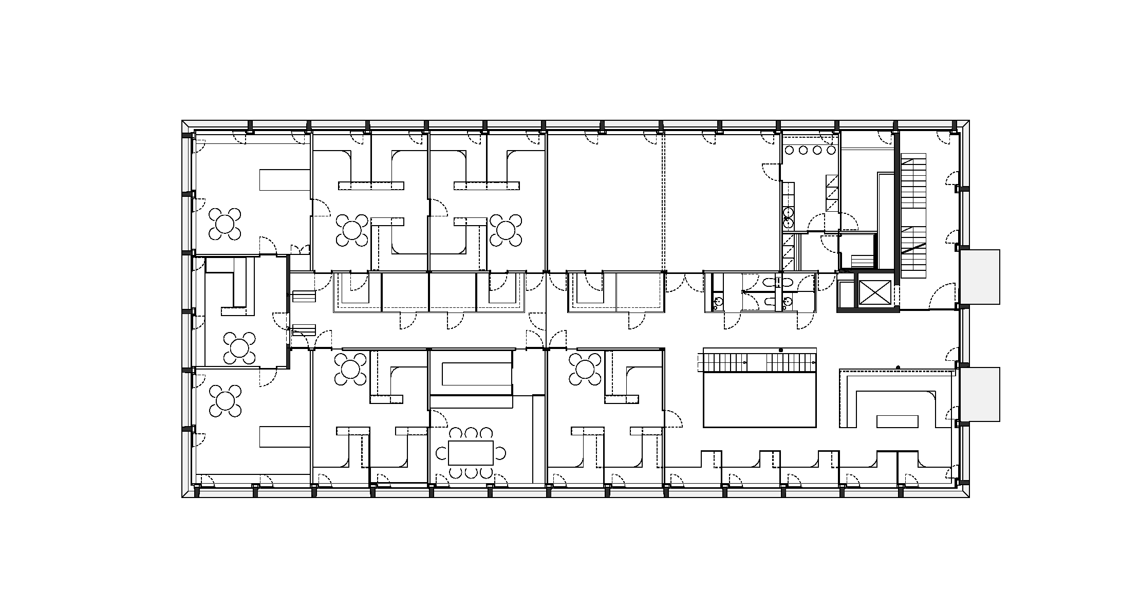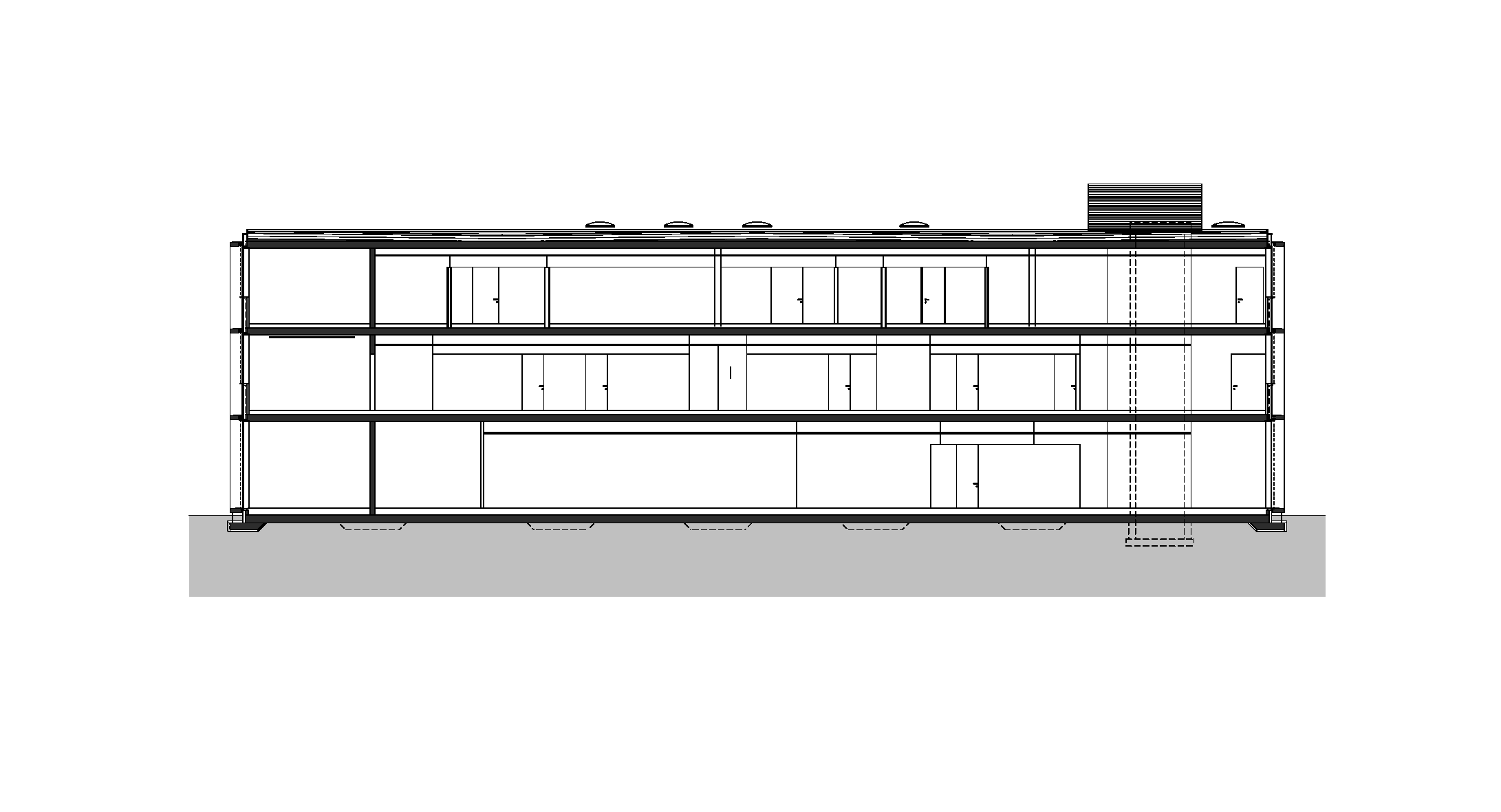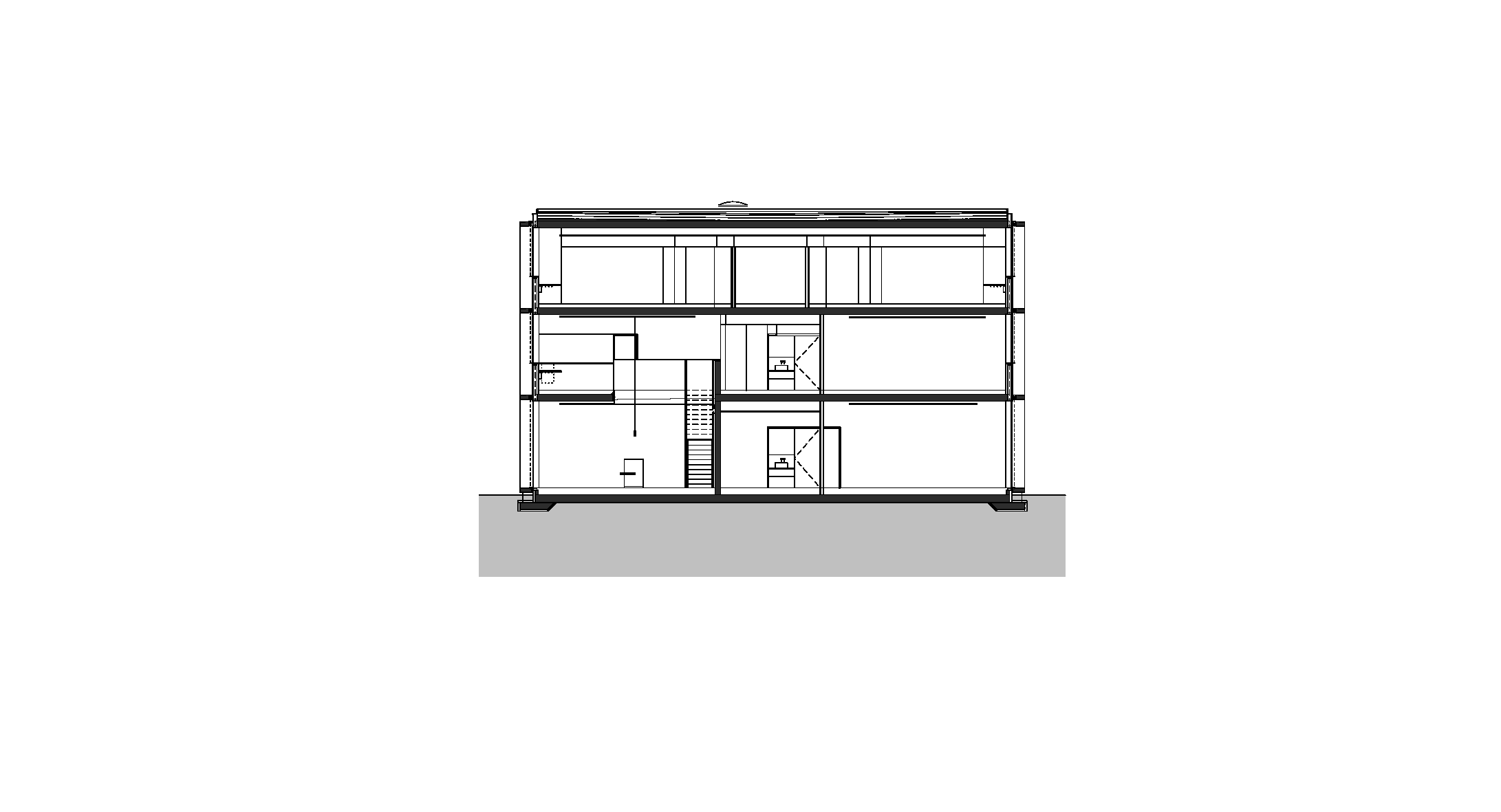 Die an der Fassaden charakteristisch in Erscheinung tretenden dreischaligen Stahlbeton-Fertigteile tragen zusammen mit wenigen Stahlstützen im Inneren des Hauses die Stahlbetondecken, was eine freie Grundrisseinteilung und somit hohe Flexibilität ermöglicht. Neben einer Kühlung wurde das Gebäude mit einer Anlage zur kontrollierten Be- und Entlüftung ausgestattet.