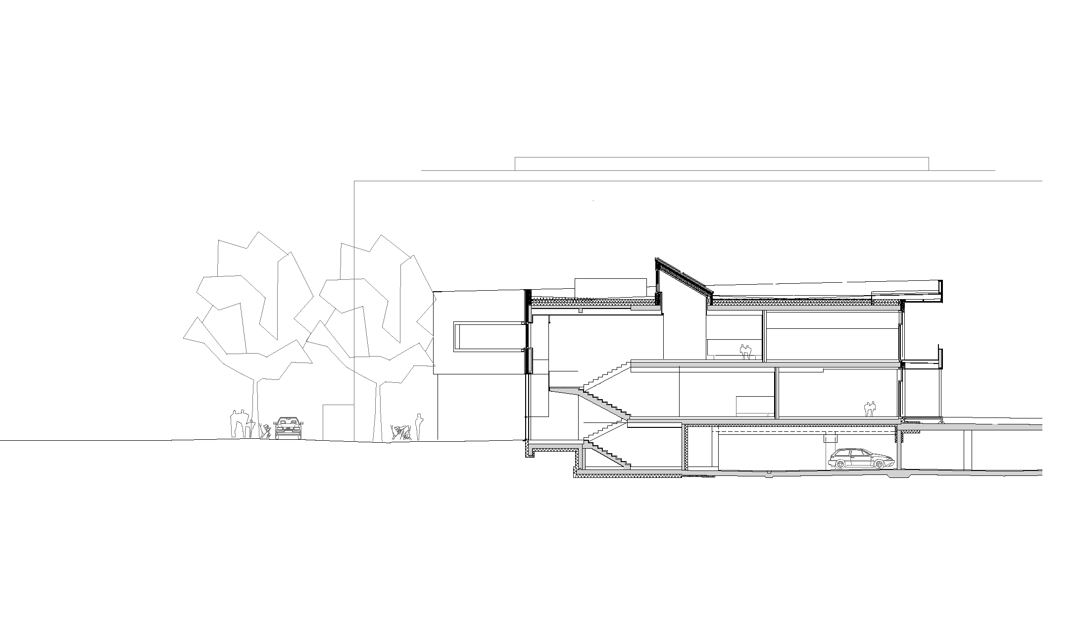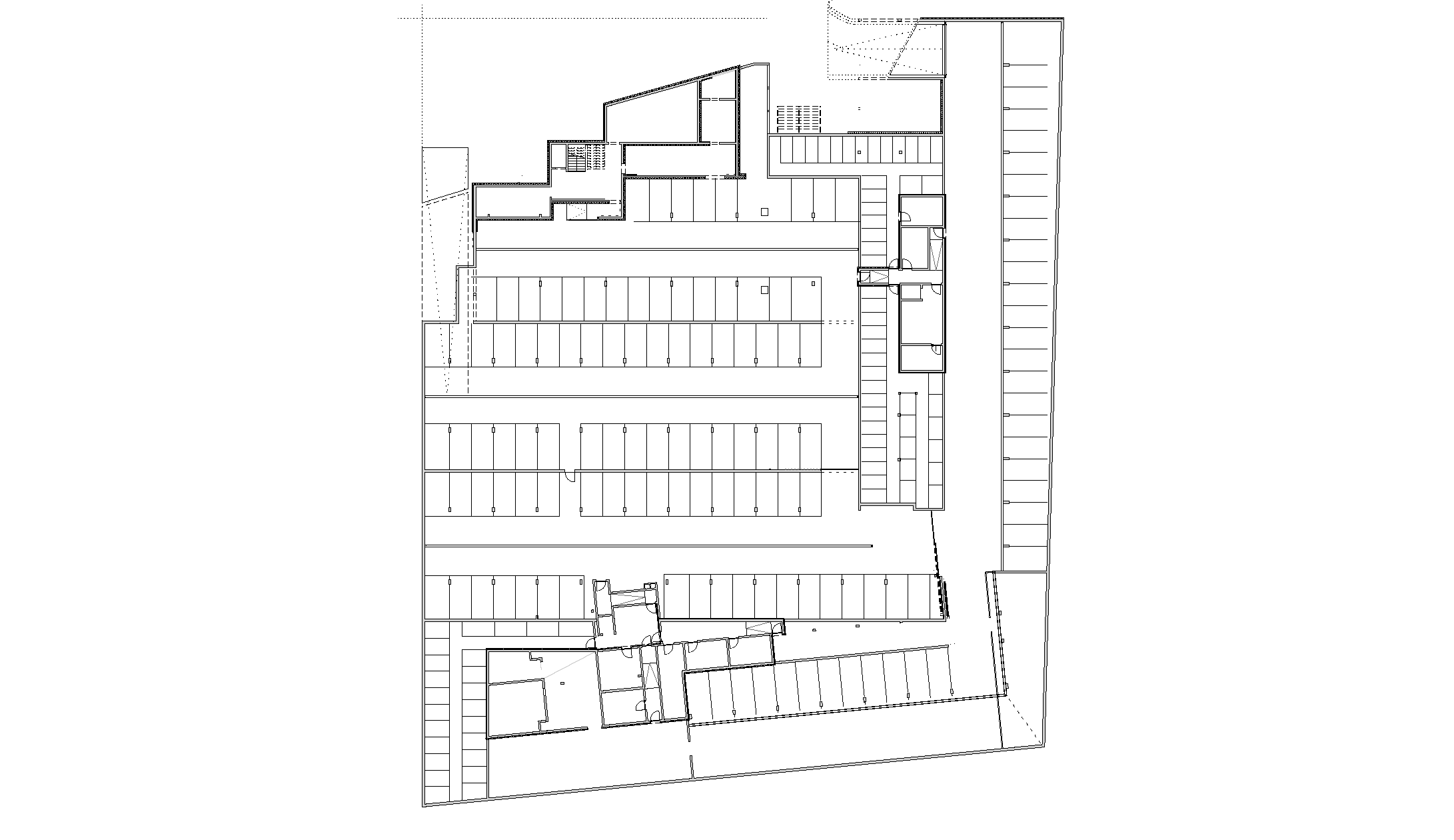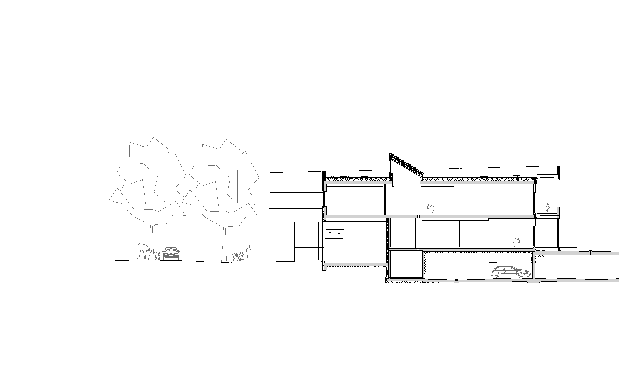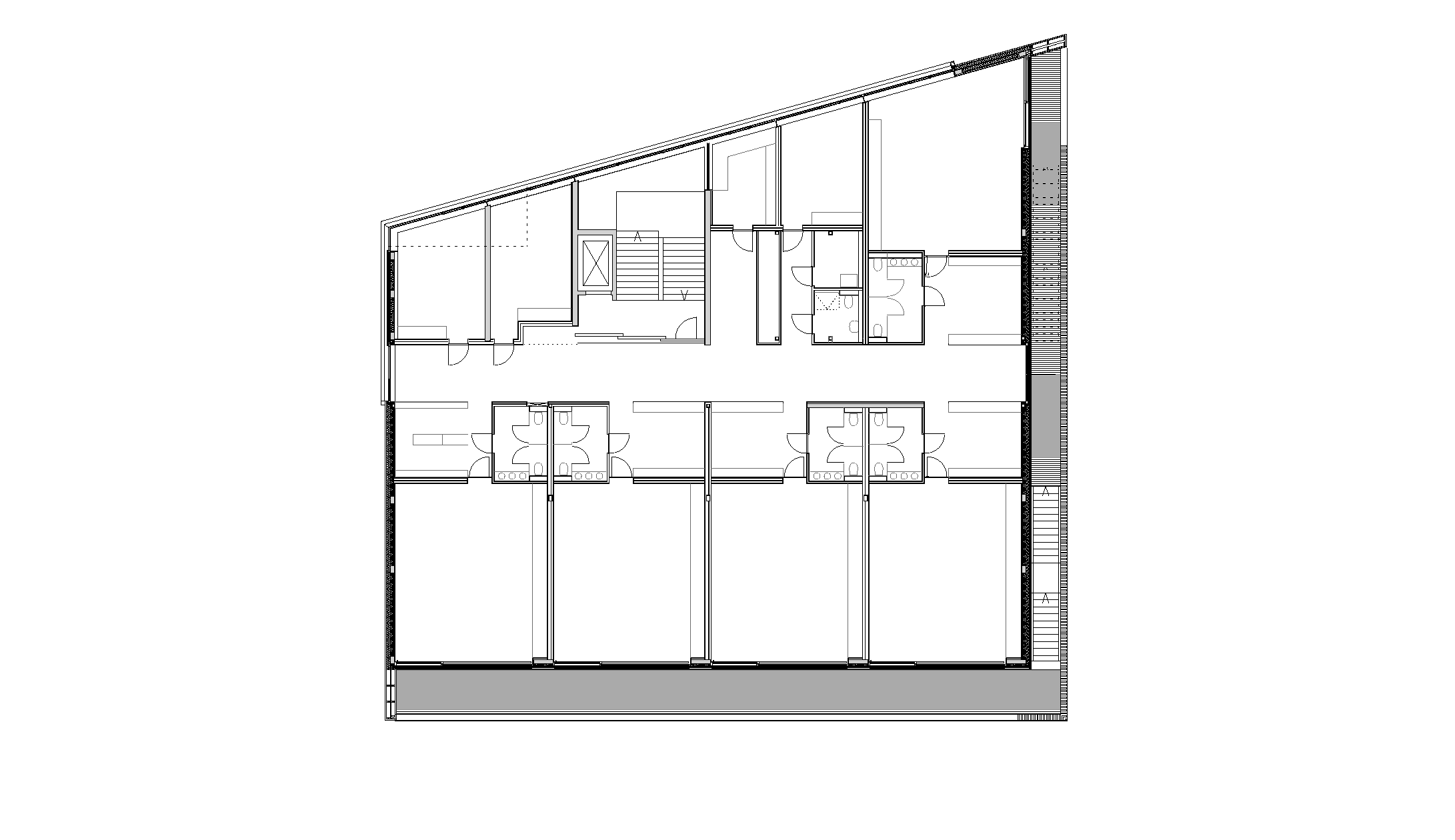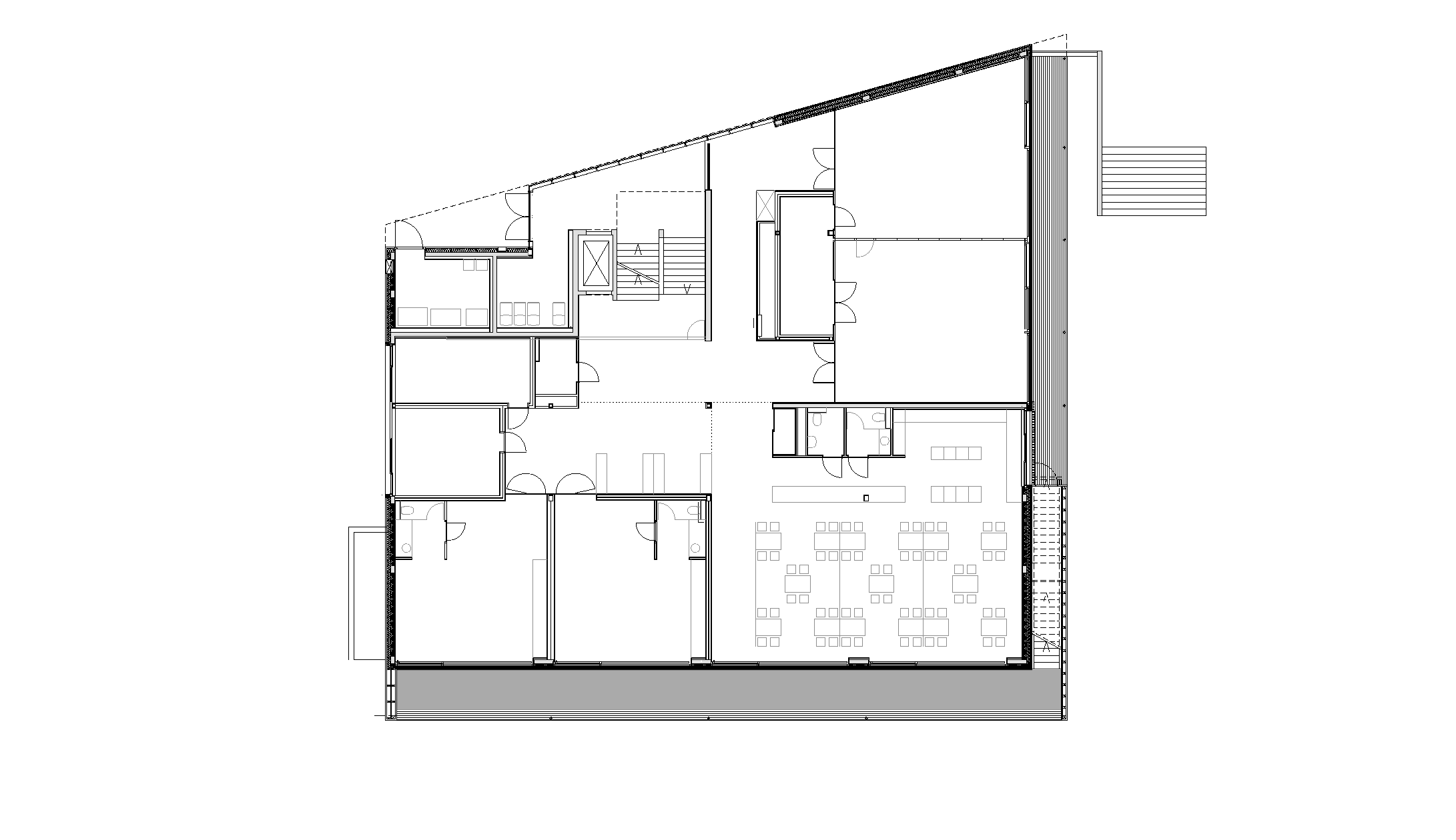 Der zweigeschossige Beton-Holz-Hybridbau mit Holzfertigteilwänden, wird in der äußersten Schicht mit weißen Melaminharzplatten verkleidet, die zurückgesetzten, großzügig verglasten Flächen zu Terrassen und Balkonen, mit Lärchenholz. Eine Freitreppe verläuft unauffällig, jedoch räumlich interessant innerhalb der Gebäudehülle, mit außen weiß gestrichenen Holzlamellen im Obergeschoß. Fröhliches Apfelgrün begrüßt die Eintretenden, die grafischen Bordüren des Aufprallschutzes bei Glasflächen finden sich hier stark vergrößert wieder.