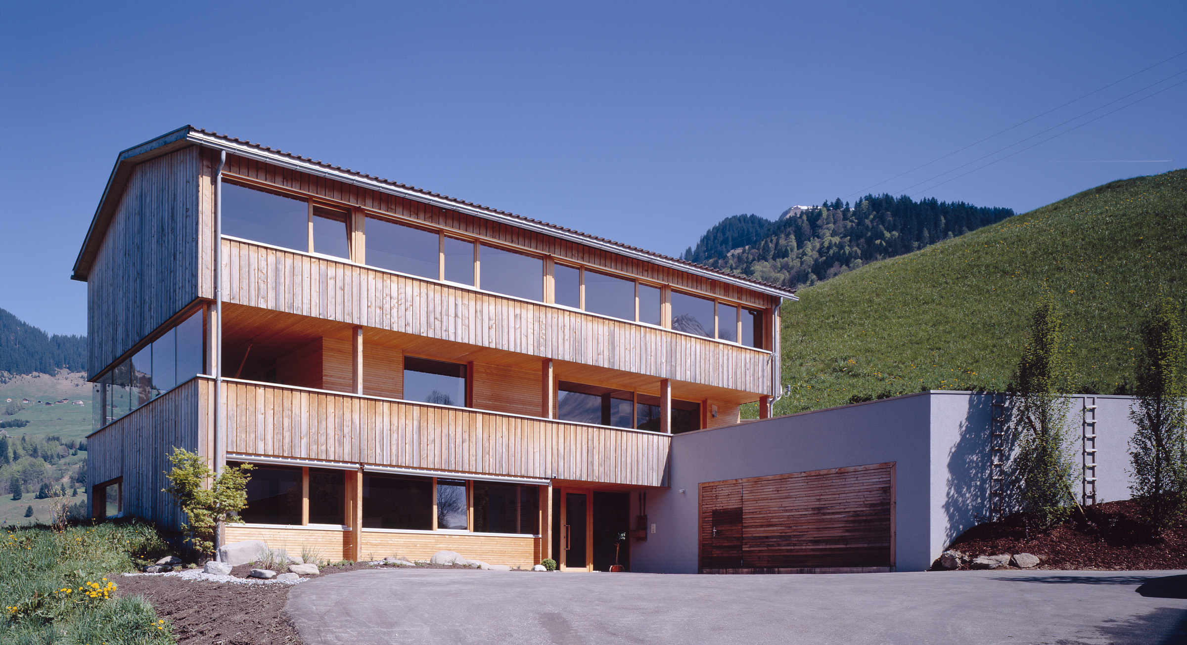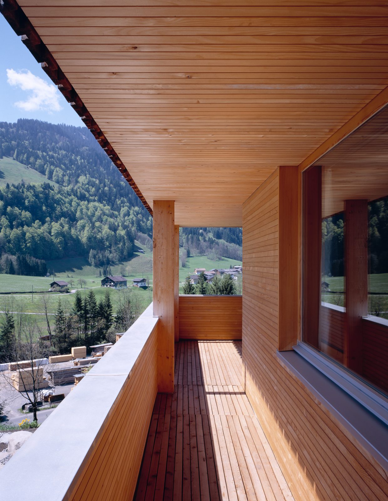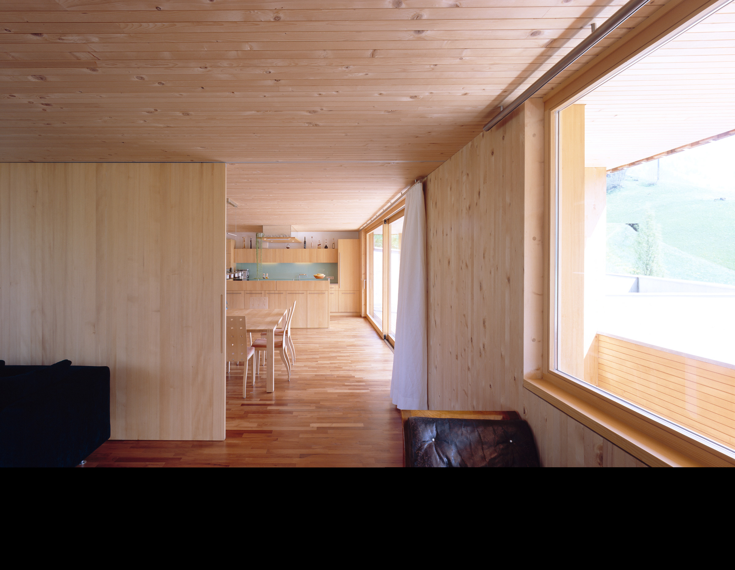 Der Bauherr betreibt im Ort ein Sägewerk, verarbeitet regionale Fichte, Tanne, Lärche zu Fensterholz, Bauholz und Blockhausbohlen, propagiert Massivholzkonstruktionen ohne Verleimungen. Das eigene Familienhaus, sehr ökonomisch in den Hang gesetzt, mit Büro in der Sockeletage, ist ein Prototyp der damals neu entwickelten Massivholzbauweise mit diagonal verdübelten Elementen. Die tafelförmigen Bauteile bestehen aus massiven Kanthölzern (6 mal 10 cm), die senkrecht zu Platten aneinandergereiht sind. Aus ökologischen Gründen sind die profilierten Kant hölzer weder verleimt noch genagelt, sondern mit diagonal versetzten Hartholzstäben verbunden. Die Außenwände, Decken- und Dachtafeln wurden in dieser Art vorgefertigt, die Wände kamen inklusive Dämmung und Außenschalung geschosshoch an die Baustelle. Die Struktur und pure Ma te rialität dieser Technik prägt die Atmosphäre der Innen räume, wobei die Deckenplatten so aufgelegt sind, dass sie den Fugenrhythmus der Wände synchron weiterführen. Die Decke über dem stützenfreien Wohngeschoss ist mit Zugstäben vom Dachtragwerk abgehängt. Mit großen Verglasungen öffnet sich das Haus nach Süden und Westen. Der traditionelle „Schopf“ ist neu definiert, auf die Giebelseite gelegt und durch Schiebefenster geschützt.