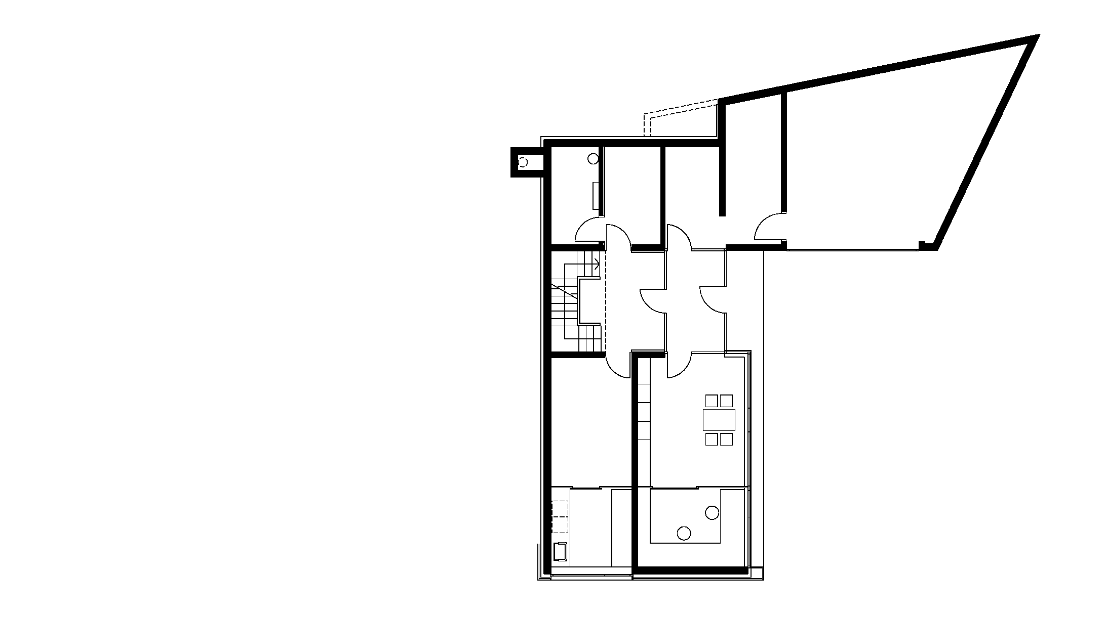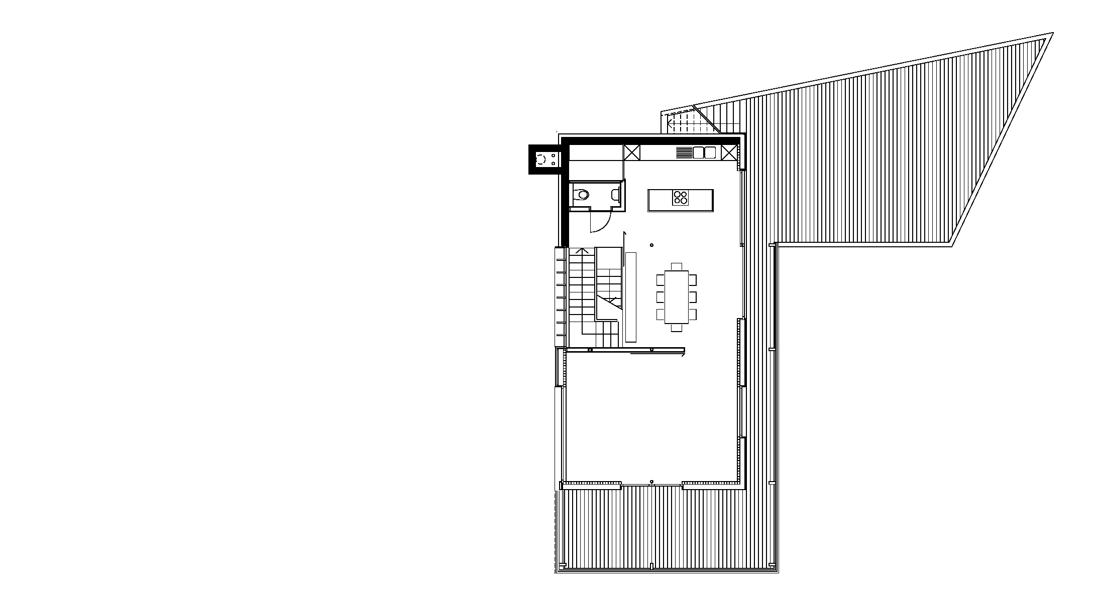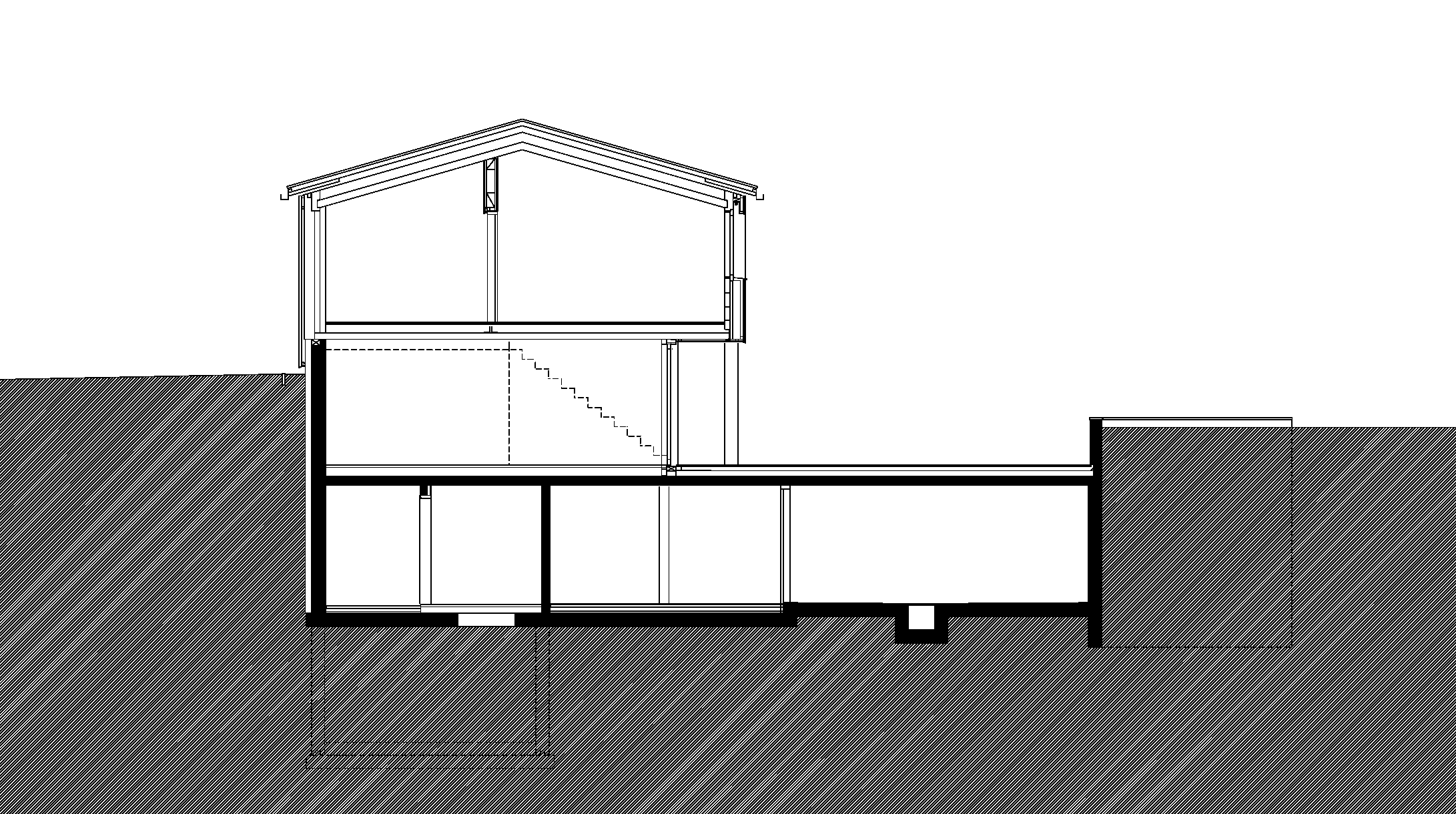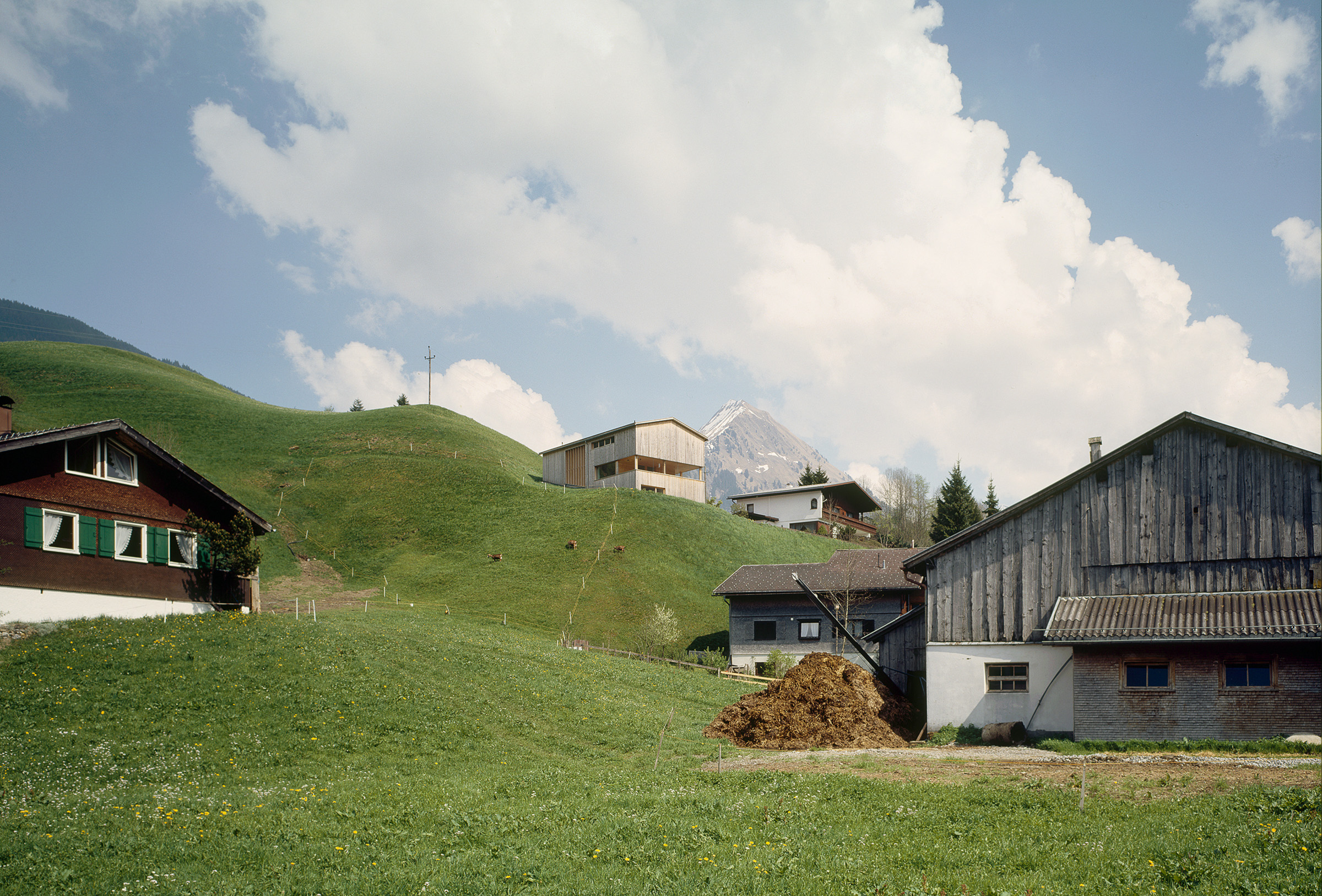 Der Bauherr betreibt im Ort ein Sägewerk, verarbeitet regionale Fichte, Tanne, Lärche zu Fensterholz, Bauholz und Blockhausbohlen, propagiert Massivholzkonstruktionen ohne Verleimungen. Das eigene Familienhaus, sehr ökonomisch in den Hang gesetzt, mit Büro in der Sockeletage, ist ein Prototyp der damals neu entwickelten Massivholzbauweise mit diagonal verdübelten Elementen. Die tafelförmigen Bauteile bestehen aus massiven Kanthölzern (6 mal 10 cm), die senkrecht zu Platten aneinandergereiht sind. Aus ökologischen Gründen sind die profilierten Kant hölzer weder verleimt noch genagelt, sondern mit diagonal versetzten Hartholzstäben verbunden. Die Außenwände, Decken- und Dachtafeln wurden in dieser Art vorgefertigt, die Wände kamen inklusive Dämmung und Außenschalung geschosshoch an die Baustelle. Die Struktur und pure Ma te rialität dieser Technik prägt die Atmosphäre der Innen räume, wobei die Deckenplatten so aufgelegt sind, dass sie den Fugenrhythmus der Wände synchron weiterführen. Die Decke über dem stützenfreien Wohngeschoss ist mit Zugstäben vom Dachtragwerk abgehängt. Mit großen Verglasungen öffnet sich das Haus nach Süden und Westen. Der traditionelle „Schopf“ ist neu definiert, auf die Giebelseite gelegt und durch Schiebefenster geschützt.